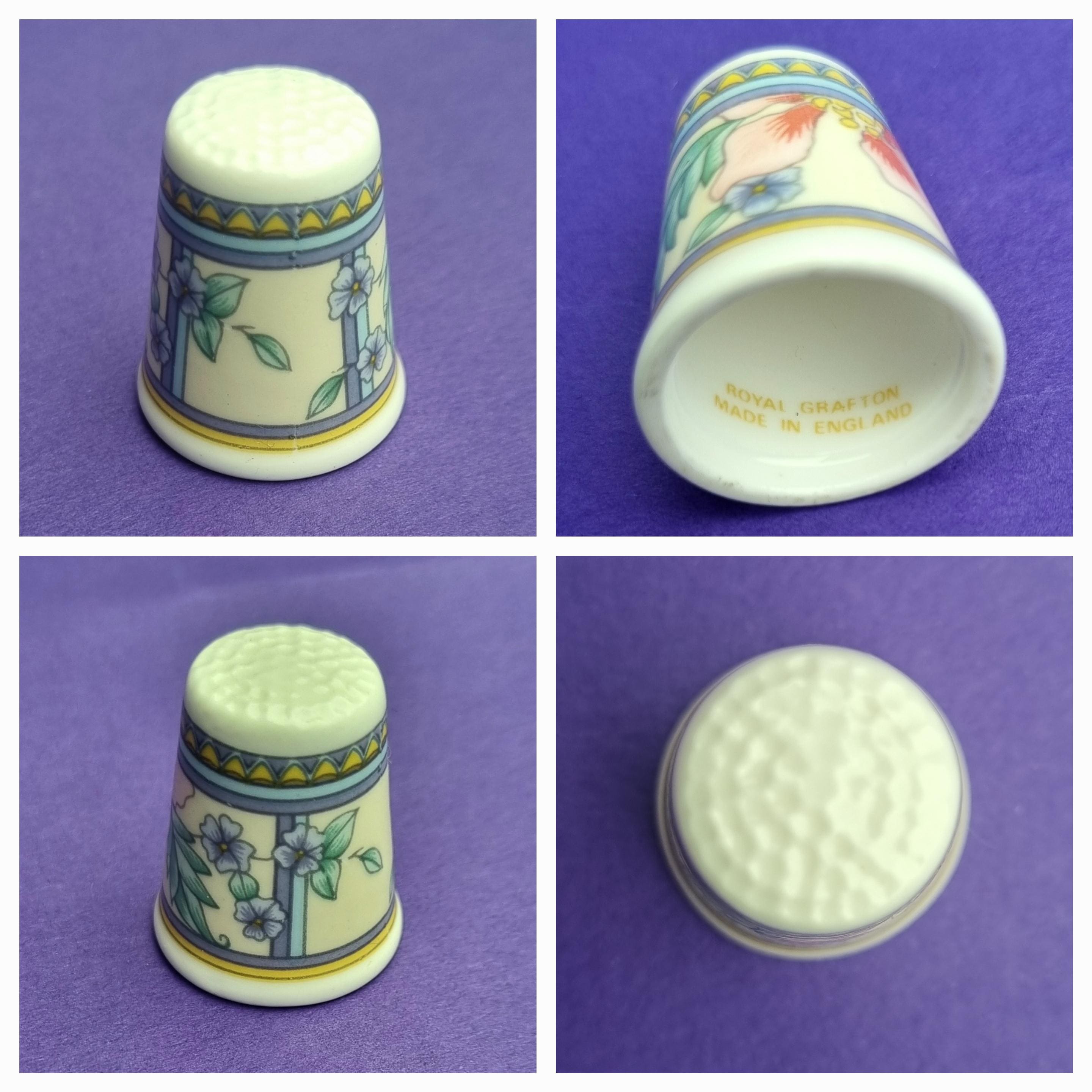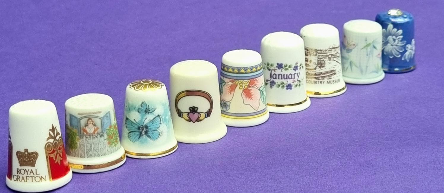 A wonderful selection of 9 vintage fine bone china and porcelain thimbles from Royal Grafton England, Donegal Ireland, Spode England, Rockingham England, Hornsea England, Georges Boyes France and PR Spain.