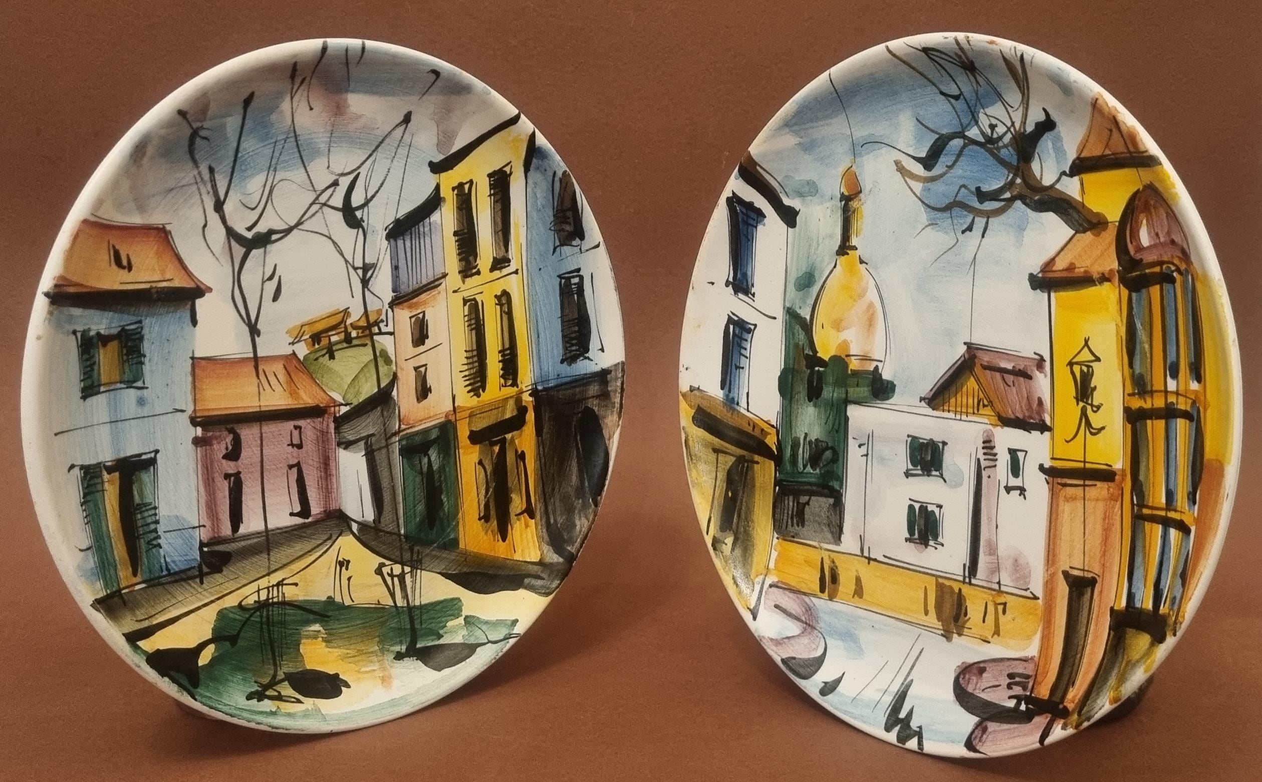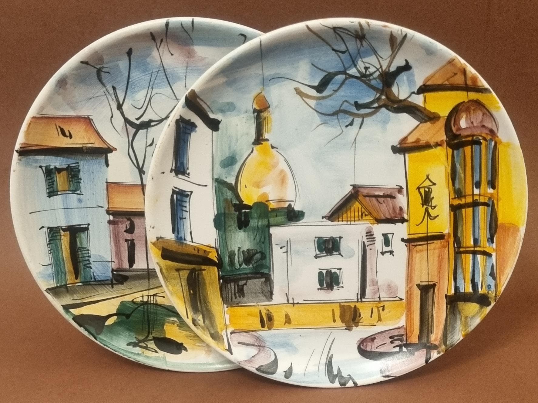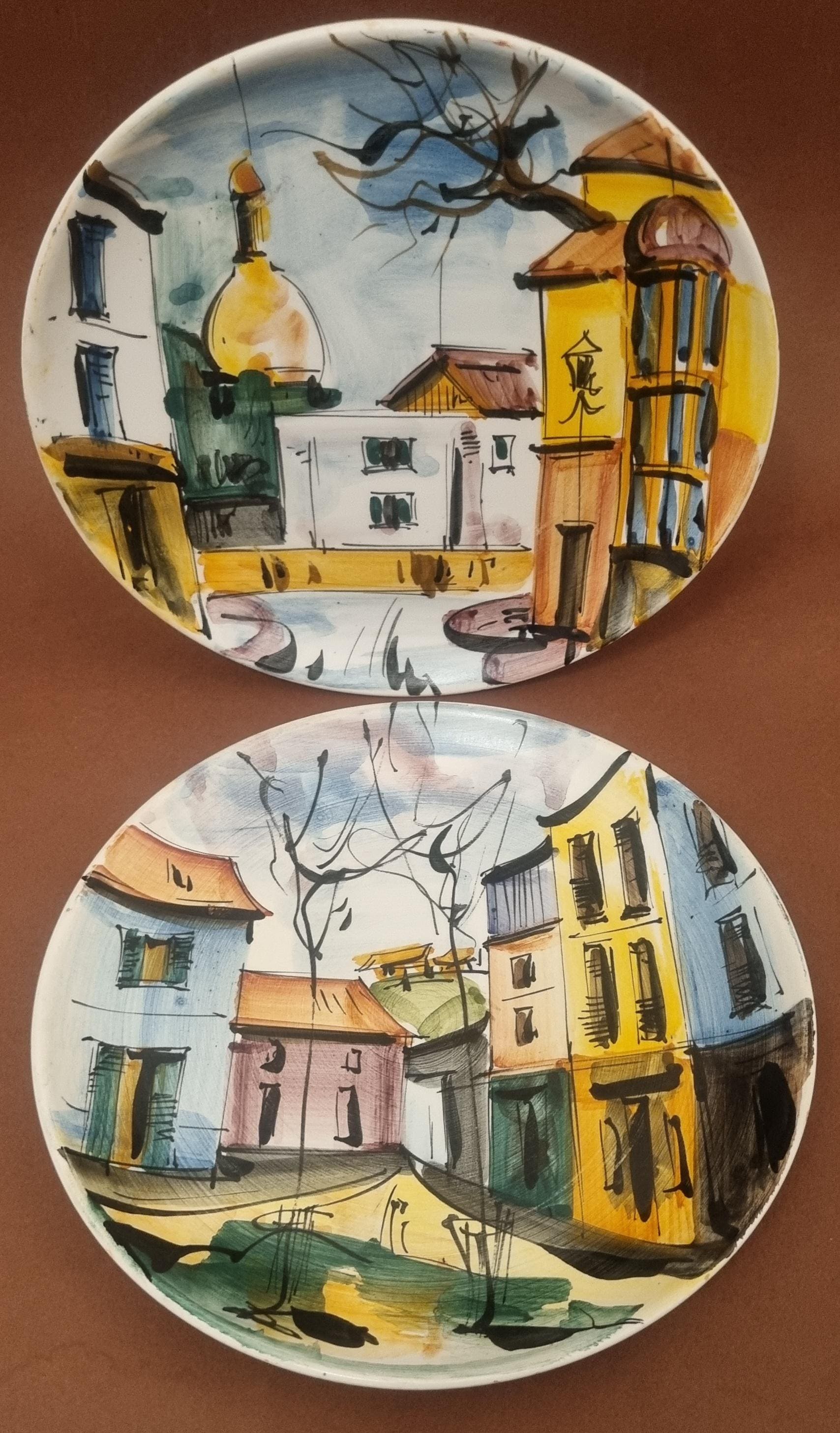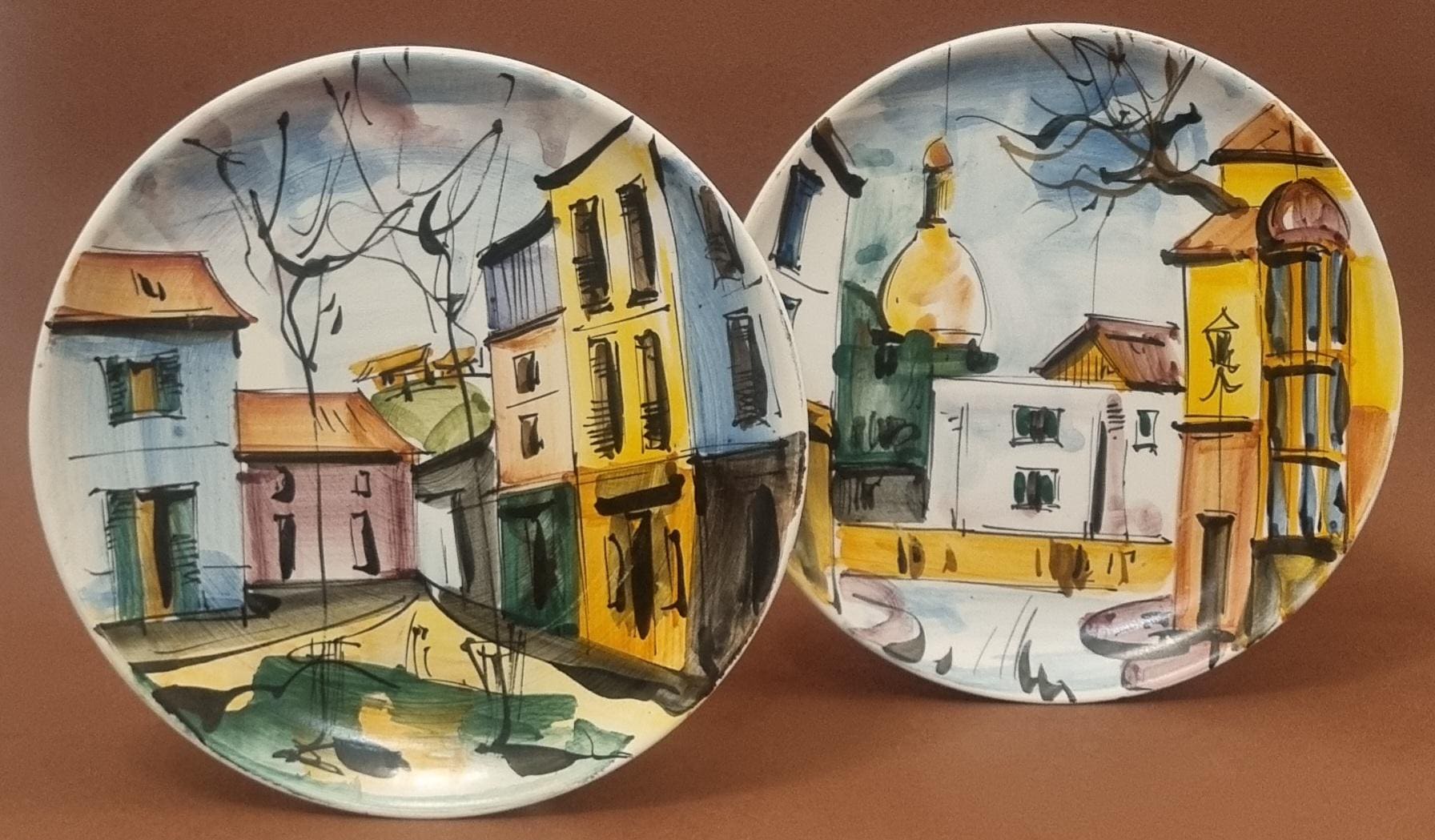 Decorative and collectible colourful hand-painted "city scape" plates.