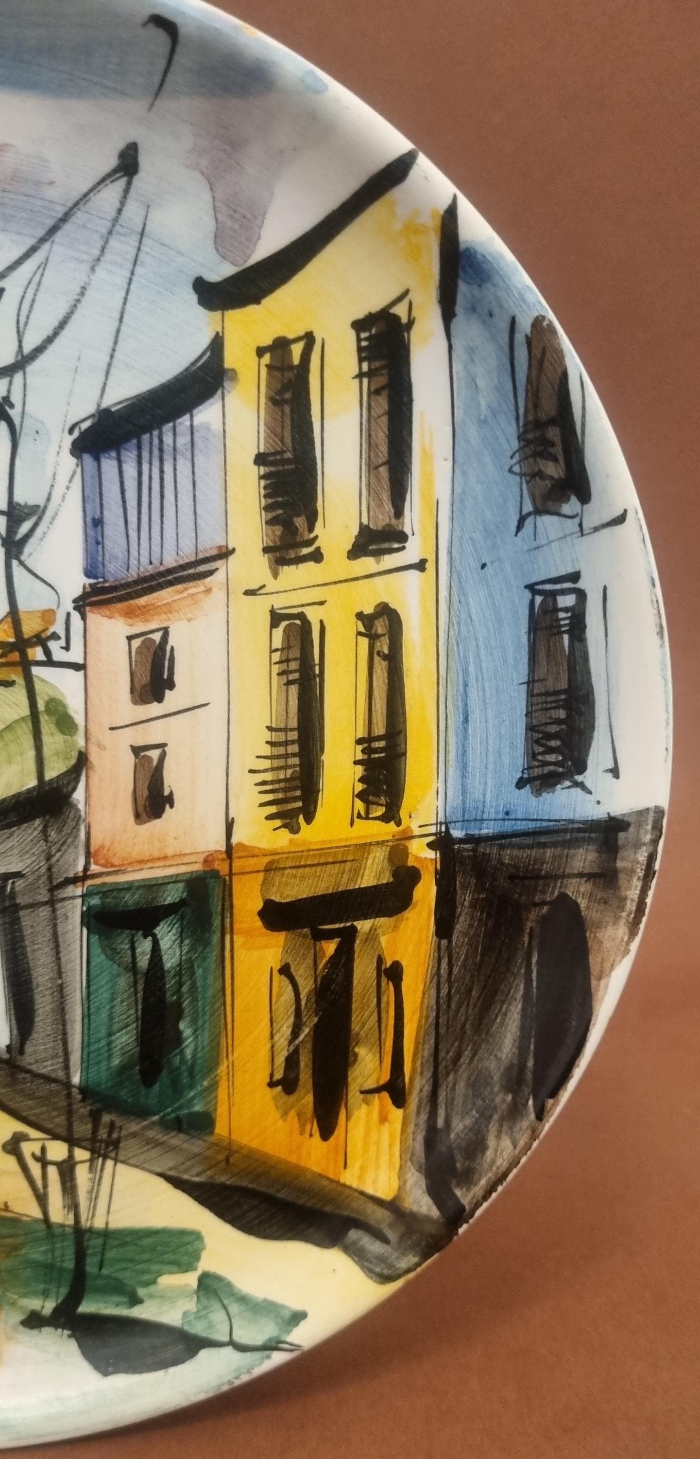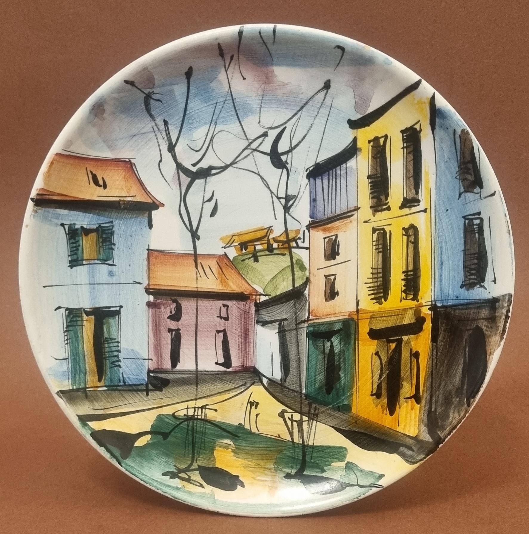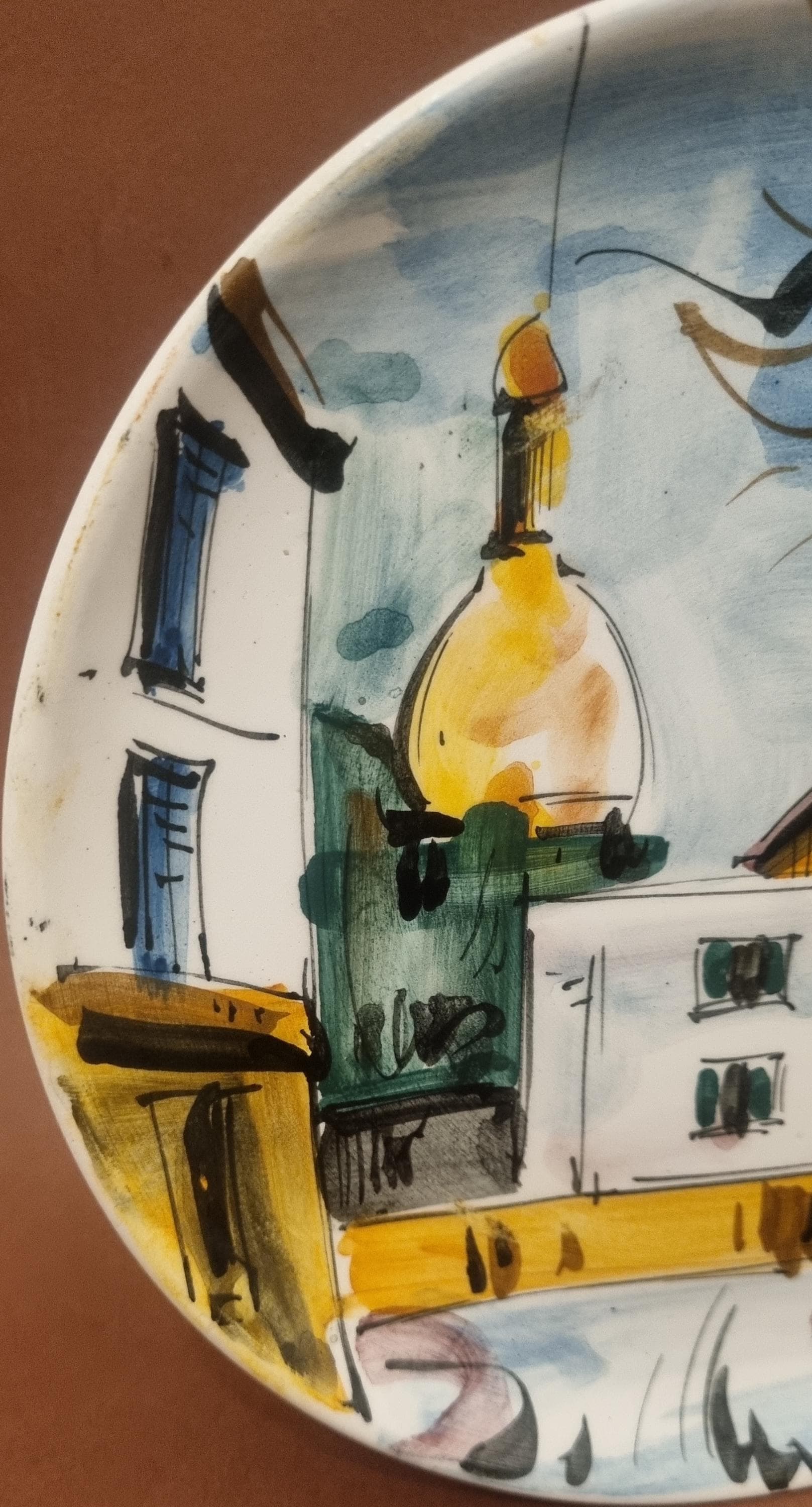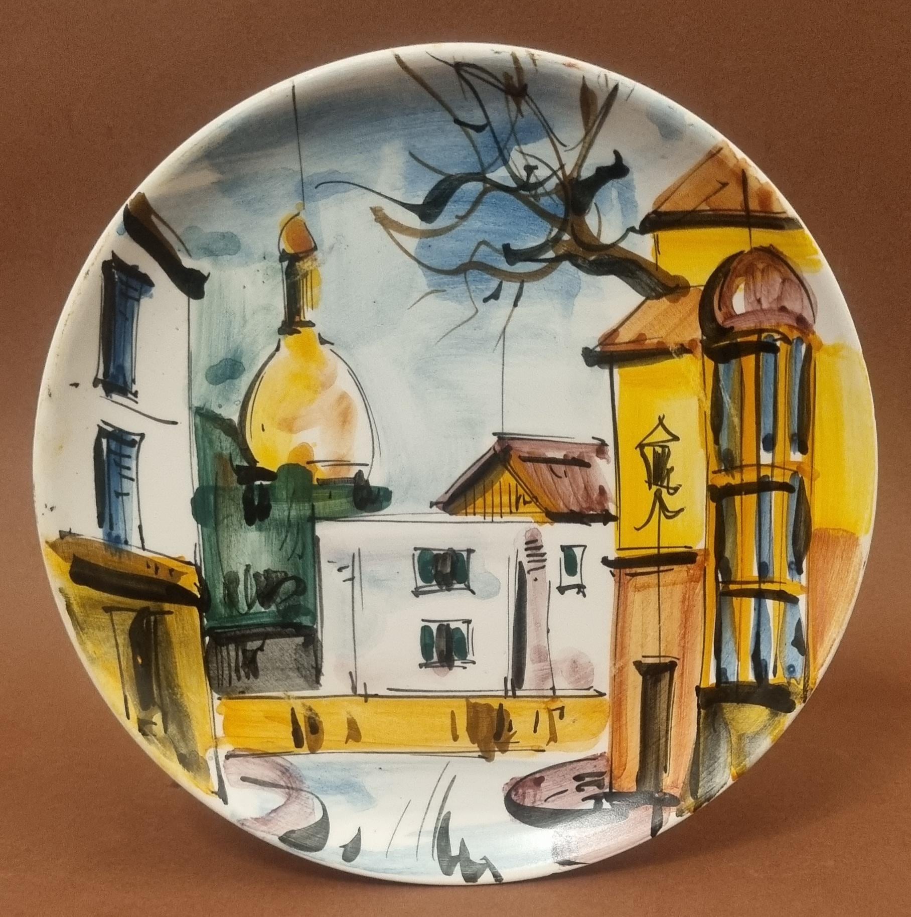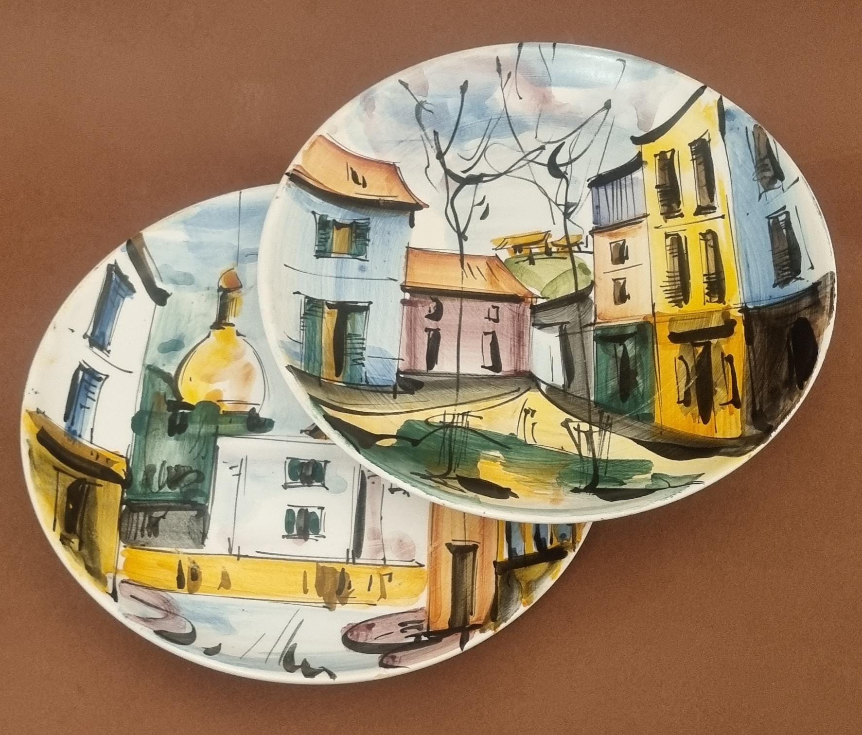 Decorative and collectible colourful hand-painted "city scape" plates.