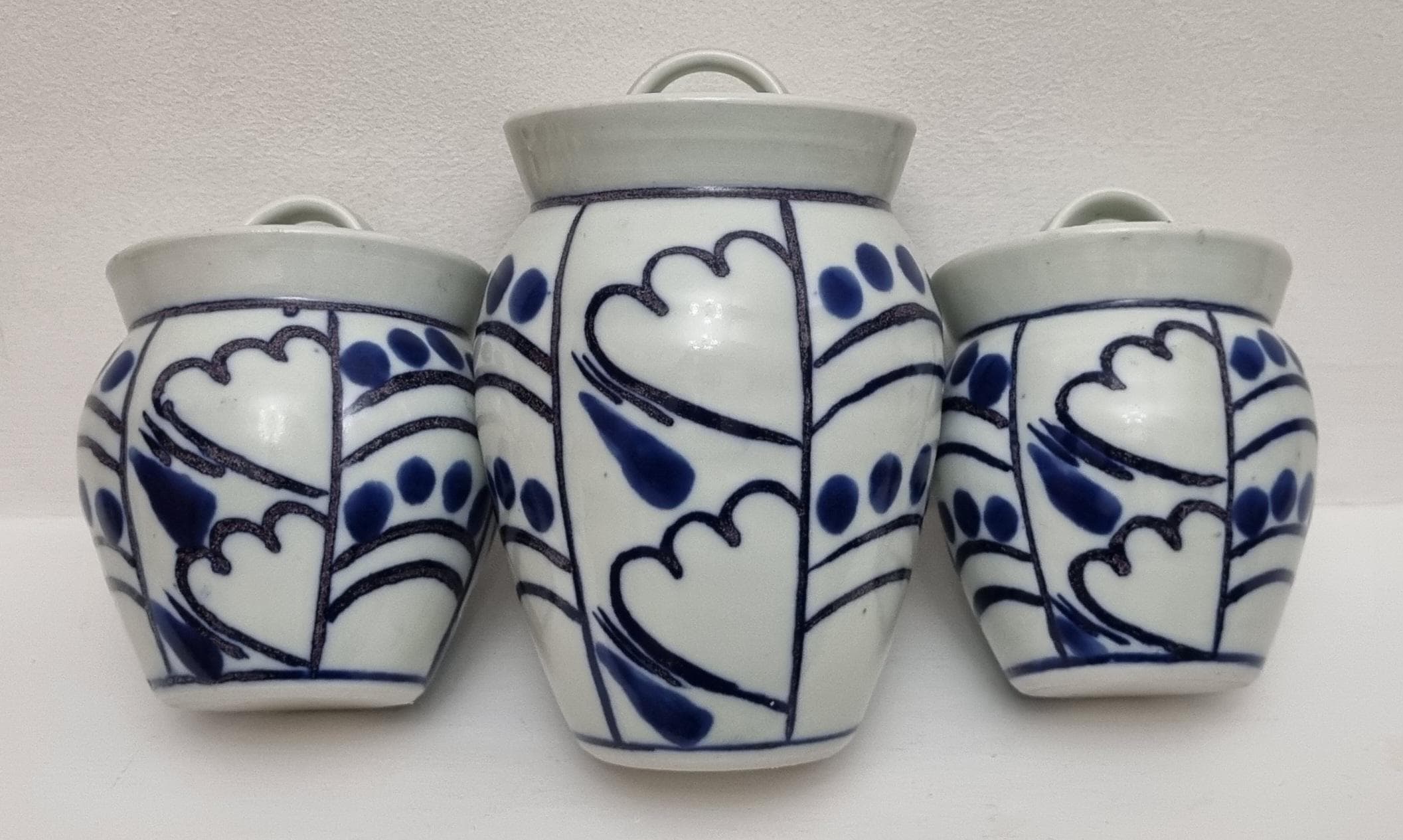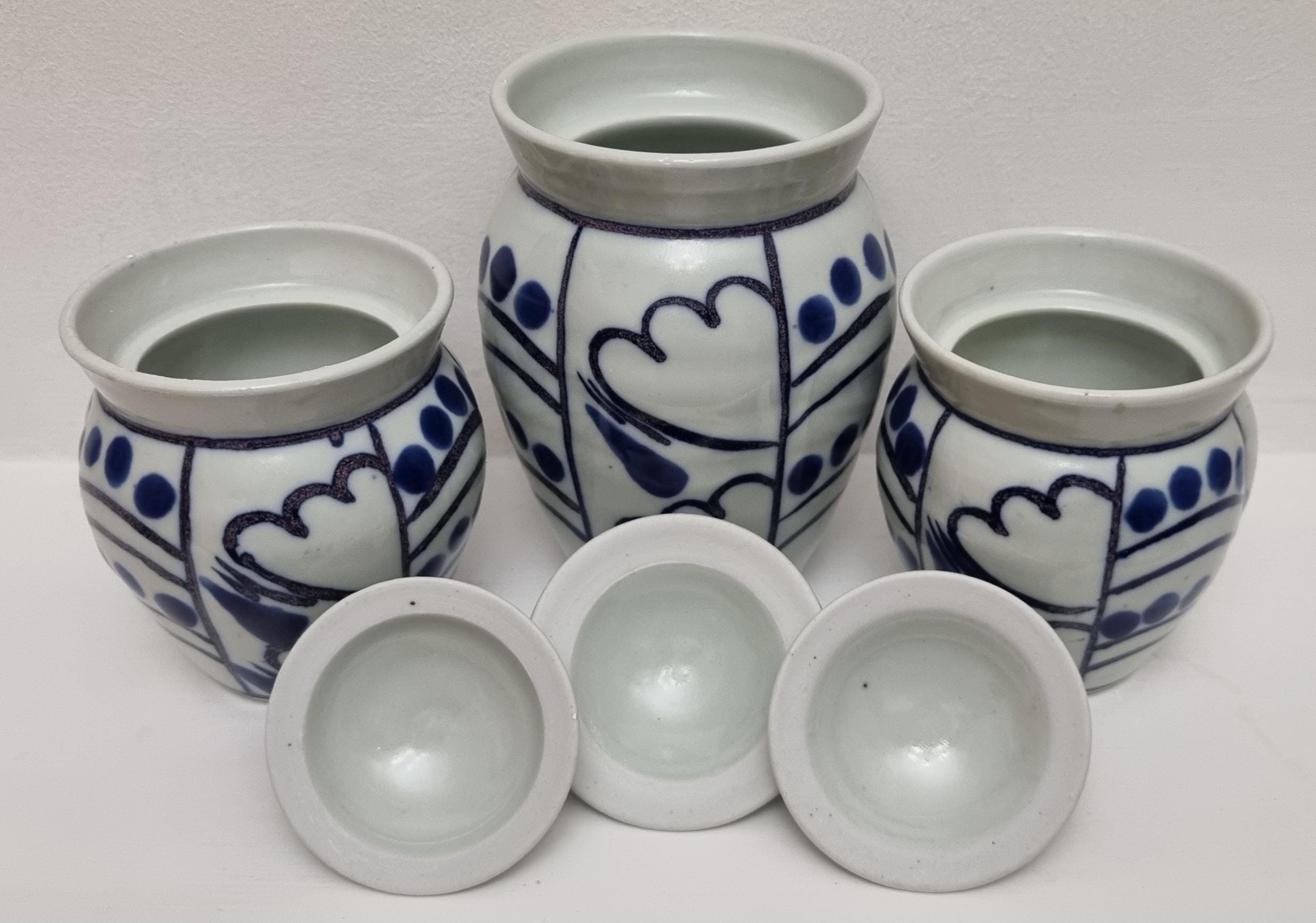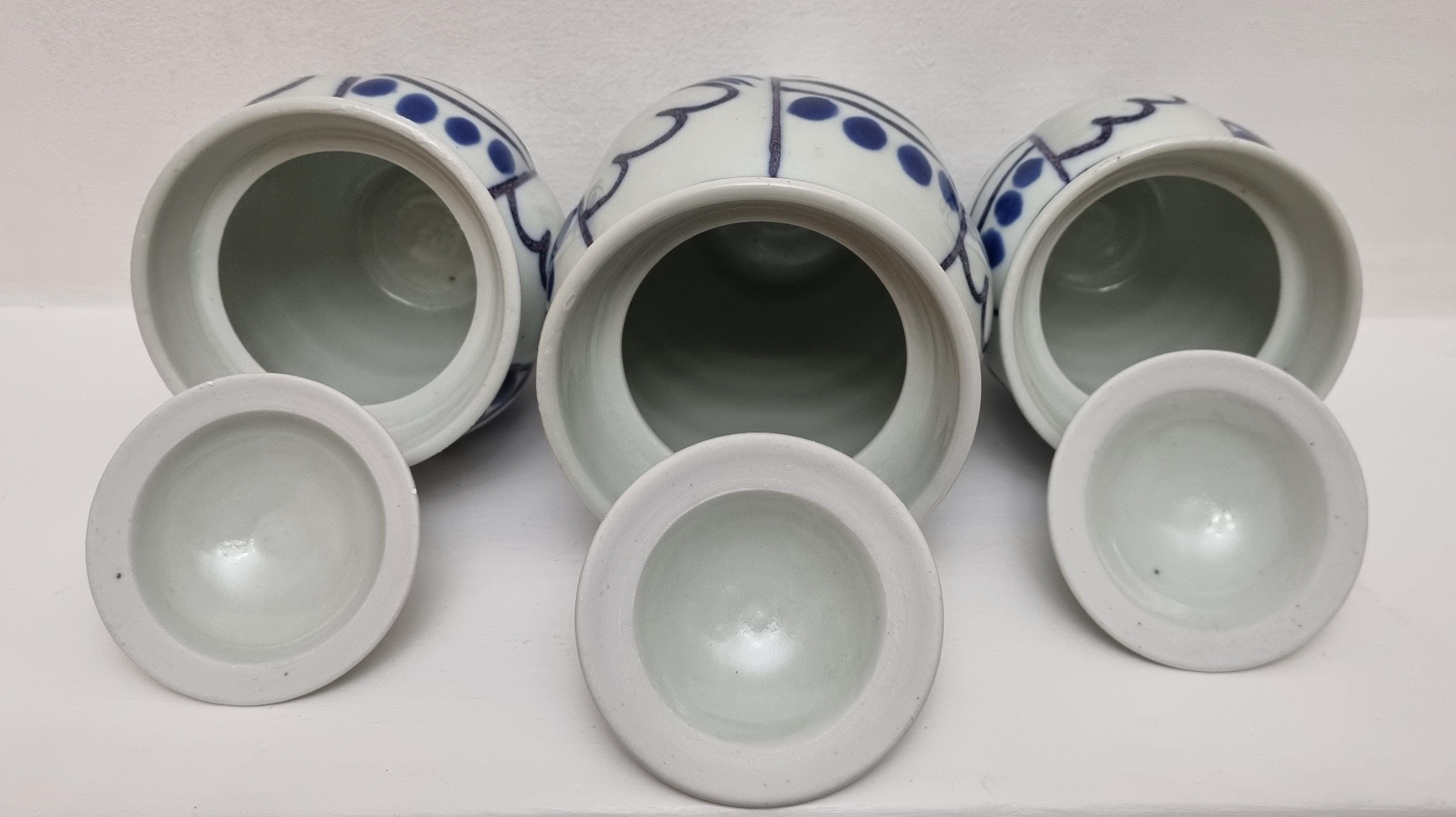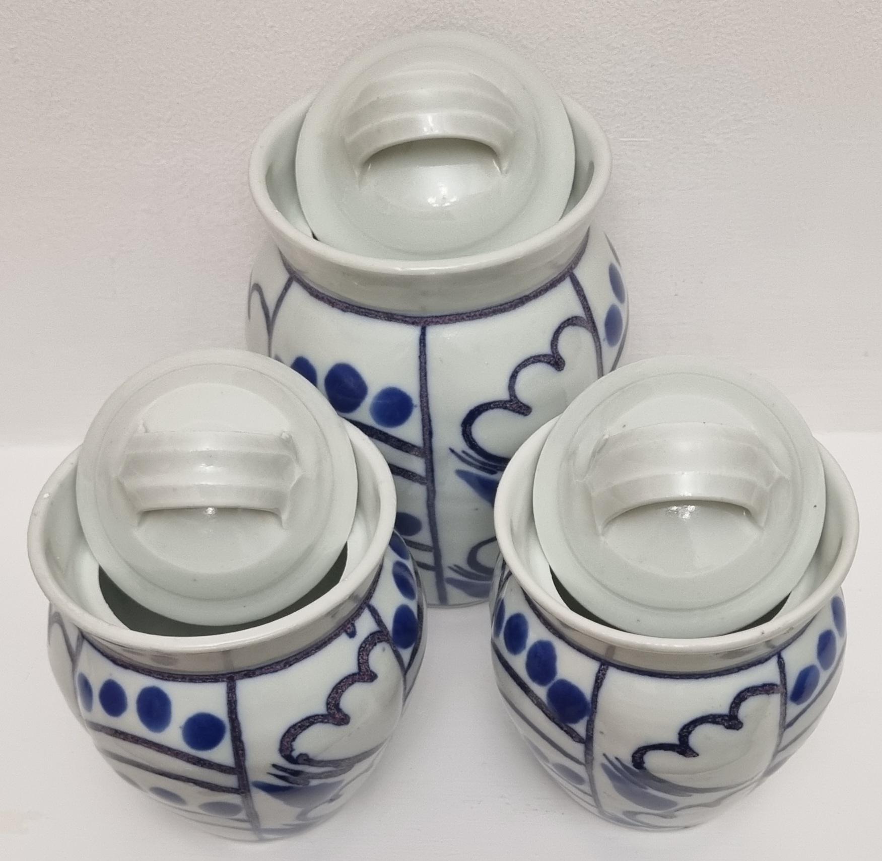A set of 3 blue and white porcelain ginger/storage jars or can be displayed as decorative pieces.