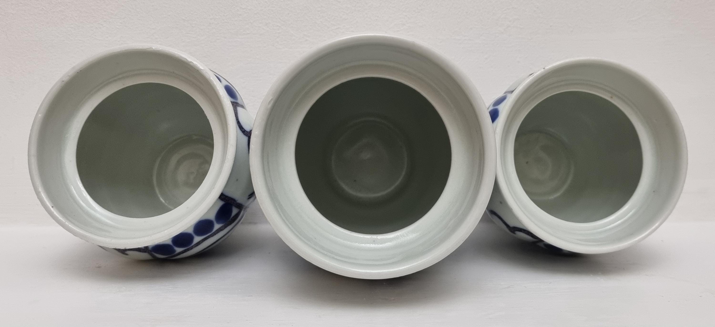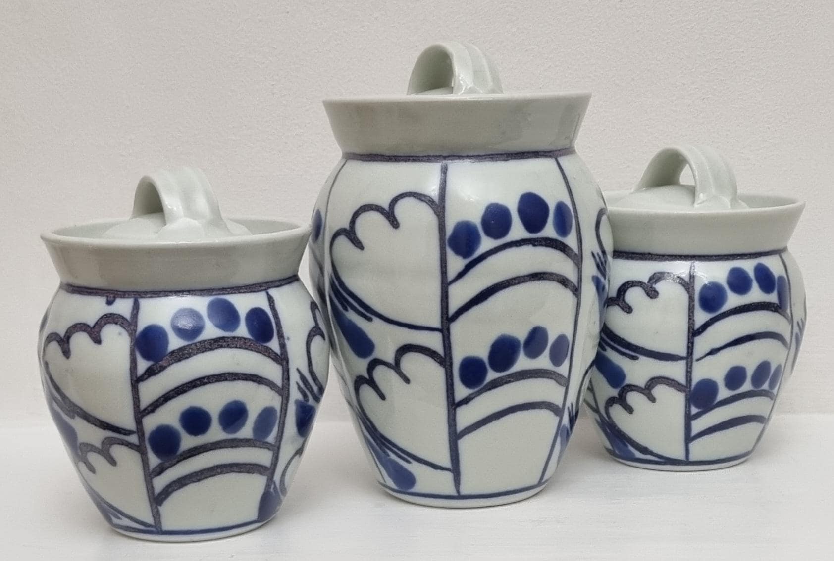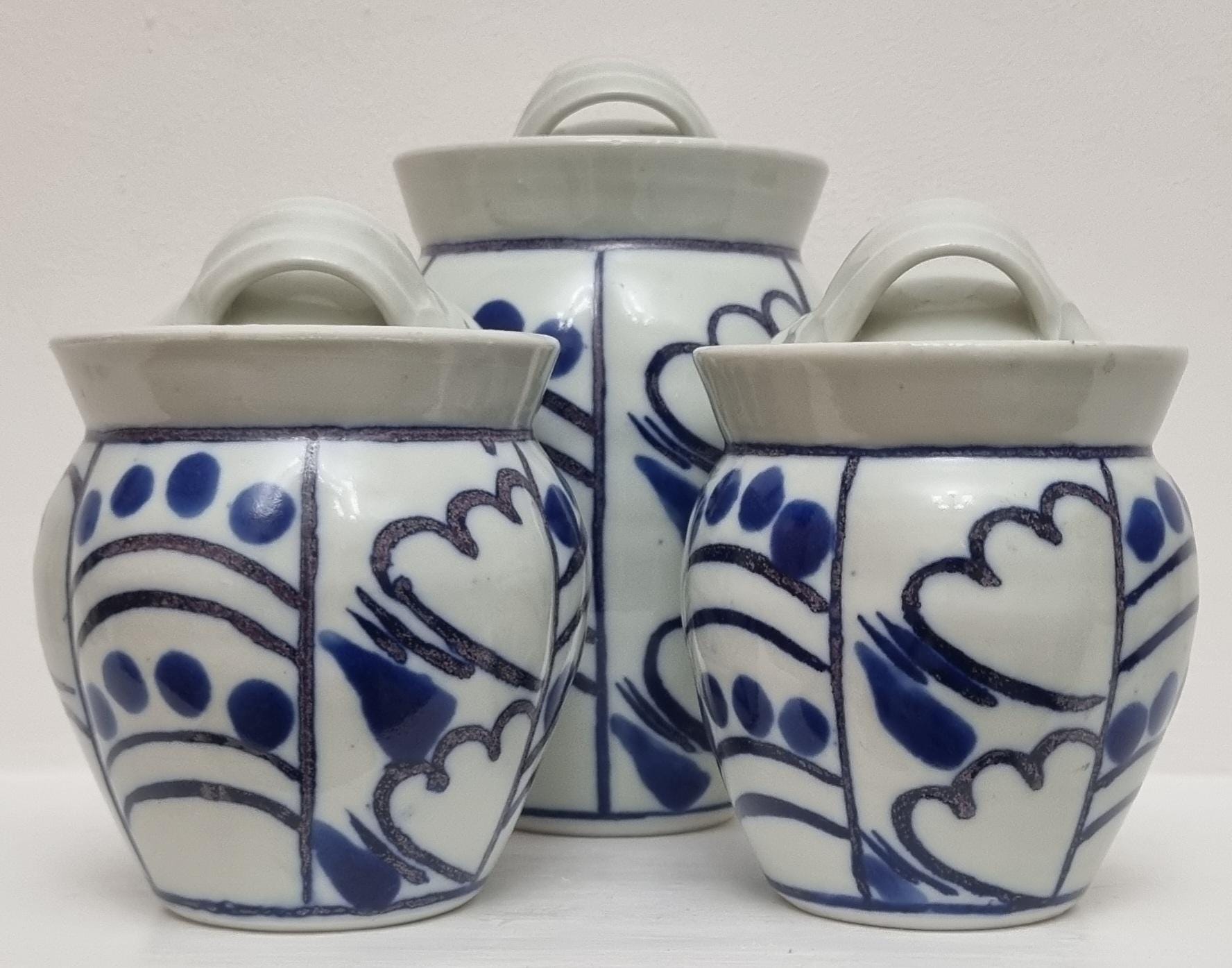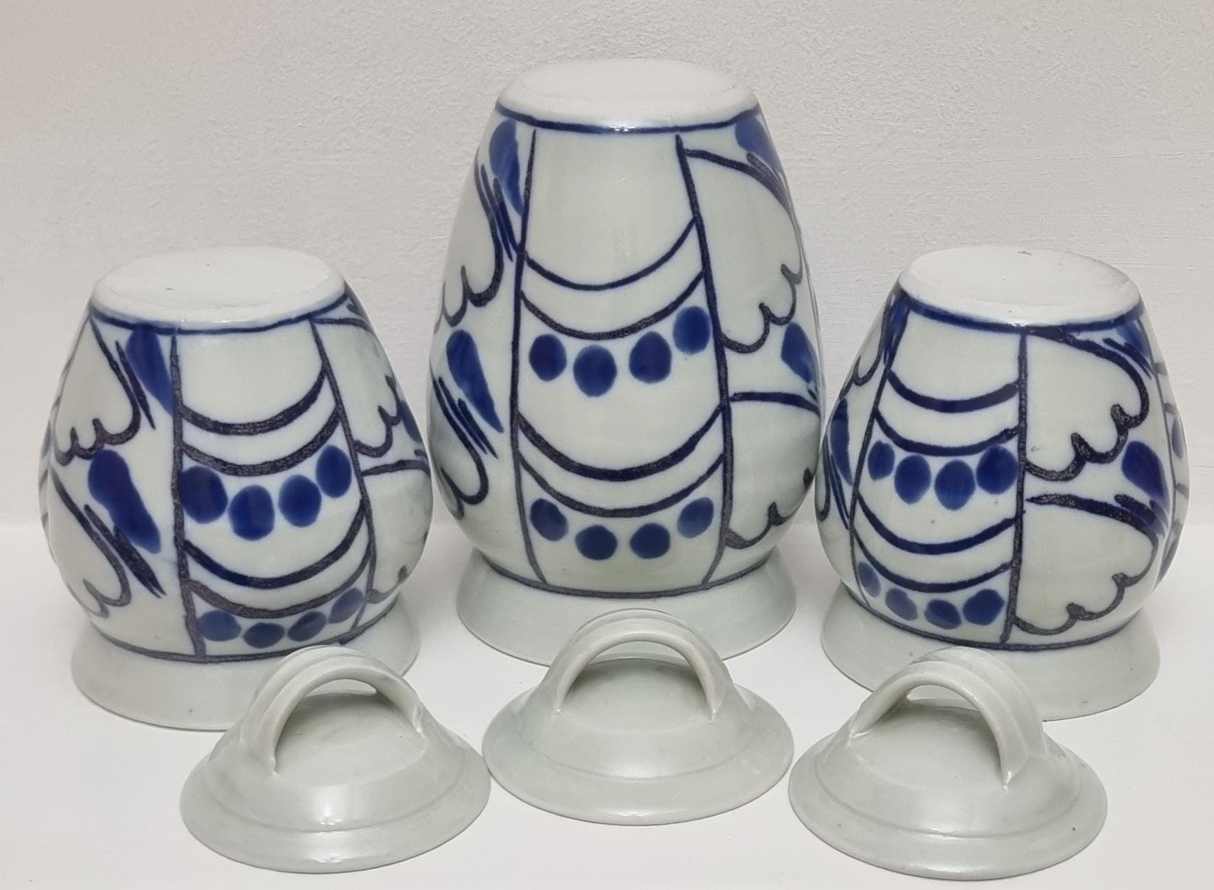 A set of 3 blue and white porcelain ginger/storage jars or can be displayed as decorative pieces.