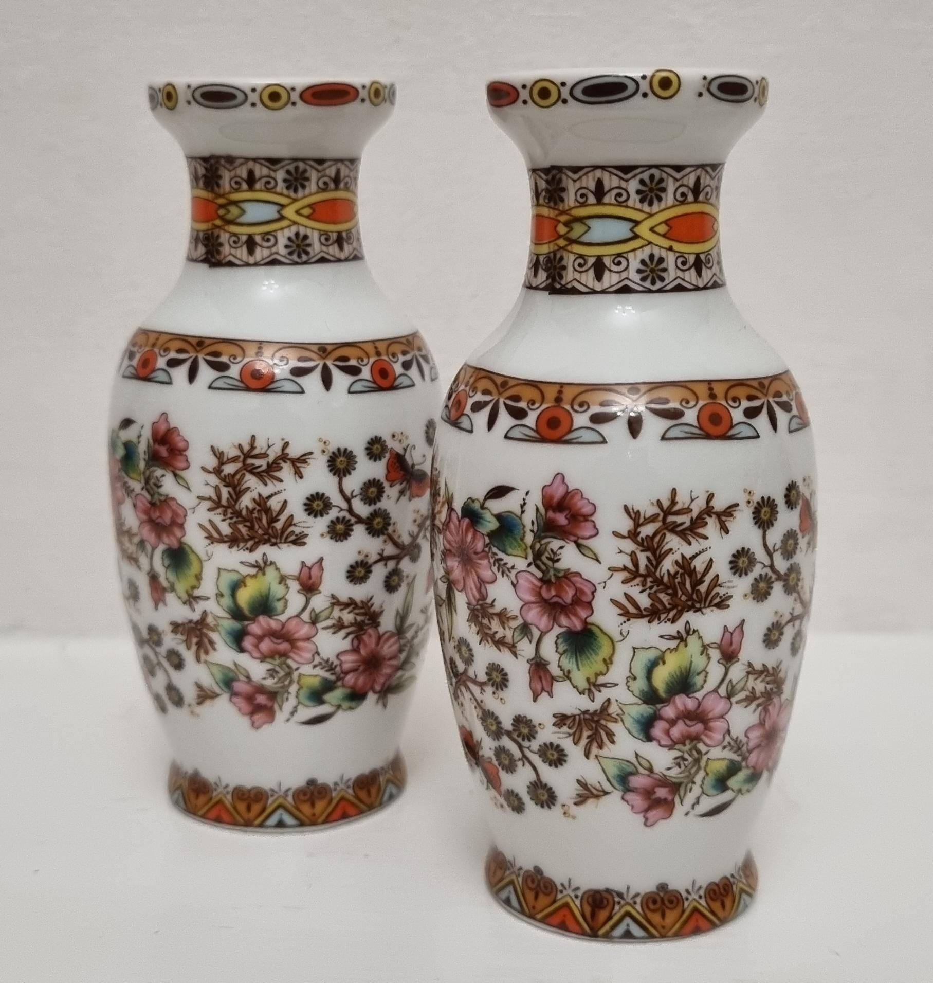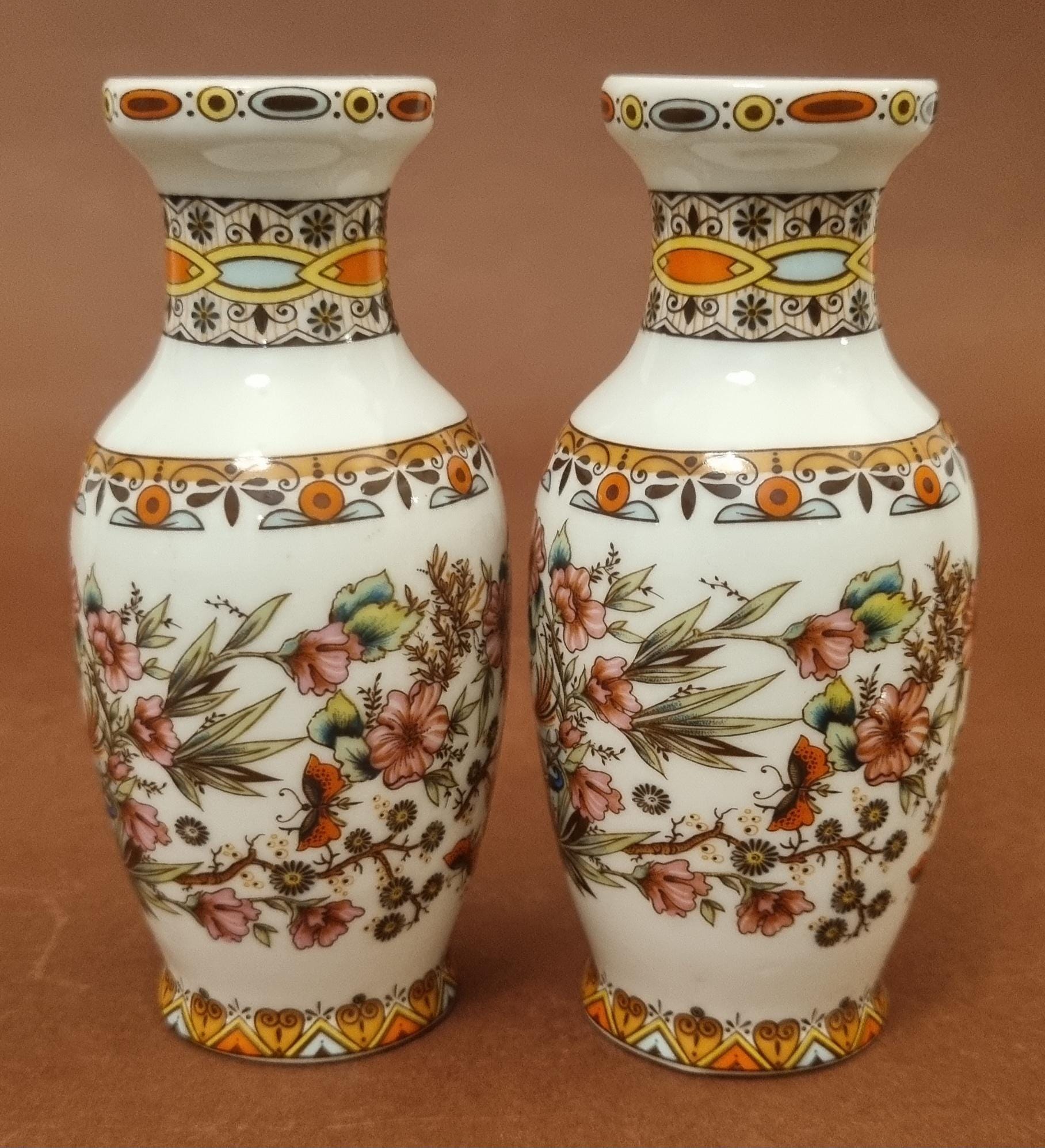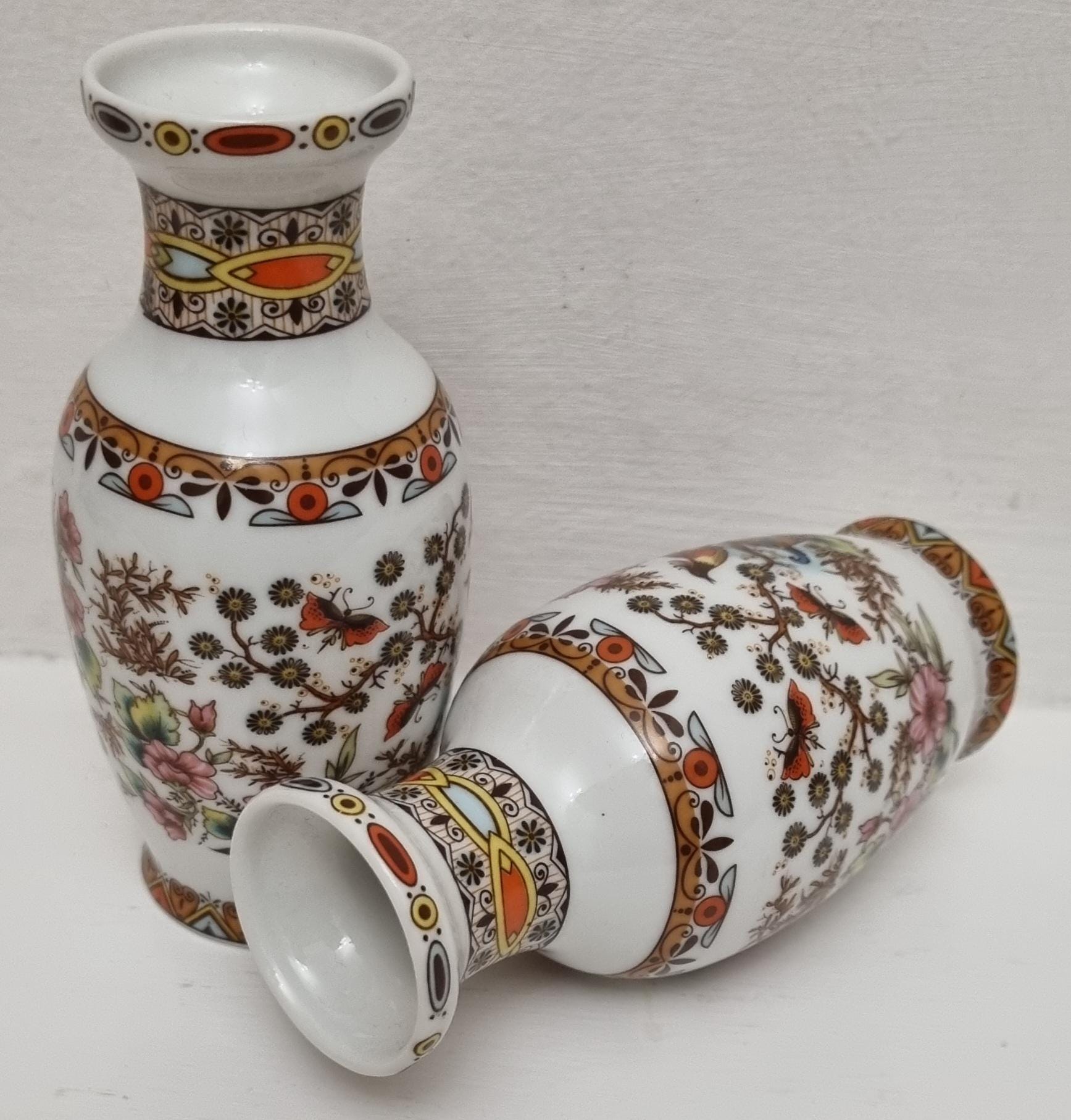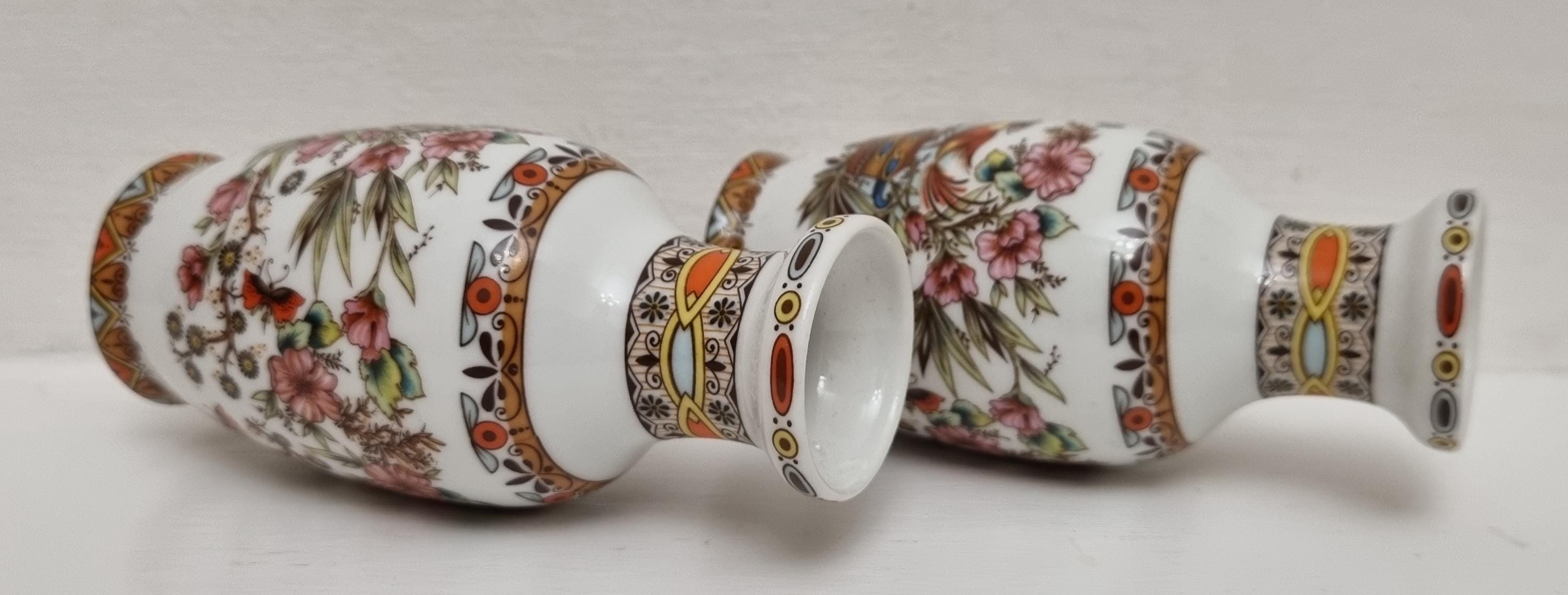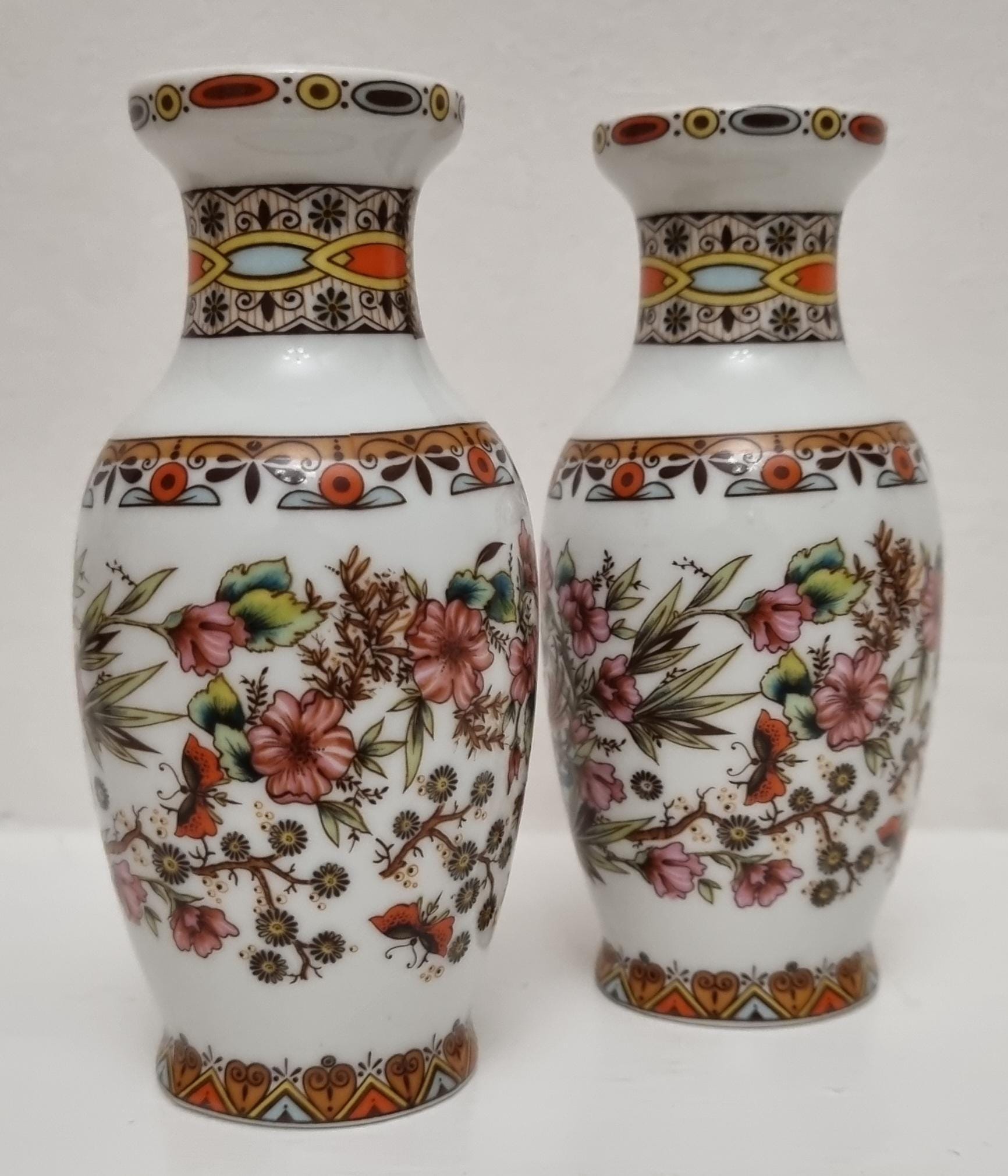 Beautiful Spanish Porcelain Vases that features a chinoiserie/Asian-inspired look with pink flowers, butterflies, and a bird, combined with a geometric pattern on the rim.