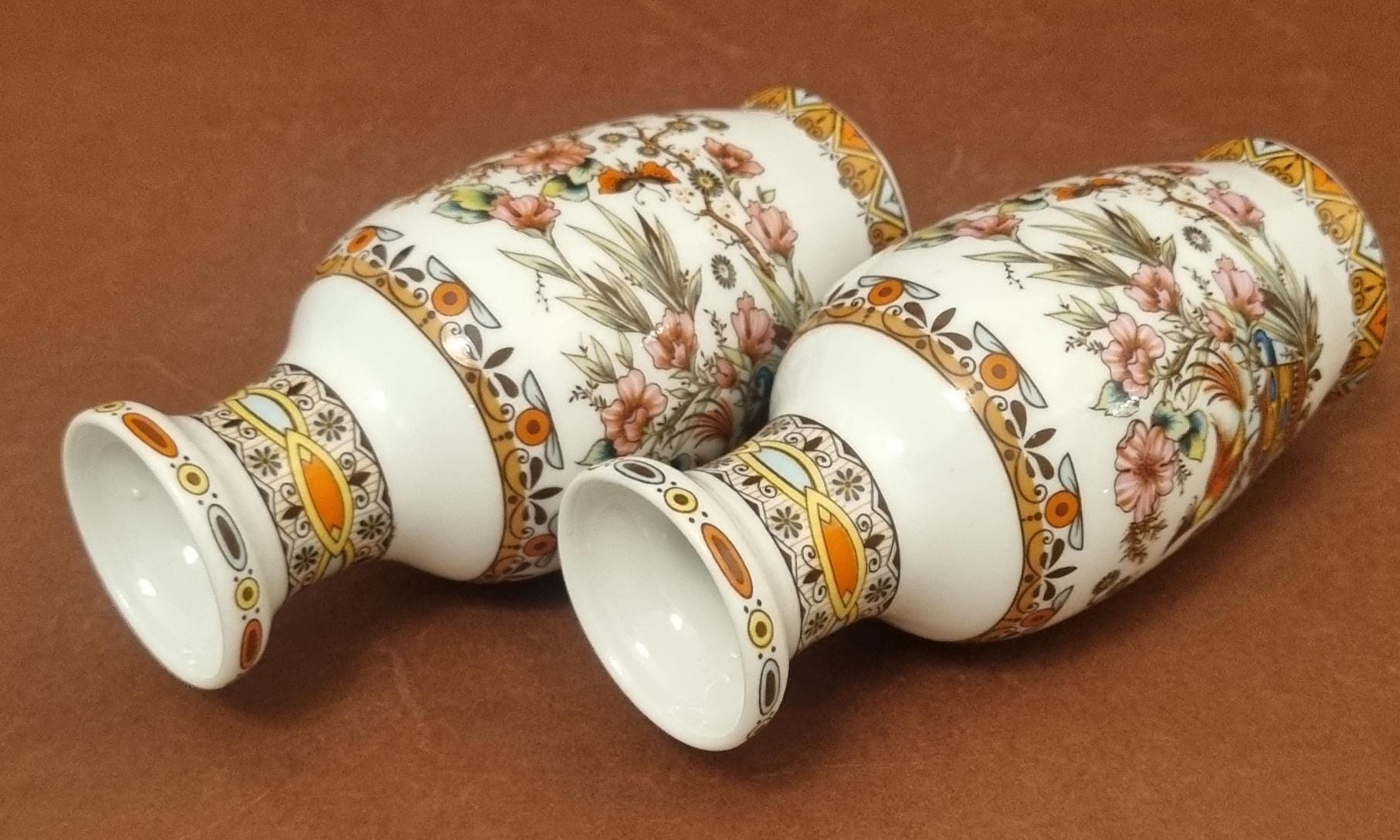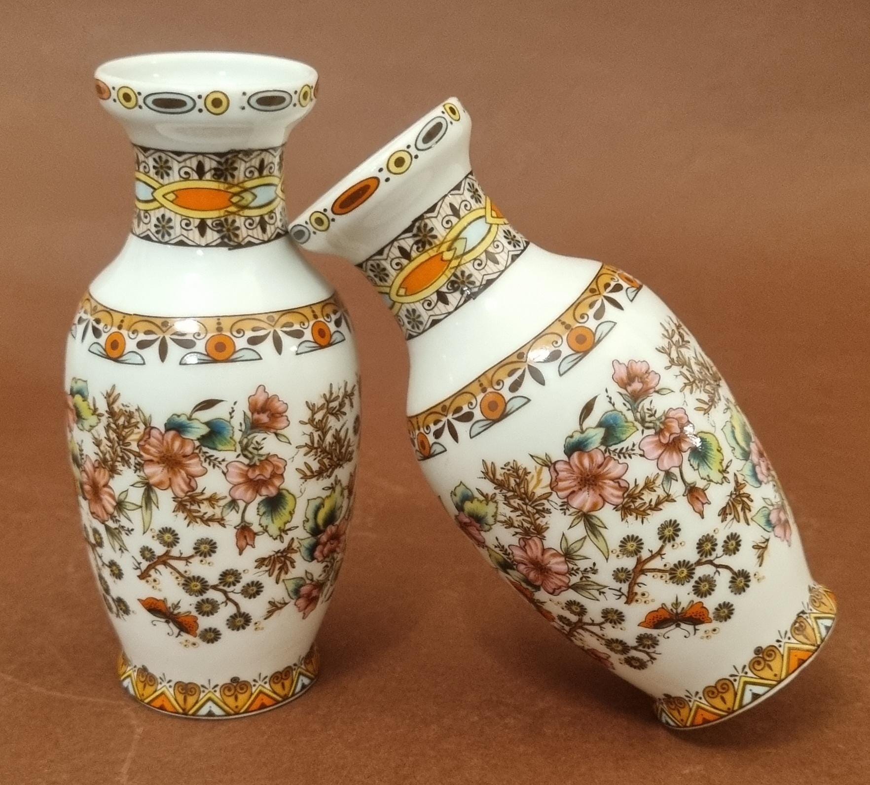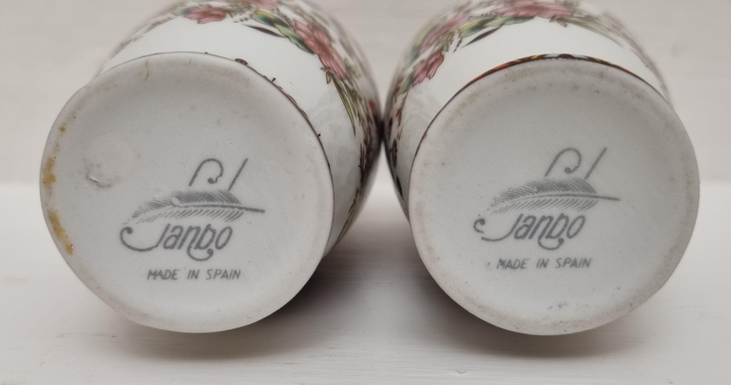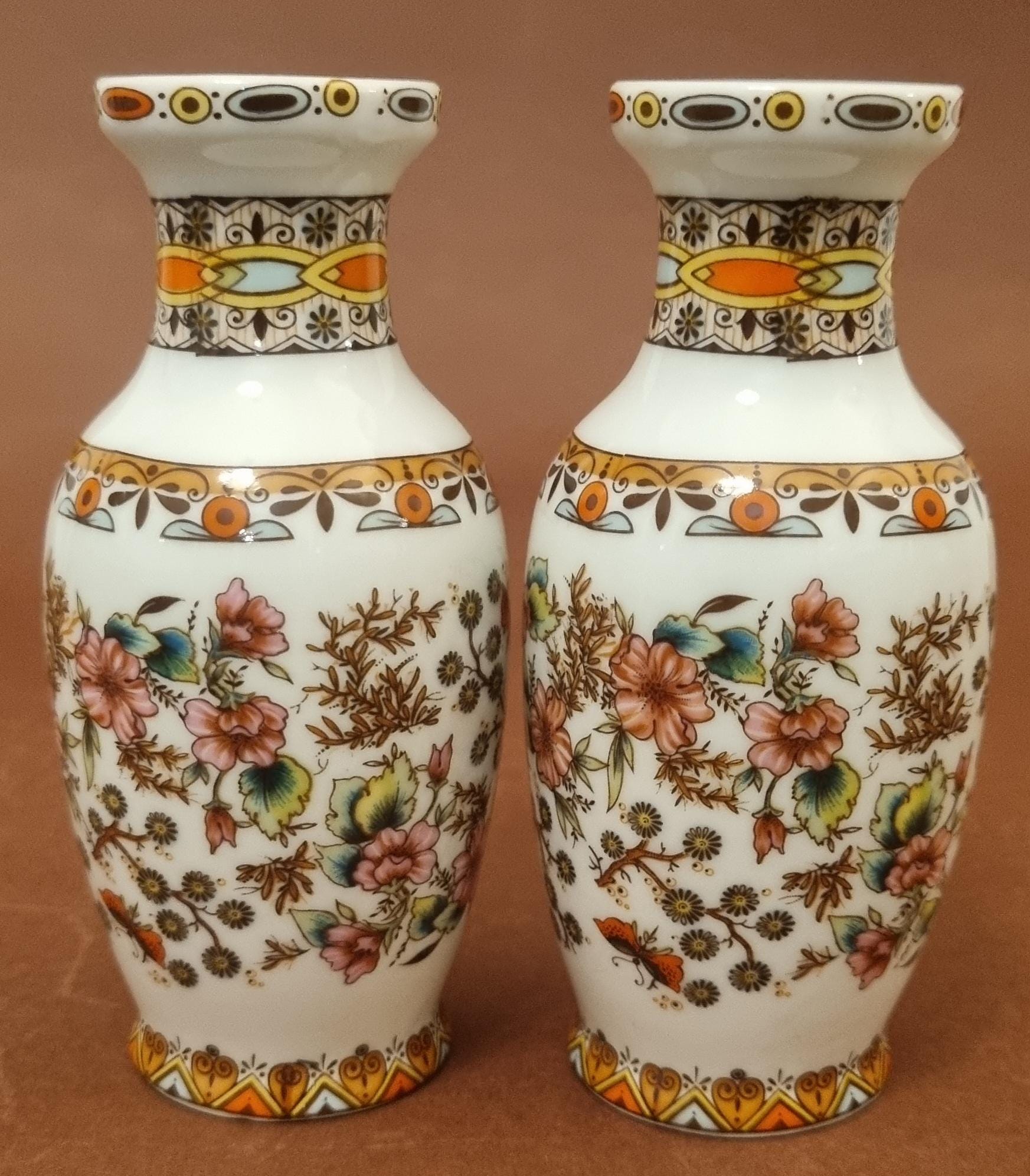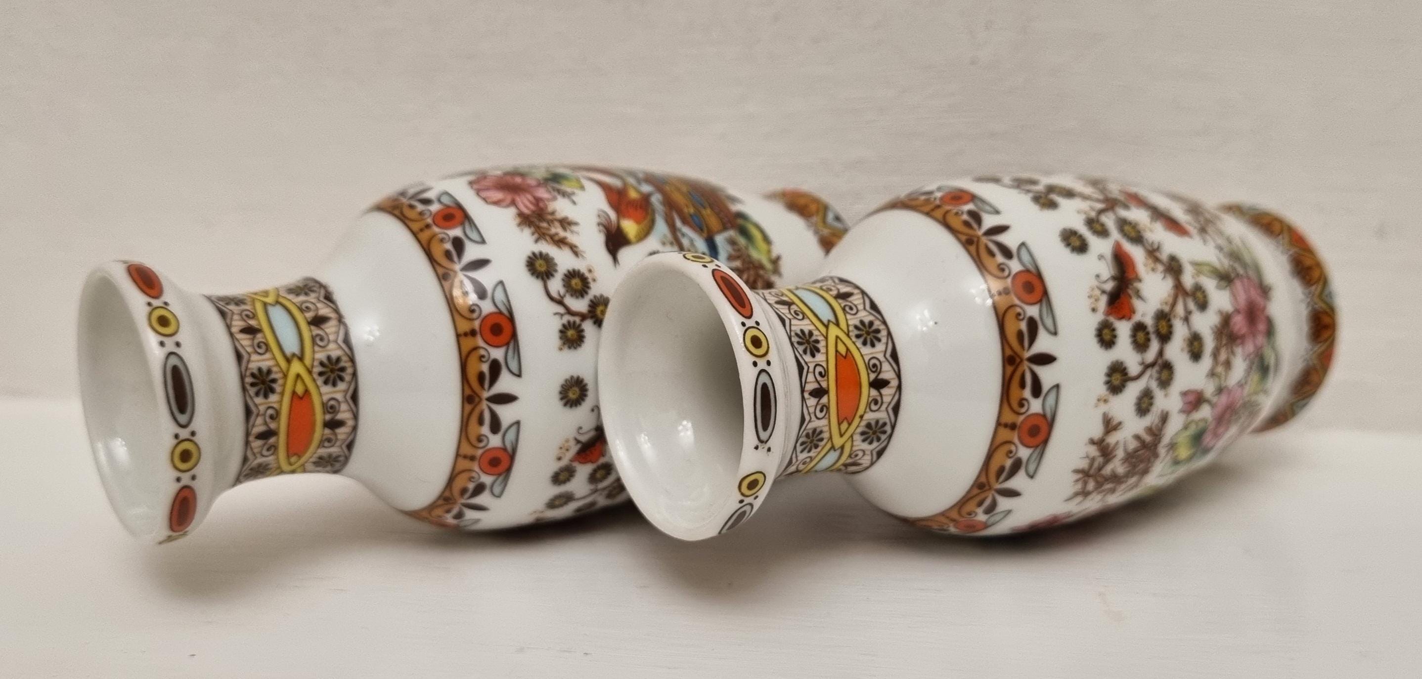 Beautiful Spanish Porcelain Vases that features a chinoiserie/Asian-inspired look with pink flowers, butterflies, and a bird, combined with a geometric pattern on the rim.