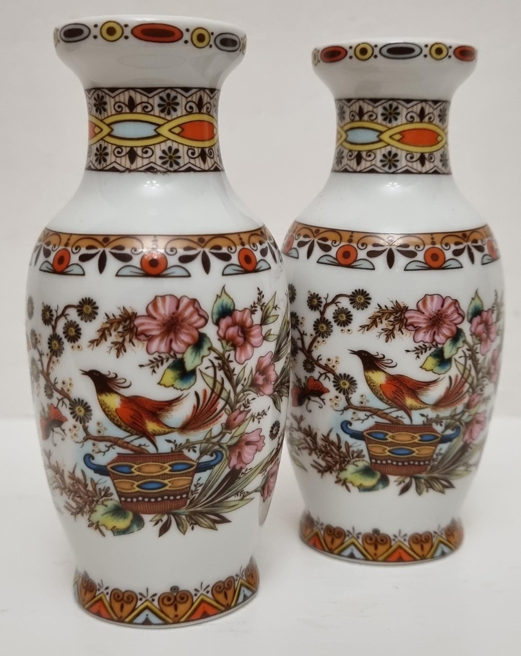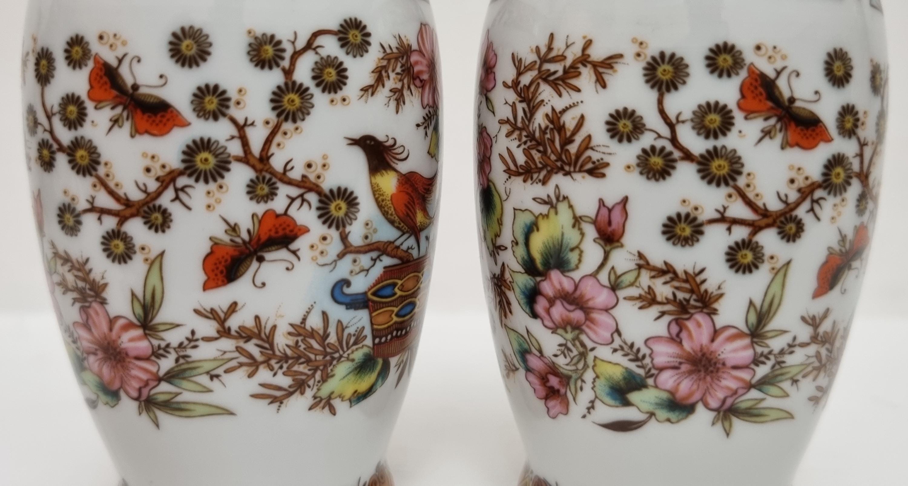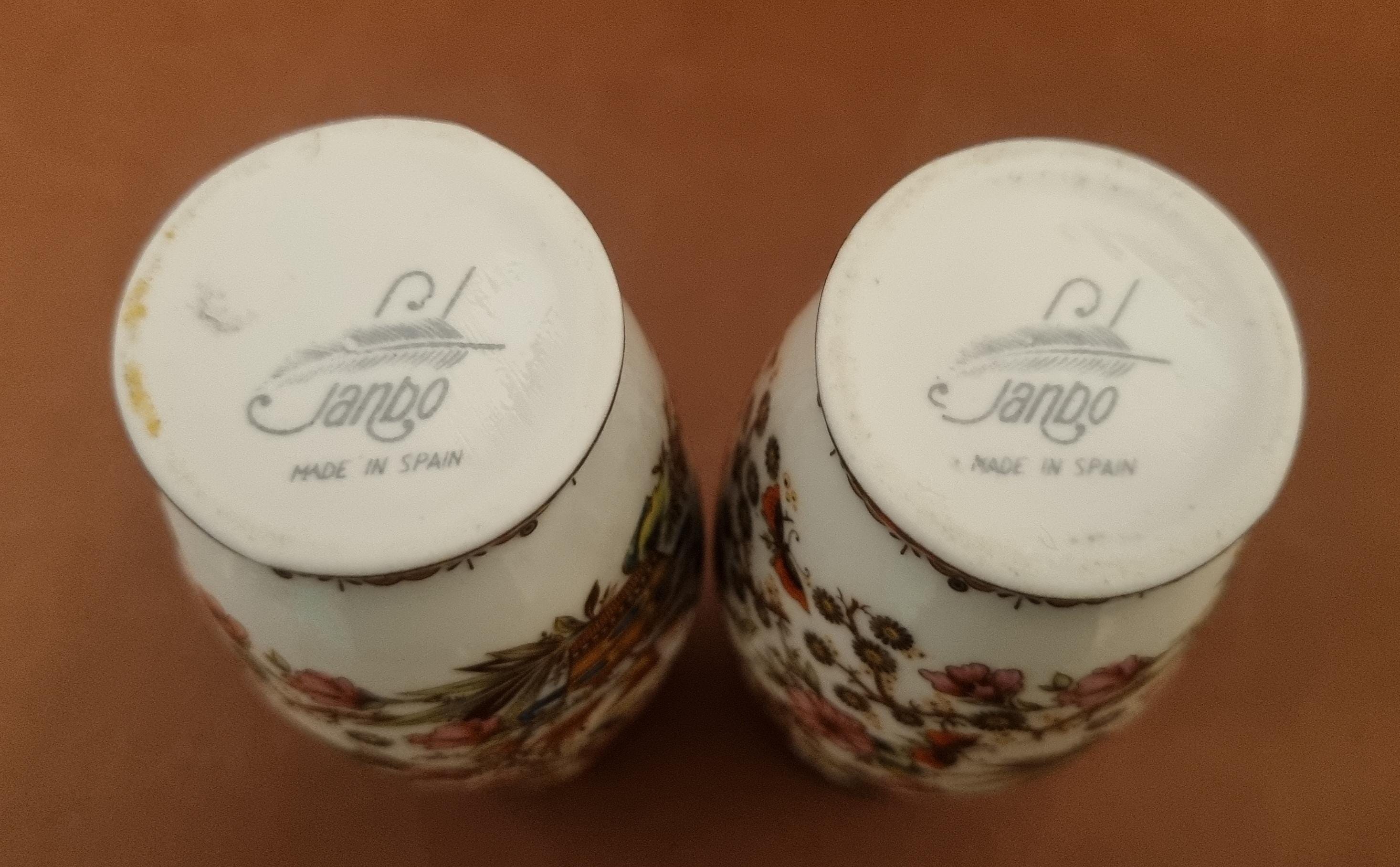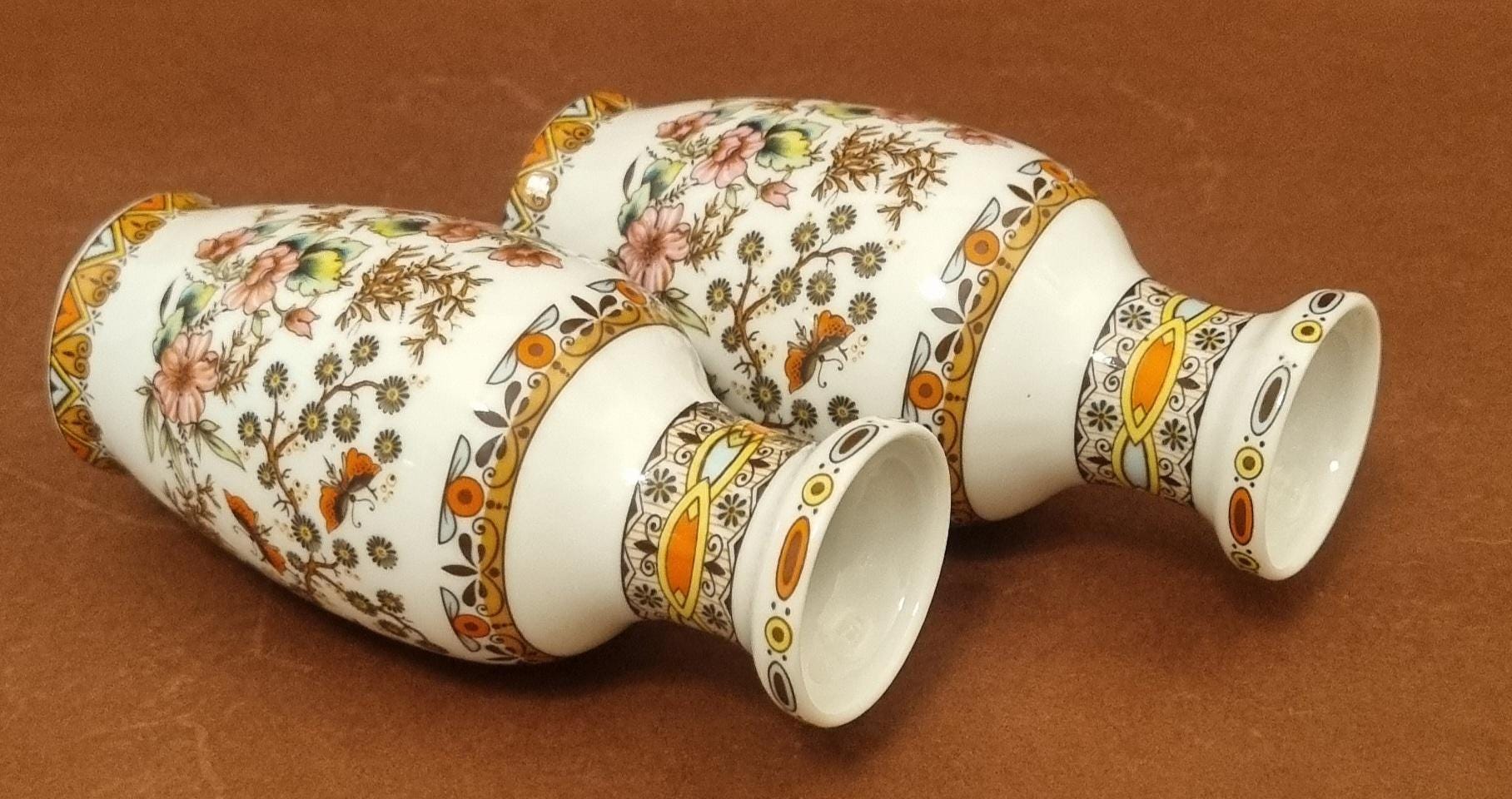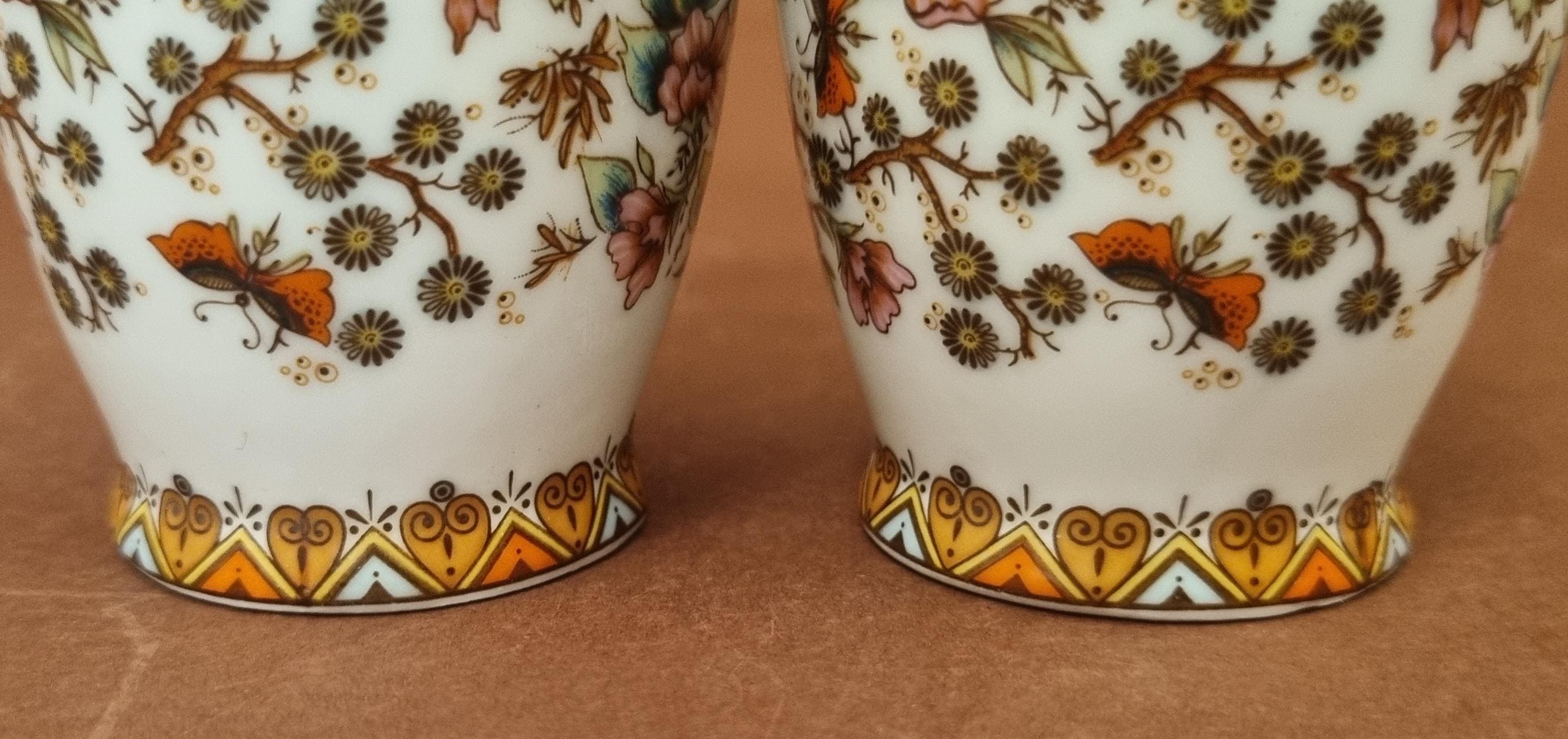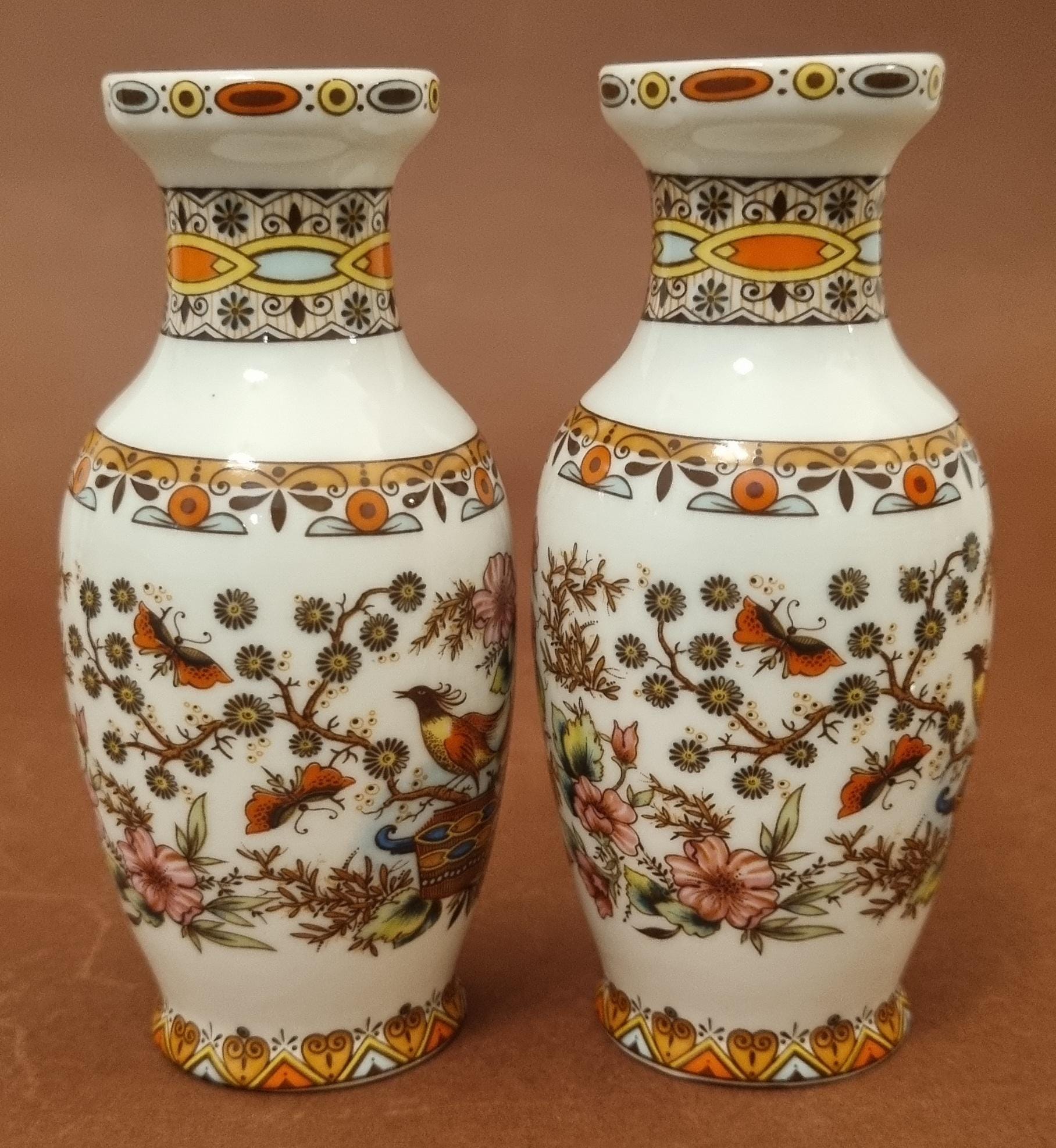 Beautiful Spanish Porcelain Vases that features a chinoiserie/Asian-inspired look with pink flowers, butterflies, and a bird, combined with a geometric pattern on the rim.