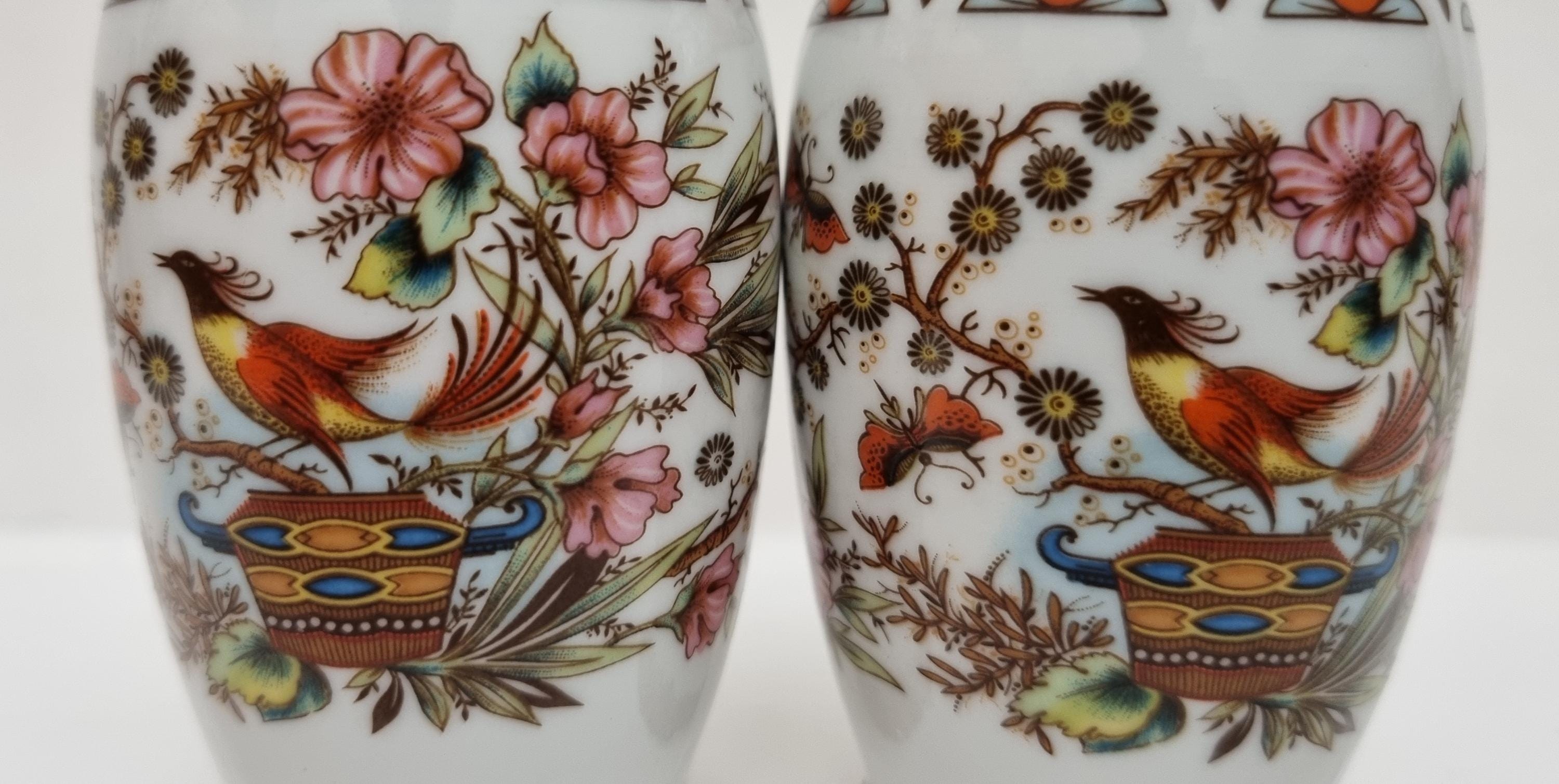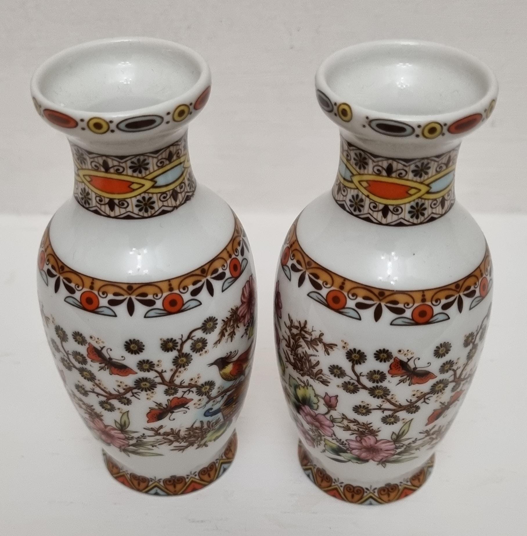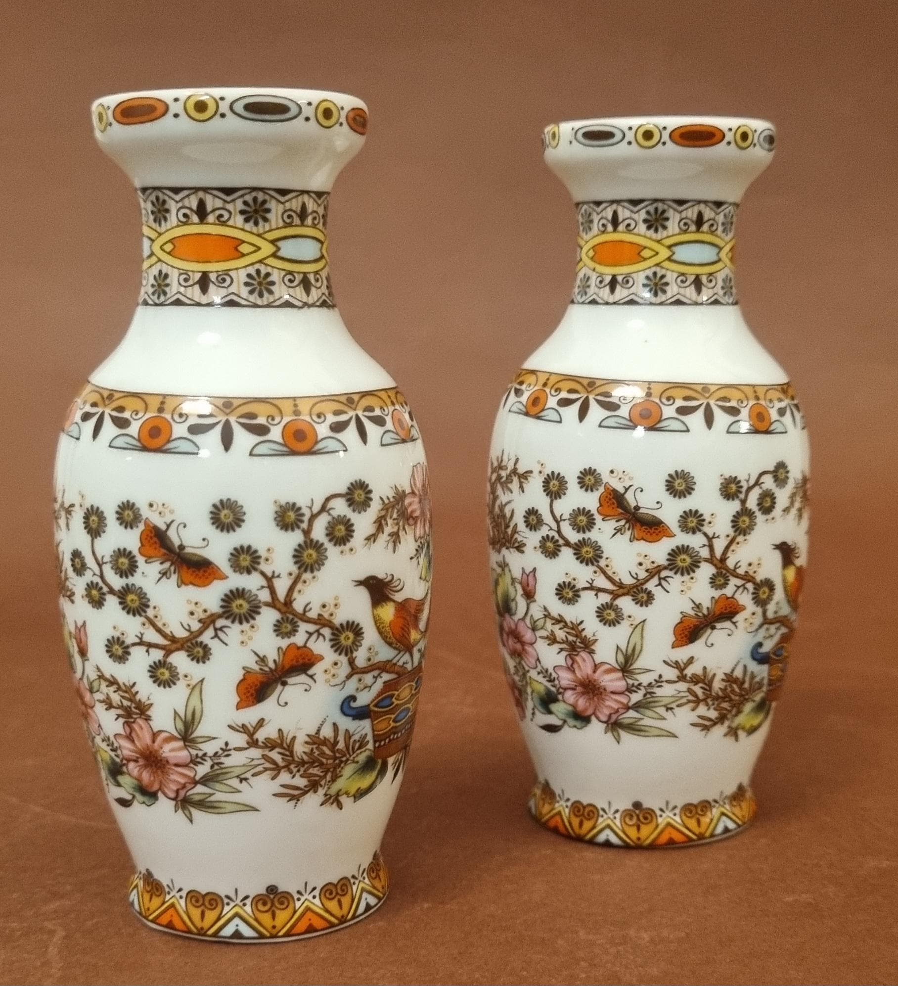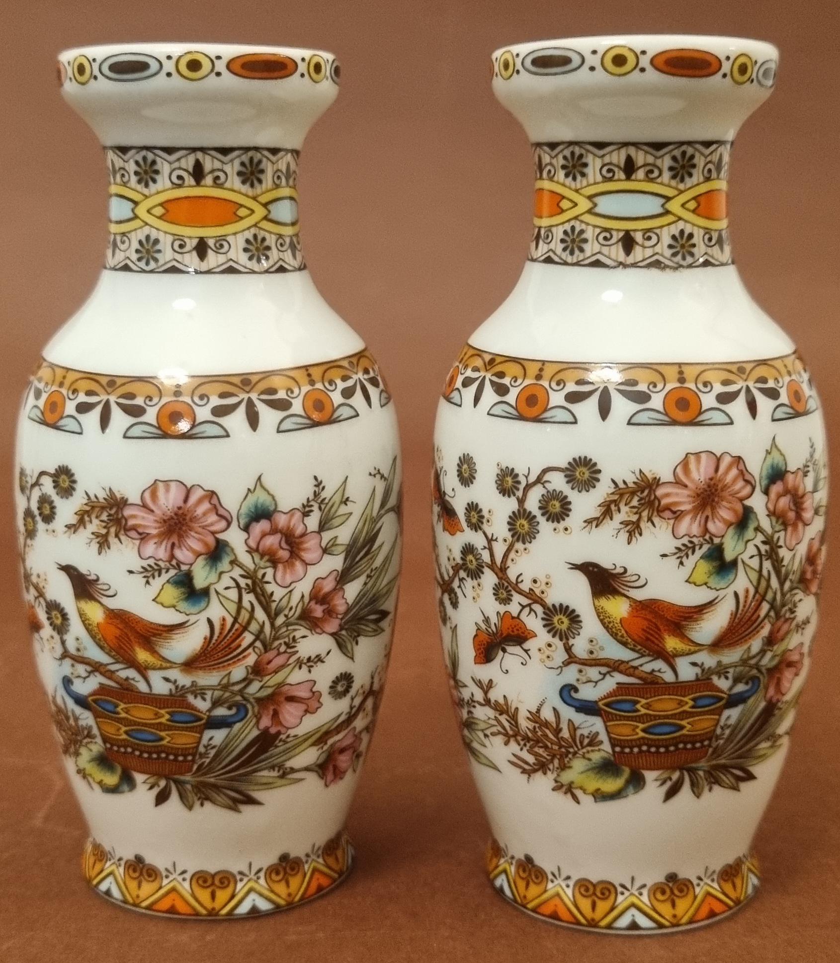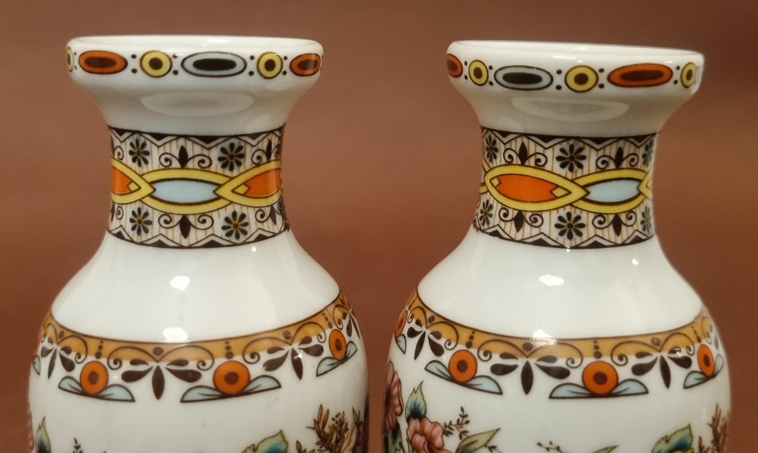 Beautiful Spanish Porcelain Vases that features a chinoiserie/Asian-inspired look with pink flowers, butterflies, and a bird, combined with a geometric pattern on the rim.