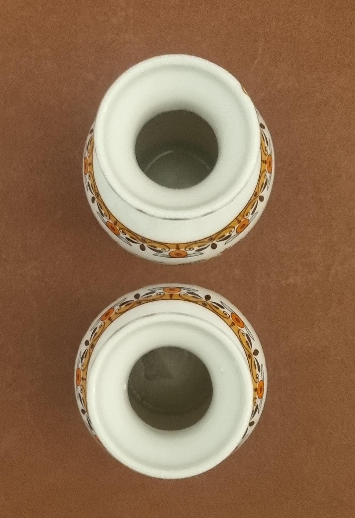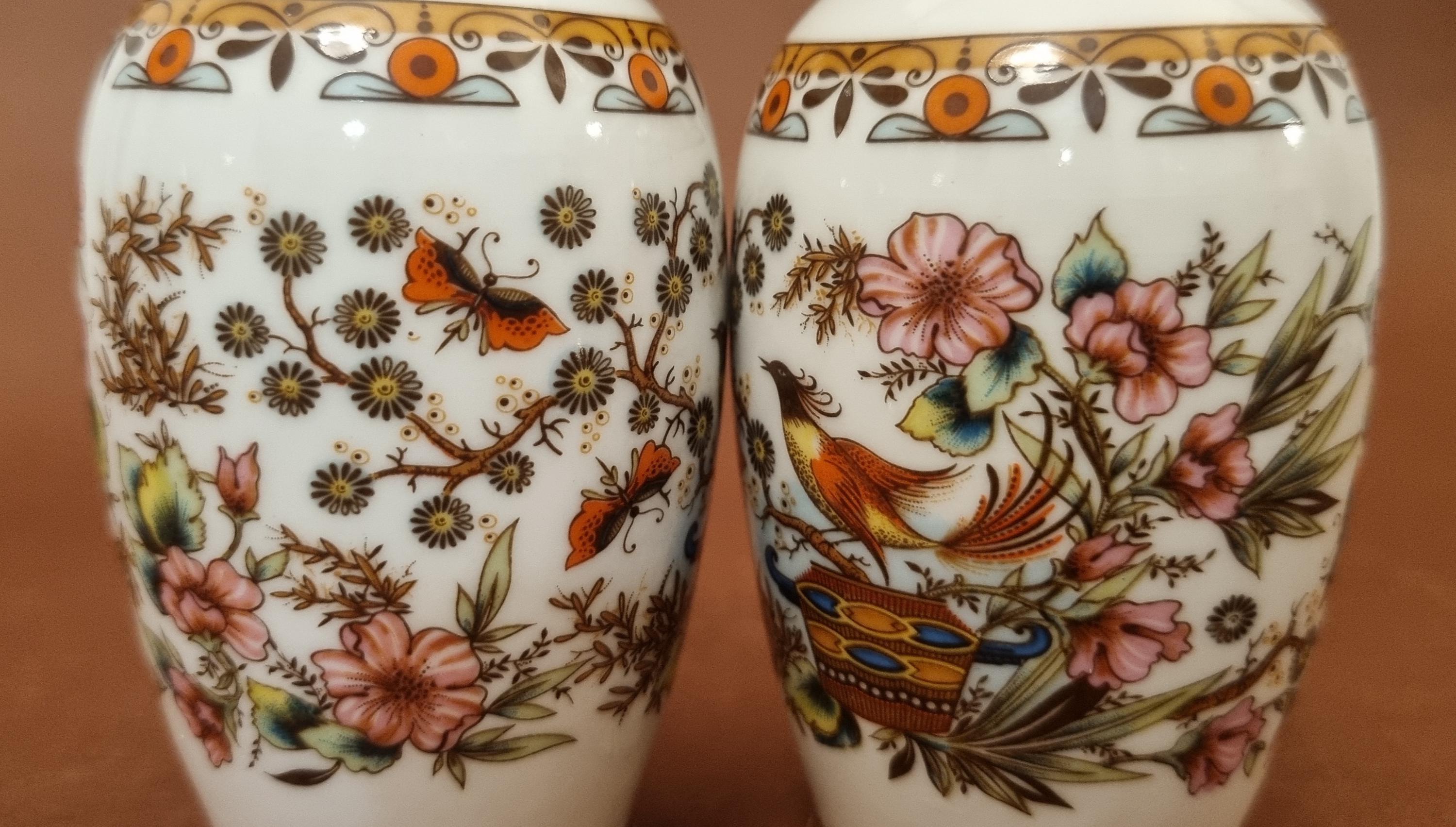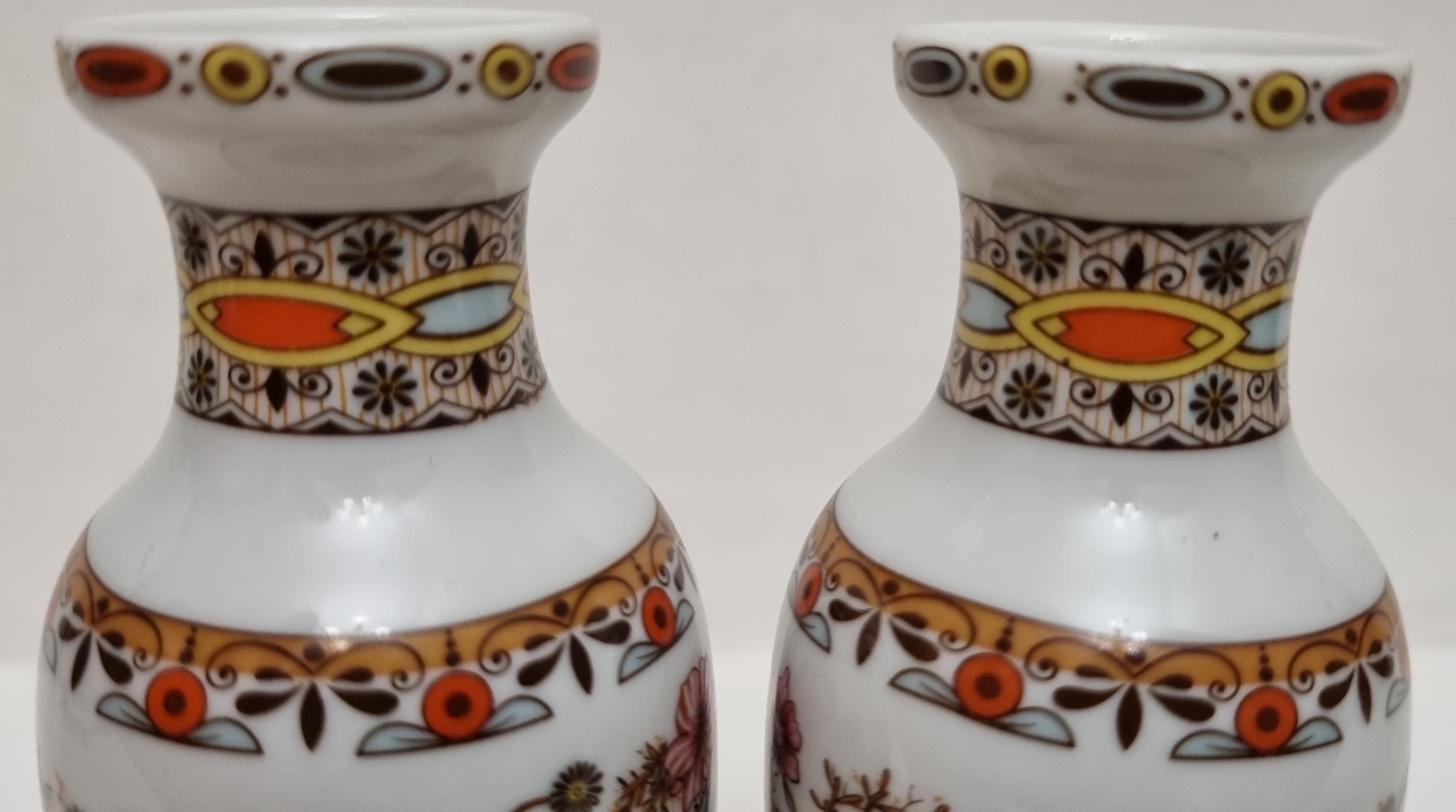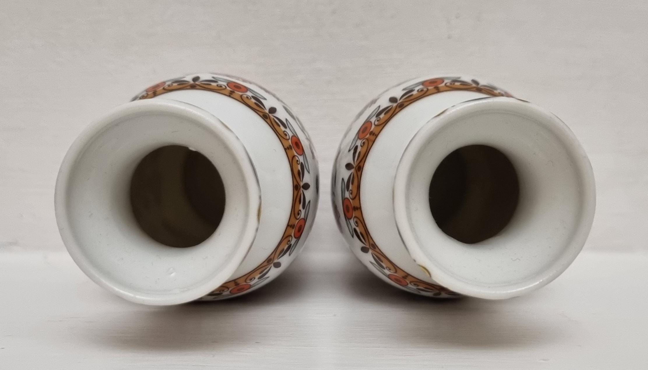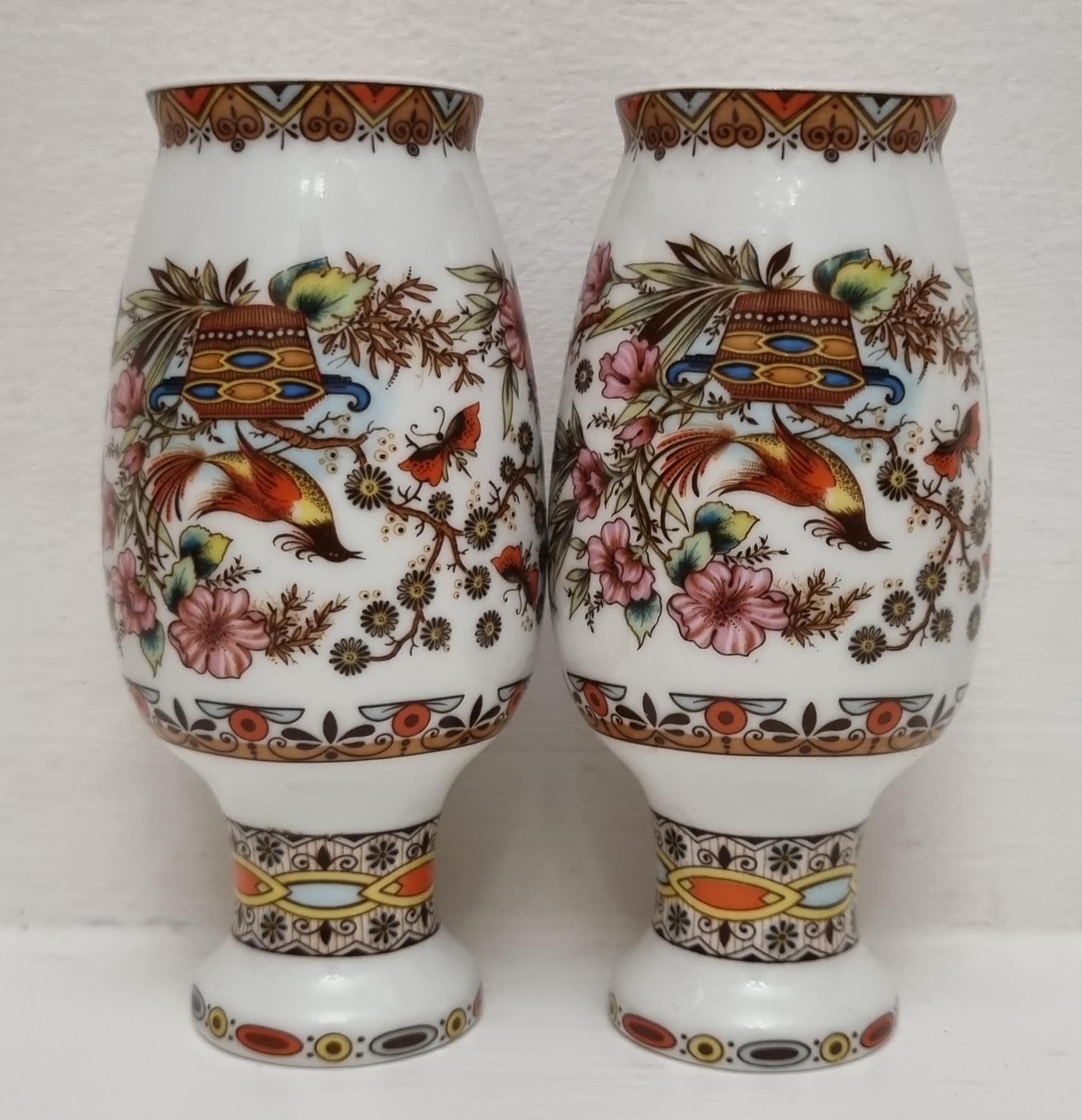 Beautiful Spanish Porcelain Vases that features a chinoiserie/Asian-inspired look with pink flowers, butterflies, and a bird, combined with a geometric pattern on the rim.