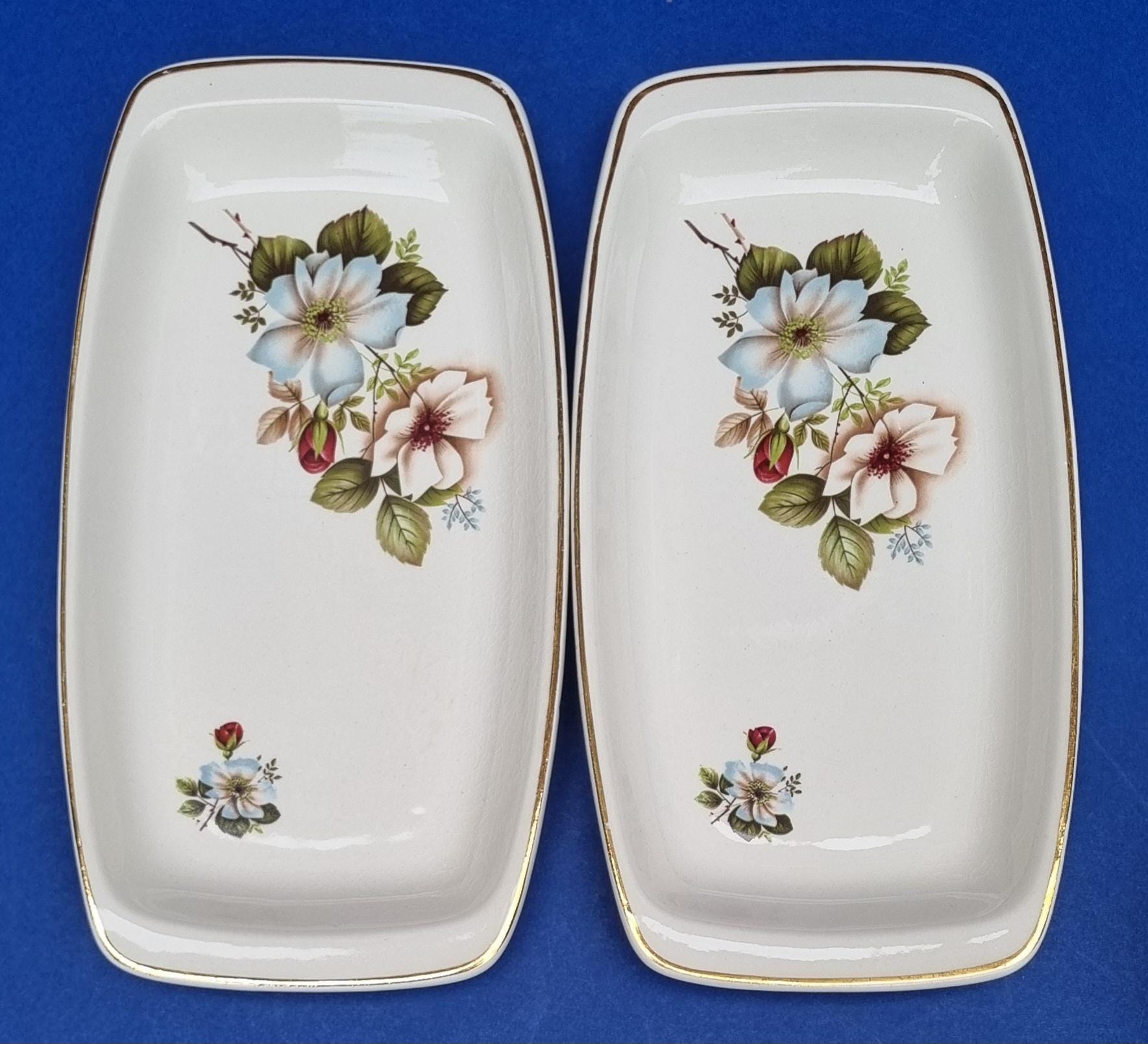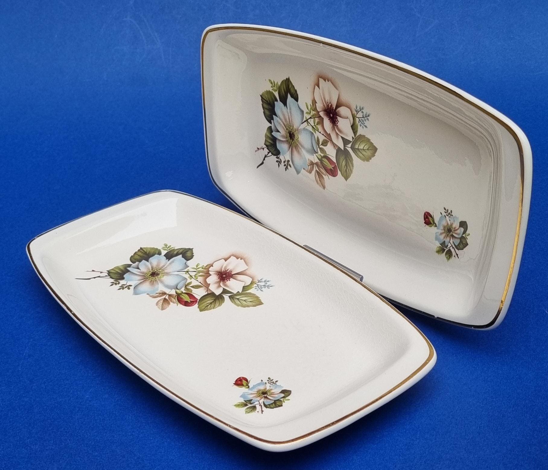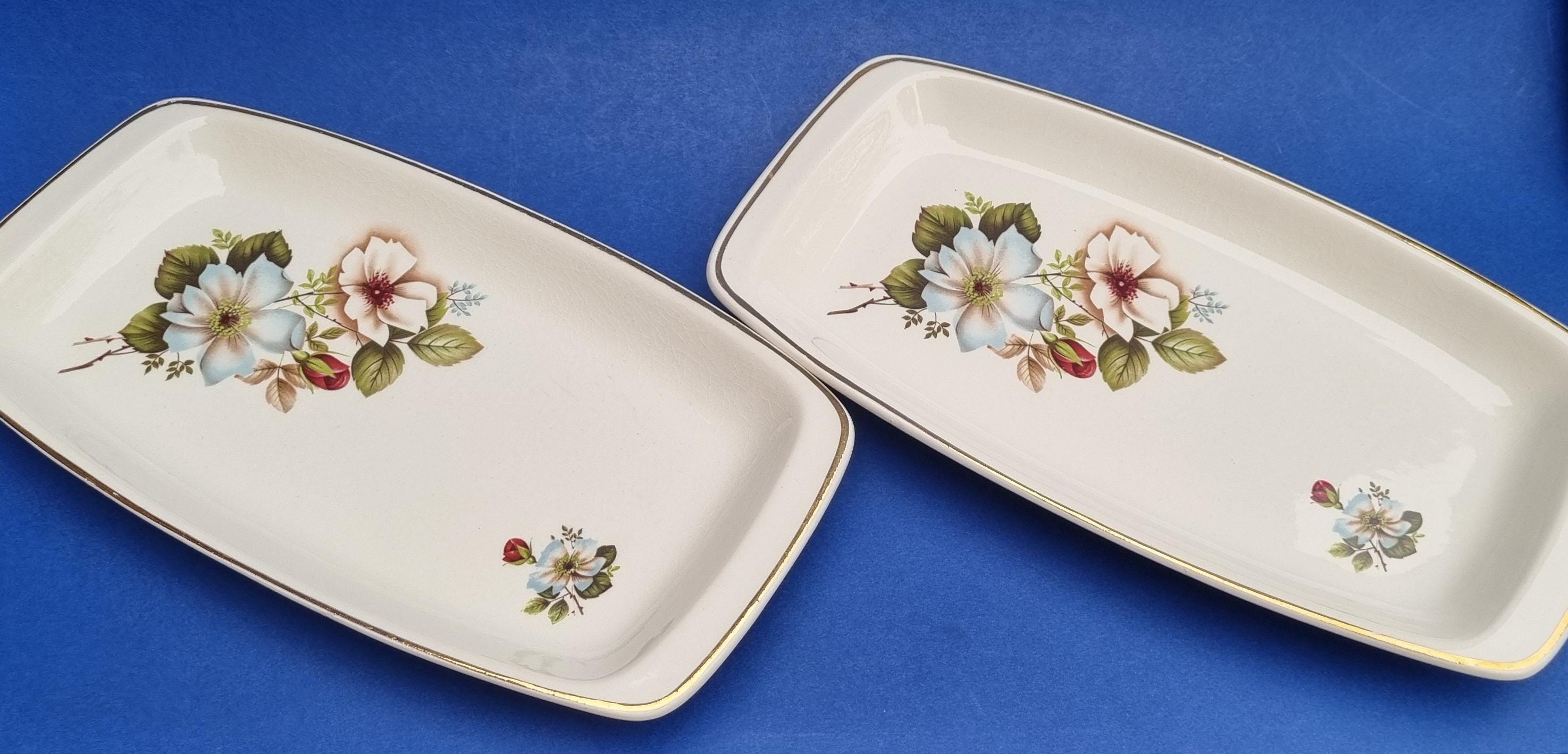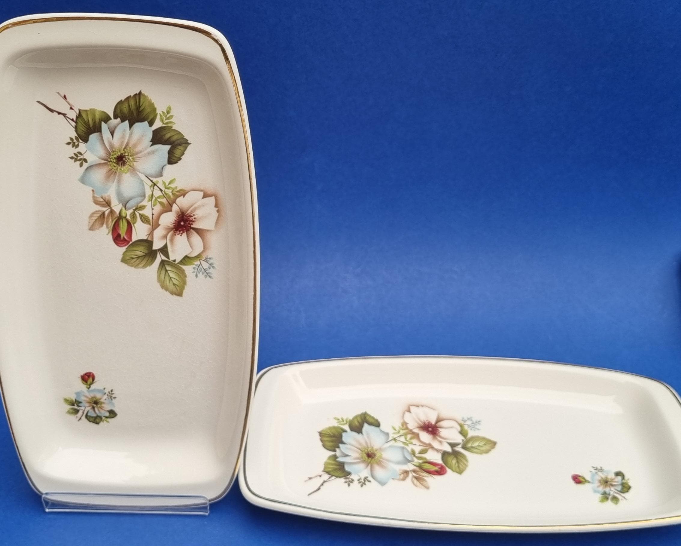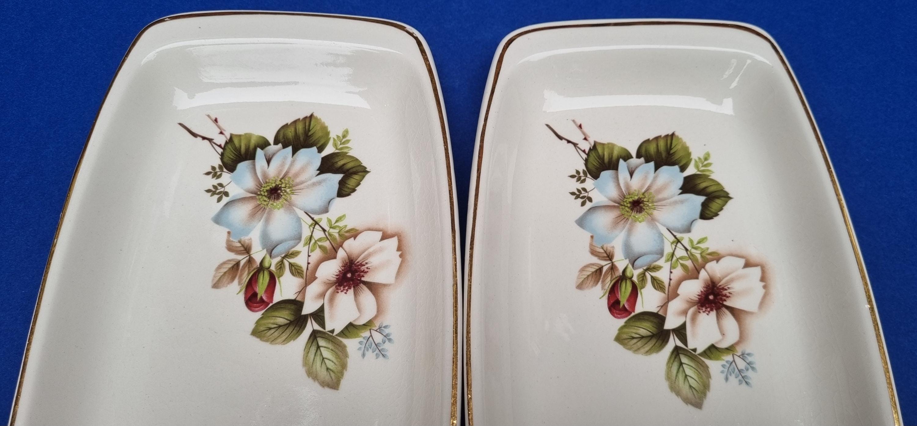 Lovely mid century decorative floral rectangular plates with gold gilt around the edges. Can be used for a variety of serving purposes.