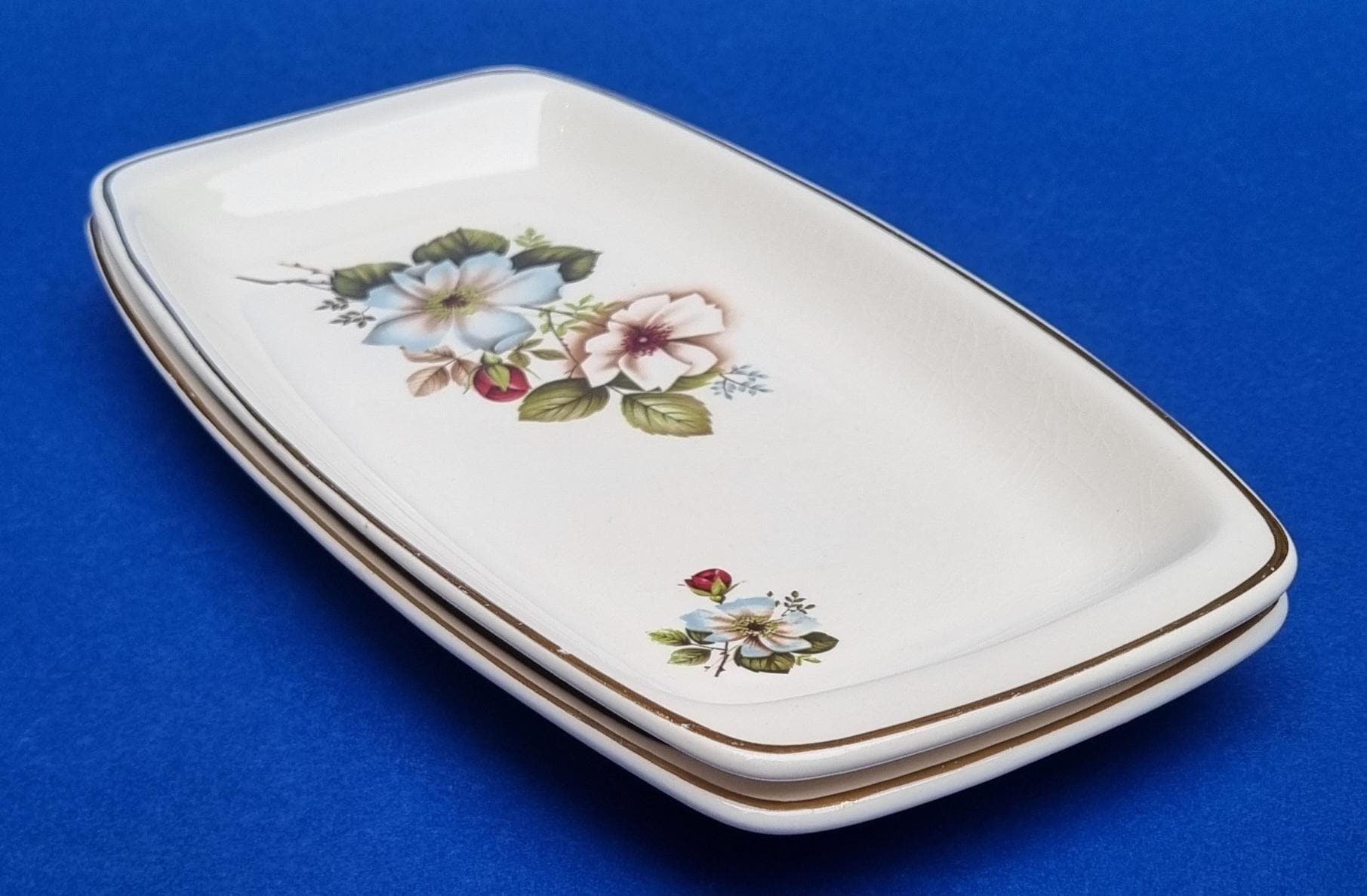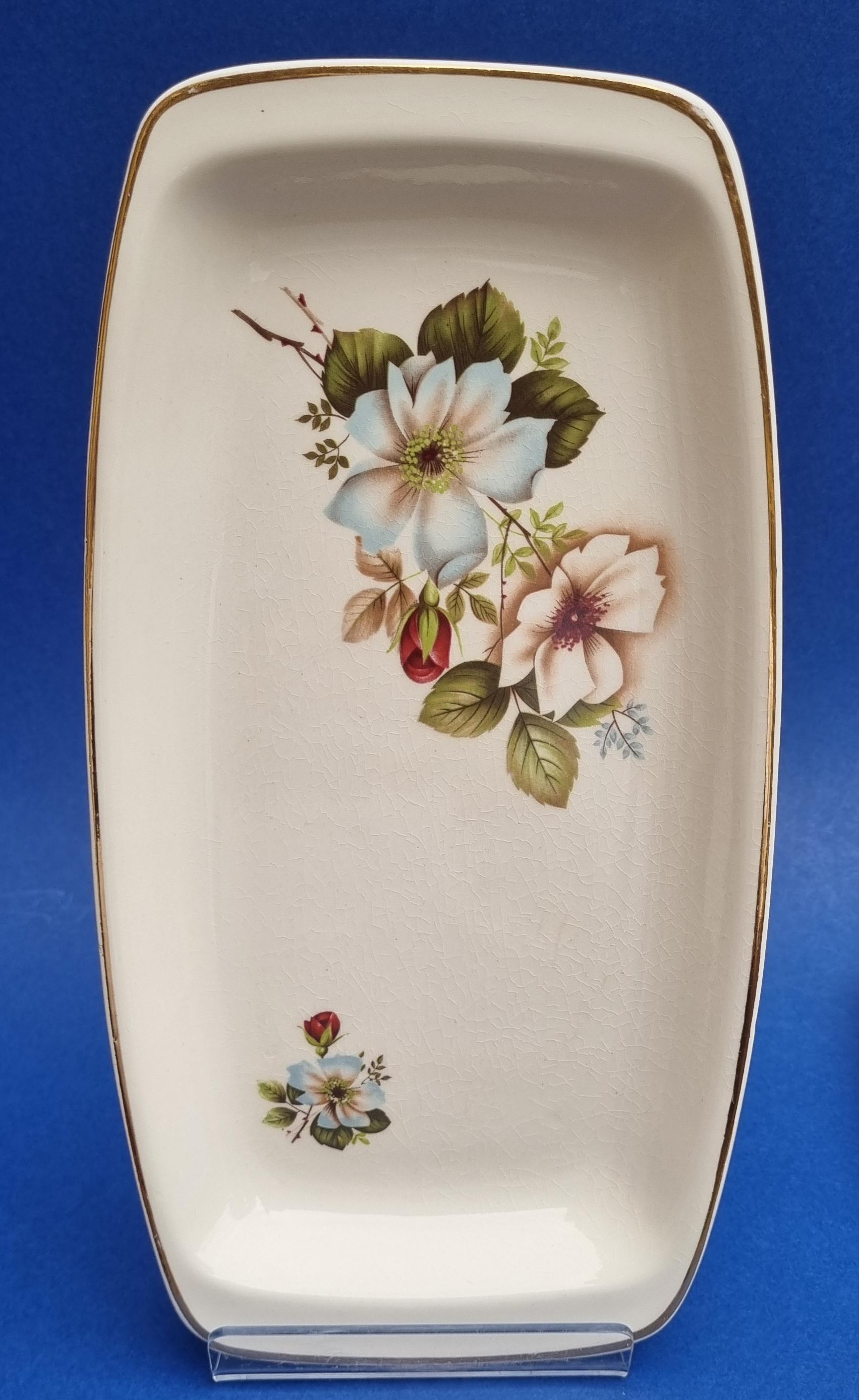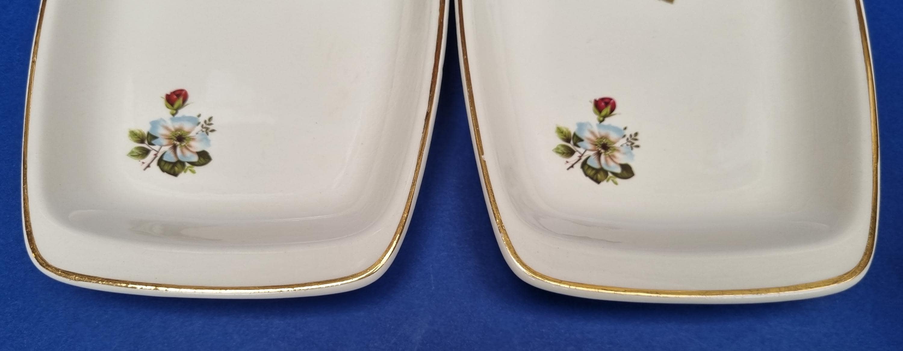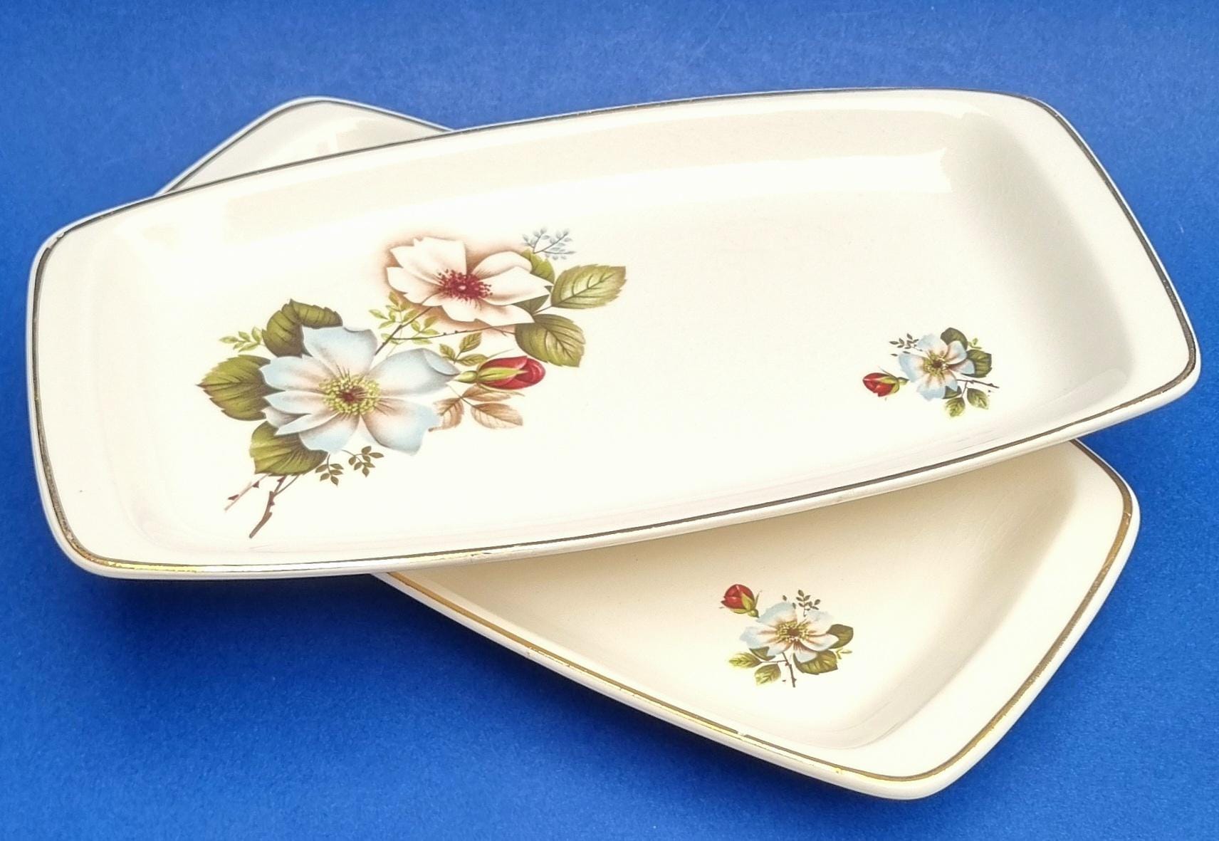 Lovely mid century decorative floral rectangular plates with gold gilt around the edges. Can be used for a variety of serving purposes.