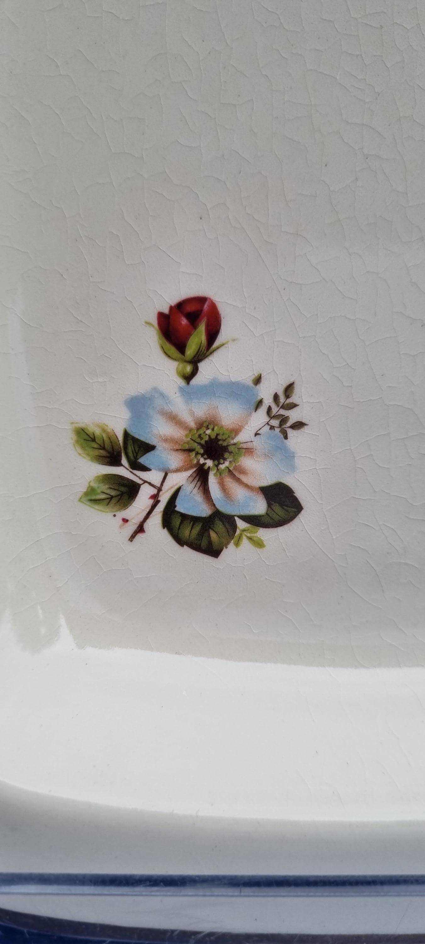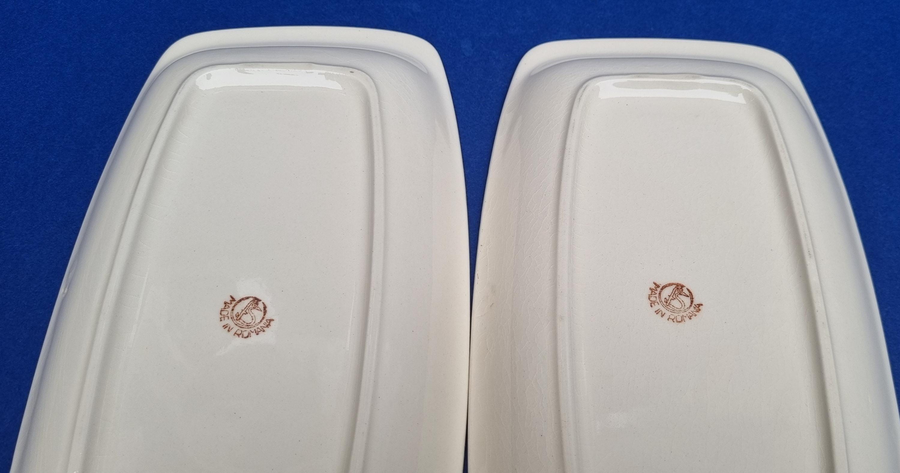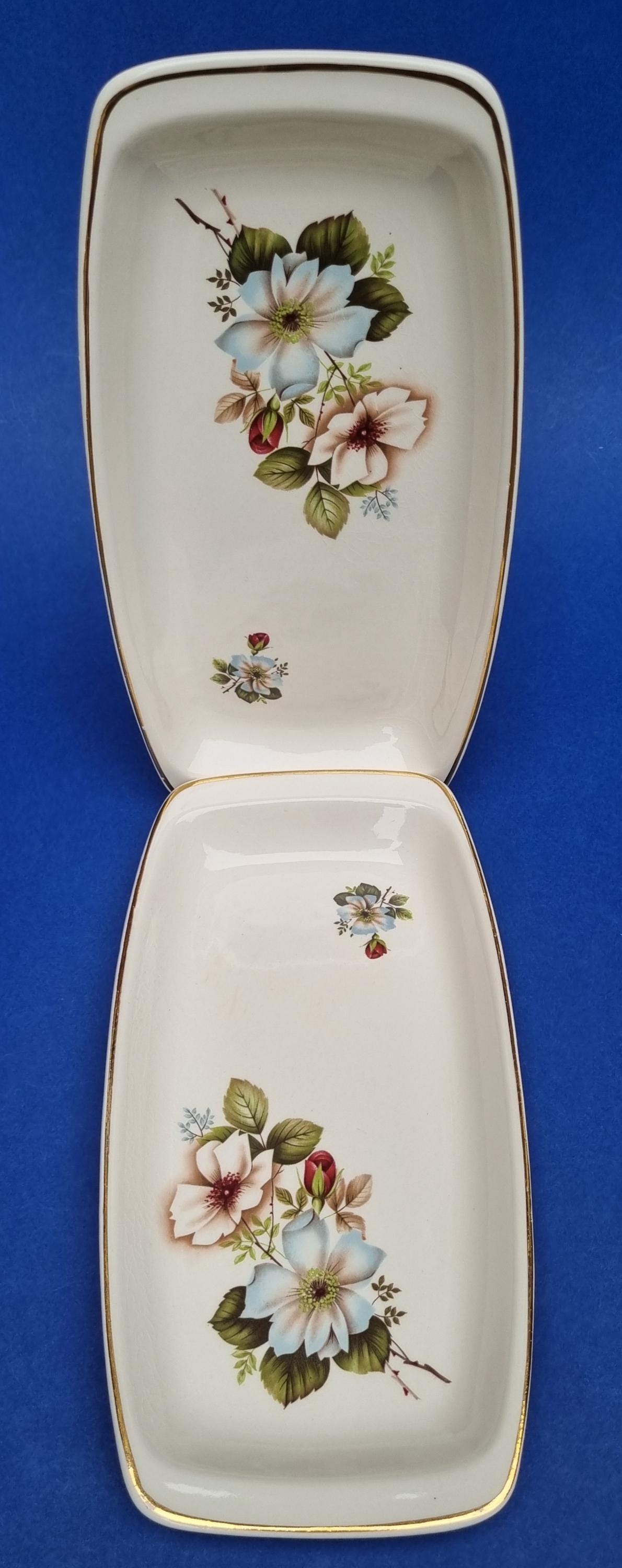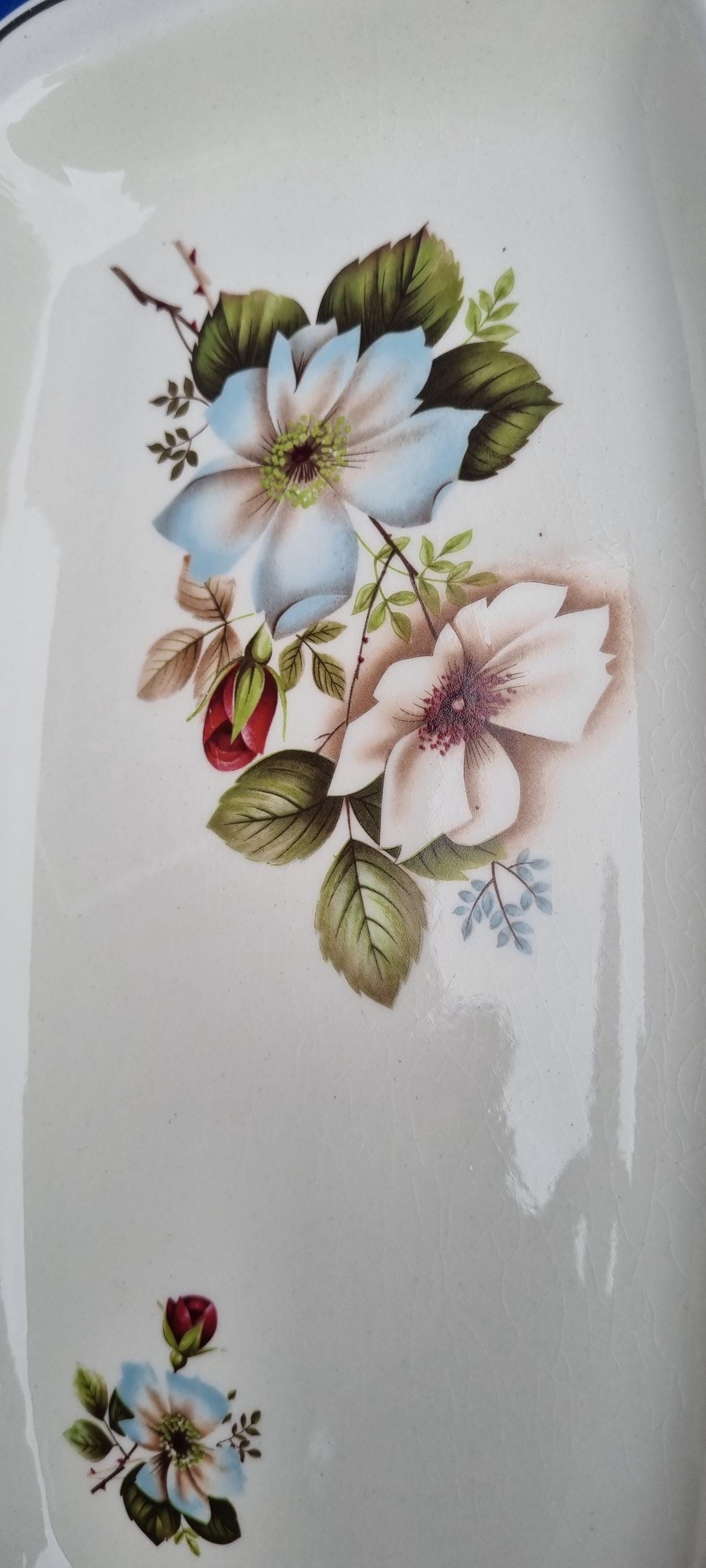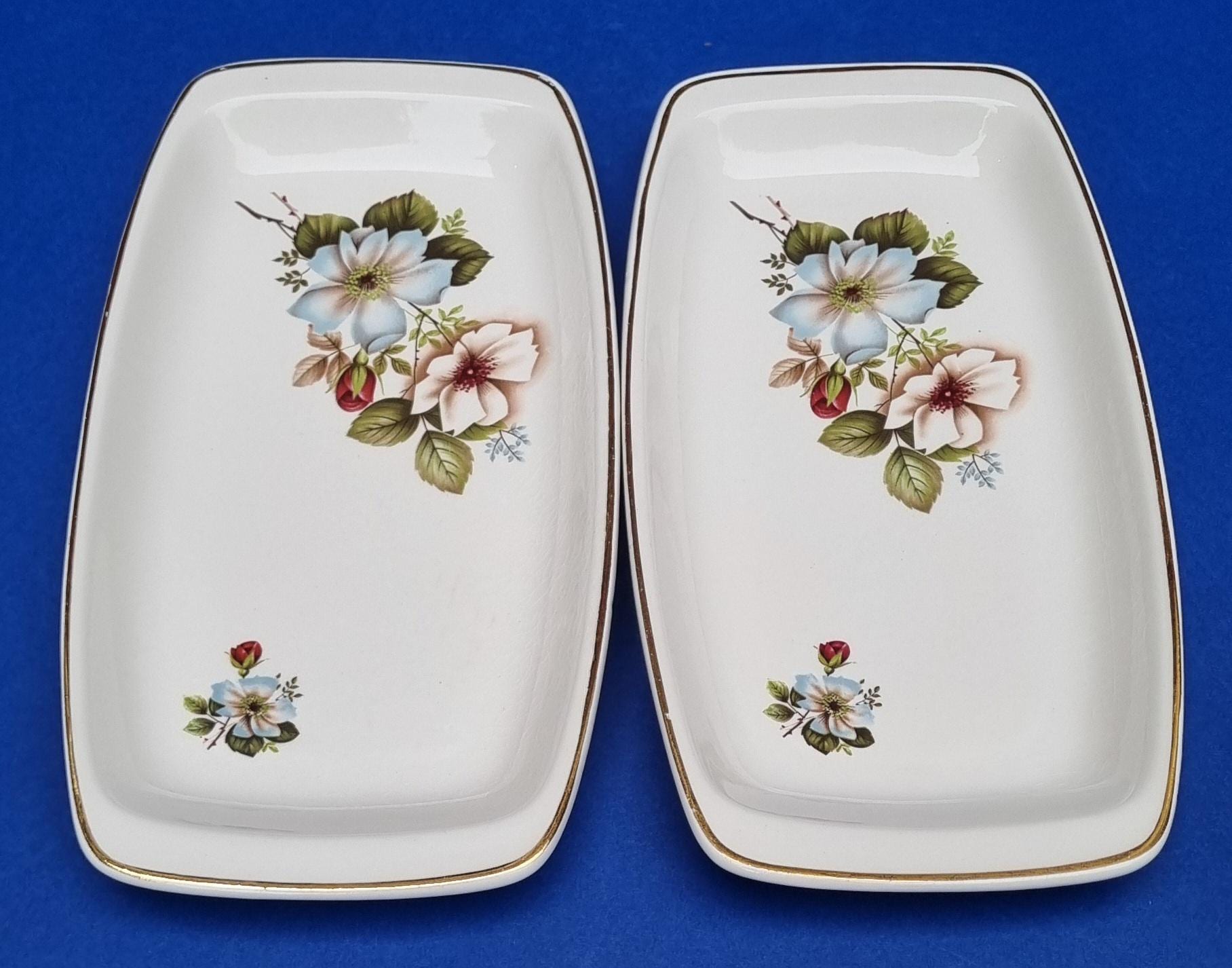 Lovely mid century decorative floral rectangular plates with gold gilt around the edges. Can be used for a variety of serving purposes.