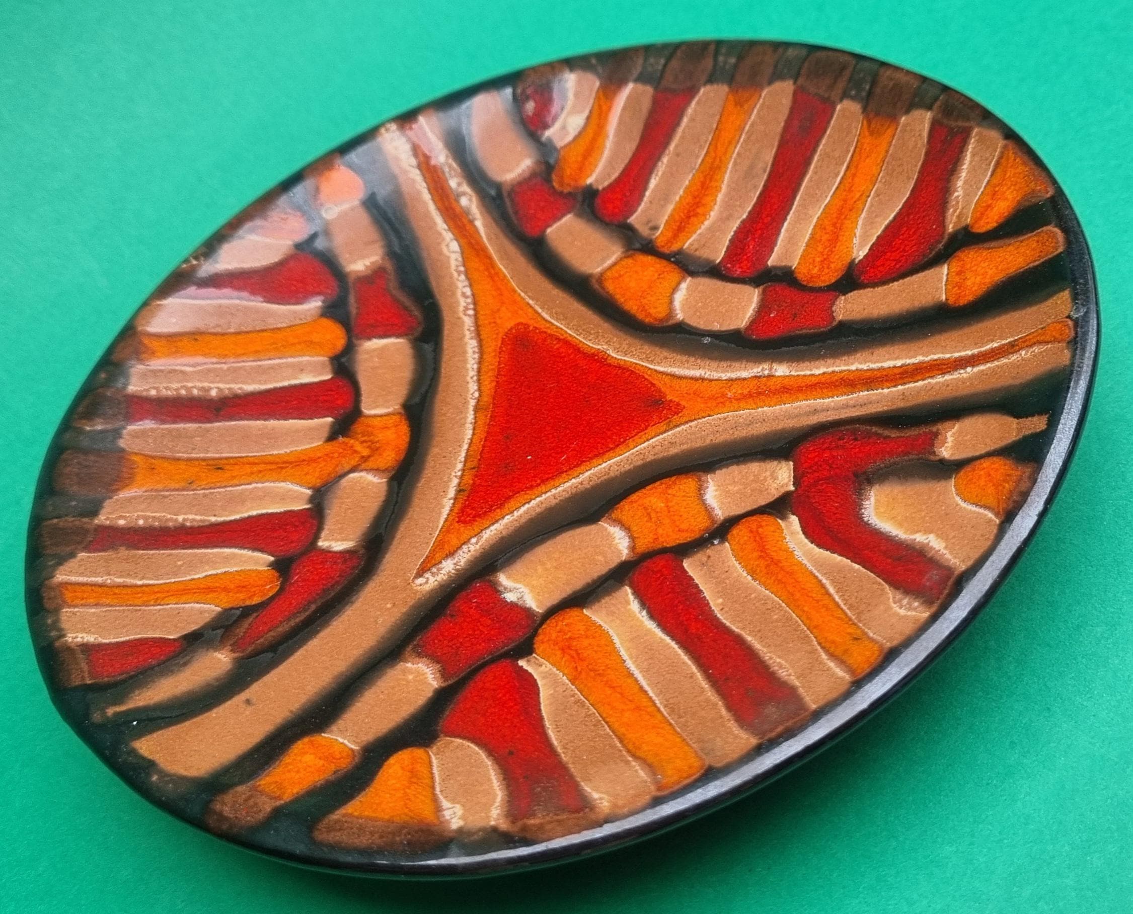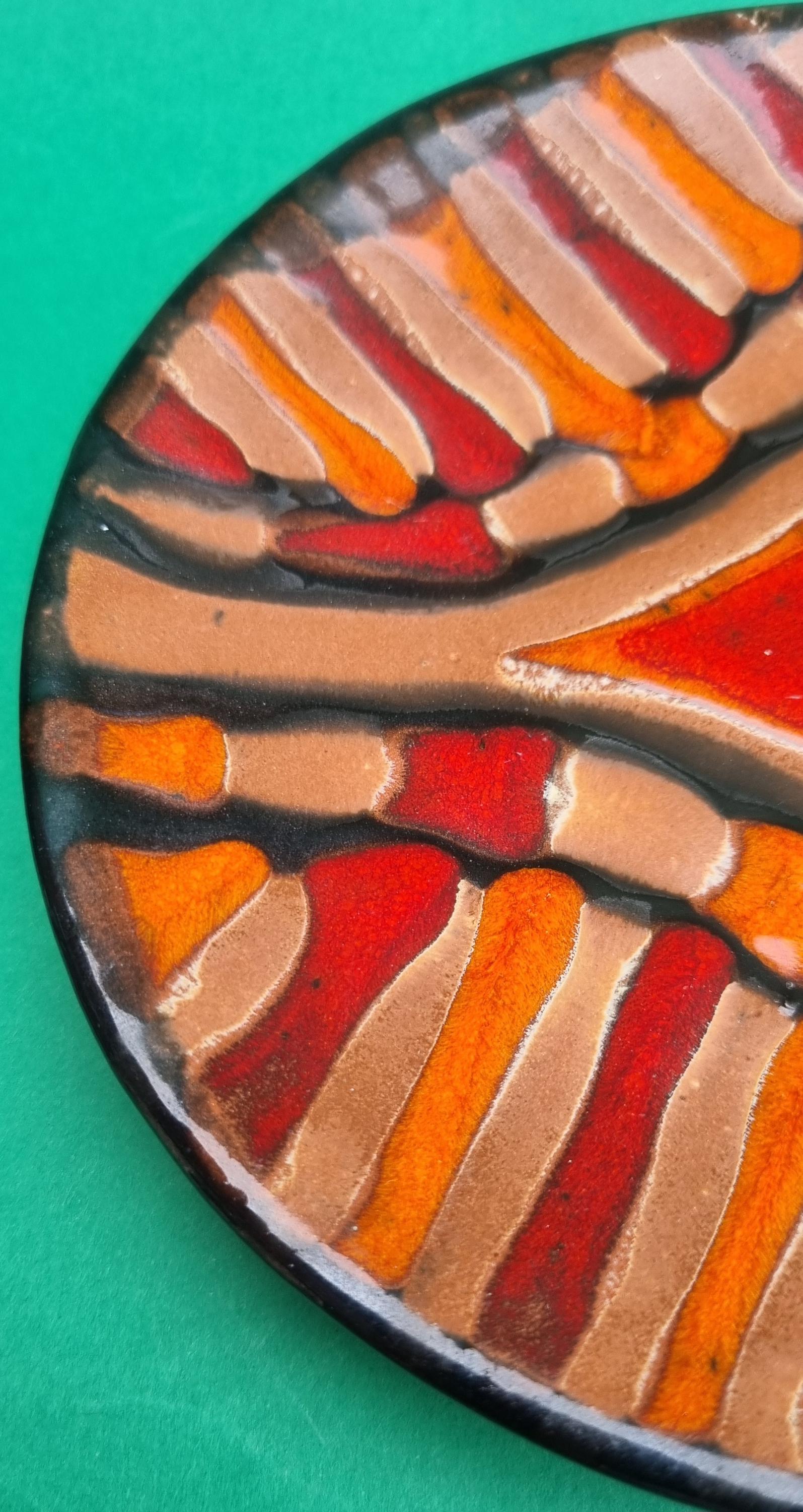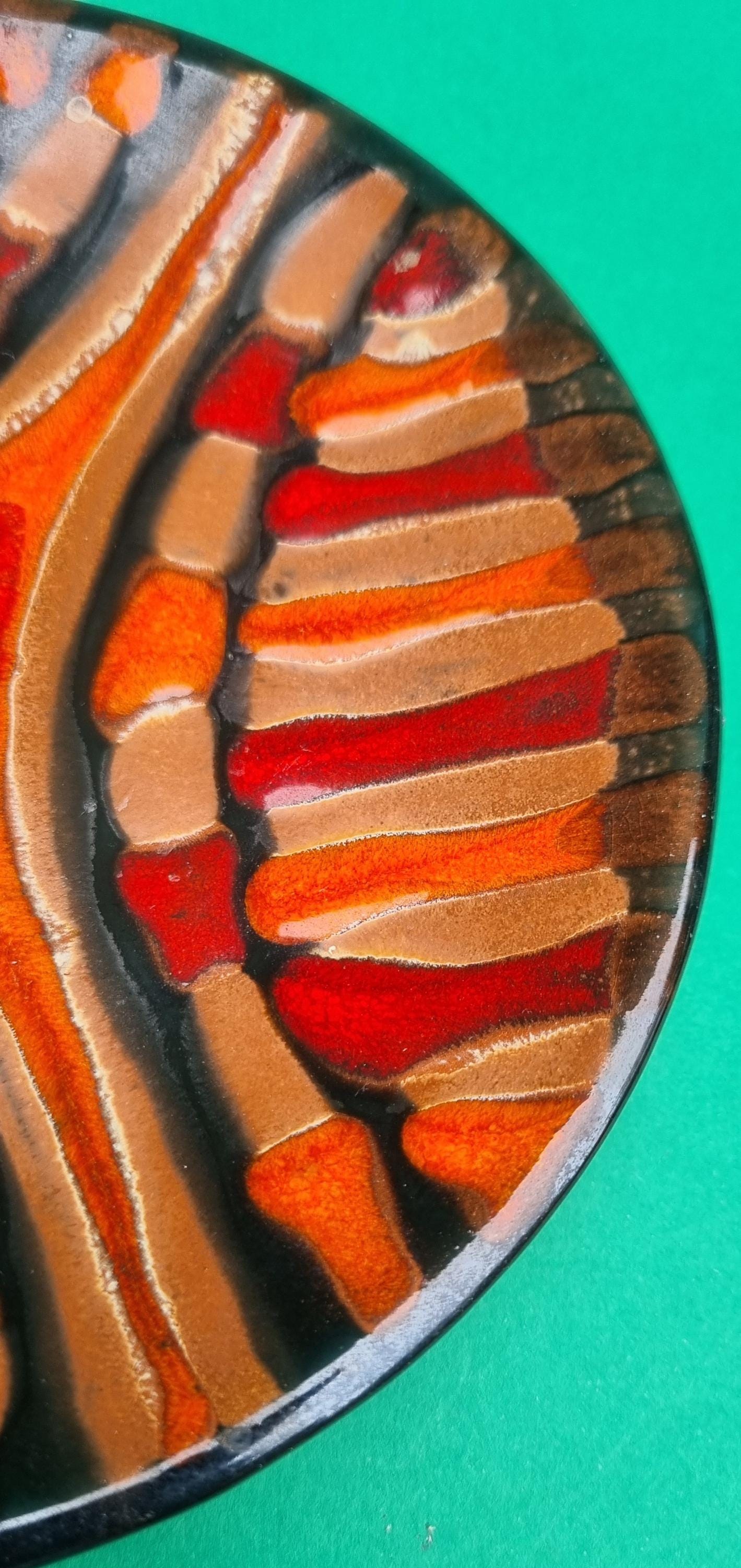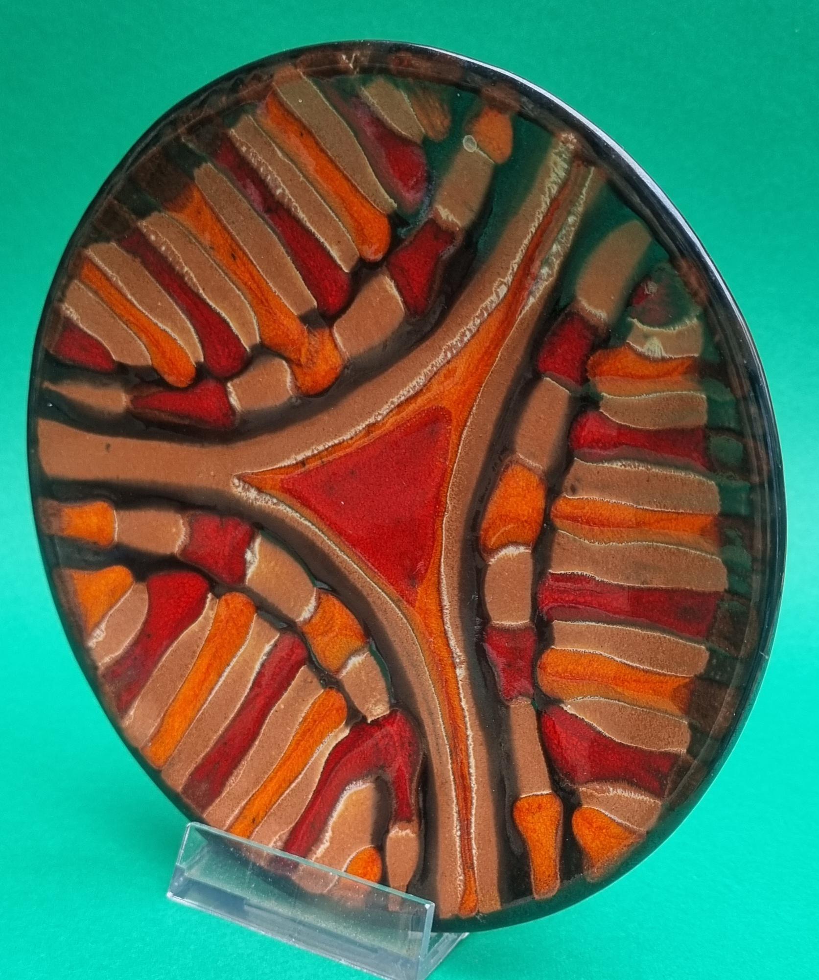 A decorative terracotta ceramic plate with wonderful hues of orange, red & brown in an abstract design. Can be used as a wall hanging, displayed on a table or for nibbles.