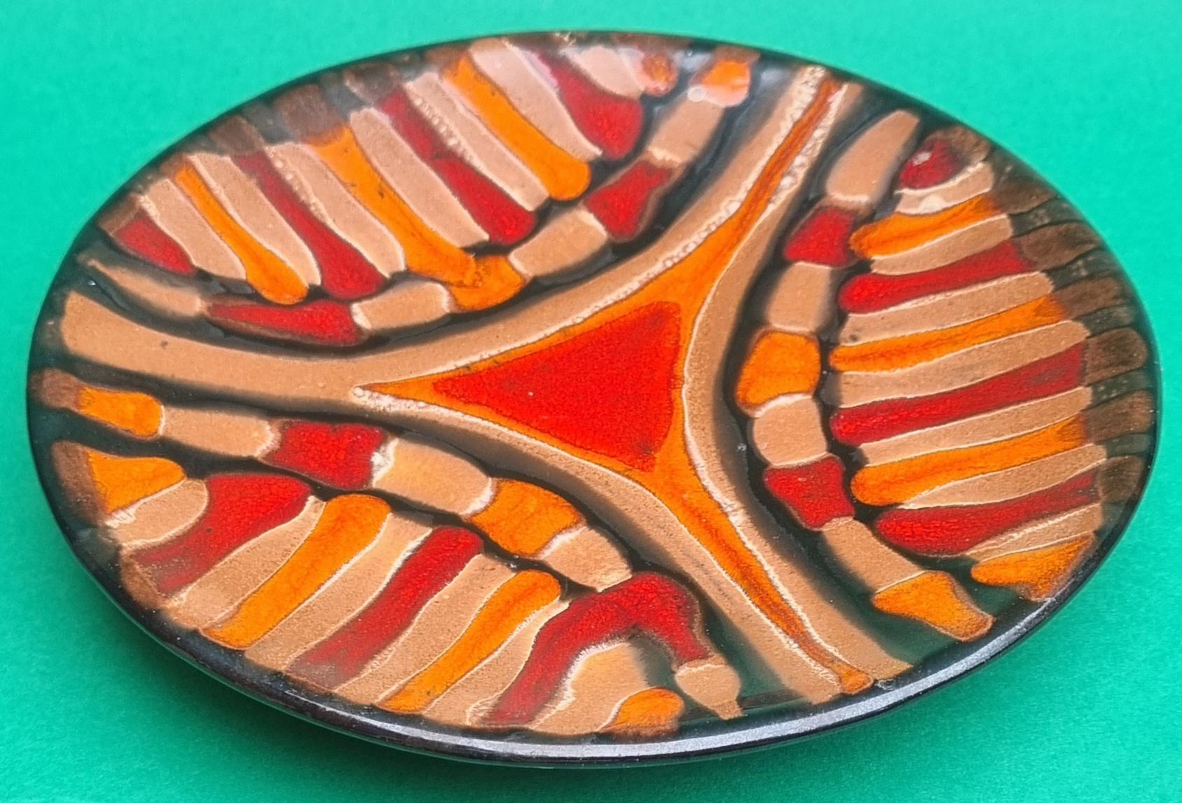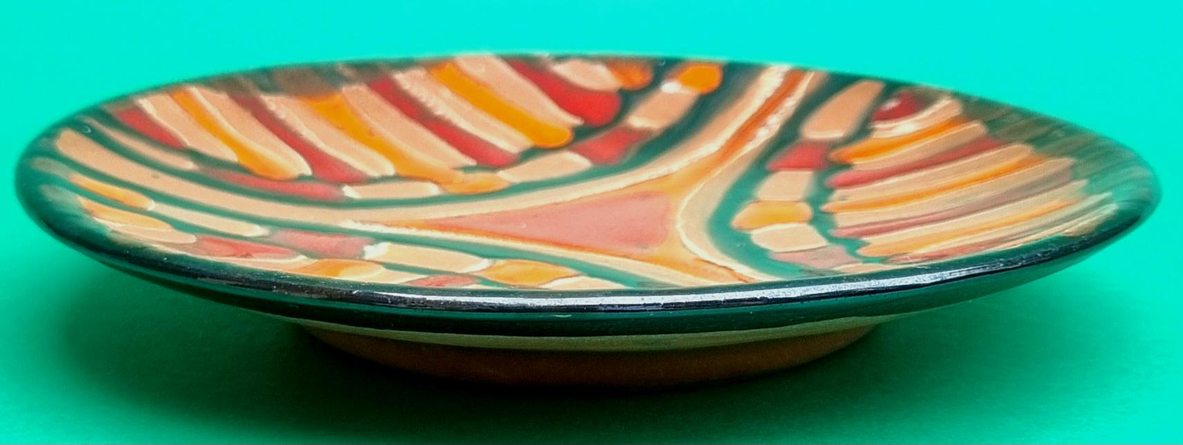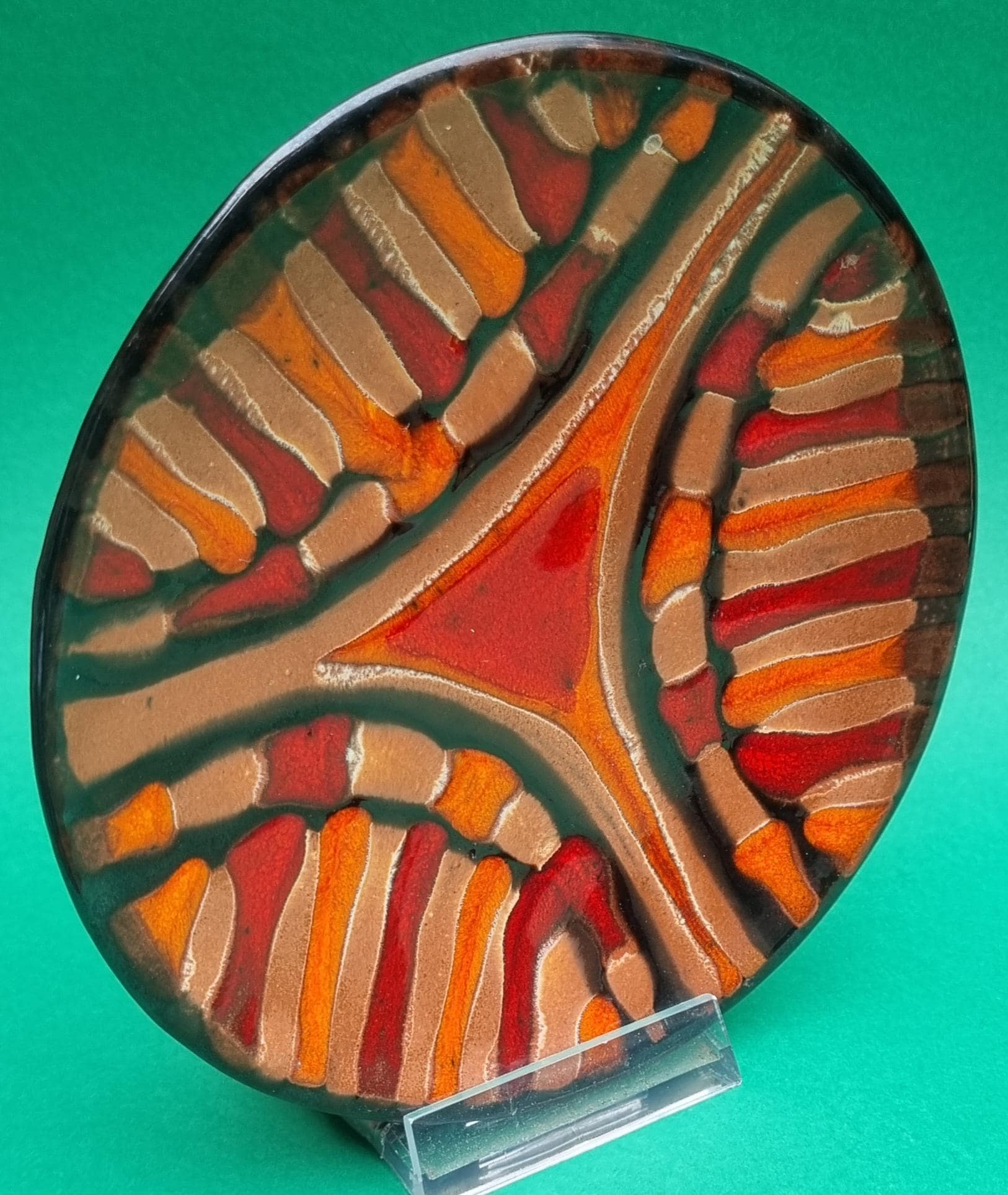 A decorative terracotta ceramic plate with wonderful hues of orange, red & brown in an abstract design. Can be used as a wall hanging, displayed on a table or for nibbles.