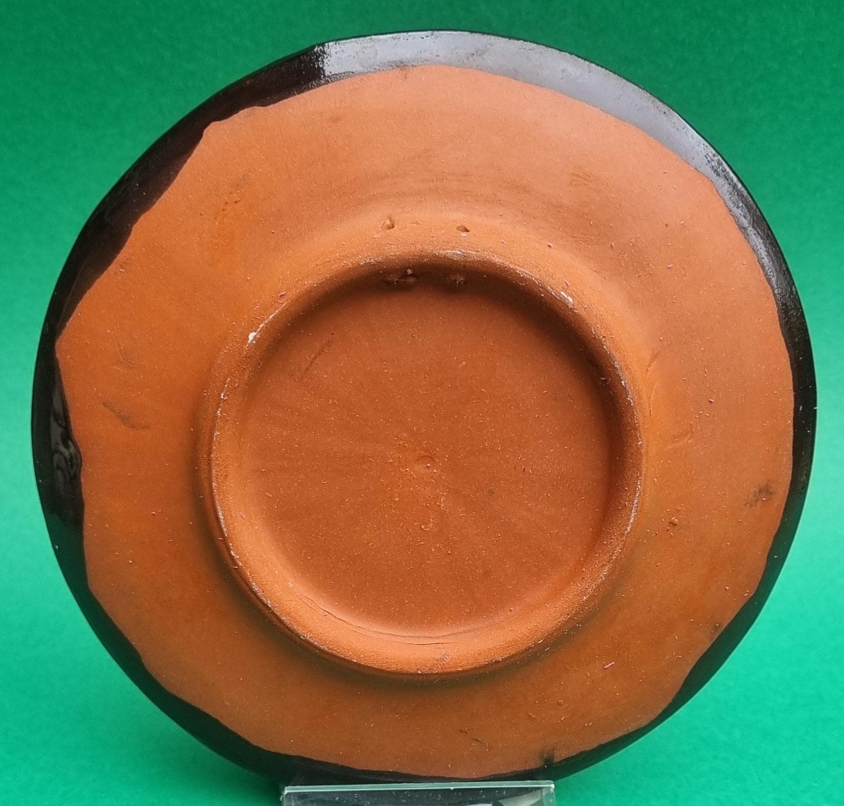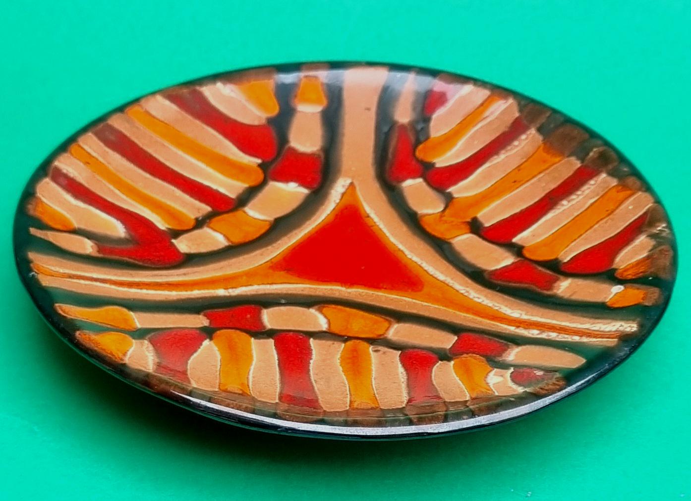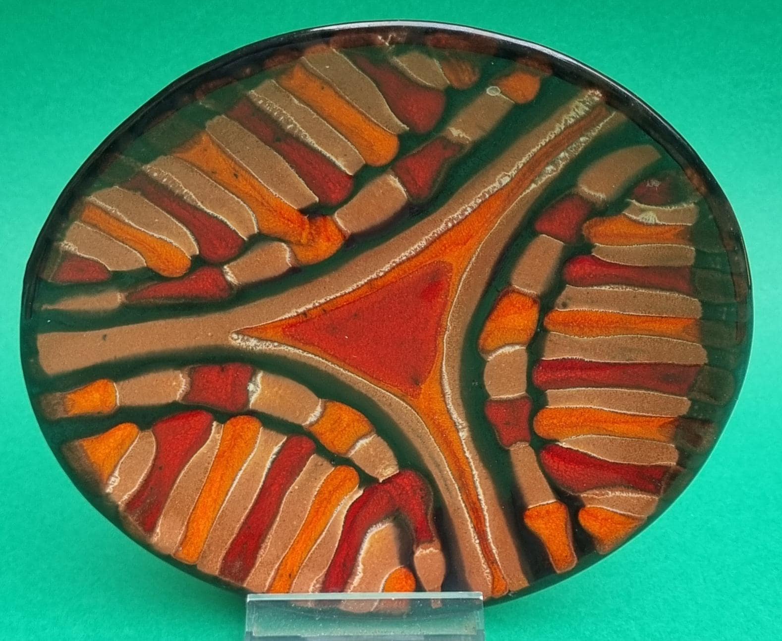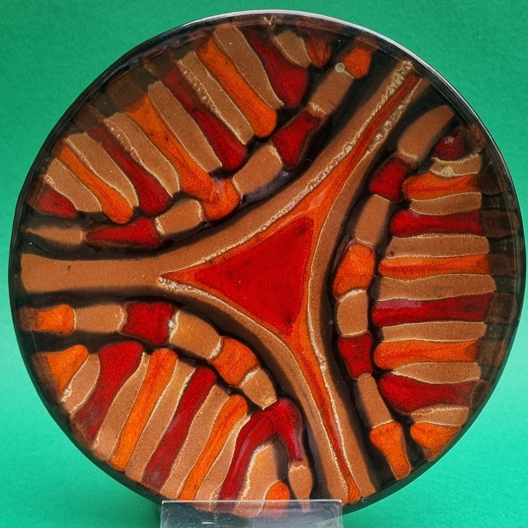 A decorative terracotta ceramic plate with wonderful hues of orange, red & brown in an abstract design. Can be used as a wall hanging, displayed on a table or for nibbles.