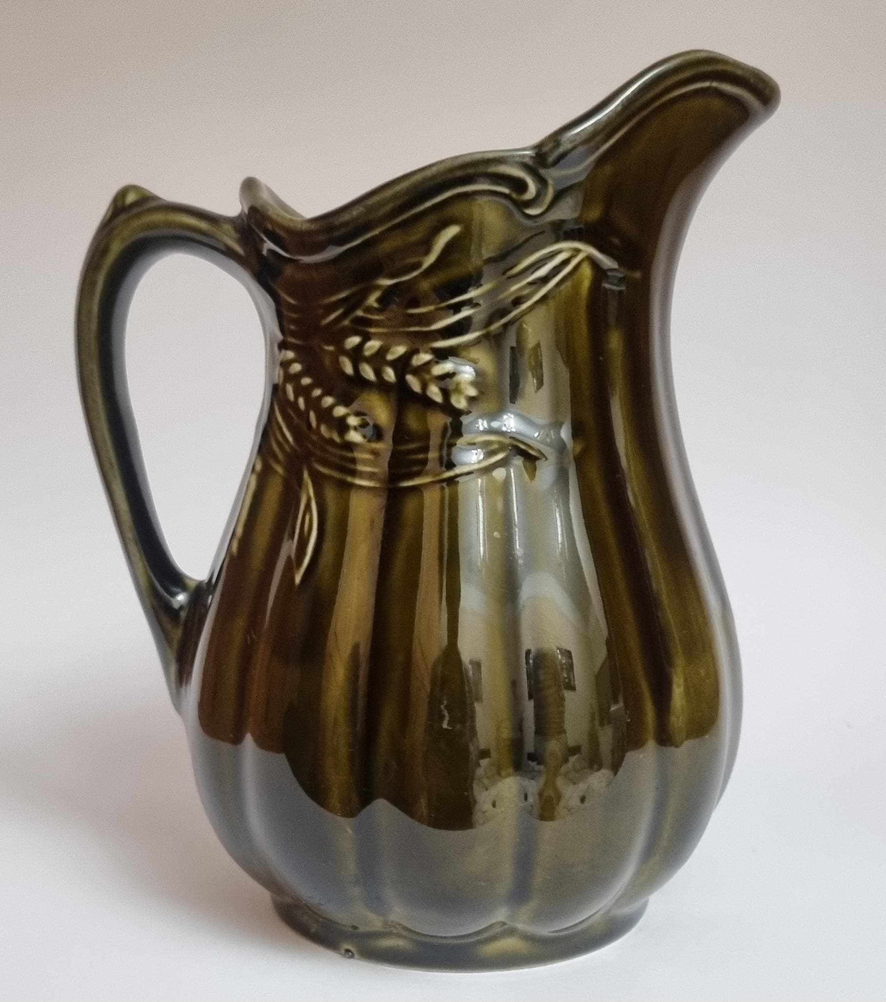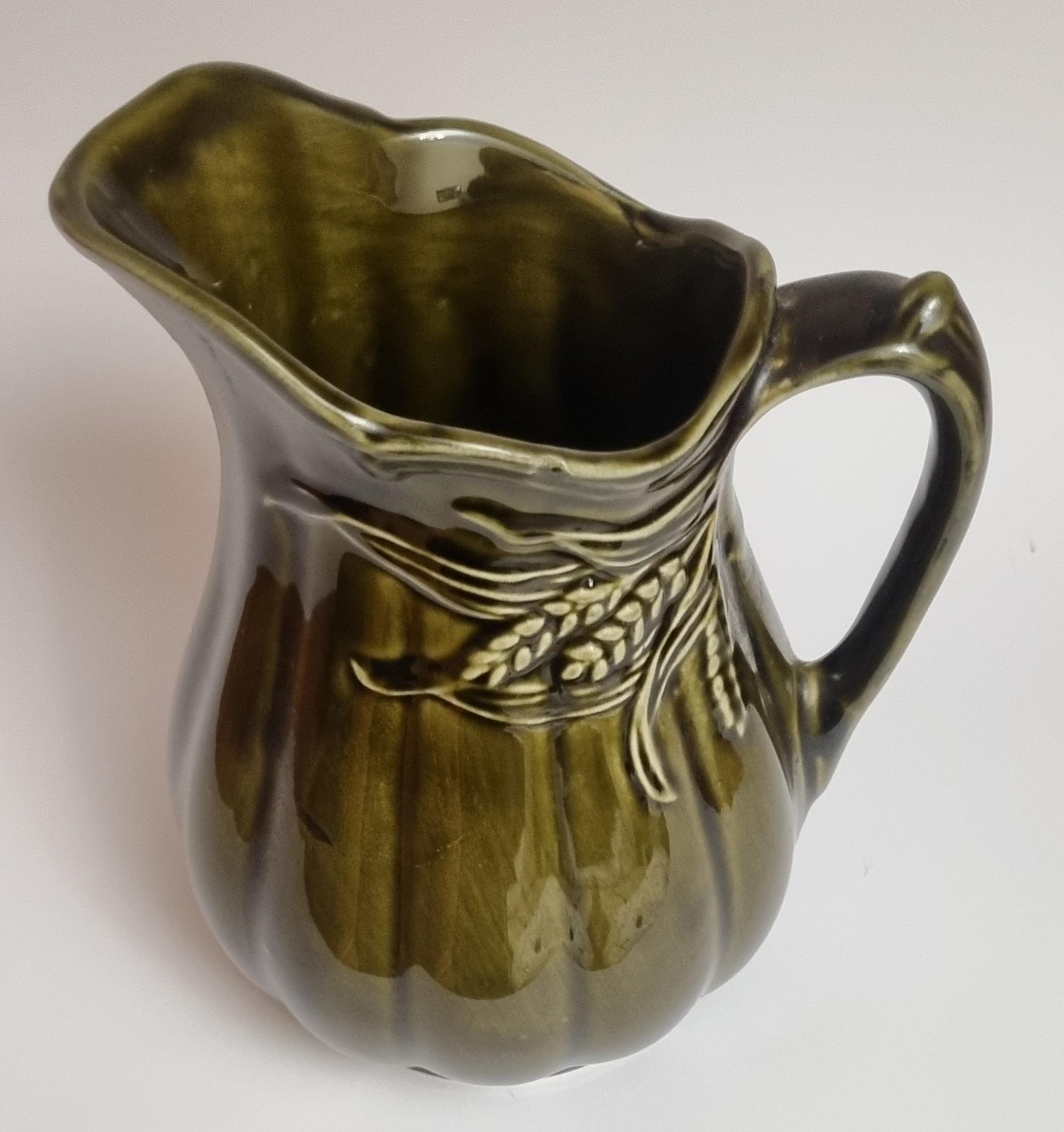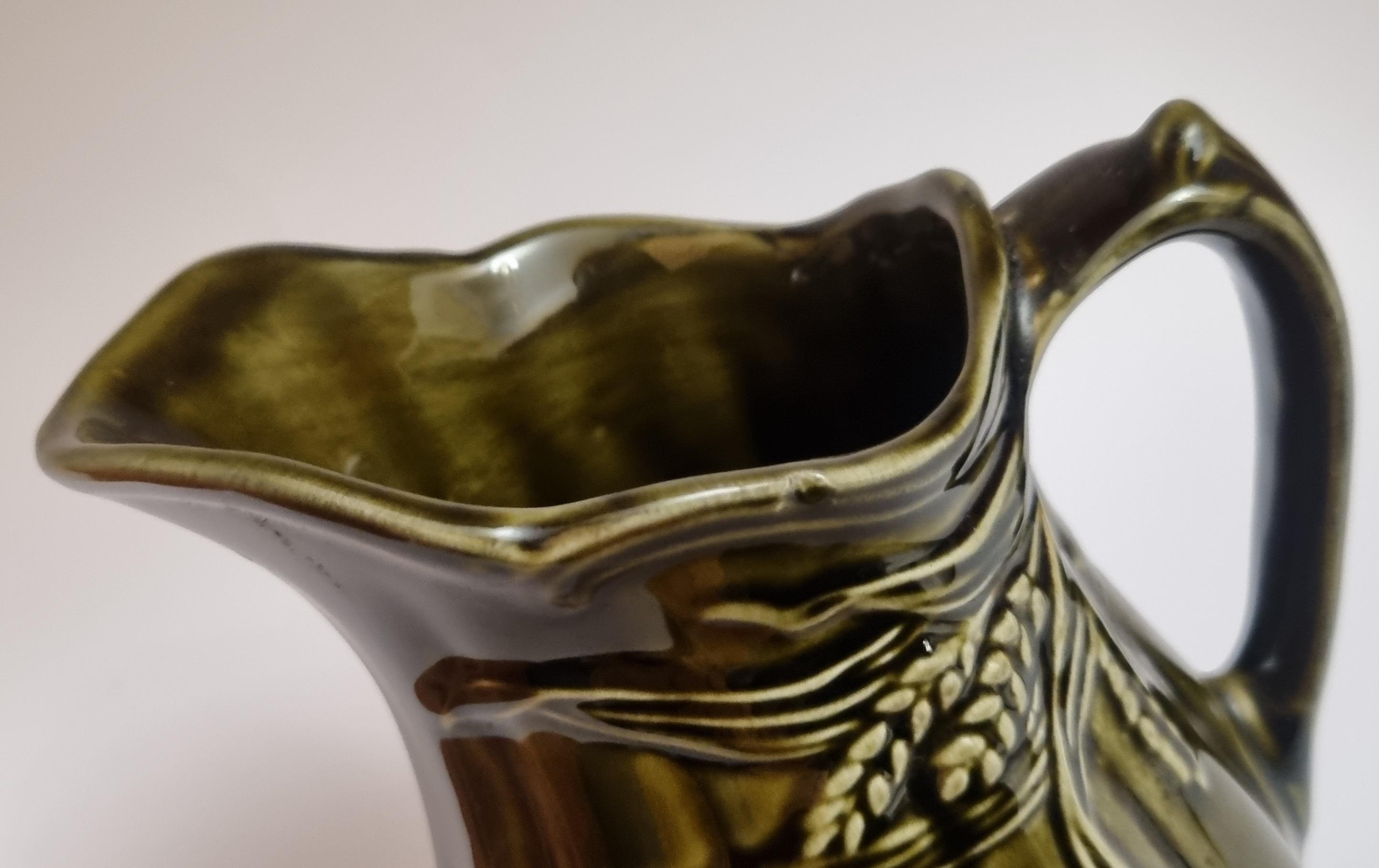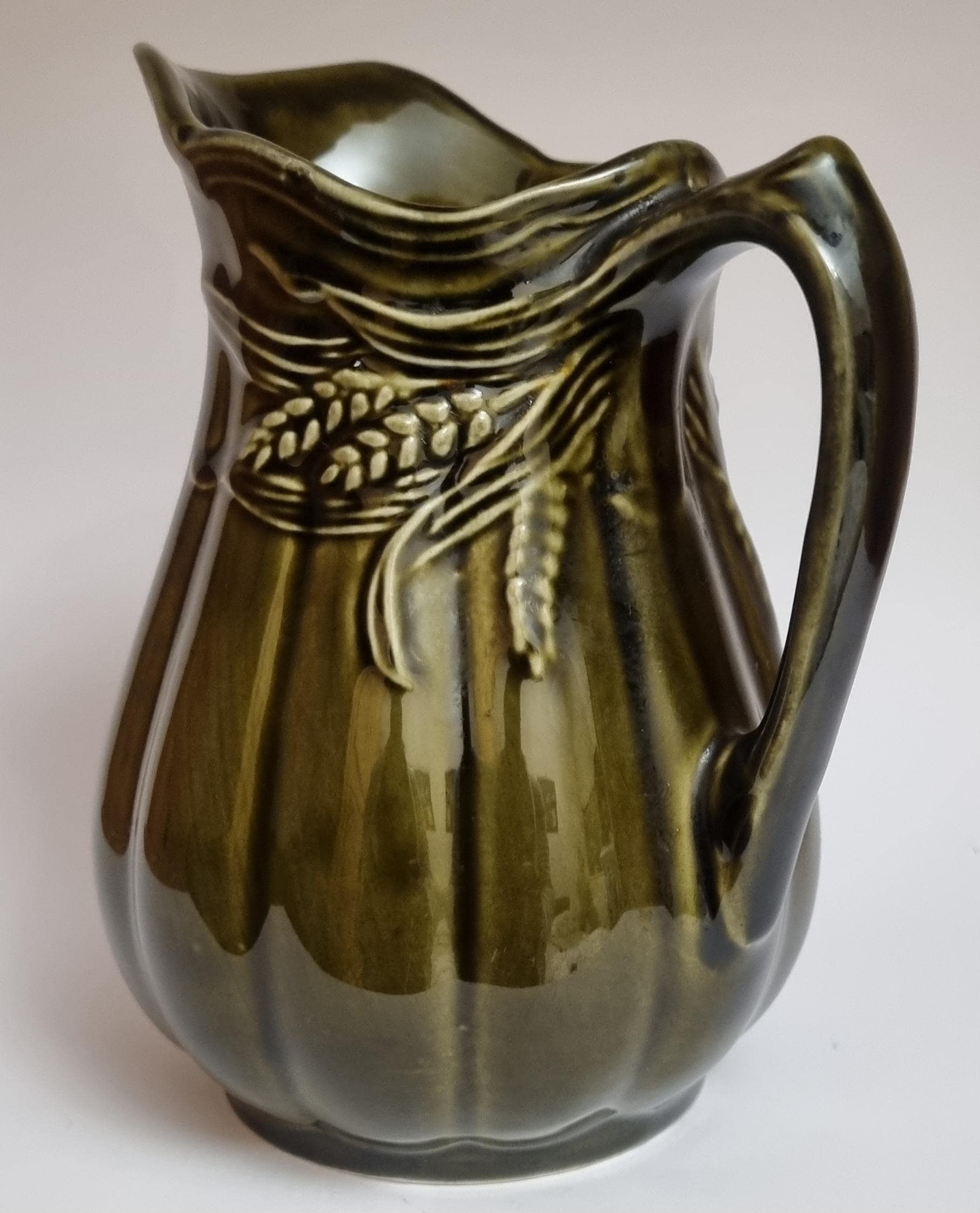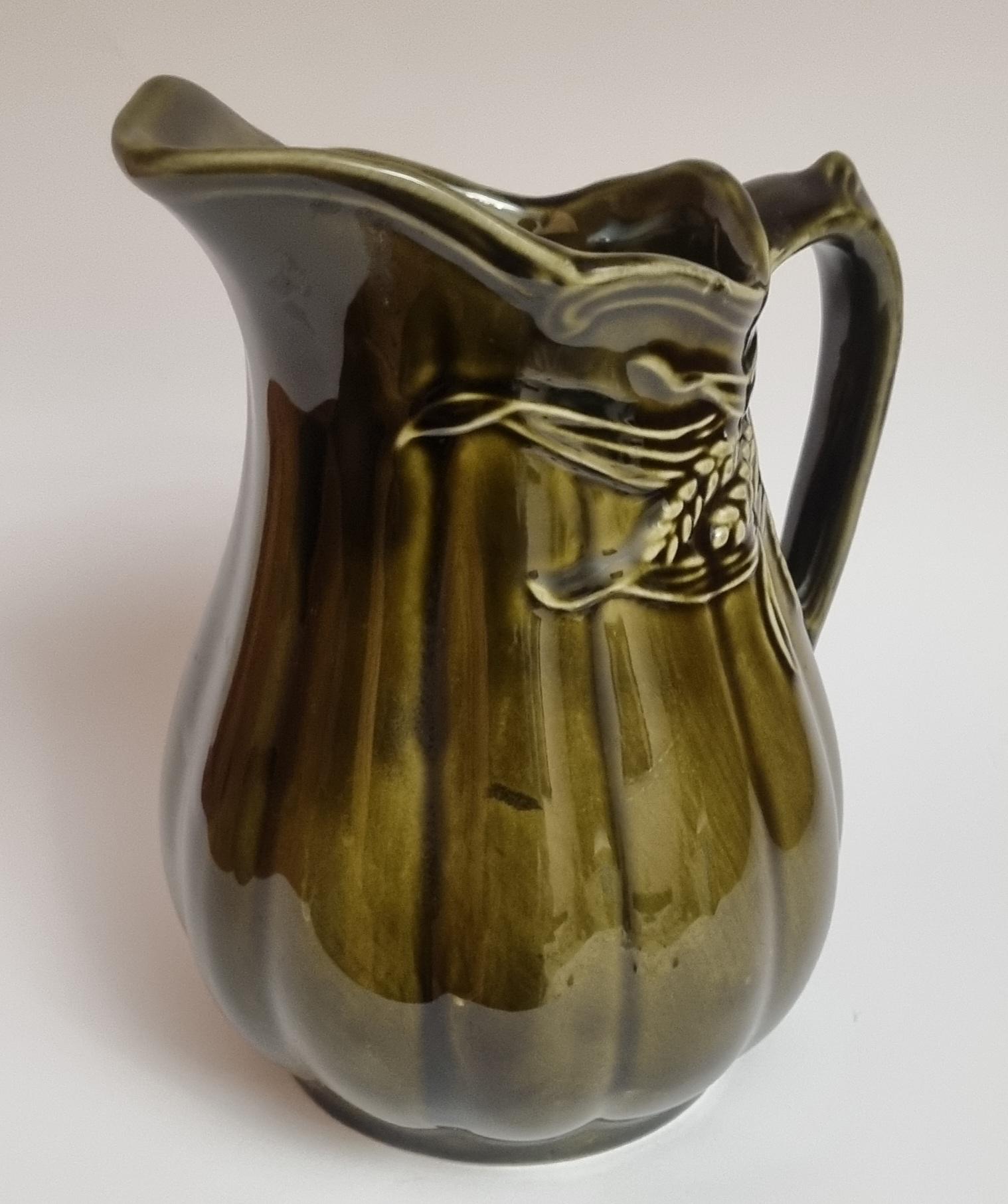 A well glazed Edwardian period jug/pitcher, in a wonderful olive green hue with an embossed wheat motif design. It also features a defined ribbing.