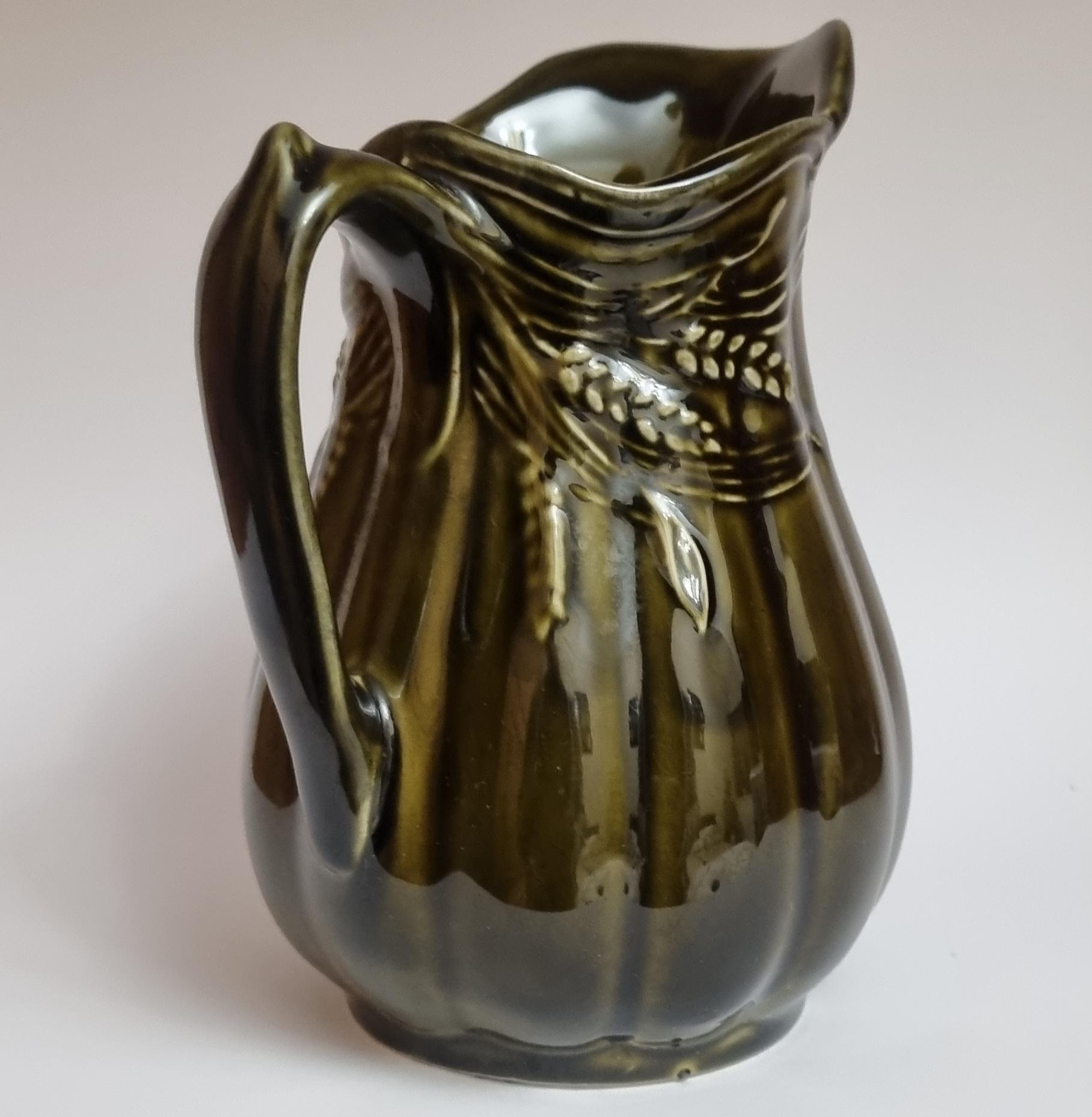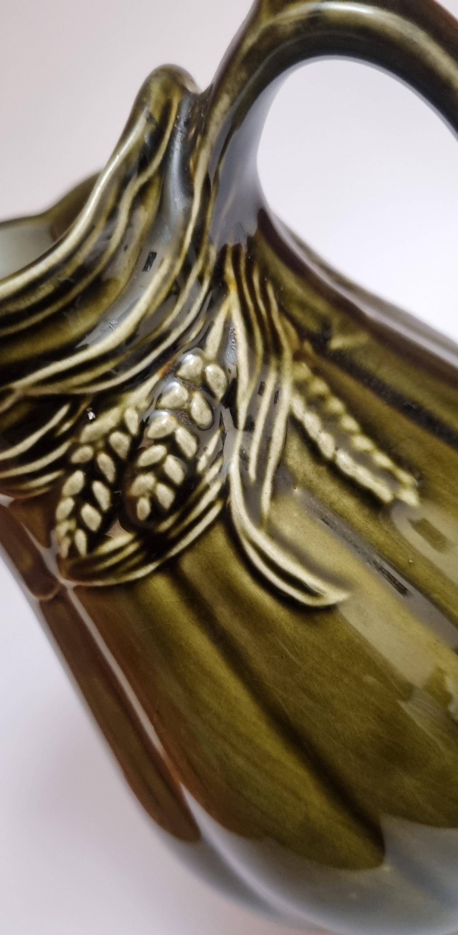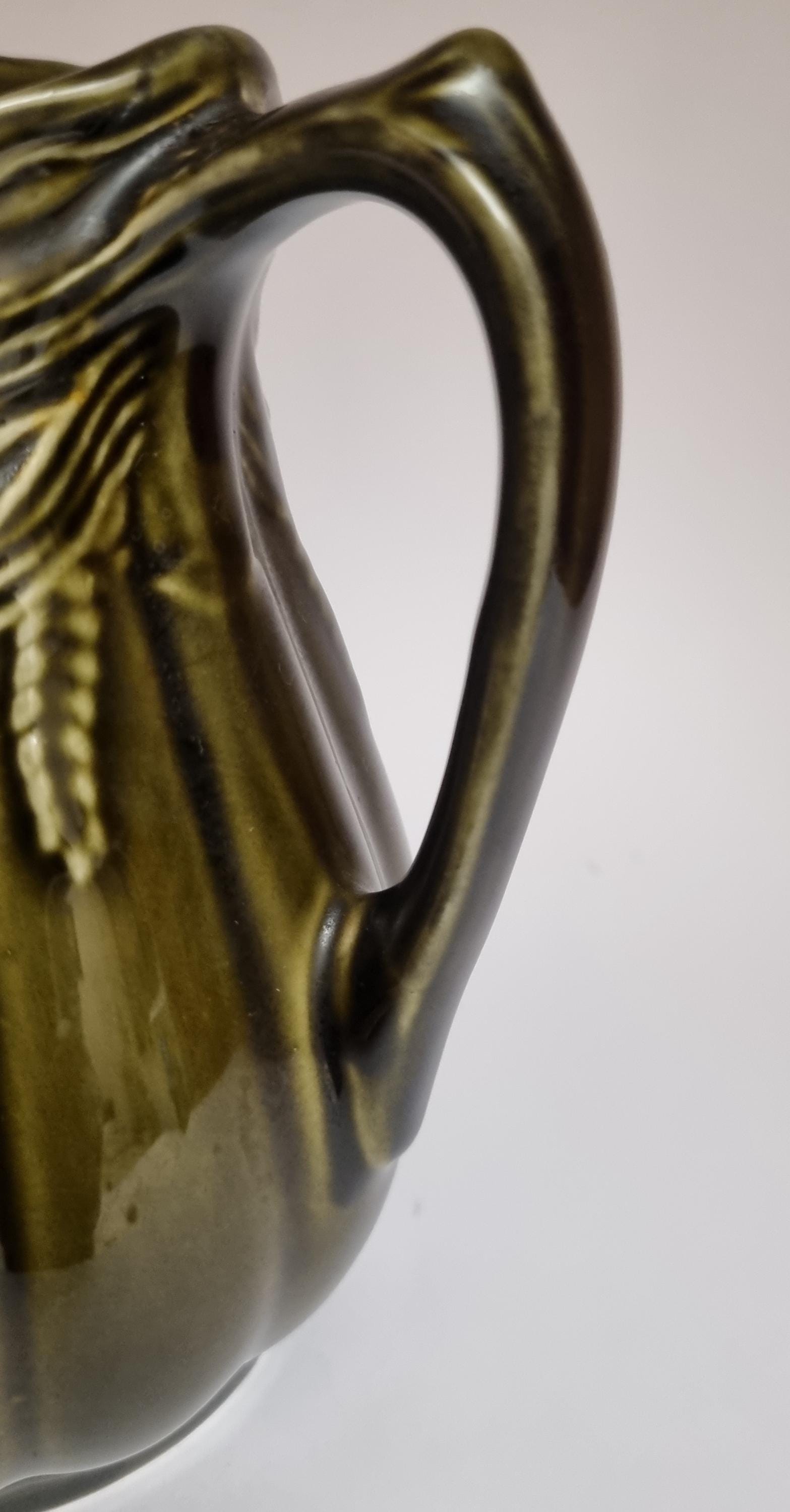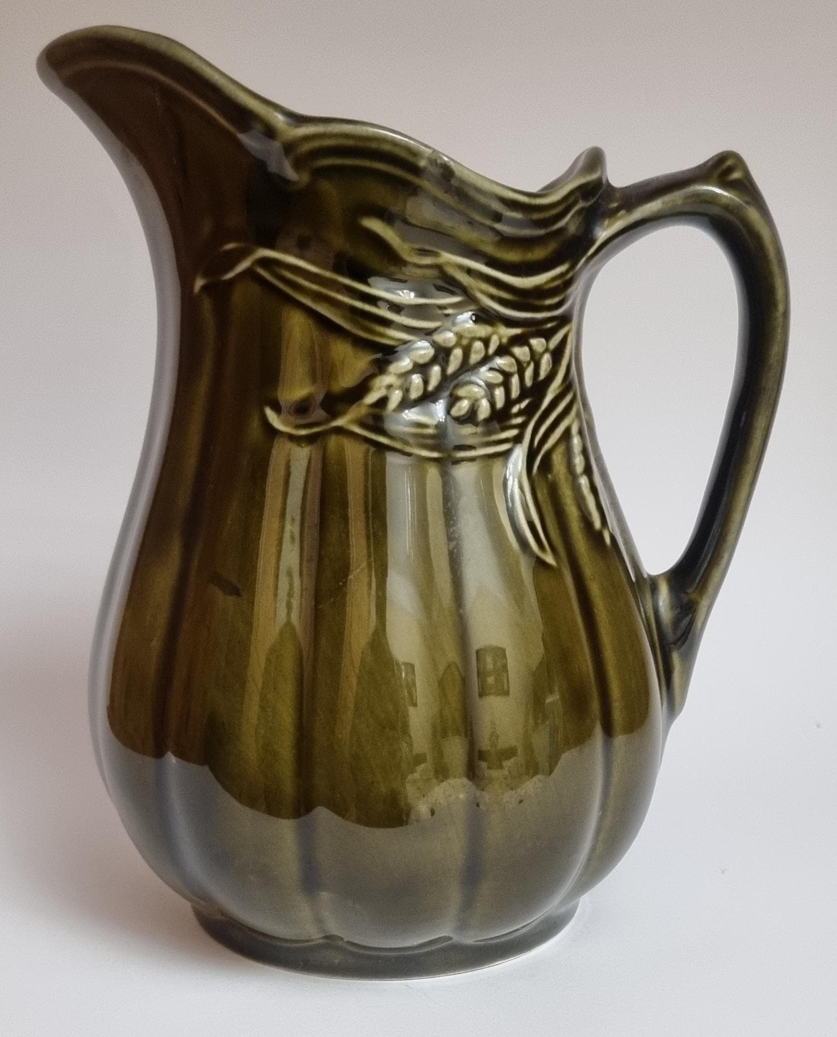 A well glazed Edwardian period jug/pitcher, in a wonderful olive green hue with an embossed wheat motif design. It also features a defined ribbing.