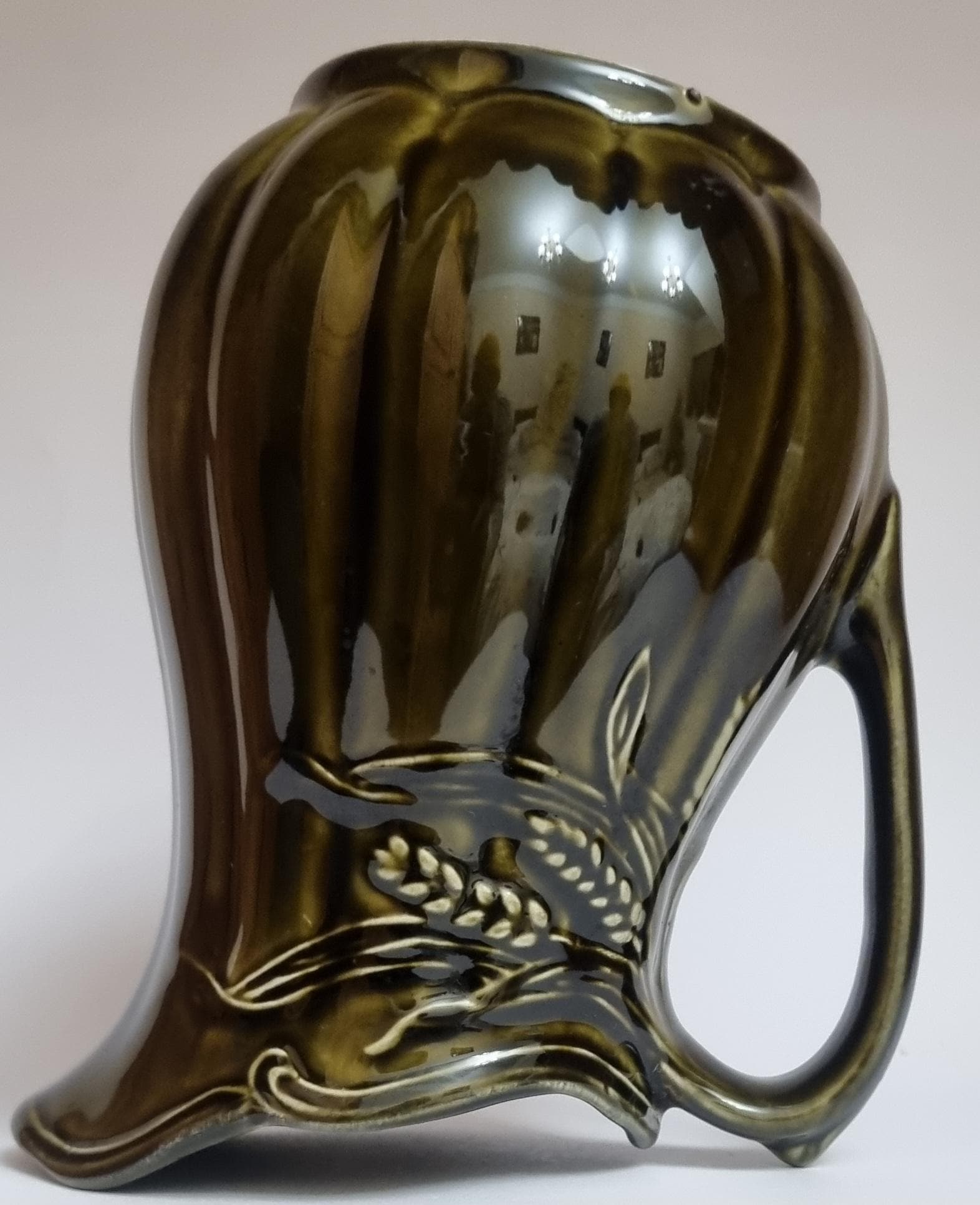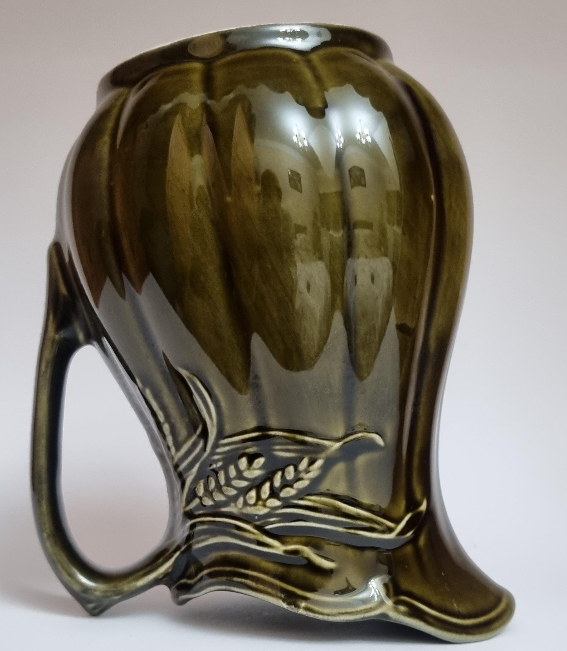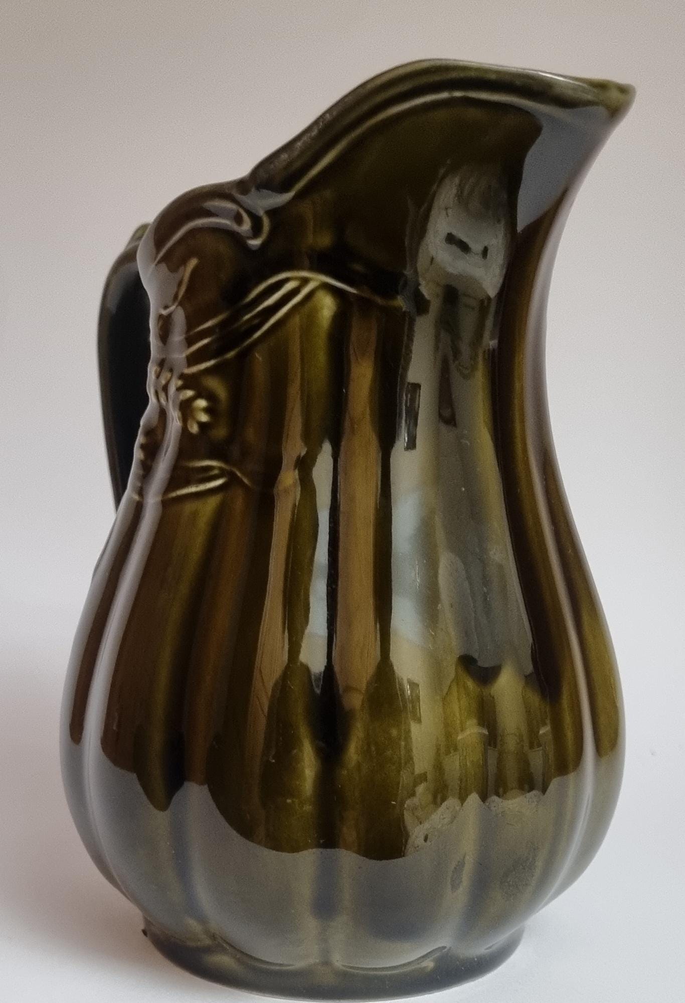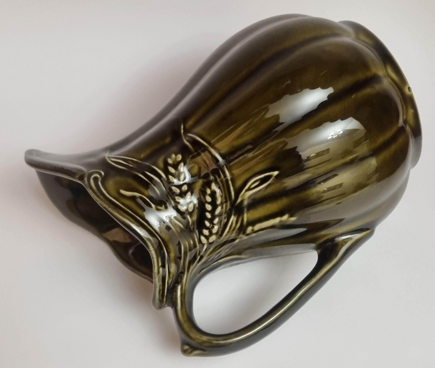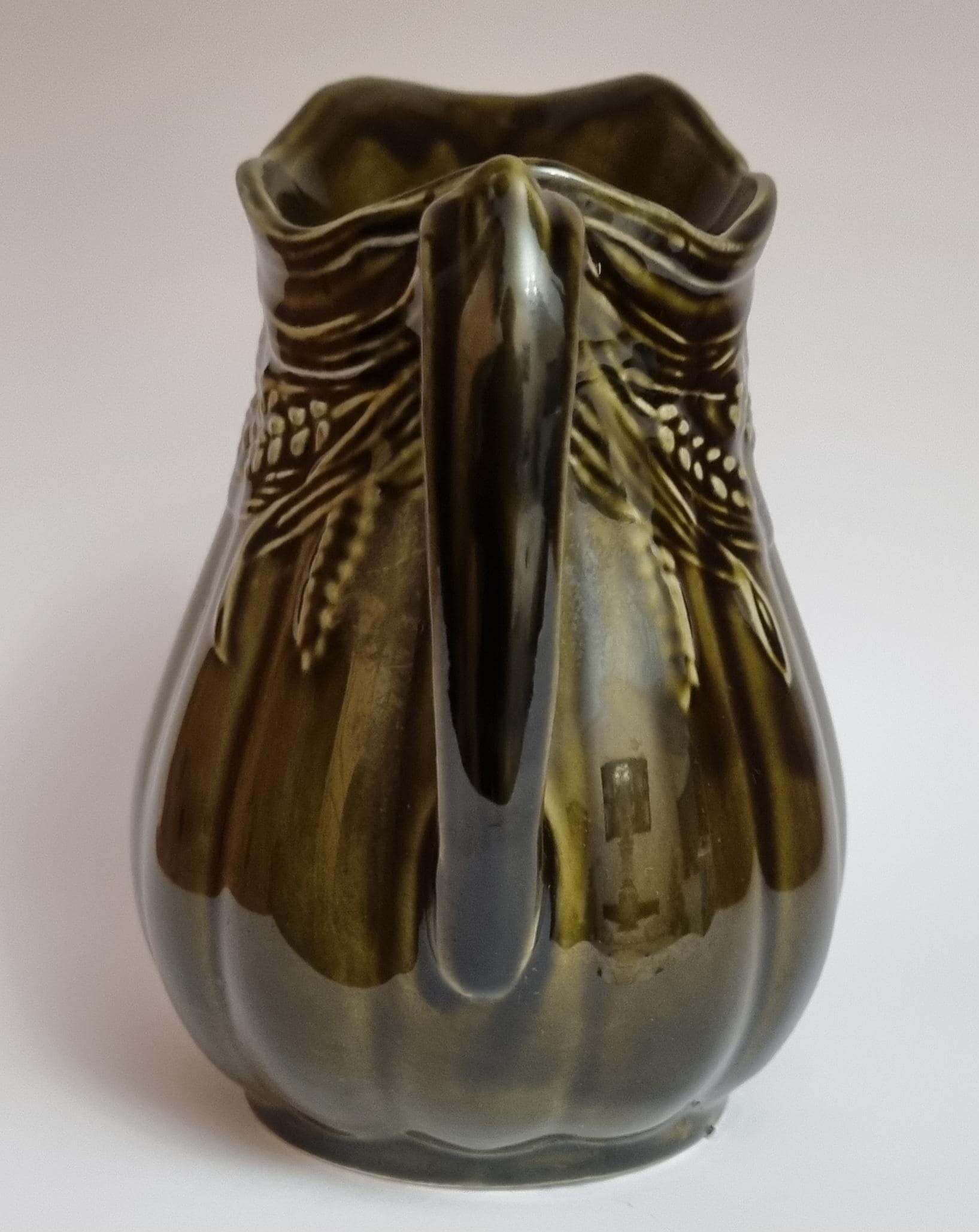 A well glazed Edwardian period jug/pitcher, in a wonderful olive green hue with an embossed wheat motif design. It also features a defined ribbing.