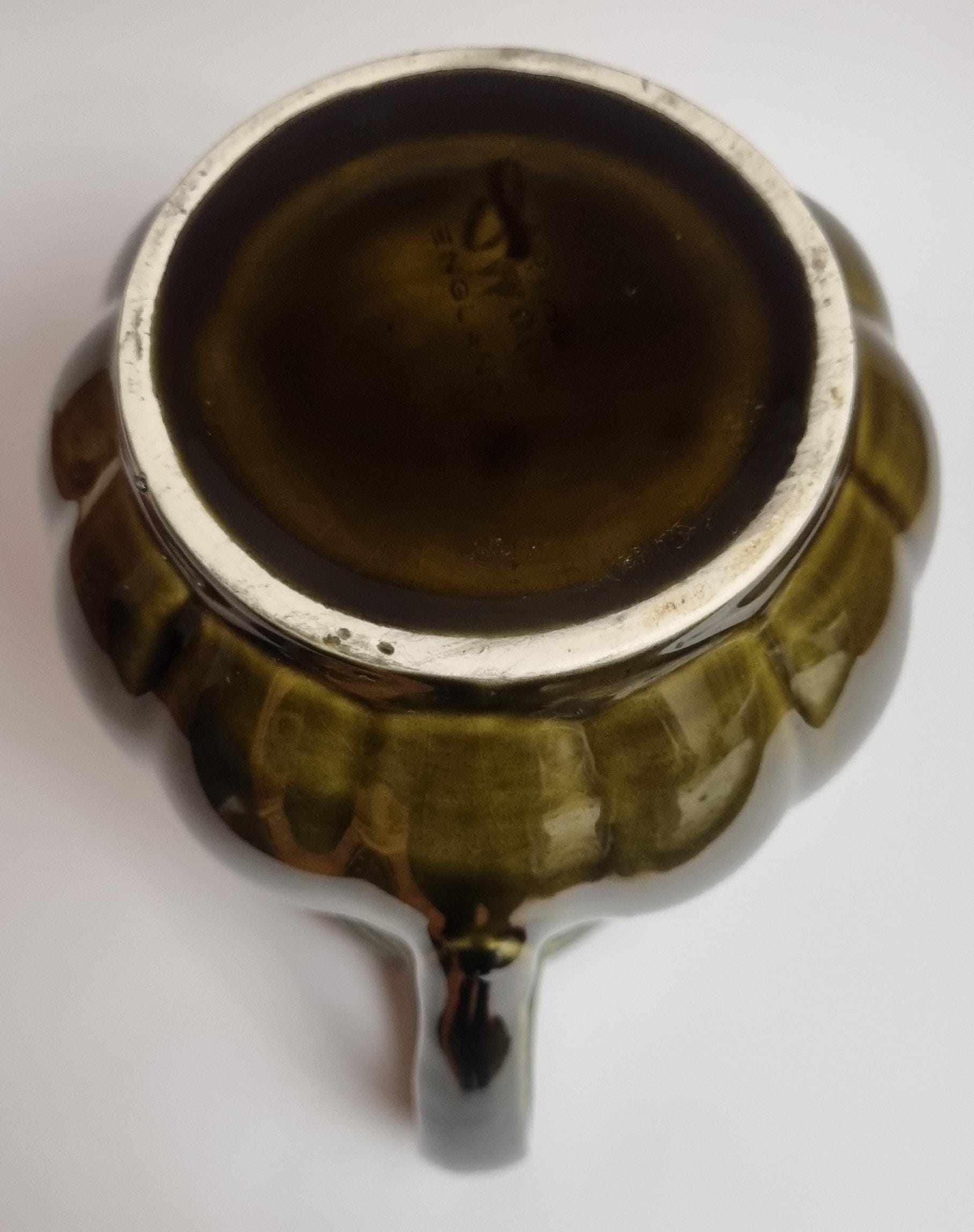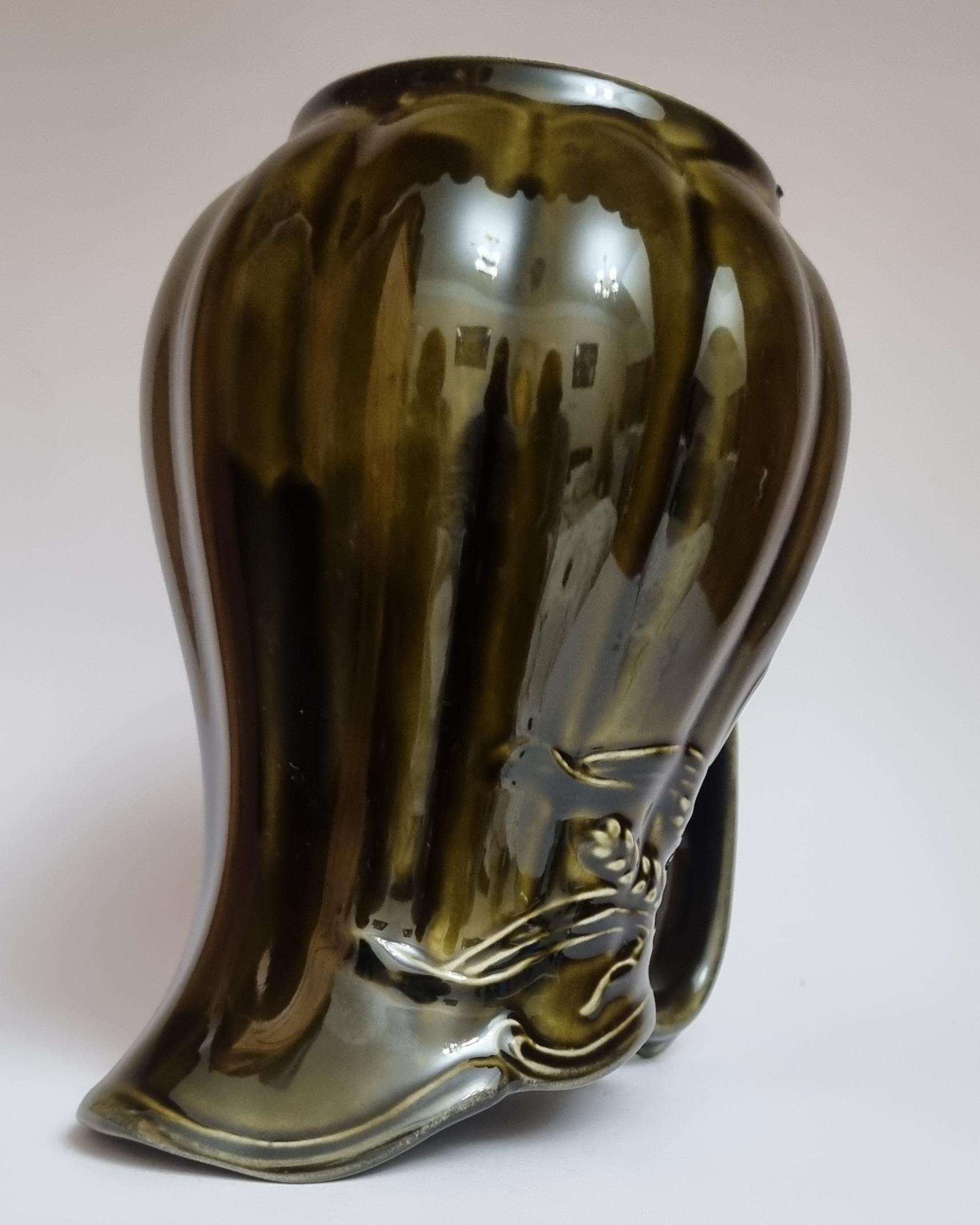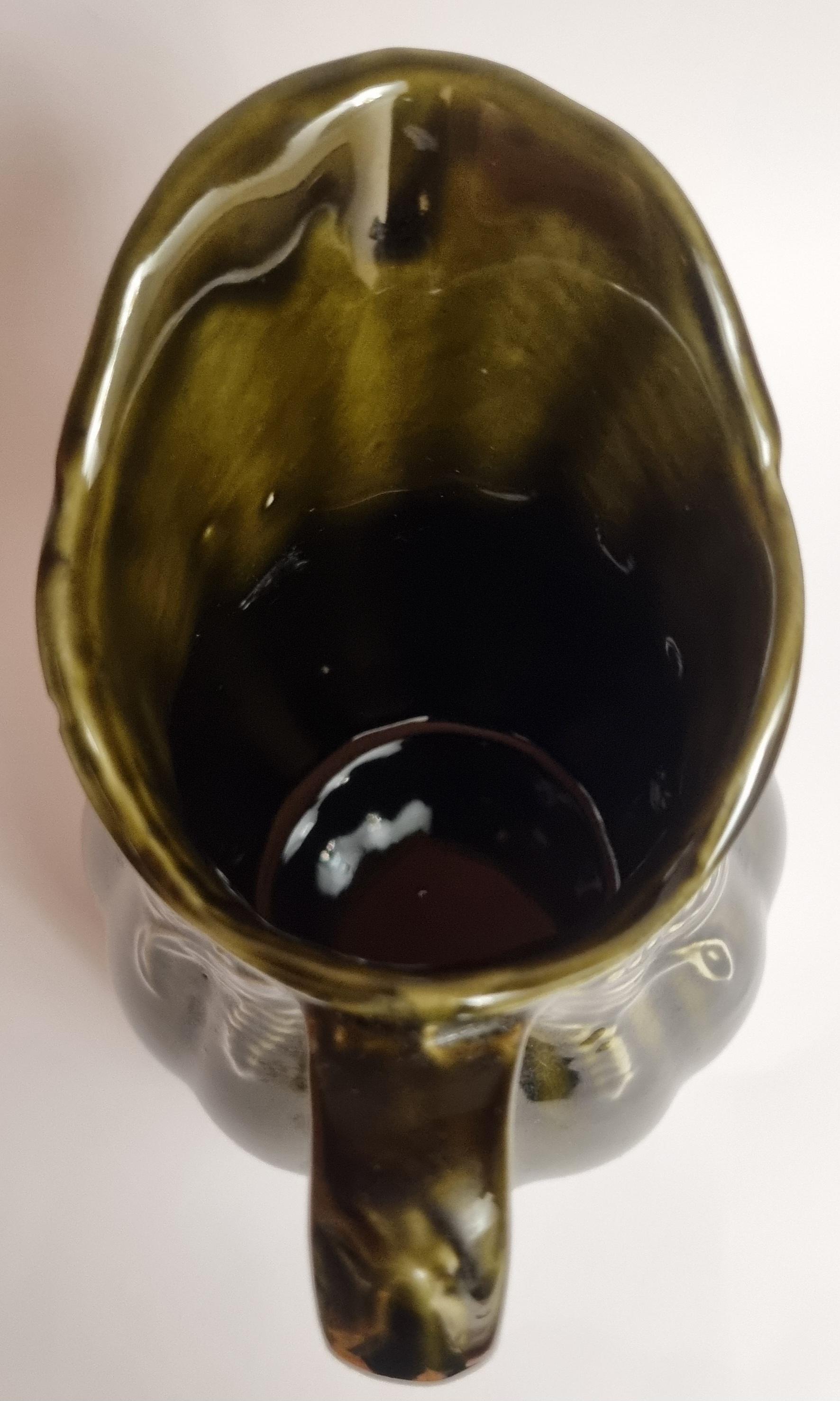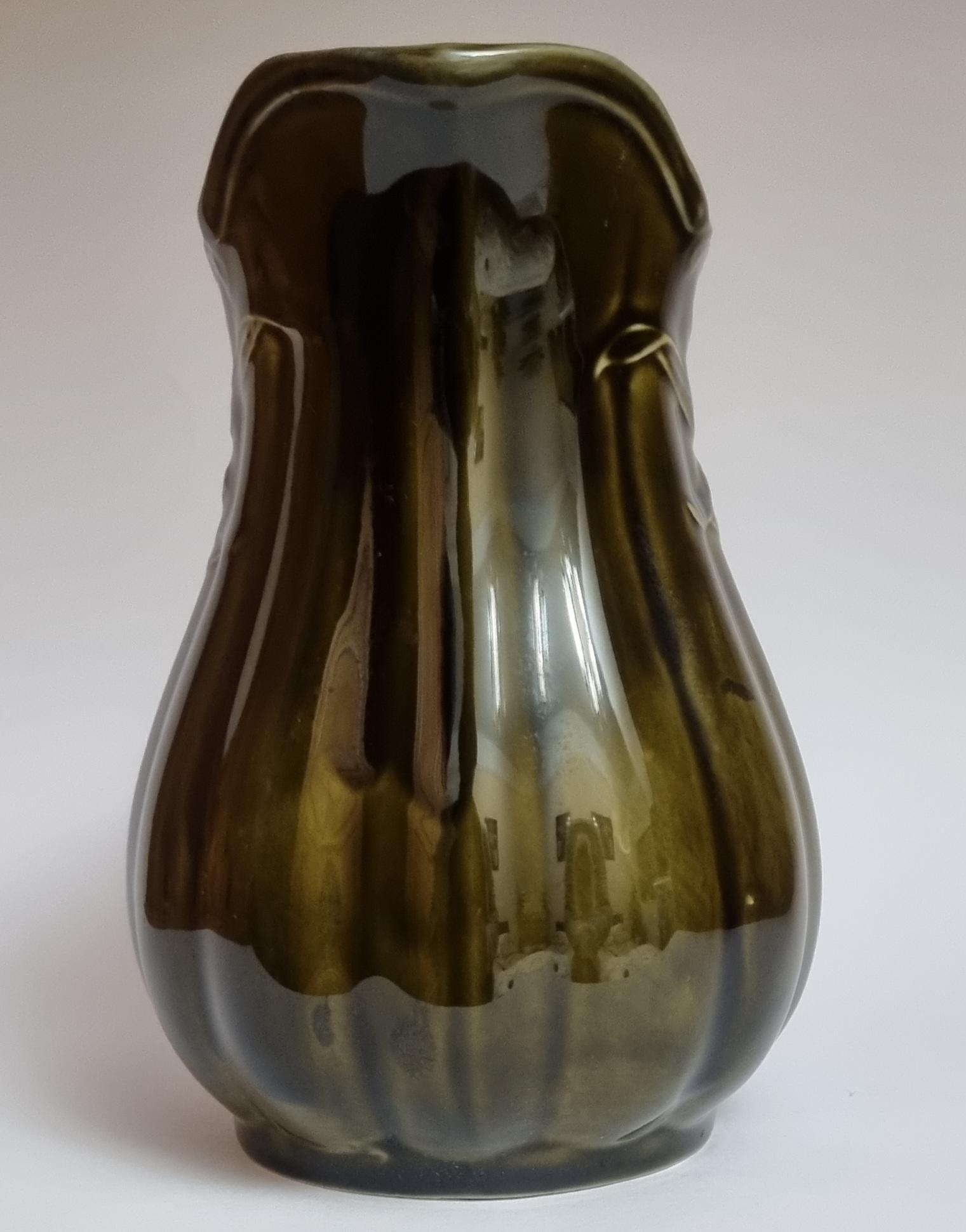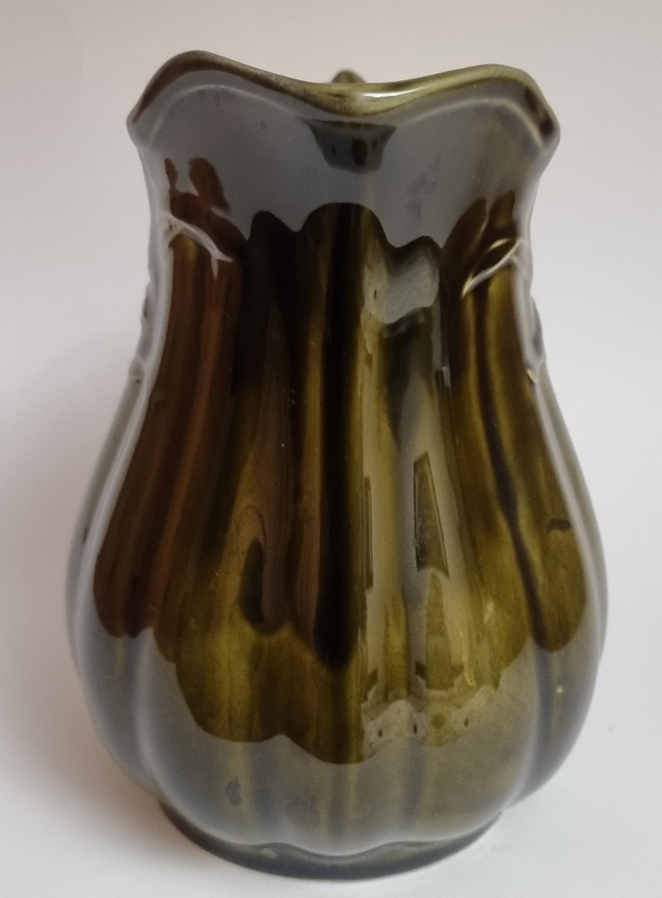 A well glazed Edwardian period jug/pitcher, in a wonderful olive green hue with an embossed wheat motif design. It also features a defined ribbing.