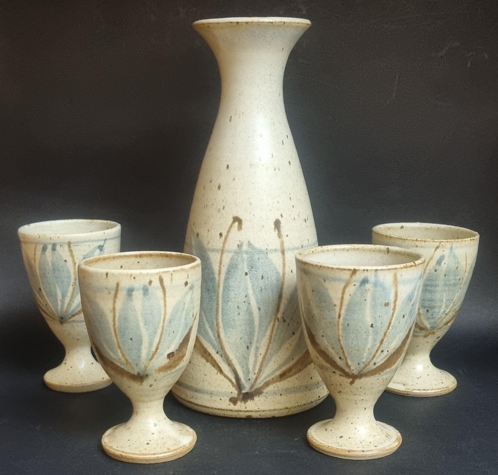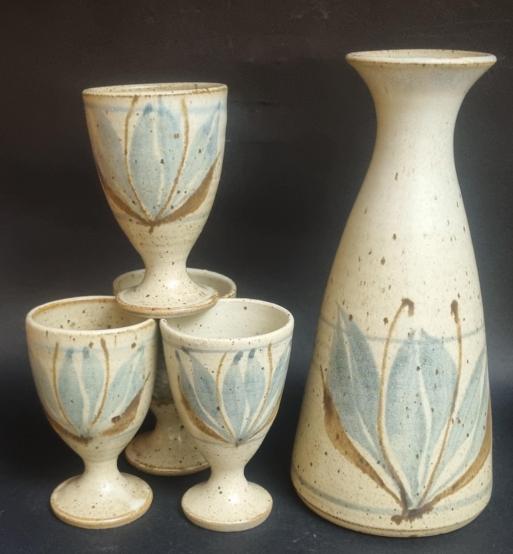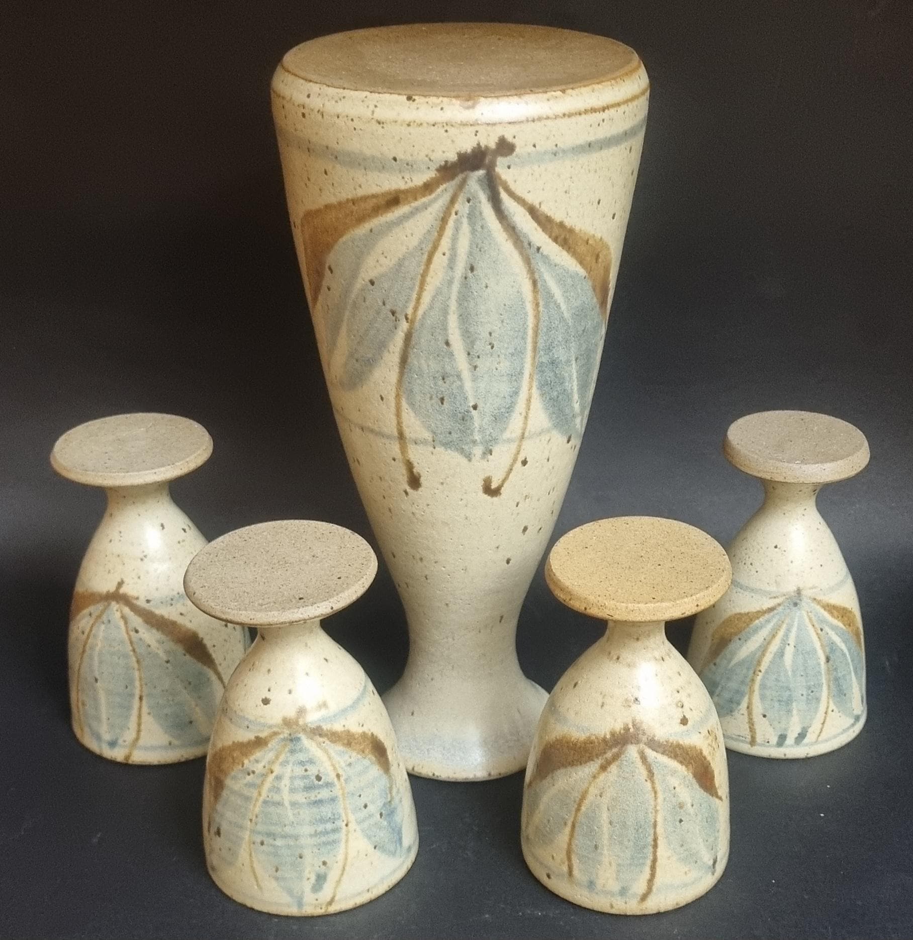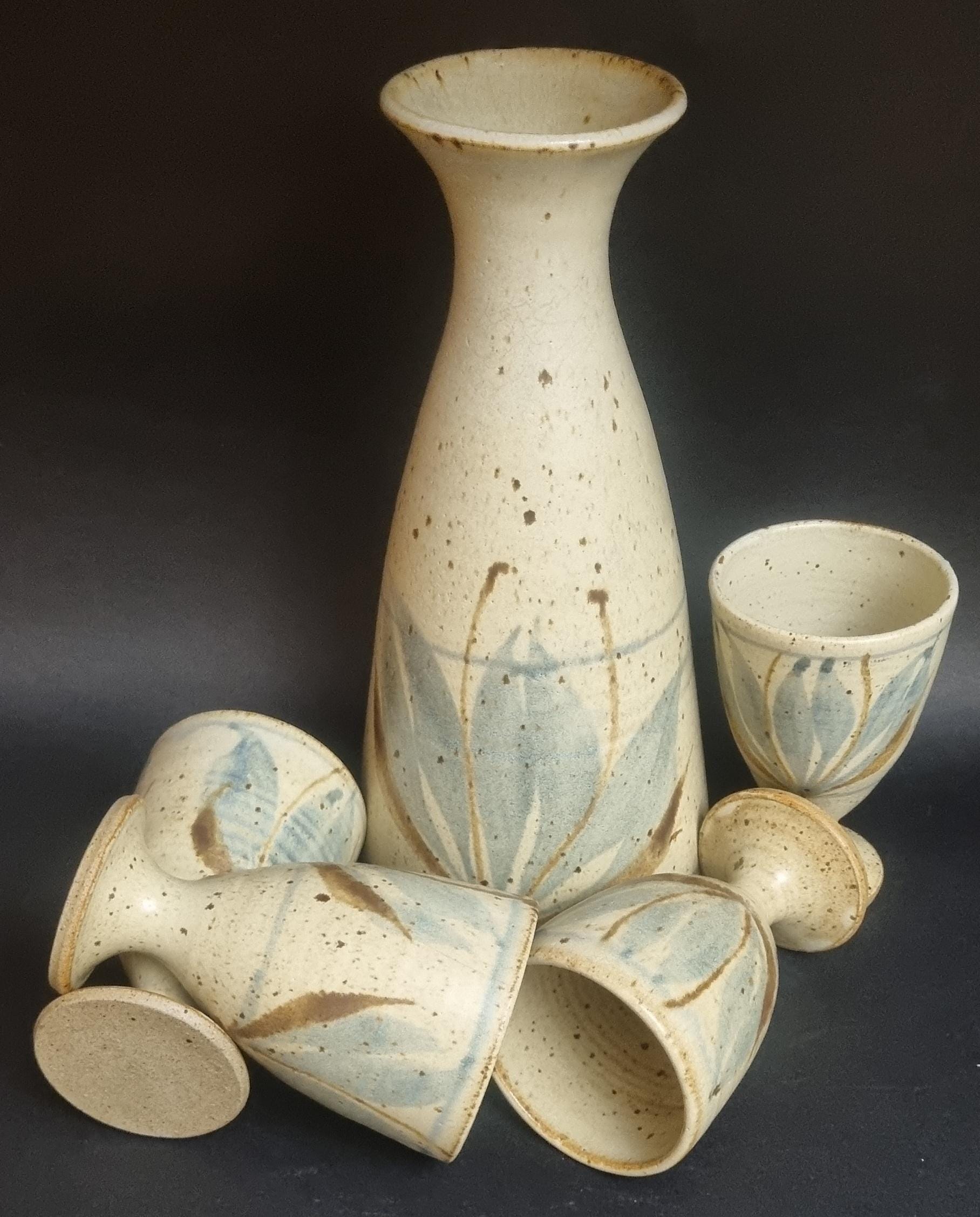 A rare wonderful studio pottery set from Roger Le Dieu Studio Pottery. With speckled glazed and hand-painted with abstract blue leaf designs.