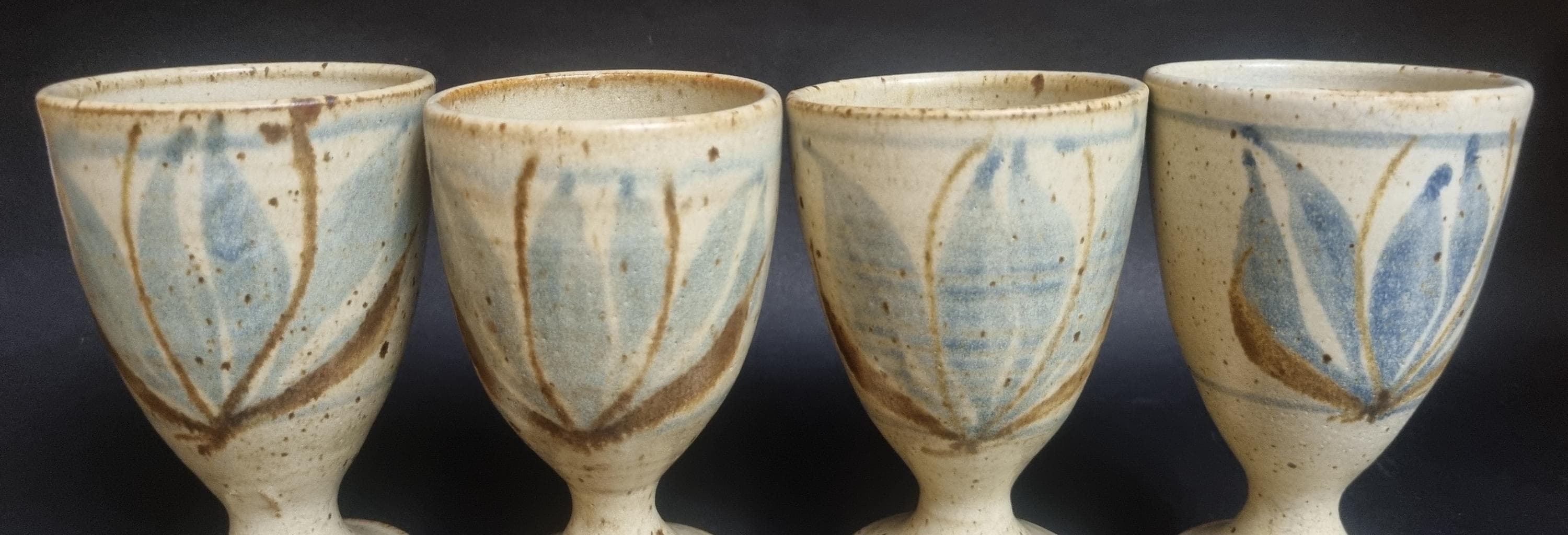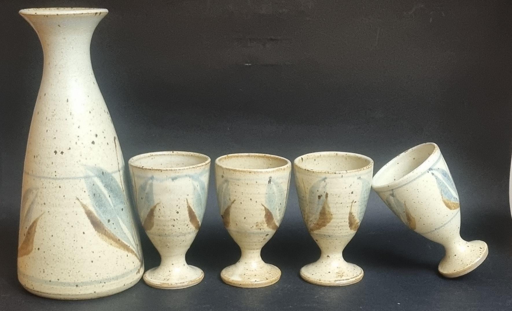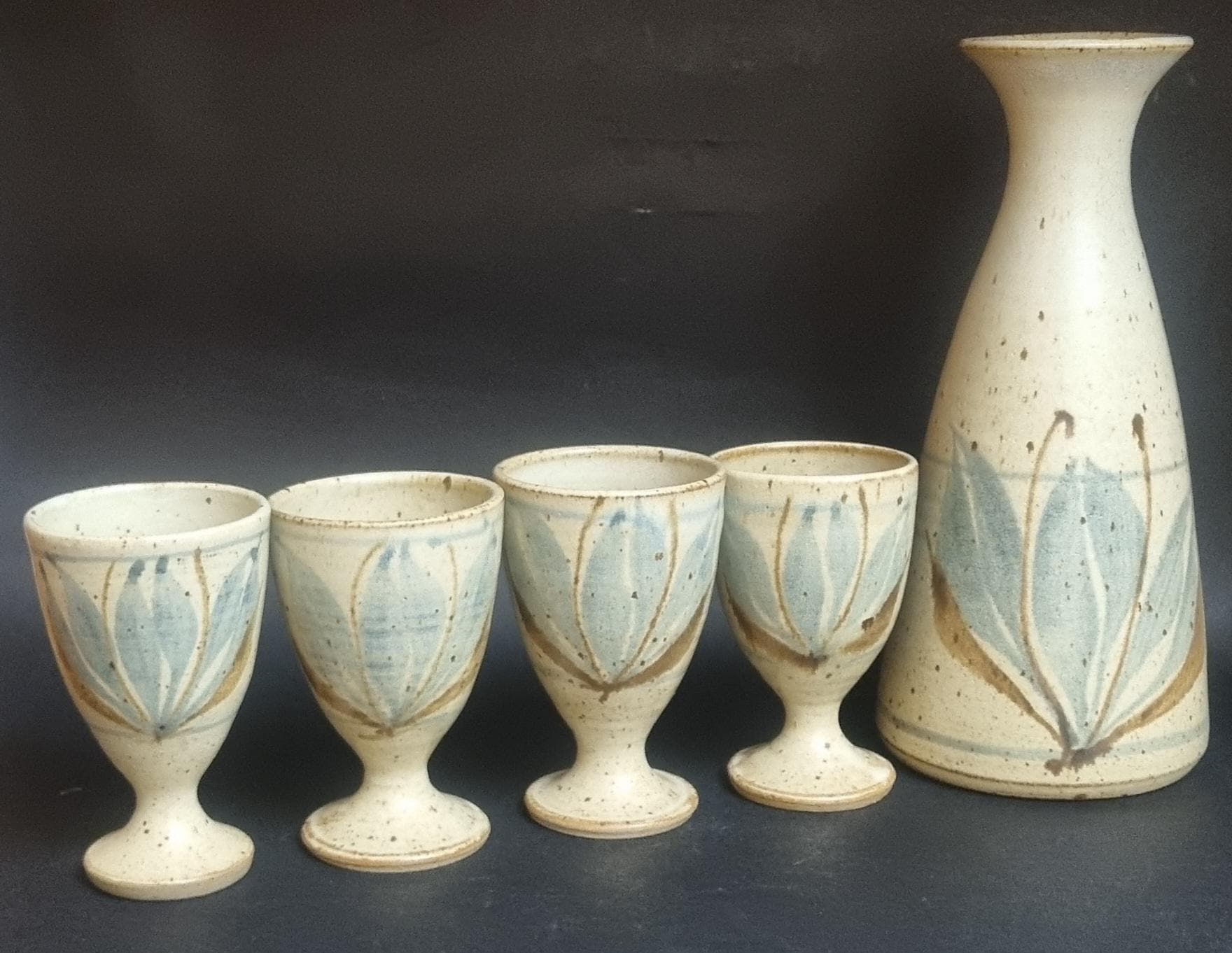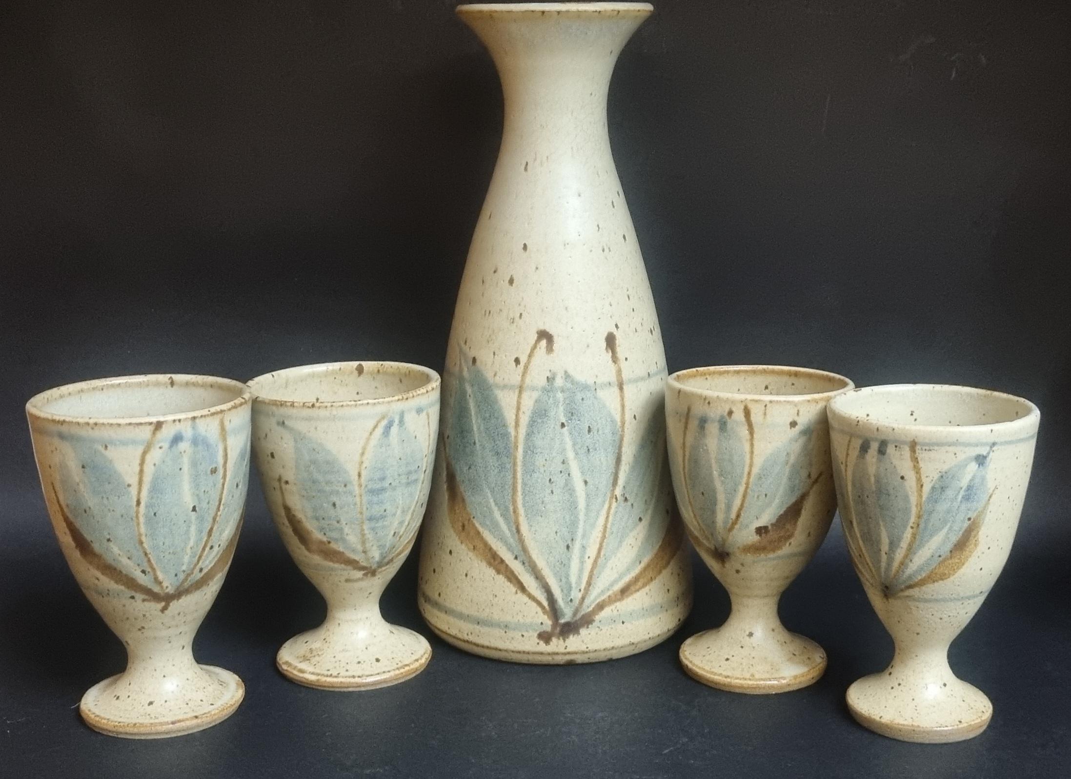 A rare wonderful studio pottery set from Roger Le Dieu Studio Pottery. With speckled glazed and hand-painted with abstract blue leaf designs.