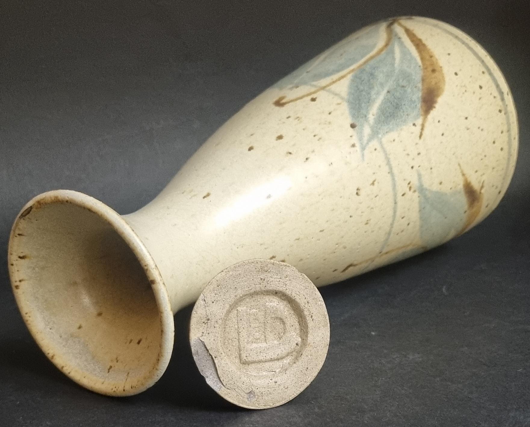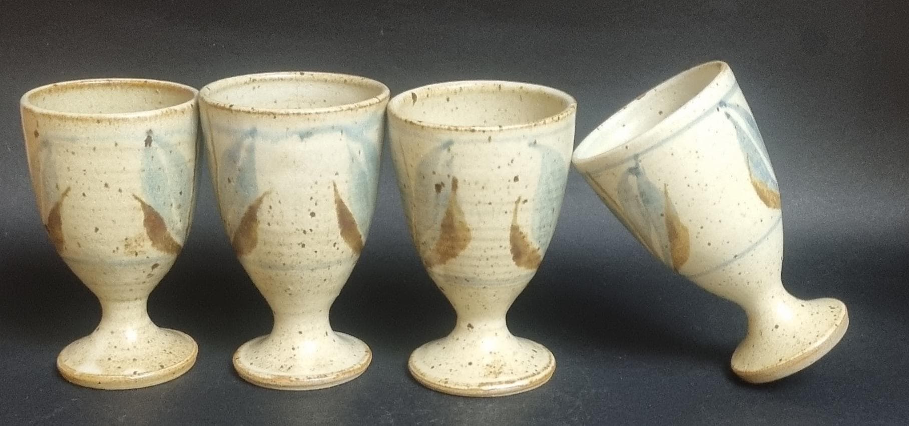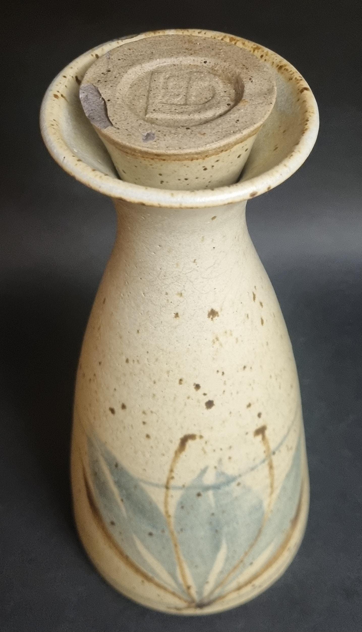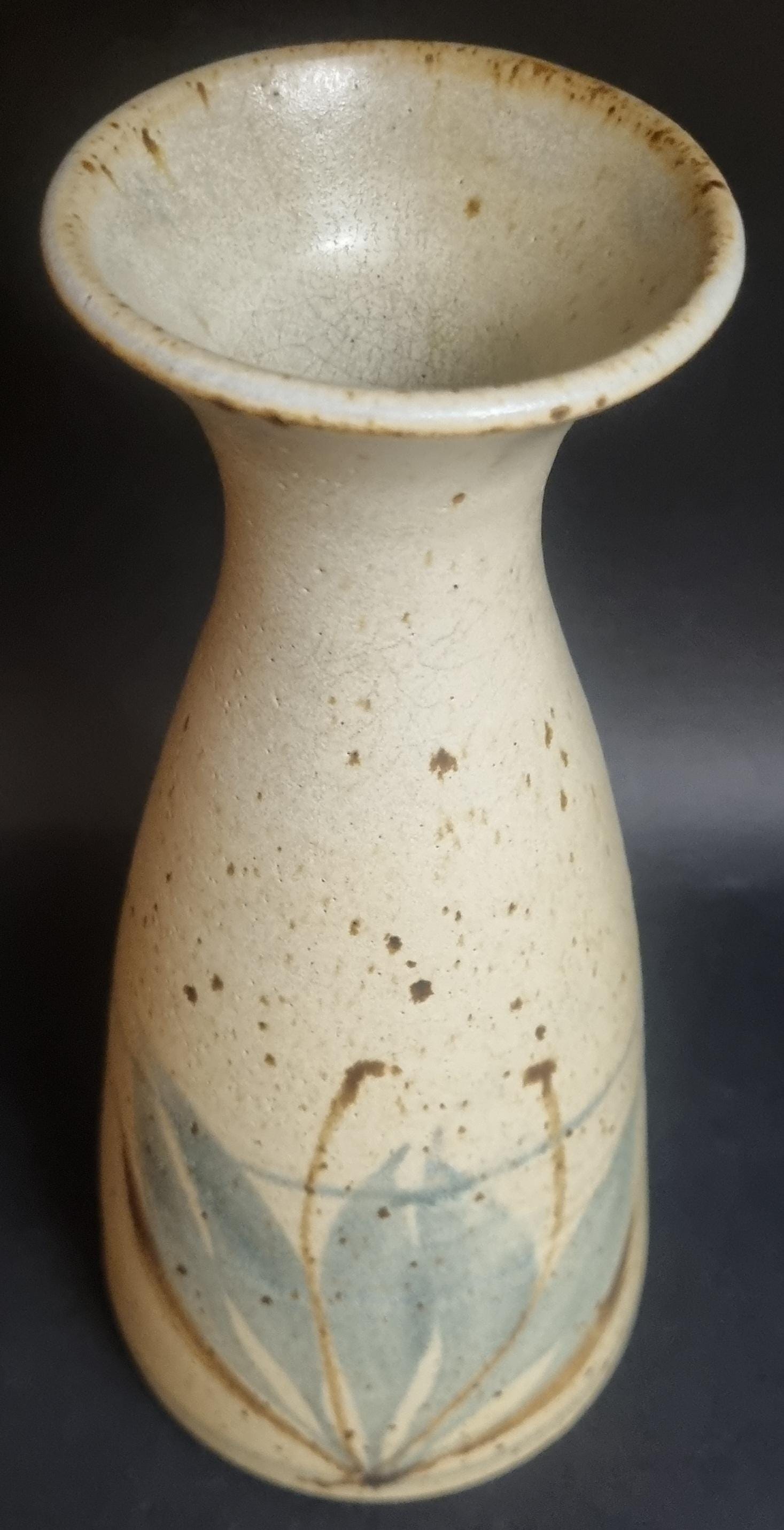 A rare wonderful studio pottery set from Roger Le Dieu Studio Pottery. With speckled glazed and hand-painted with abstract blue leaf designs.
