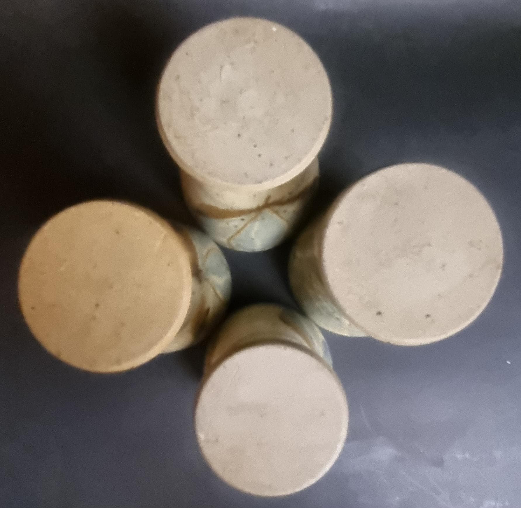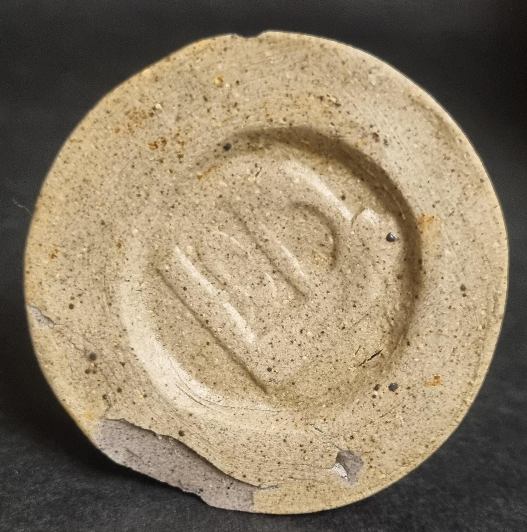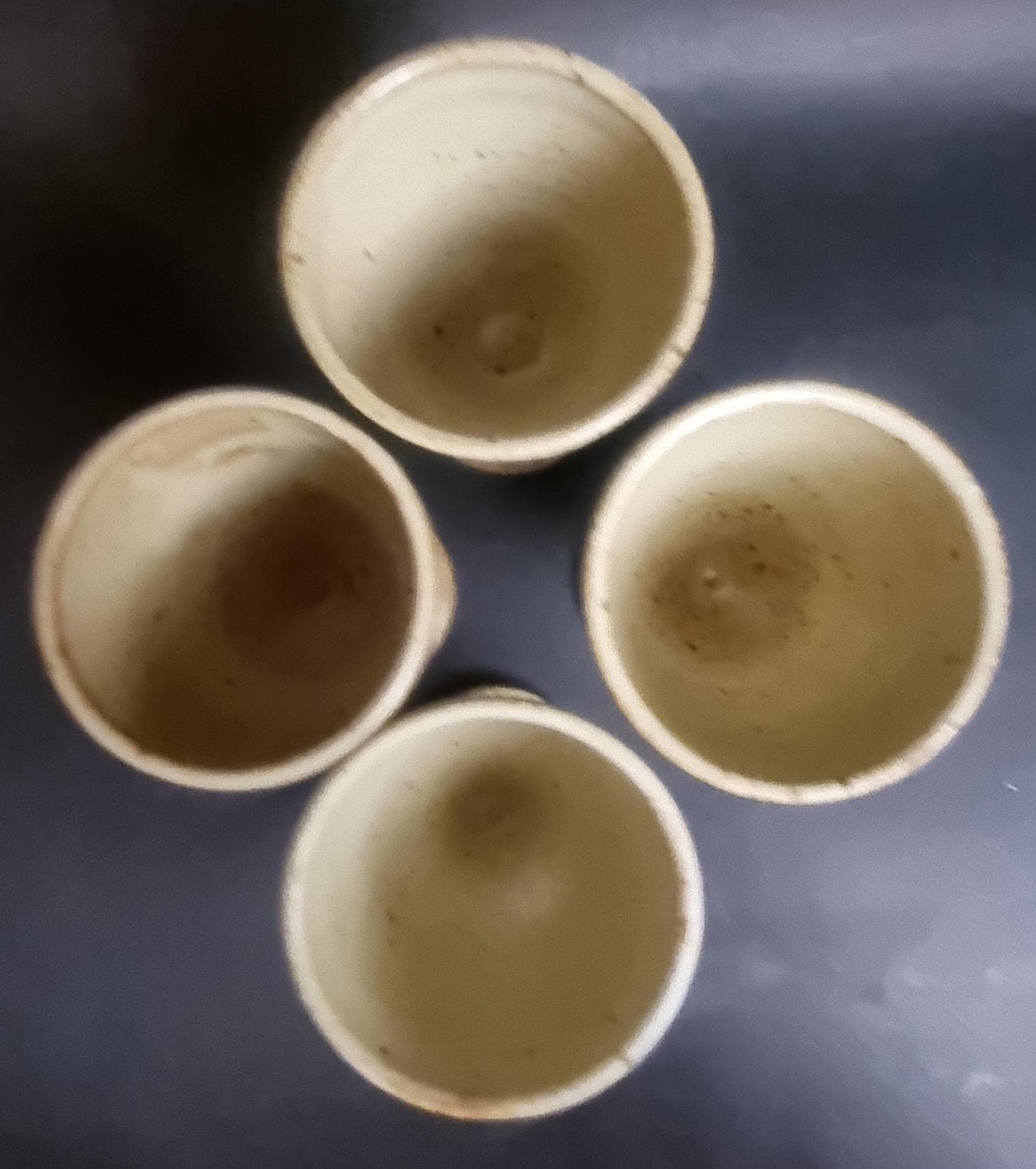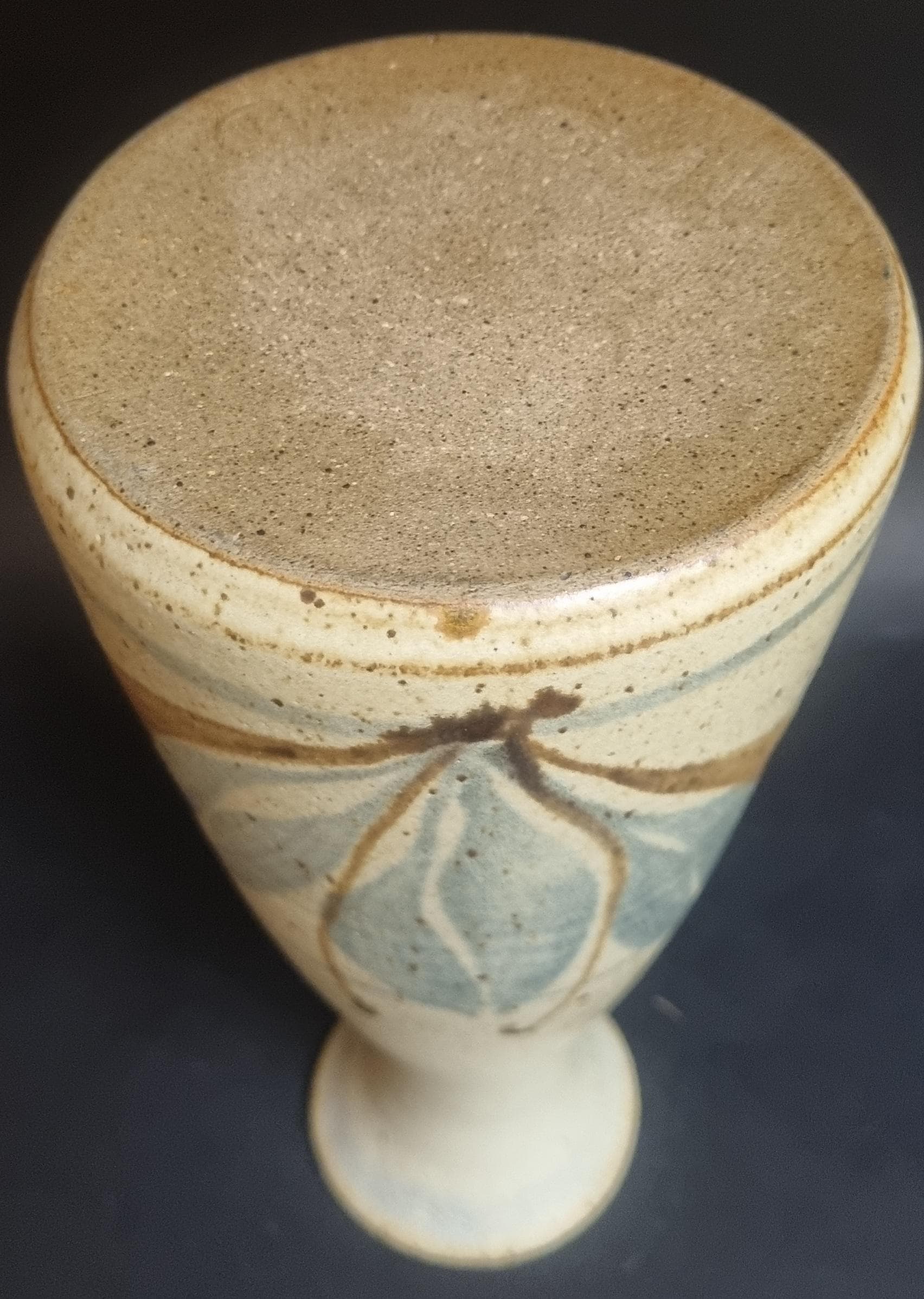 A rare wonderful studio pottery set from Roger Le Dieu Studio Pottery. With speckled glazed and hand-painted with abstract blue leaf designs.