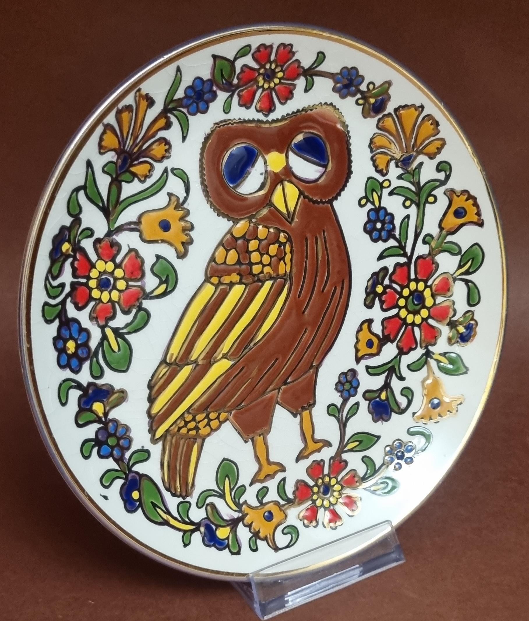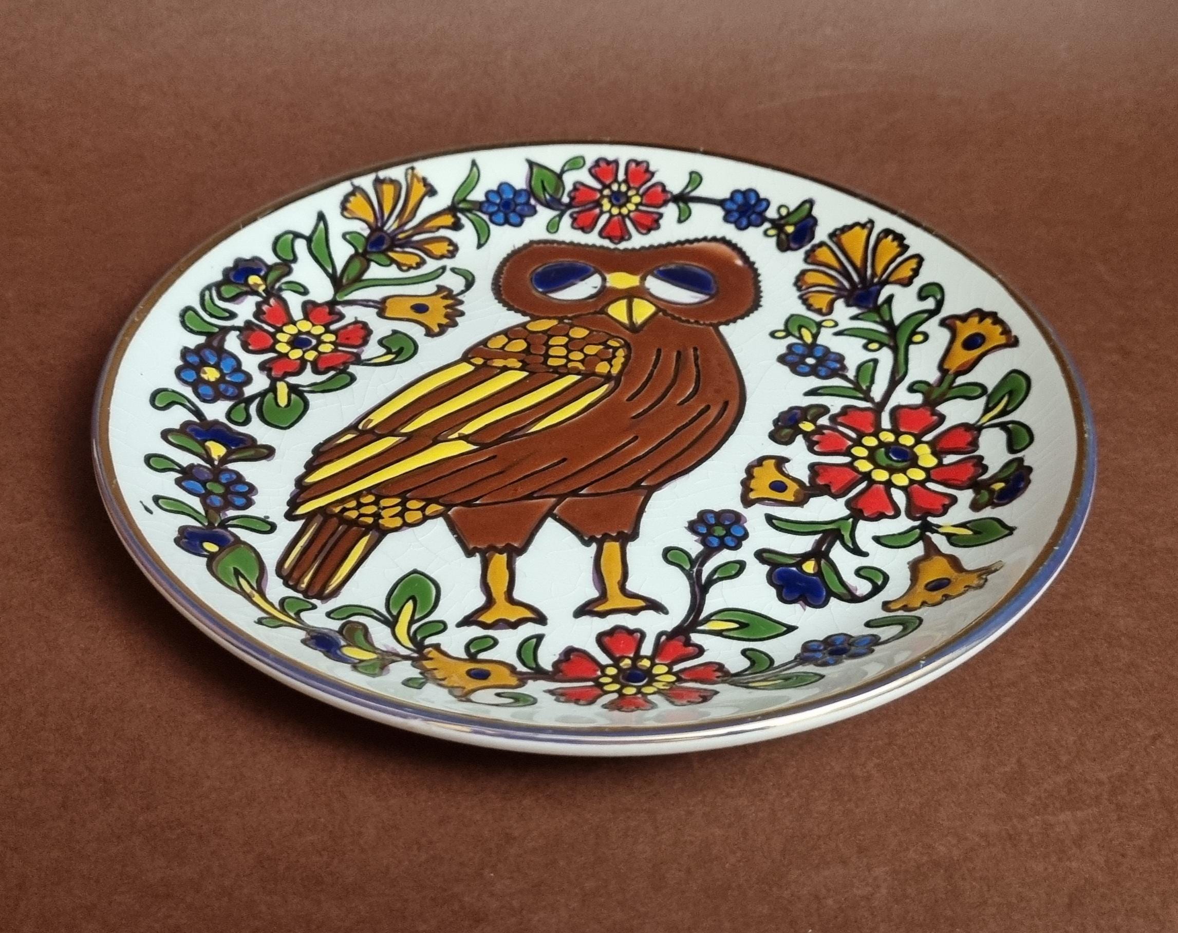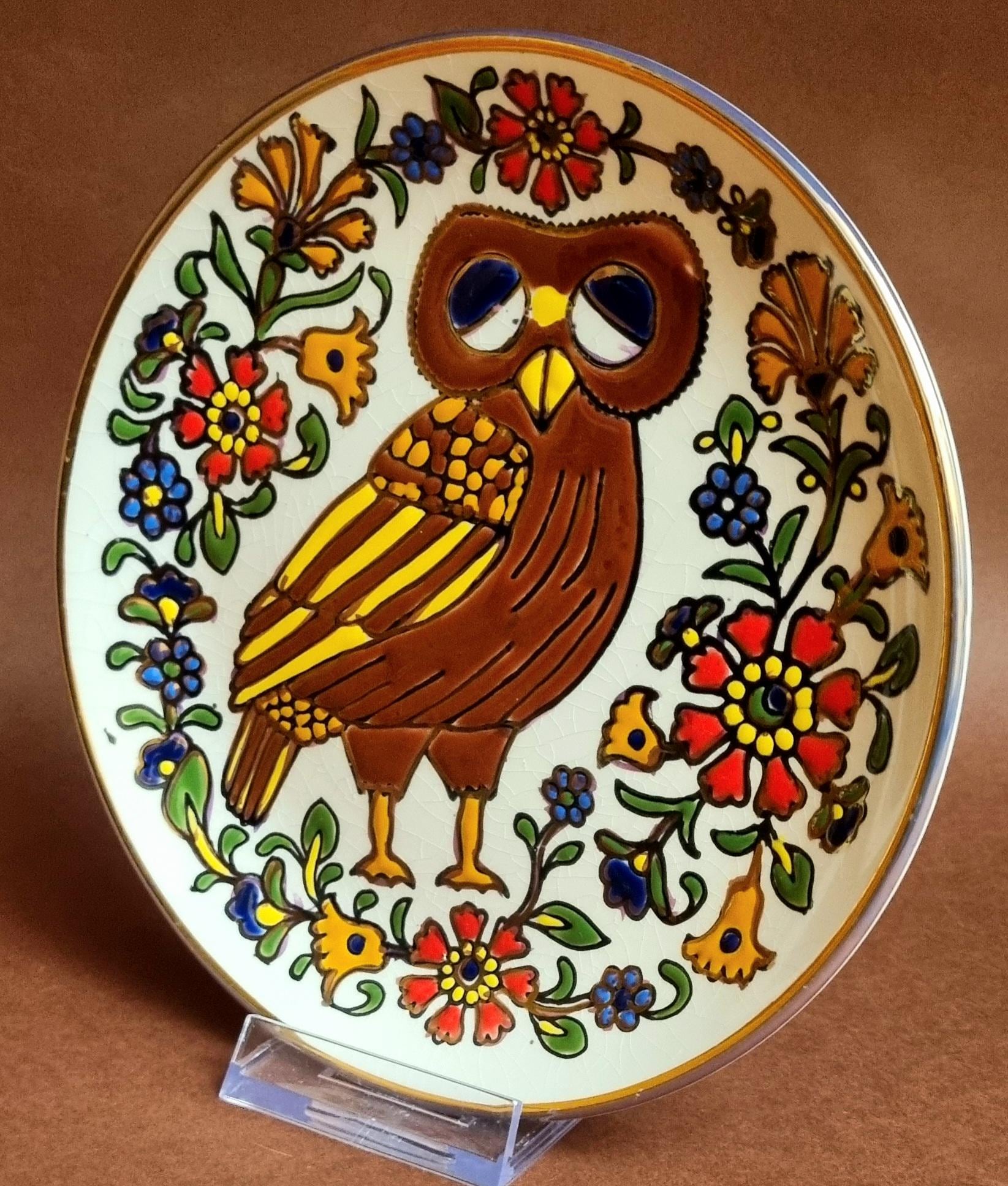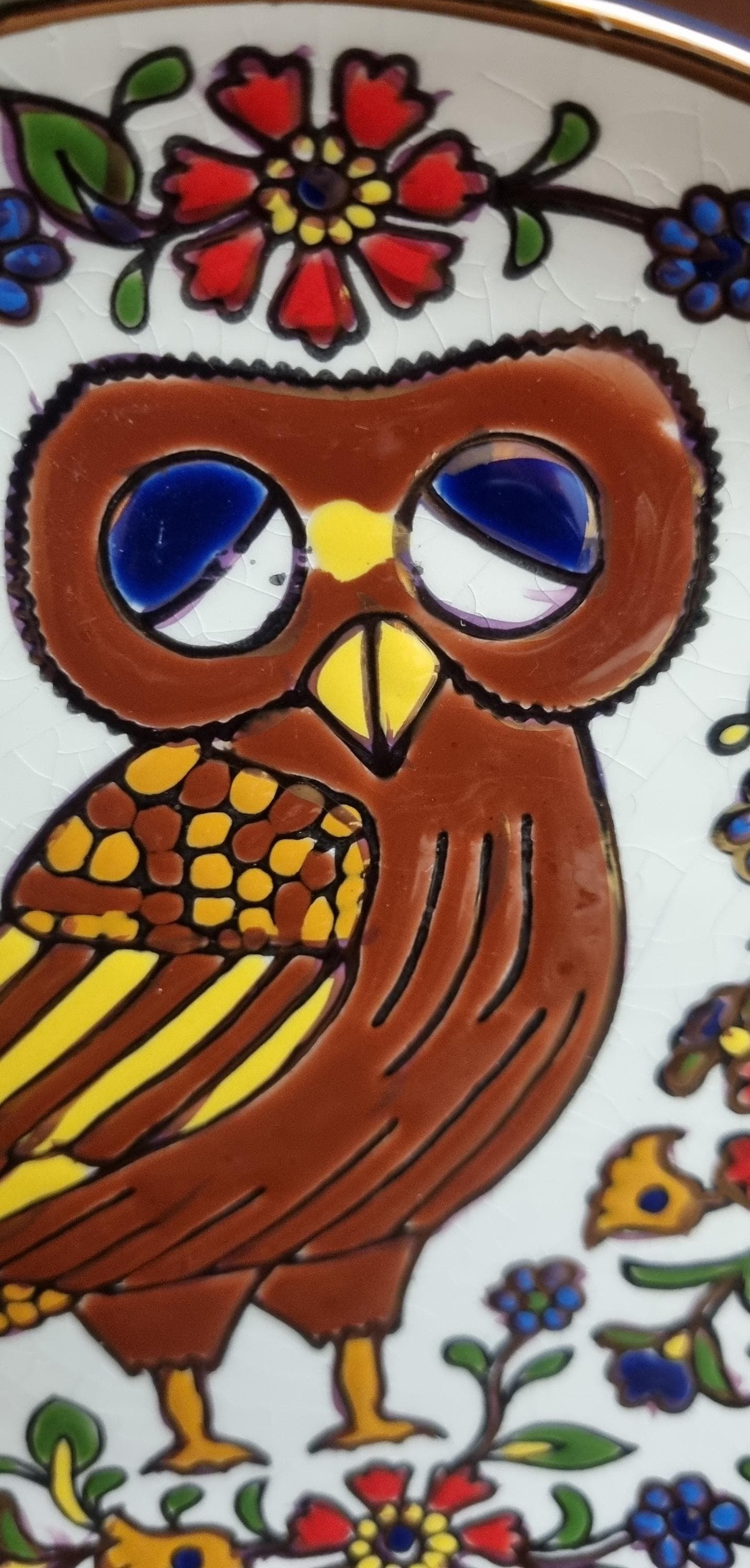 The plate originates from Rhodes, Greece and is hand-painted in vibrant red, blue green & yellow floral motif and a charming owl painted in brown, yellow and blue. Also has gold painted rims and outlines.