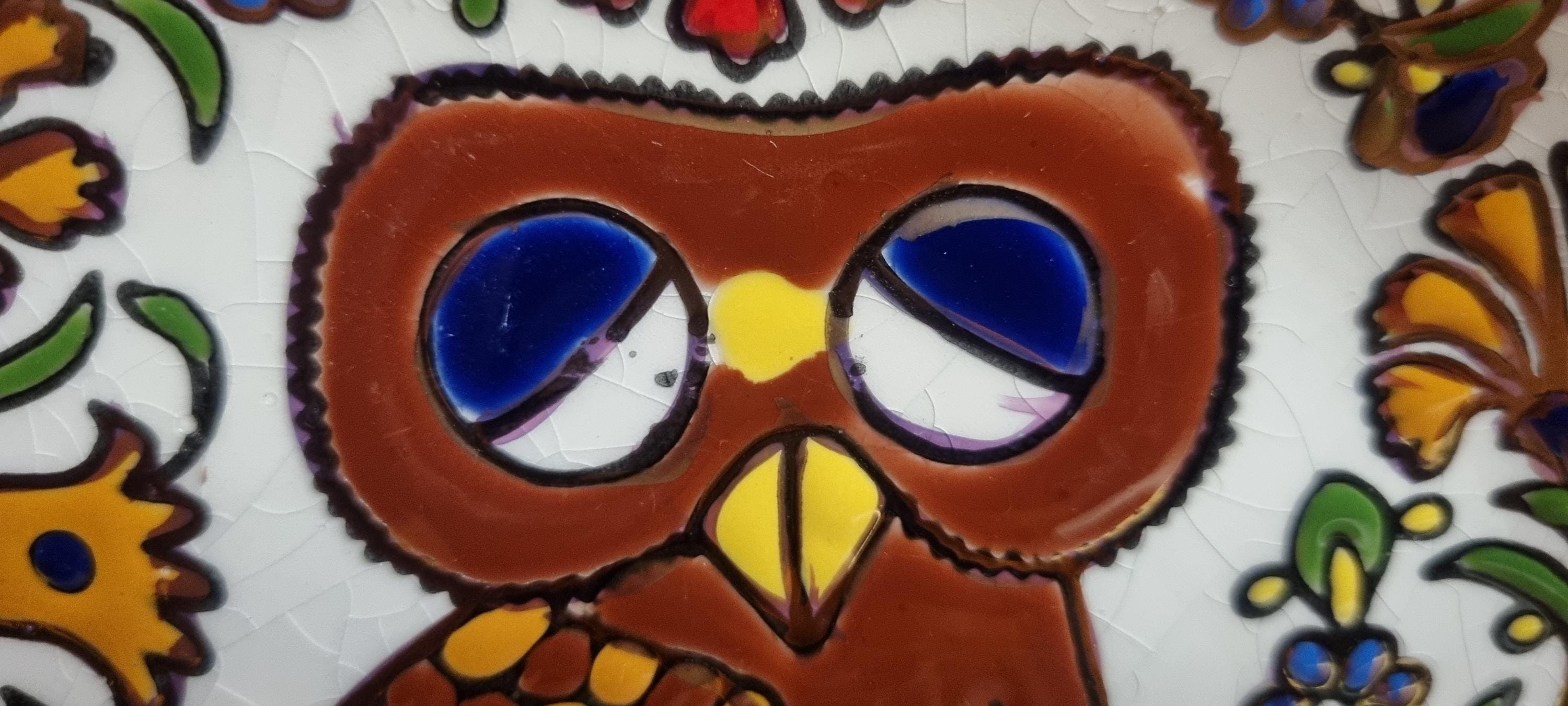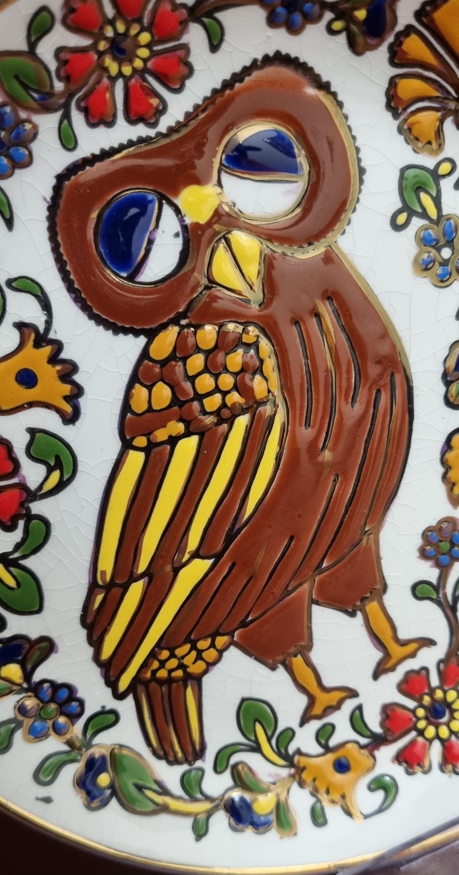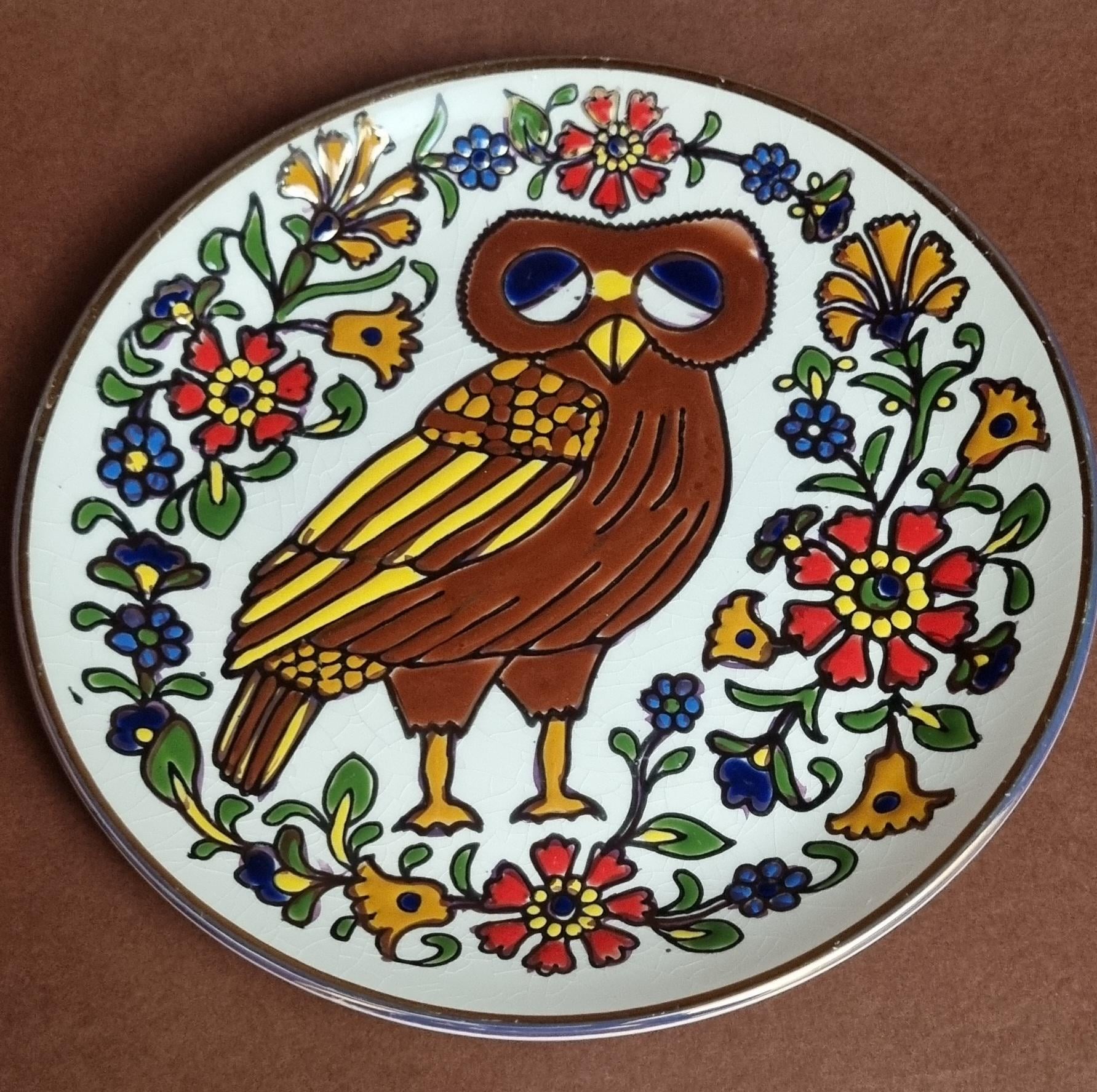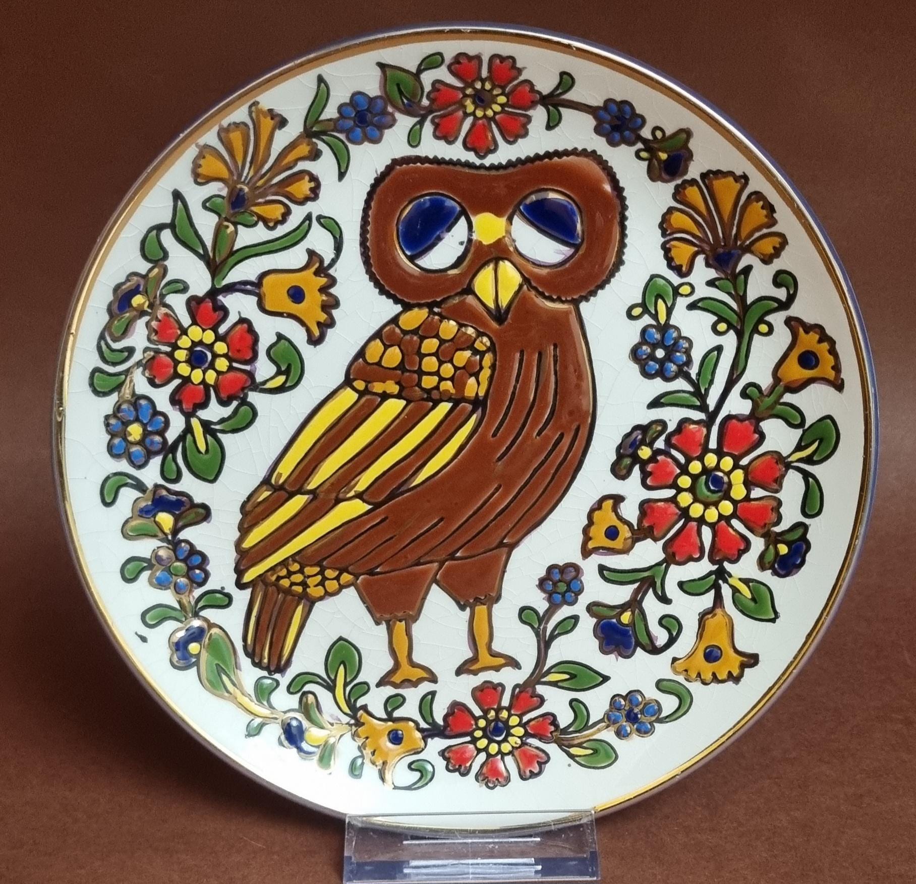 The plate originates from Rhodes, Greece and is hand-painted in vibrant red, blue green & yellow floral motif and a charming owl painted in brown, yellow and blue. Also has gold painted rims and outlines.