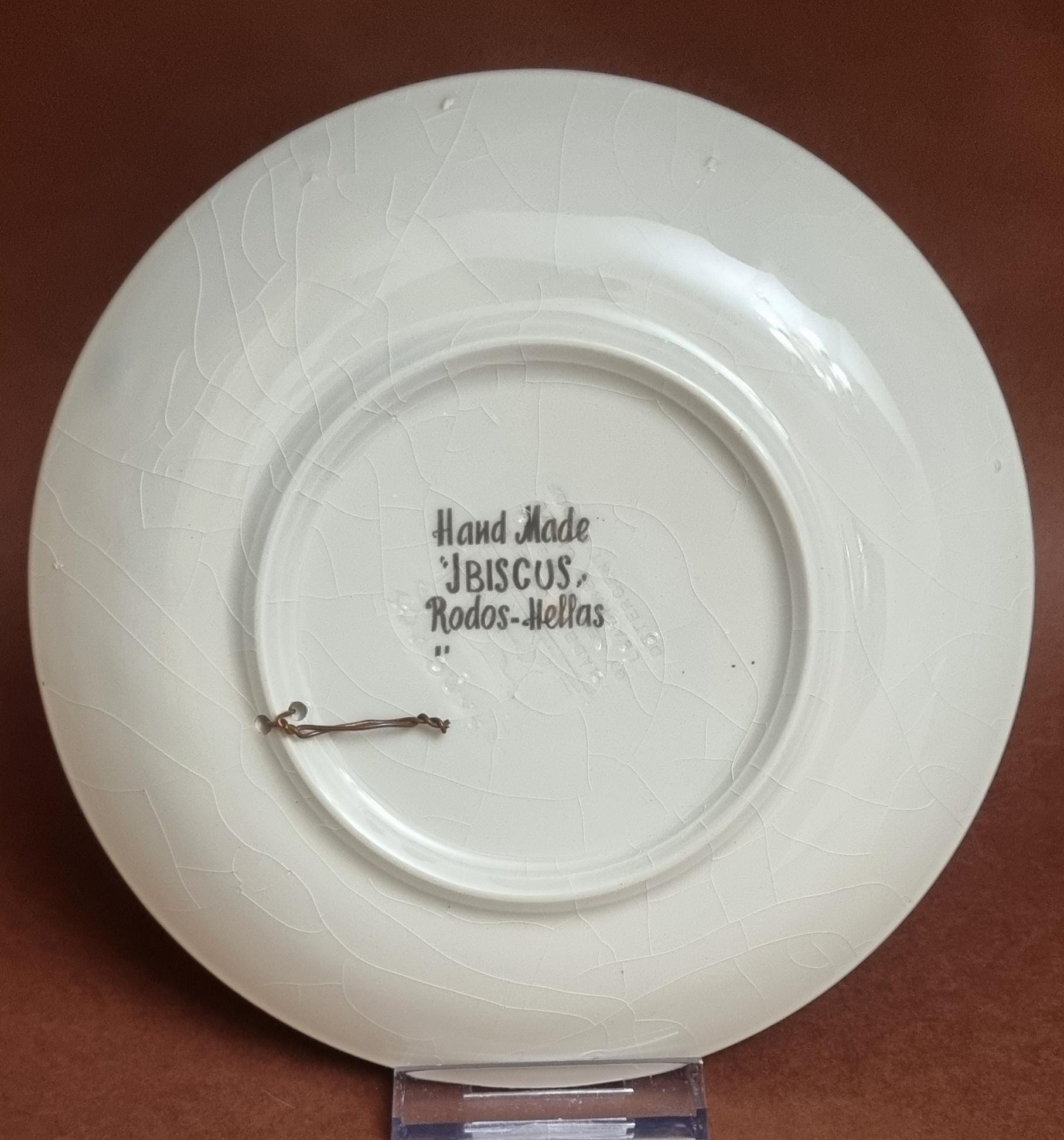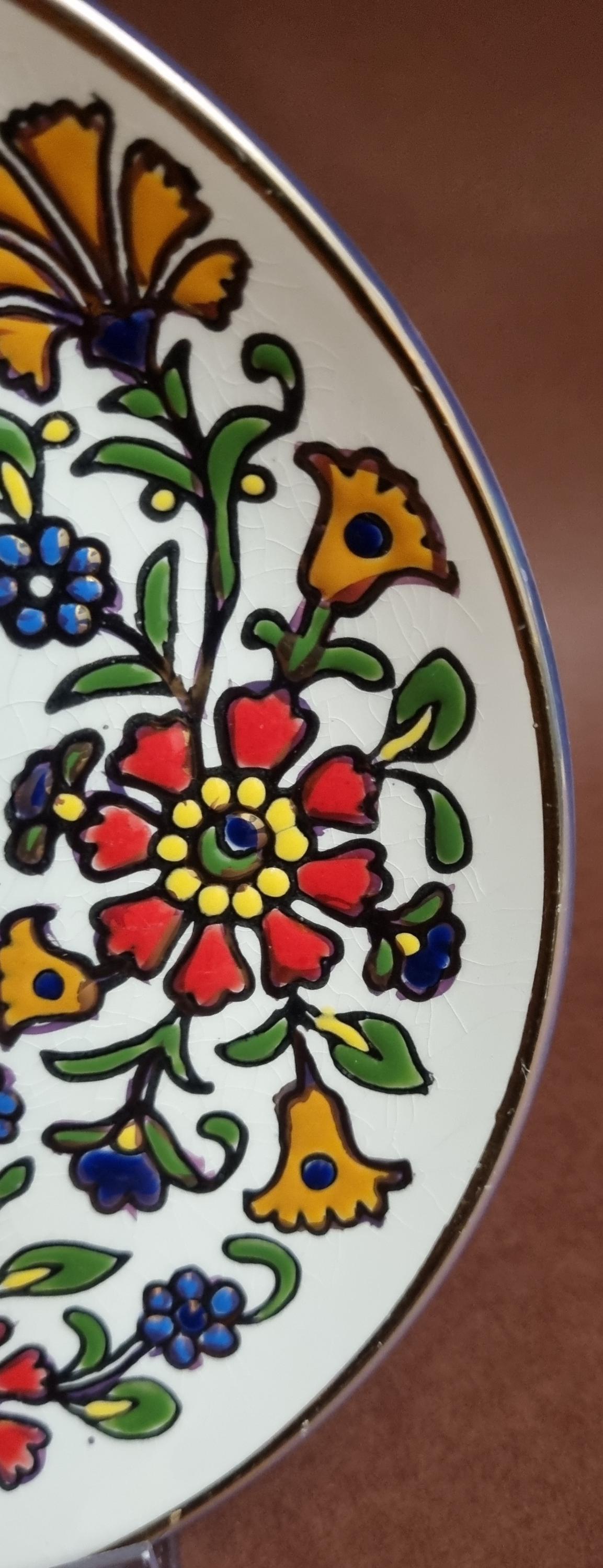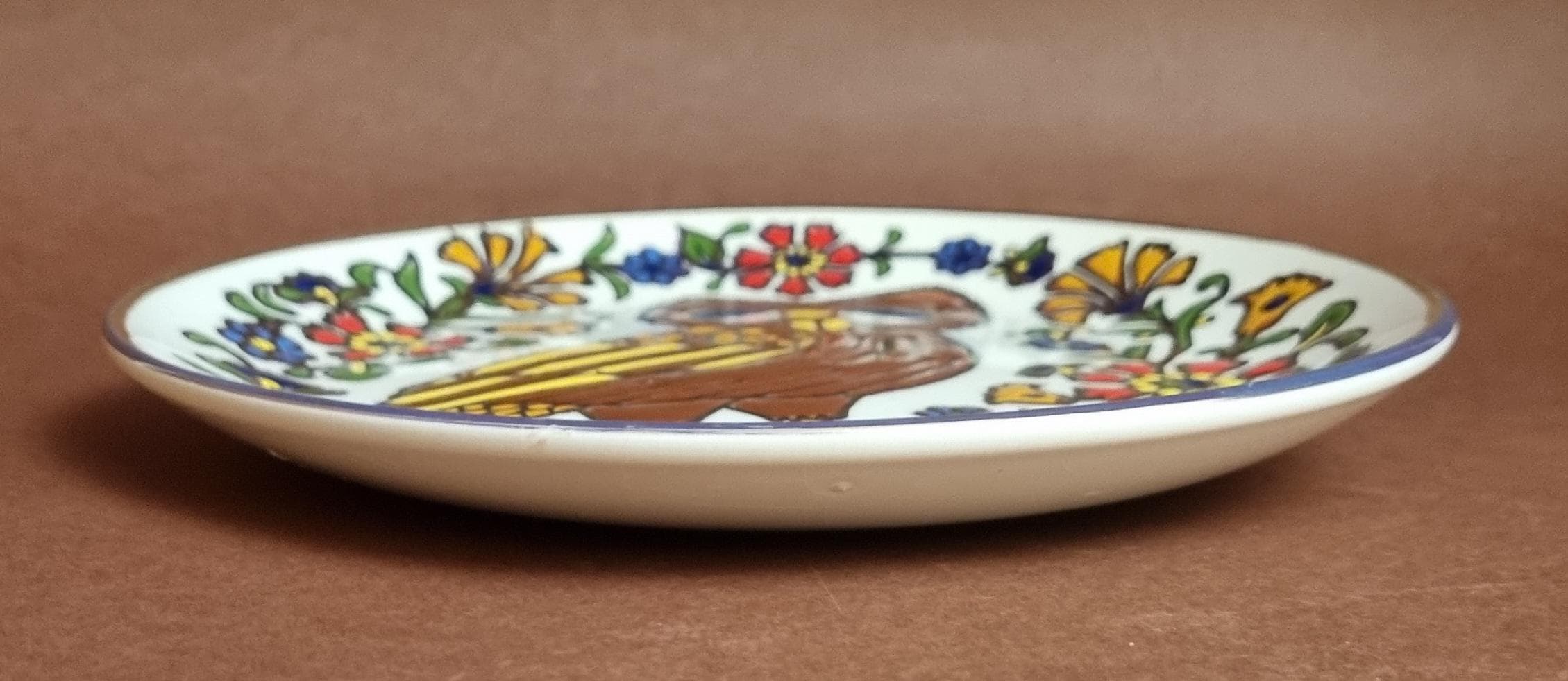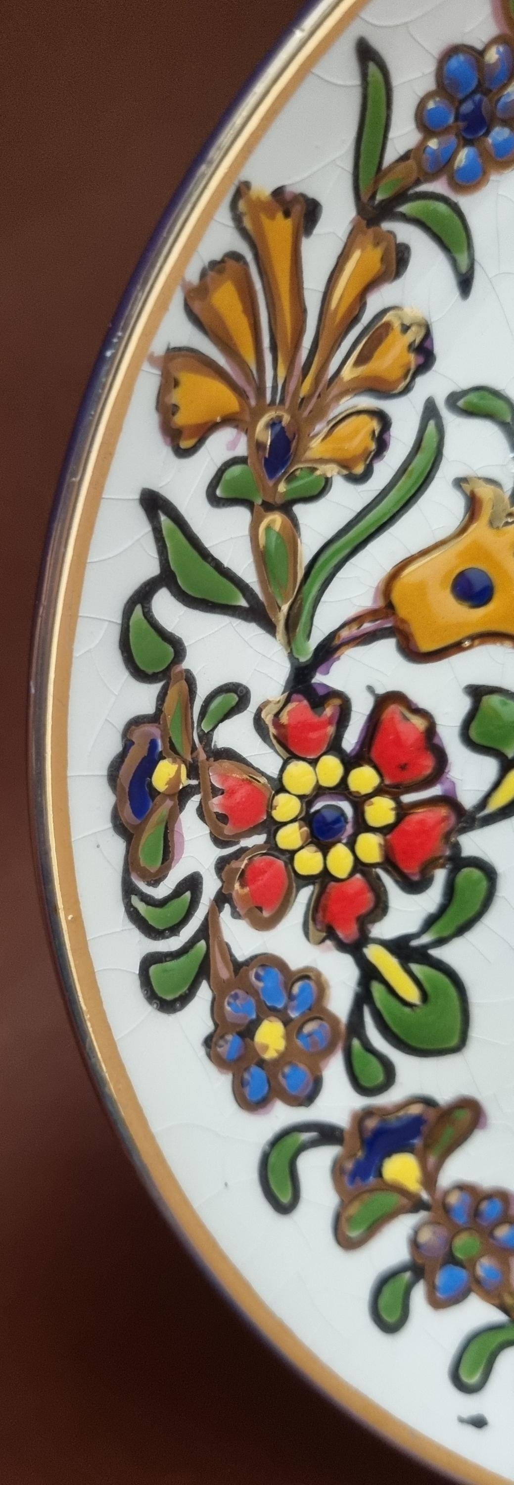The plate originates from Rhodes, Greece and is hand-painted in vibrant red, blue green & yellow floral motif and a charming owl painted in brown, yellow and blue. Also has gold painted rims and outlines.