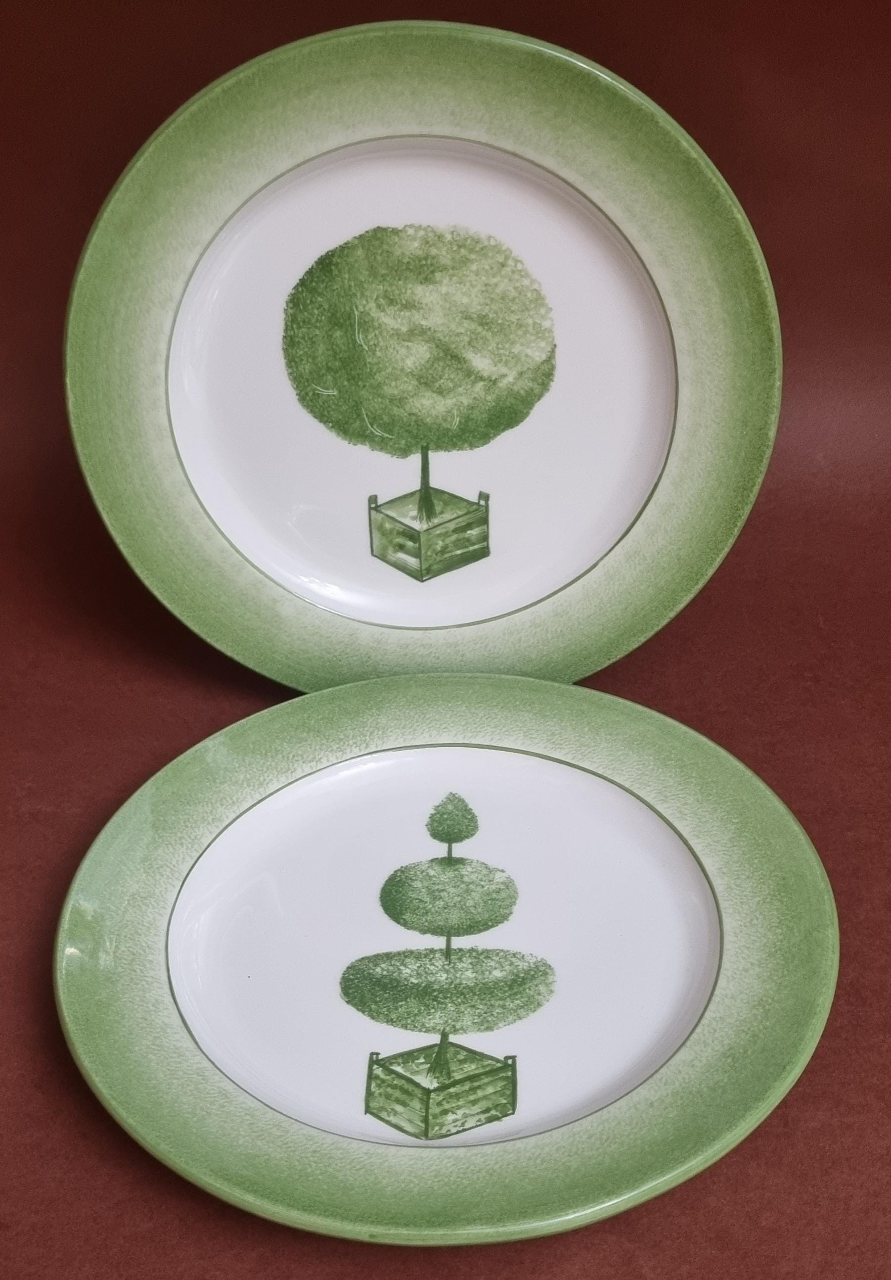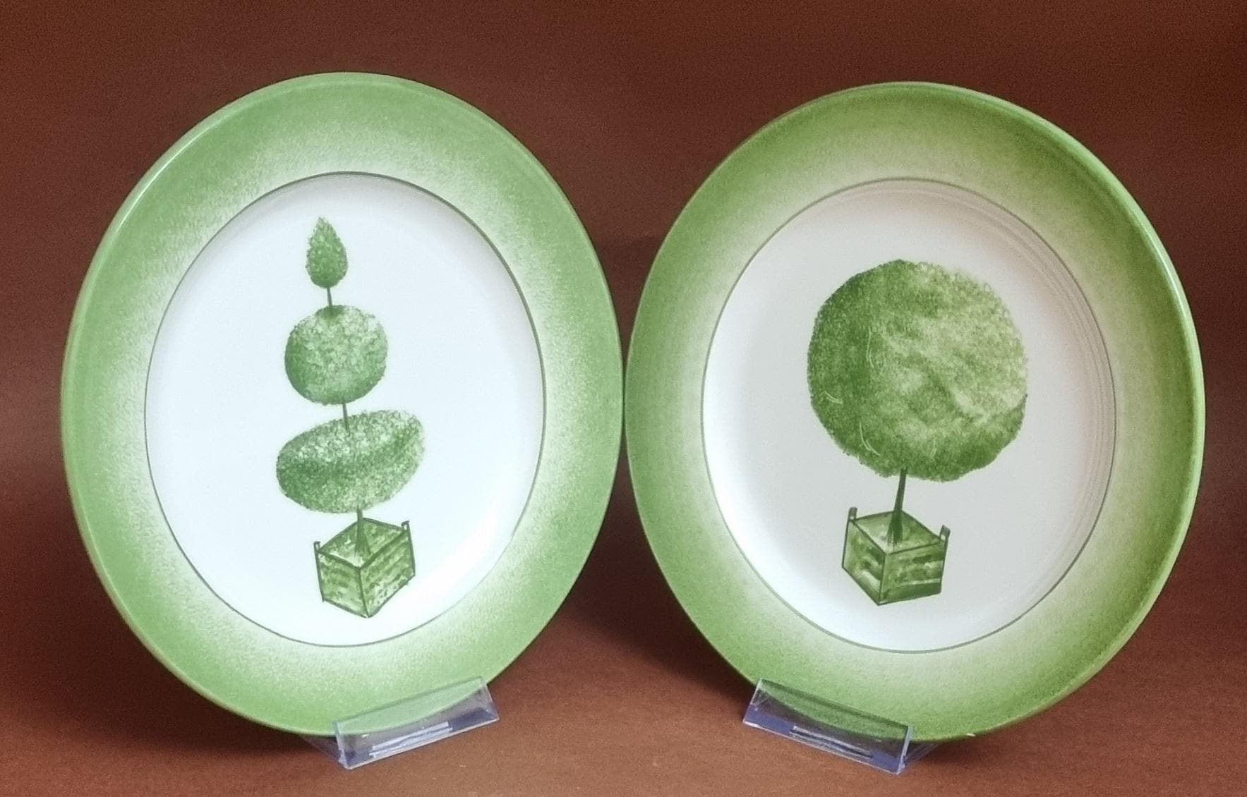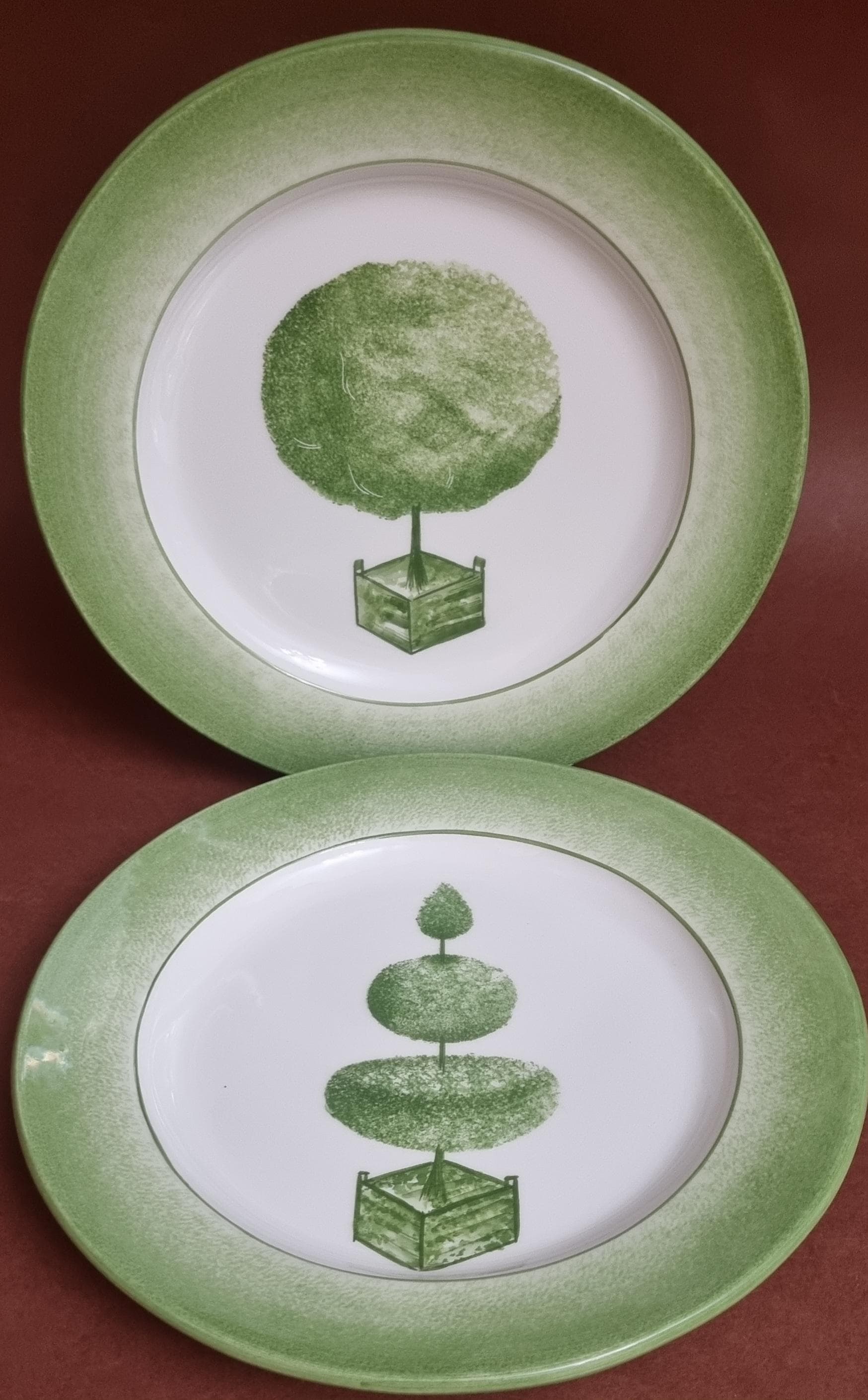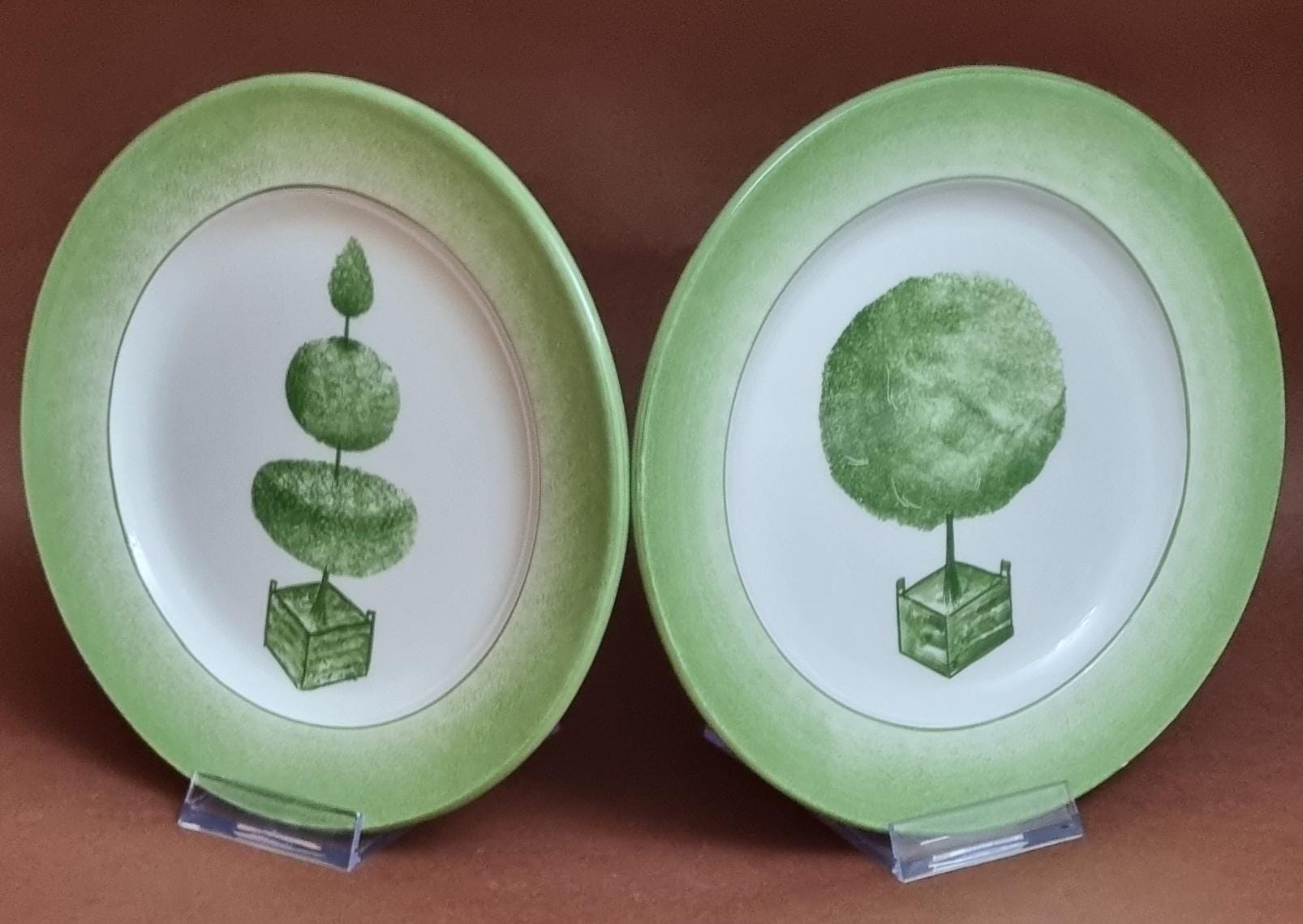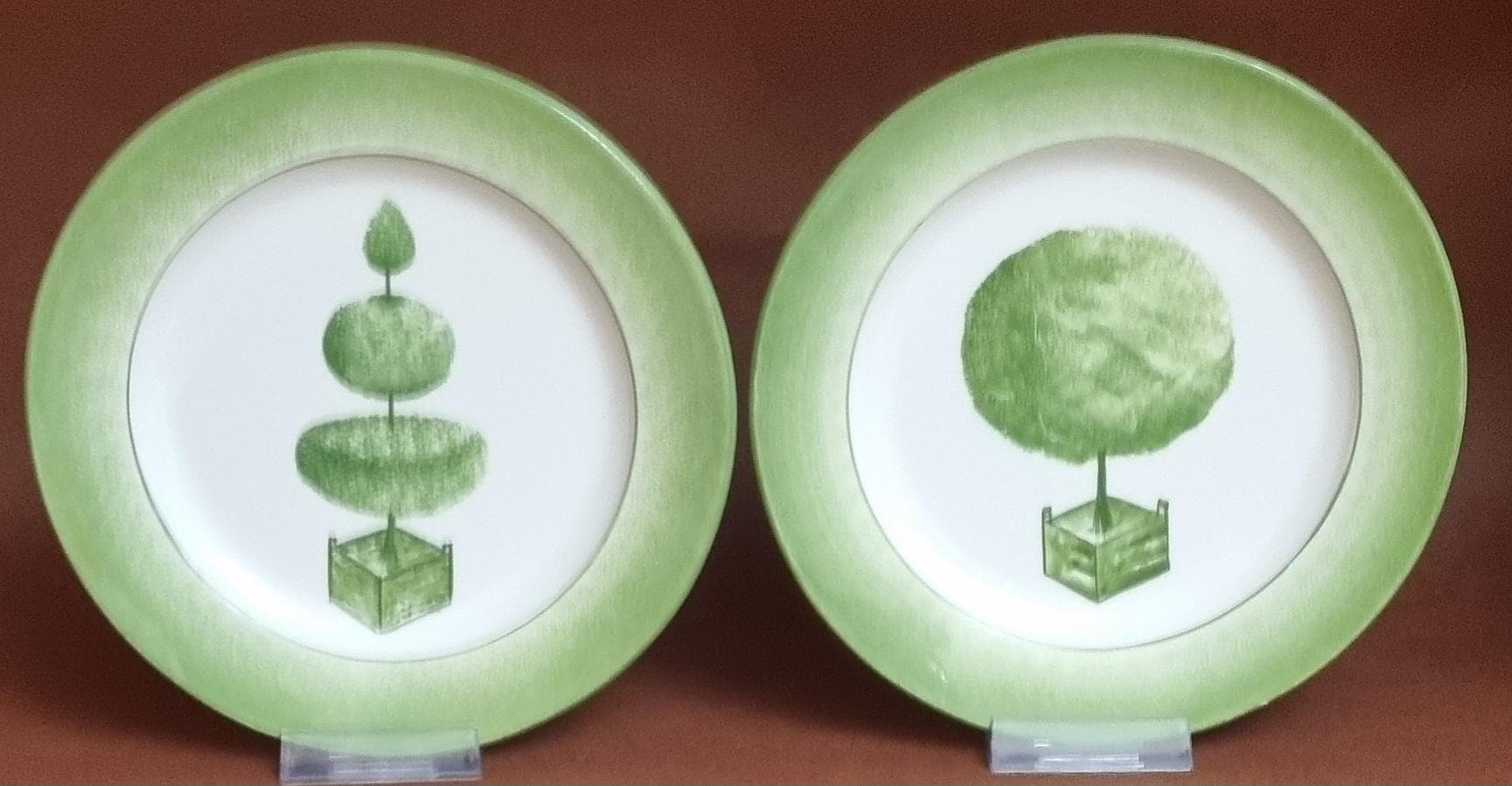 The topiary on the left plate has a three-tiered, sculpted shape, while the right plate features a rounder tree shape.