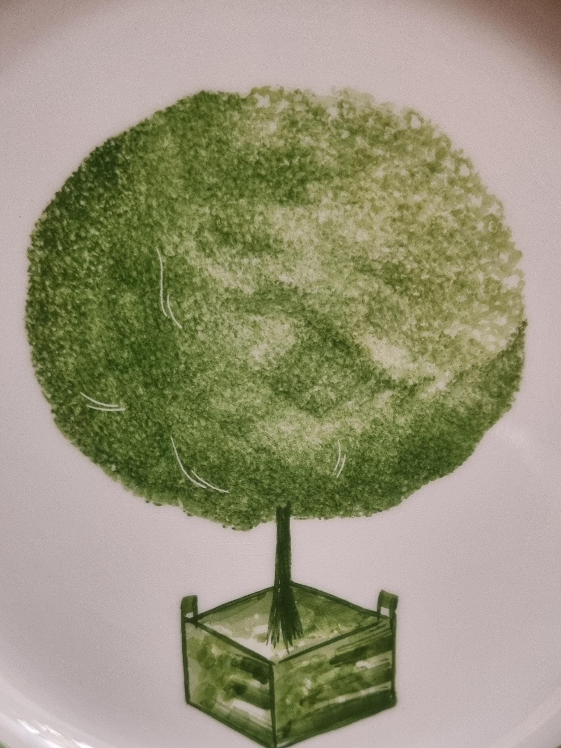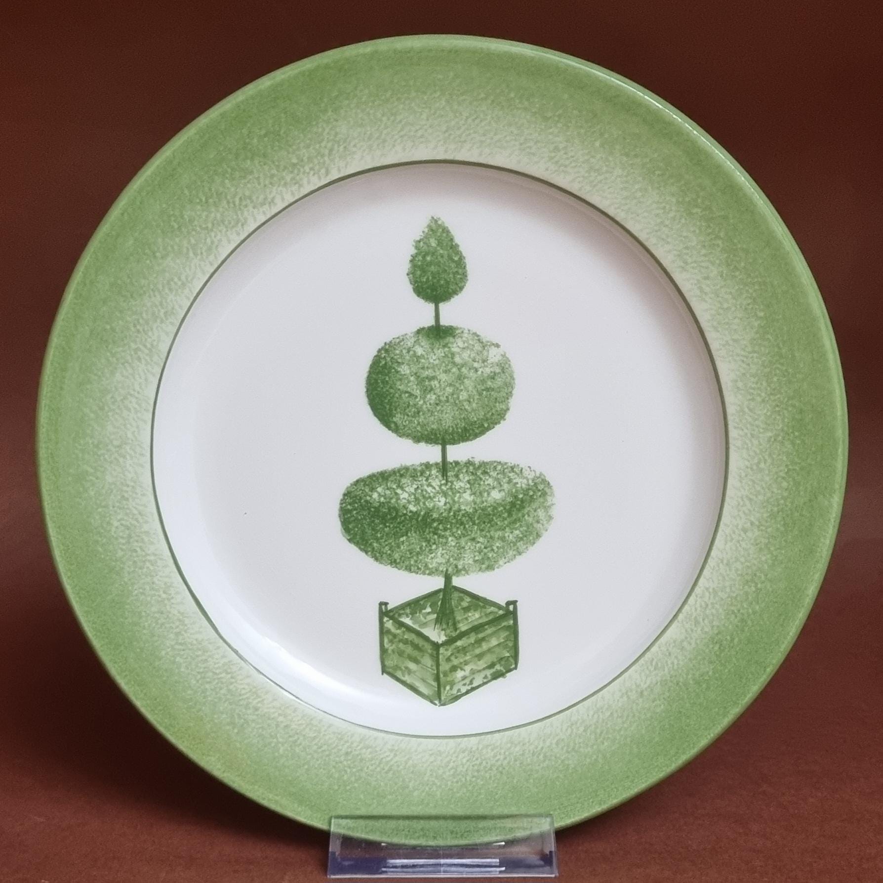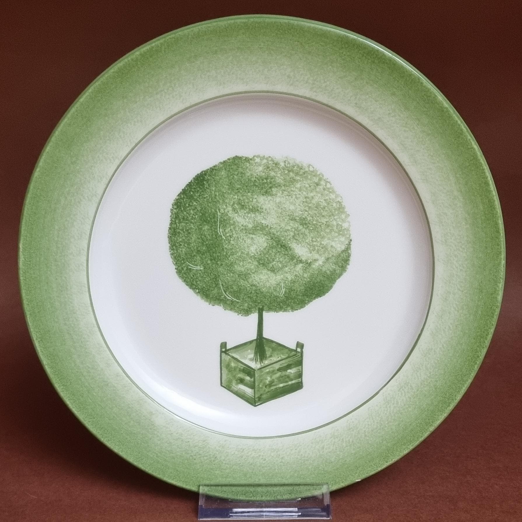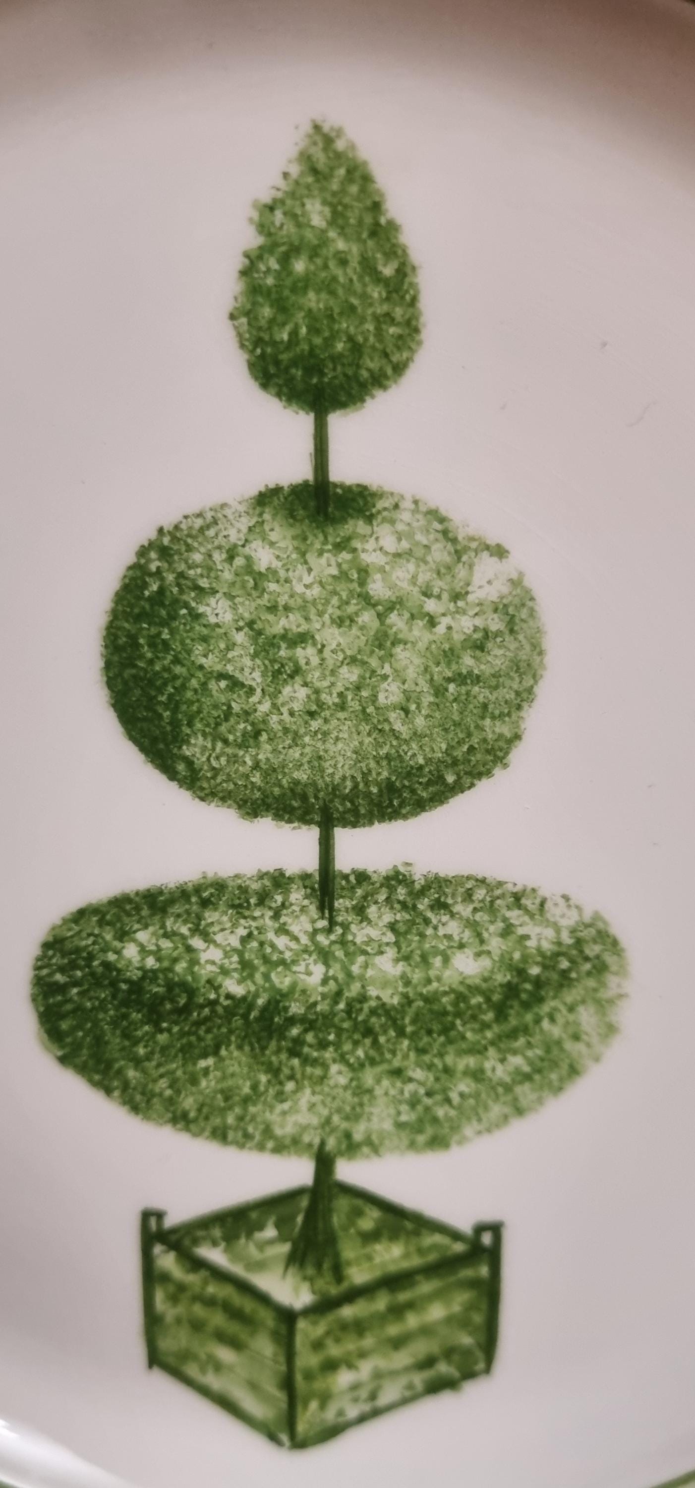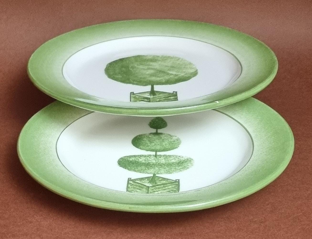 The topiary on the left plate has a three-tiered, sculpted shape, while the right plate features a rounder tree shape.