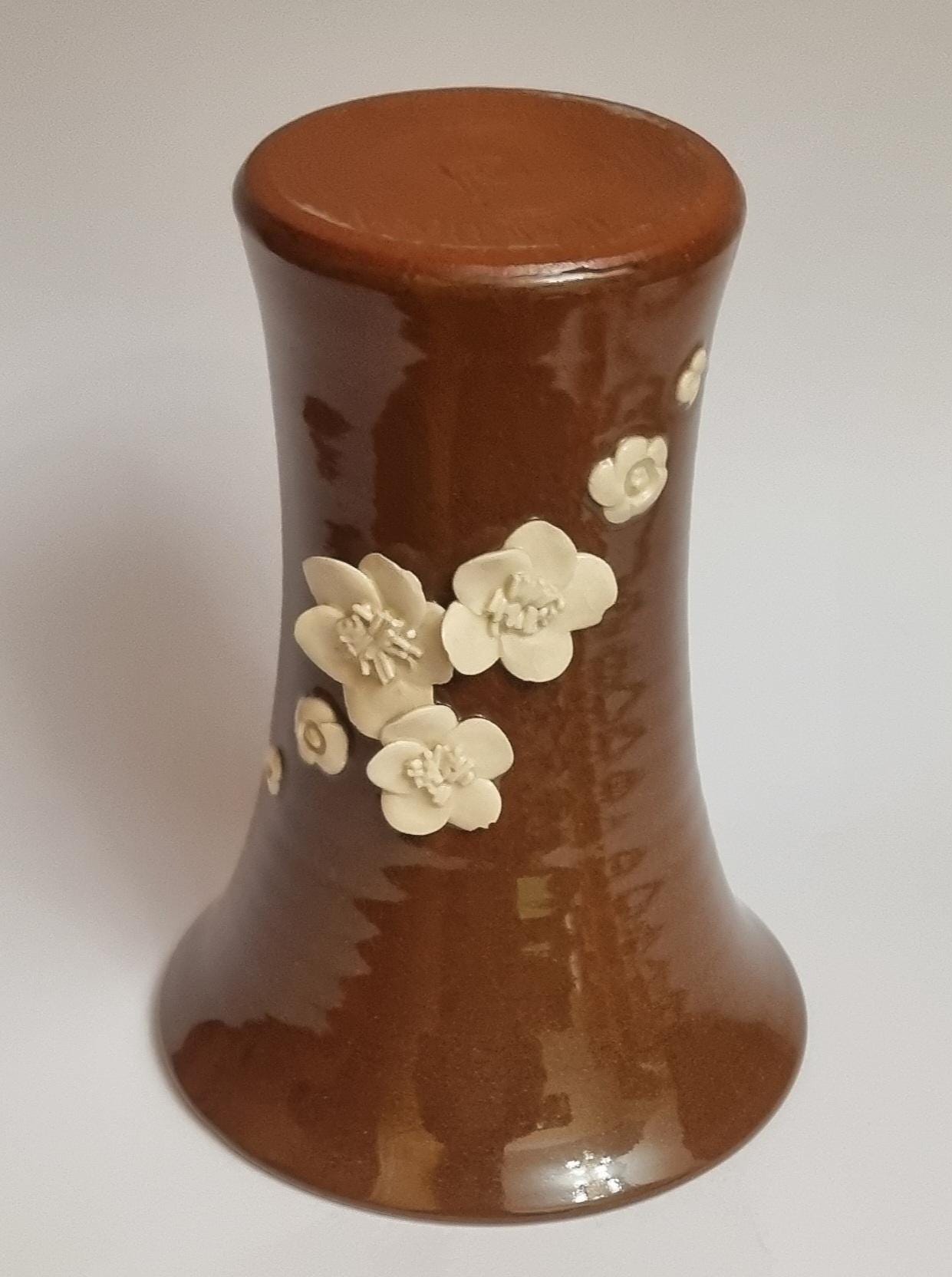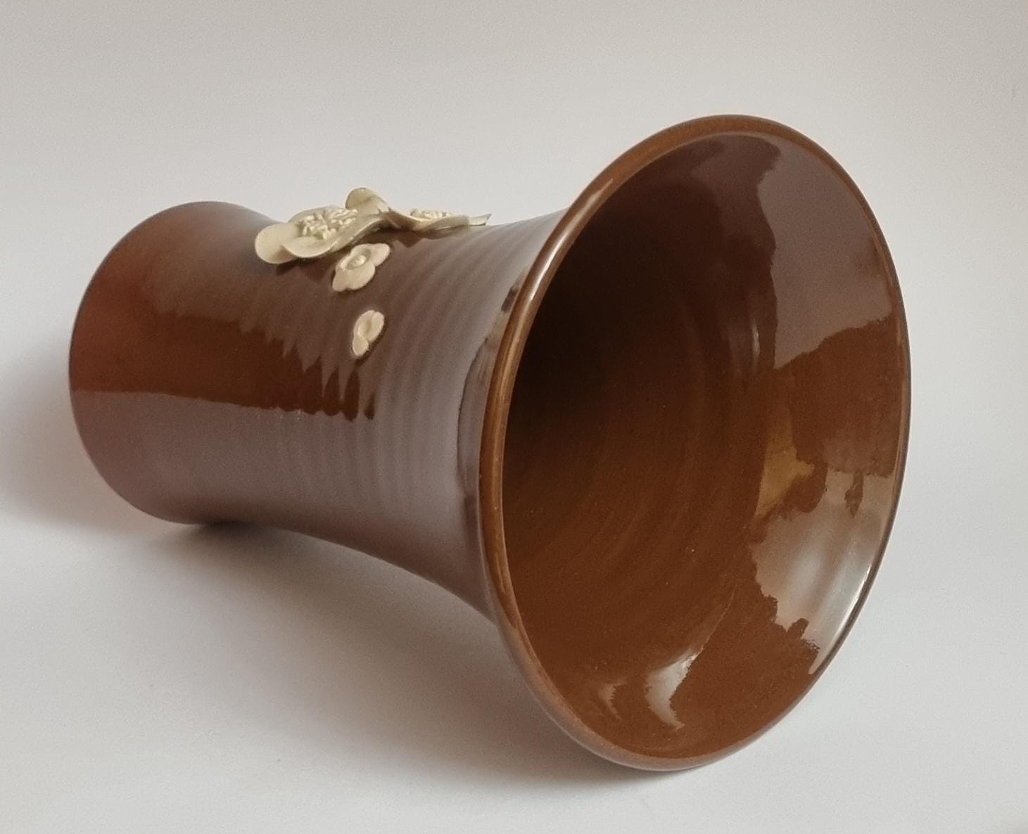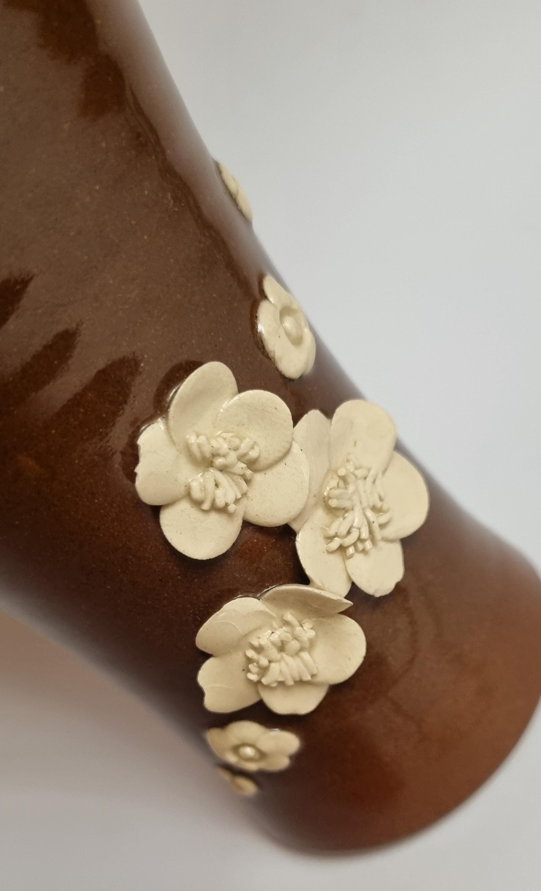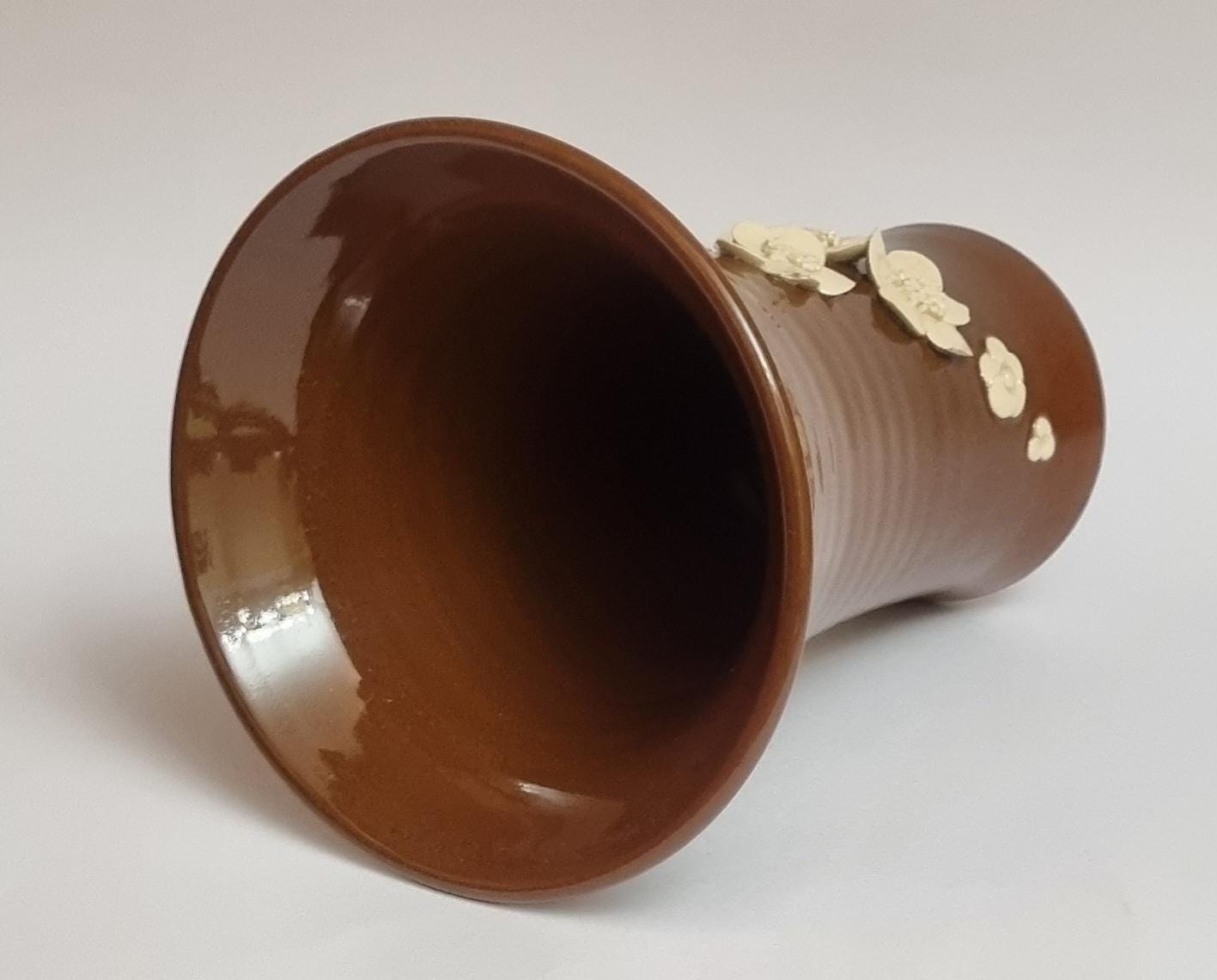 A wonderful rare vase from Holkham Pottery, Norfolk. Brown Glazed with charming cream ceramic flowers attached.