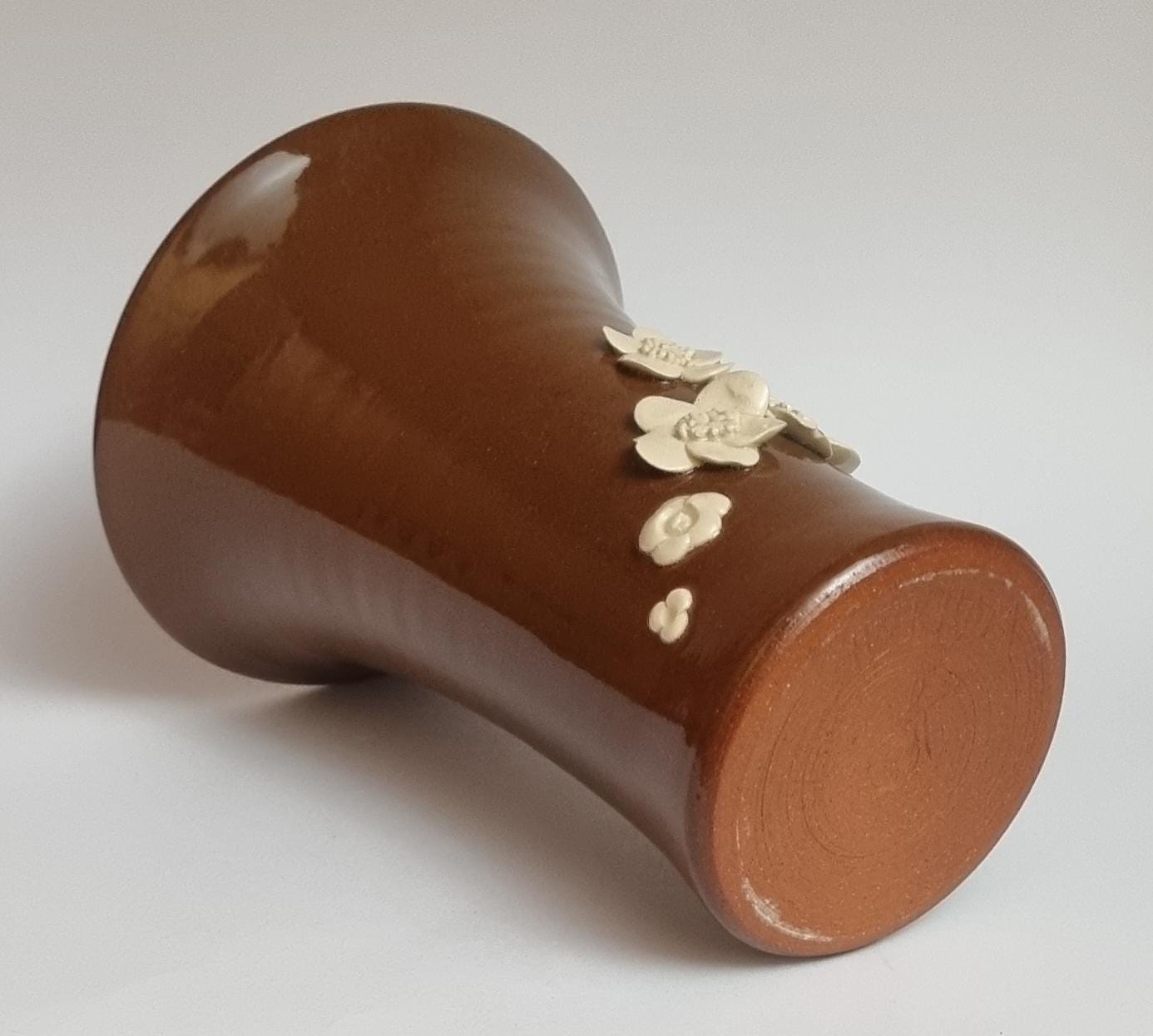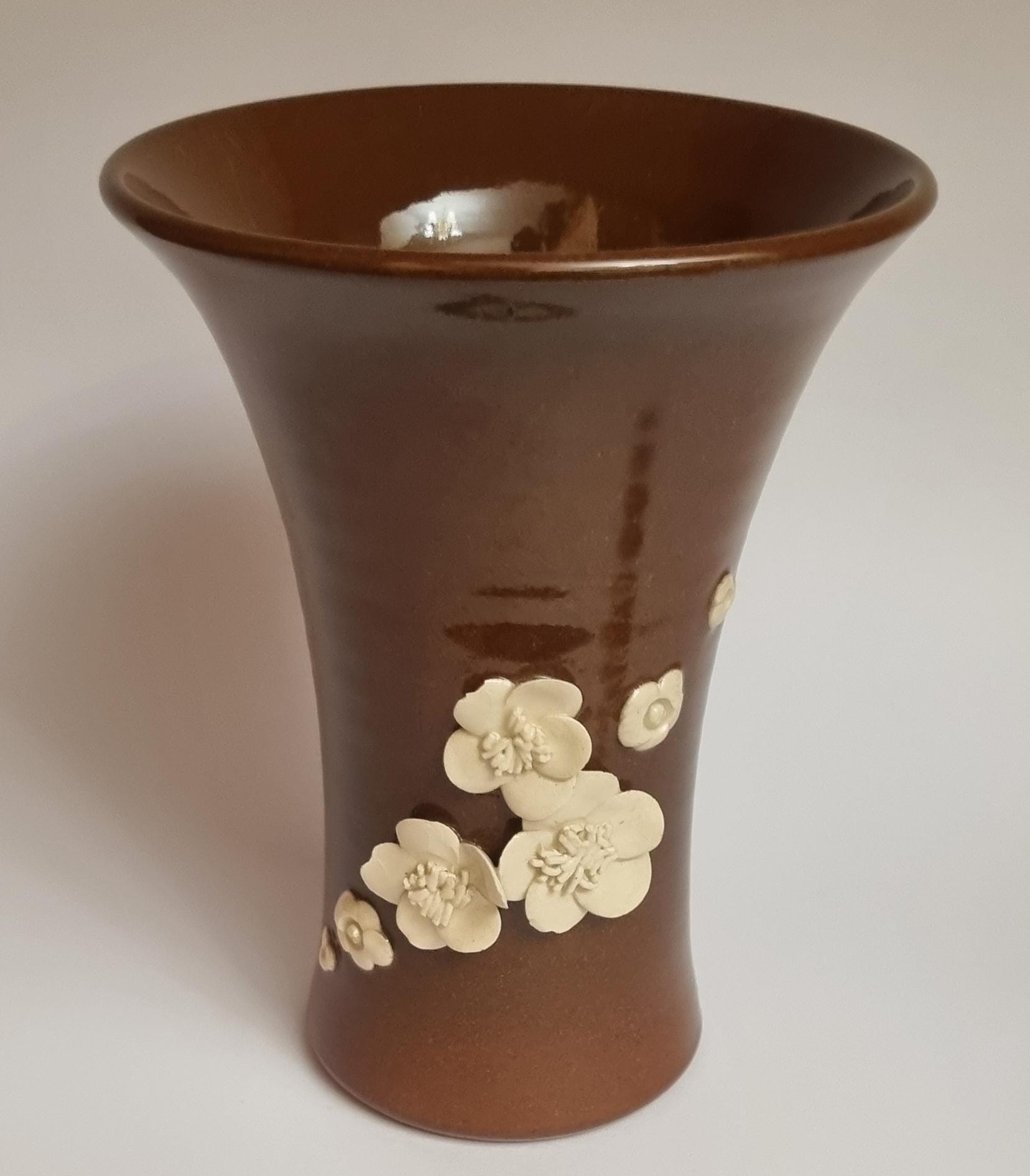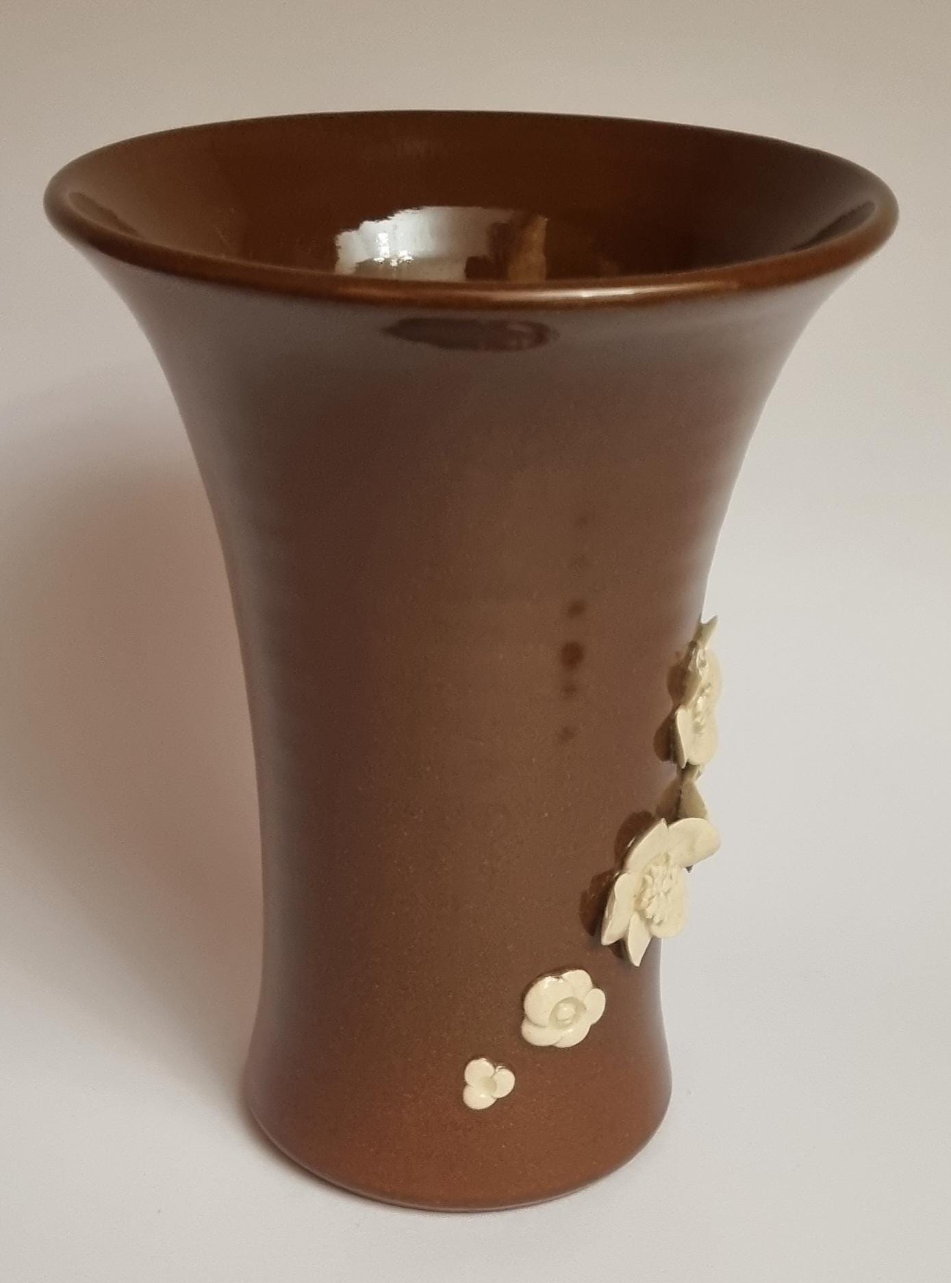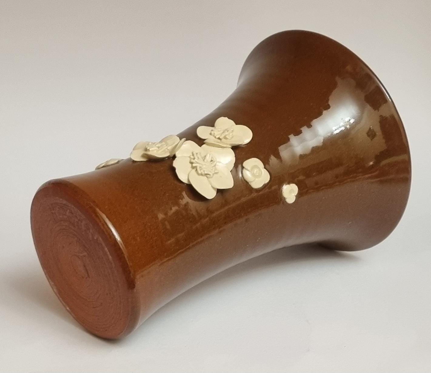 A wonderful rare vase from Holkham Pottery, Norfolk. Brown Glazed with charming cream ceramic flowers attached.