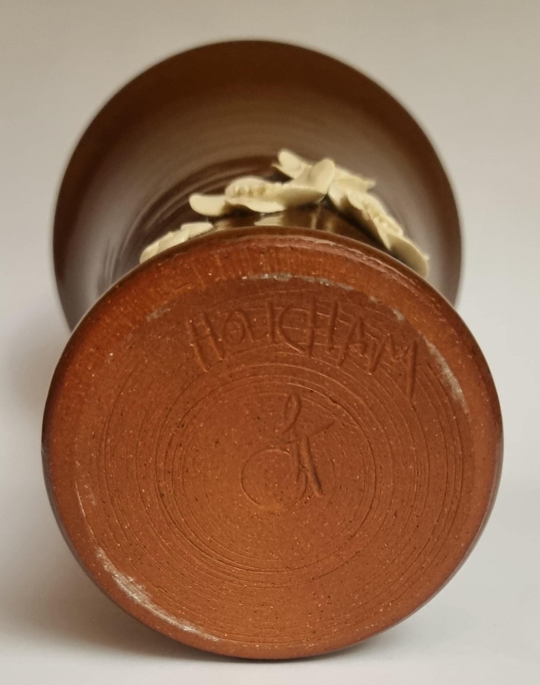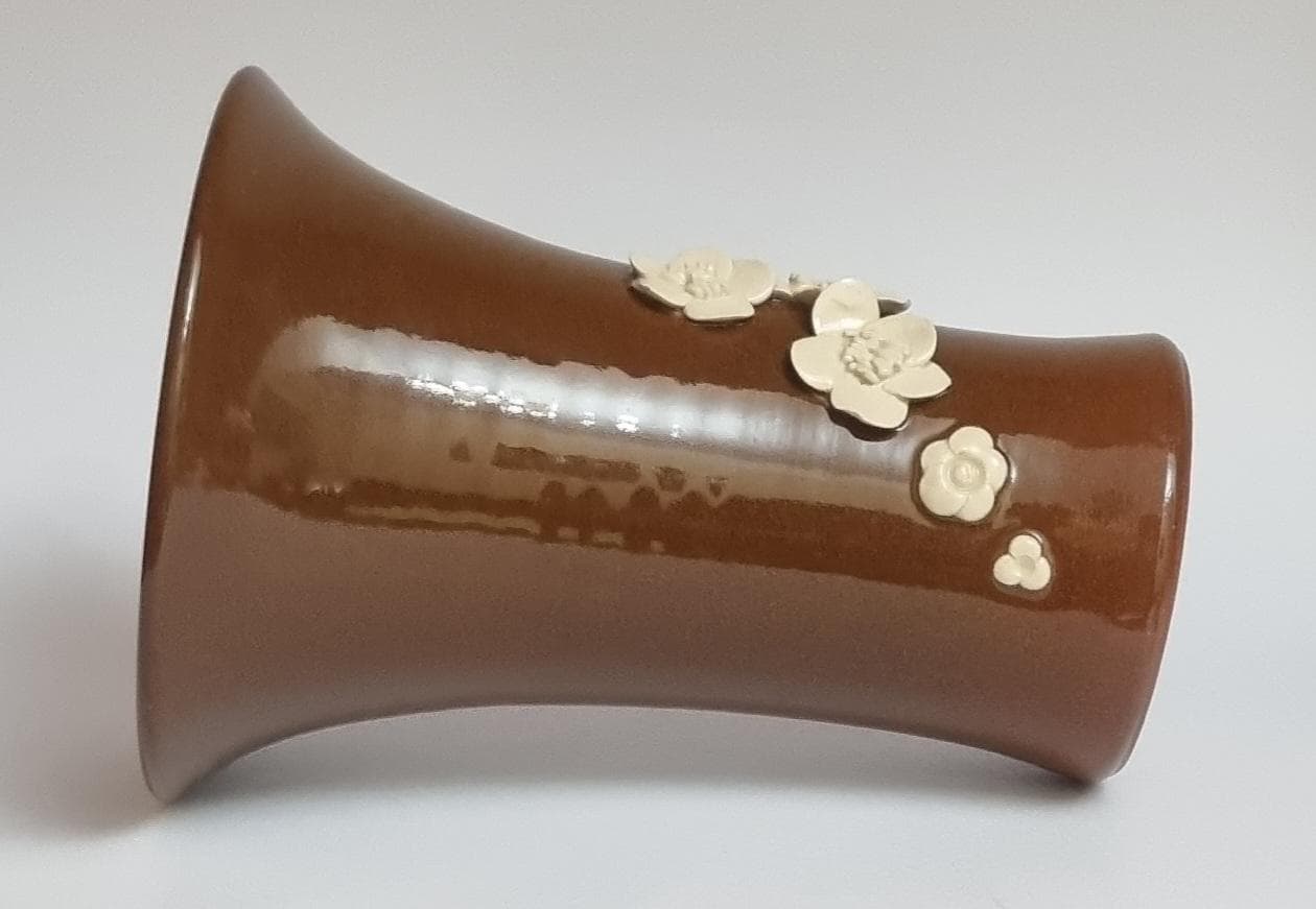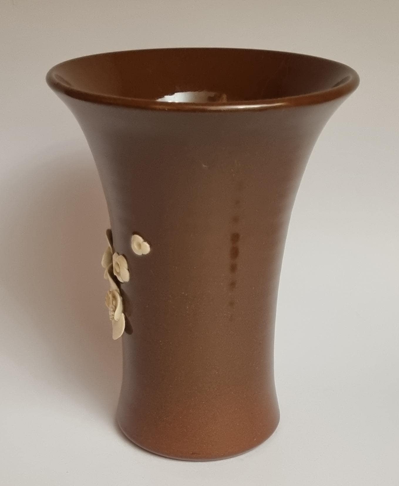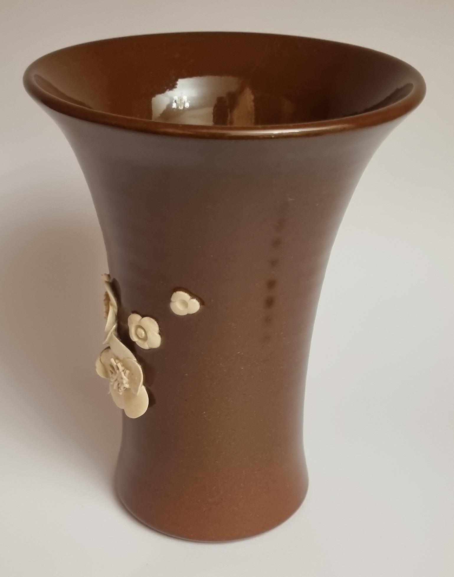 A wonderful rare vase from Holkham Pottery, Norfolk. Brown Glazed with charming cream ceramic flowers attached.