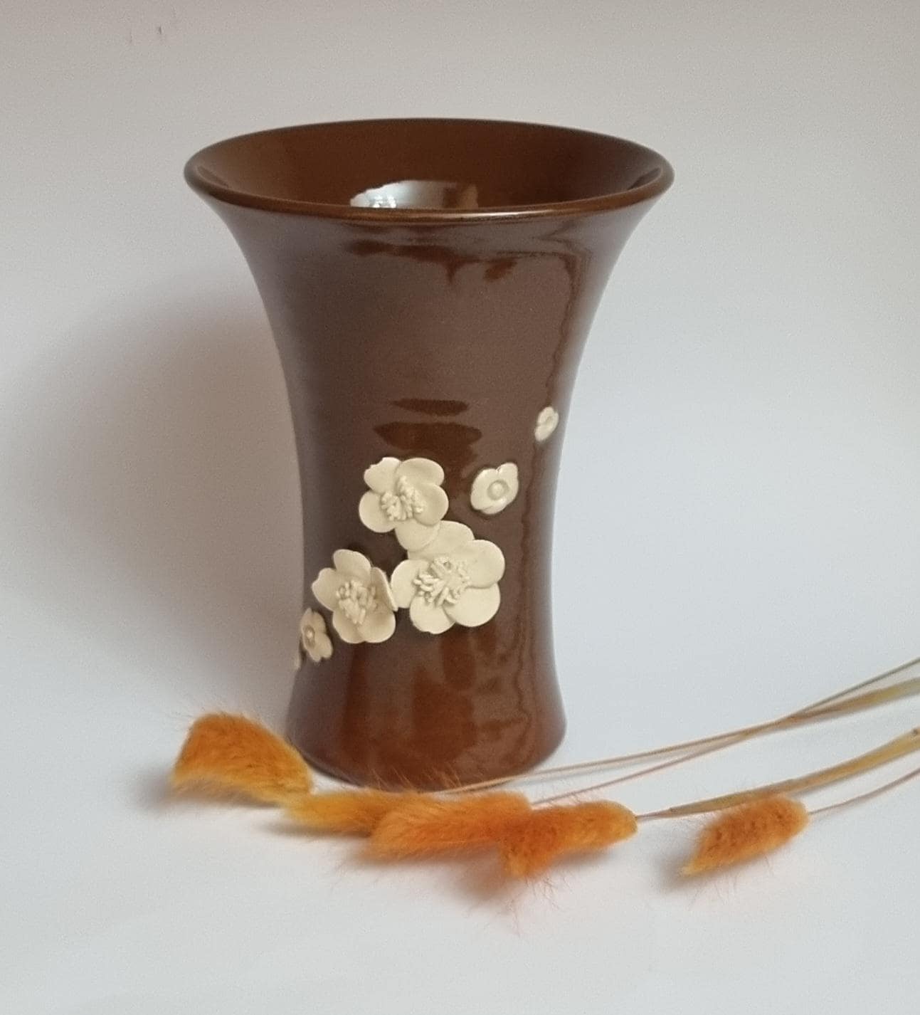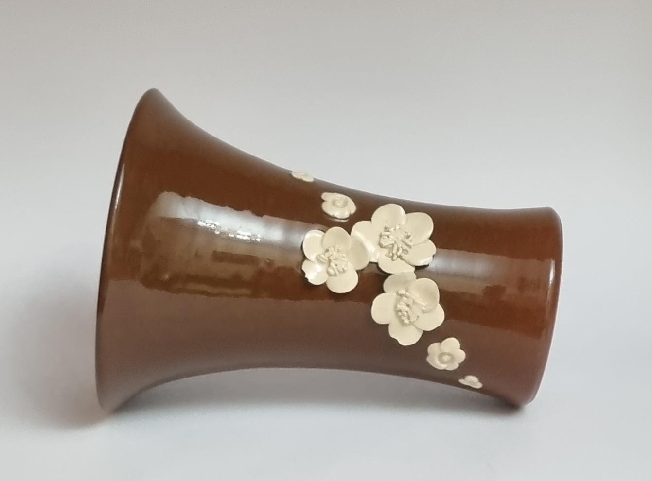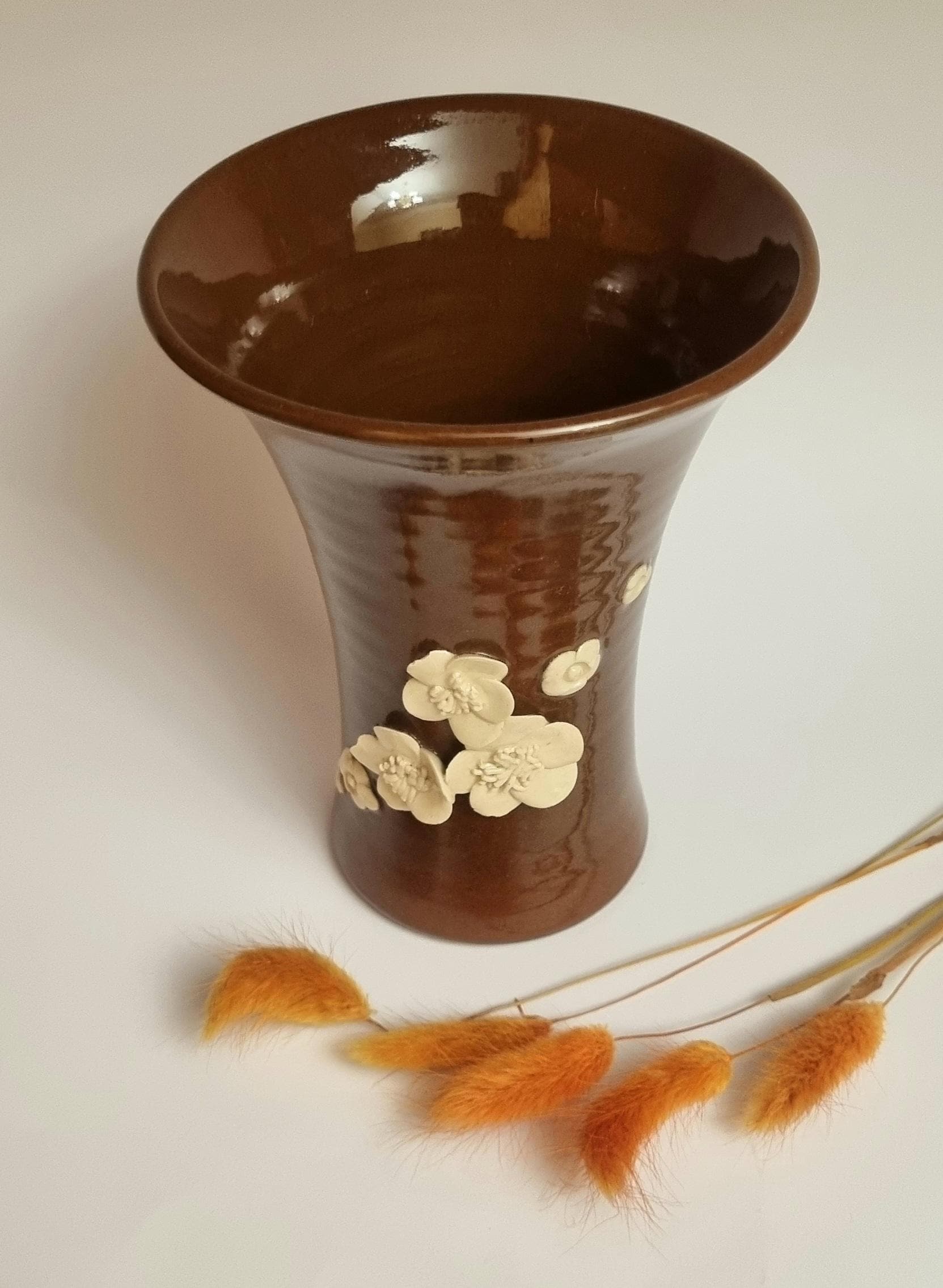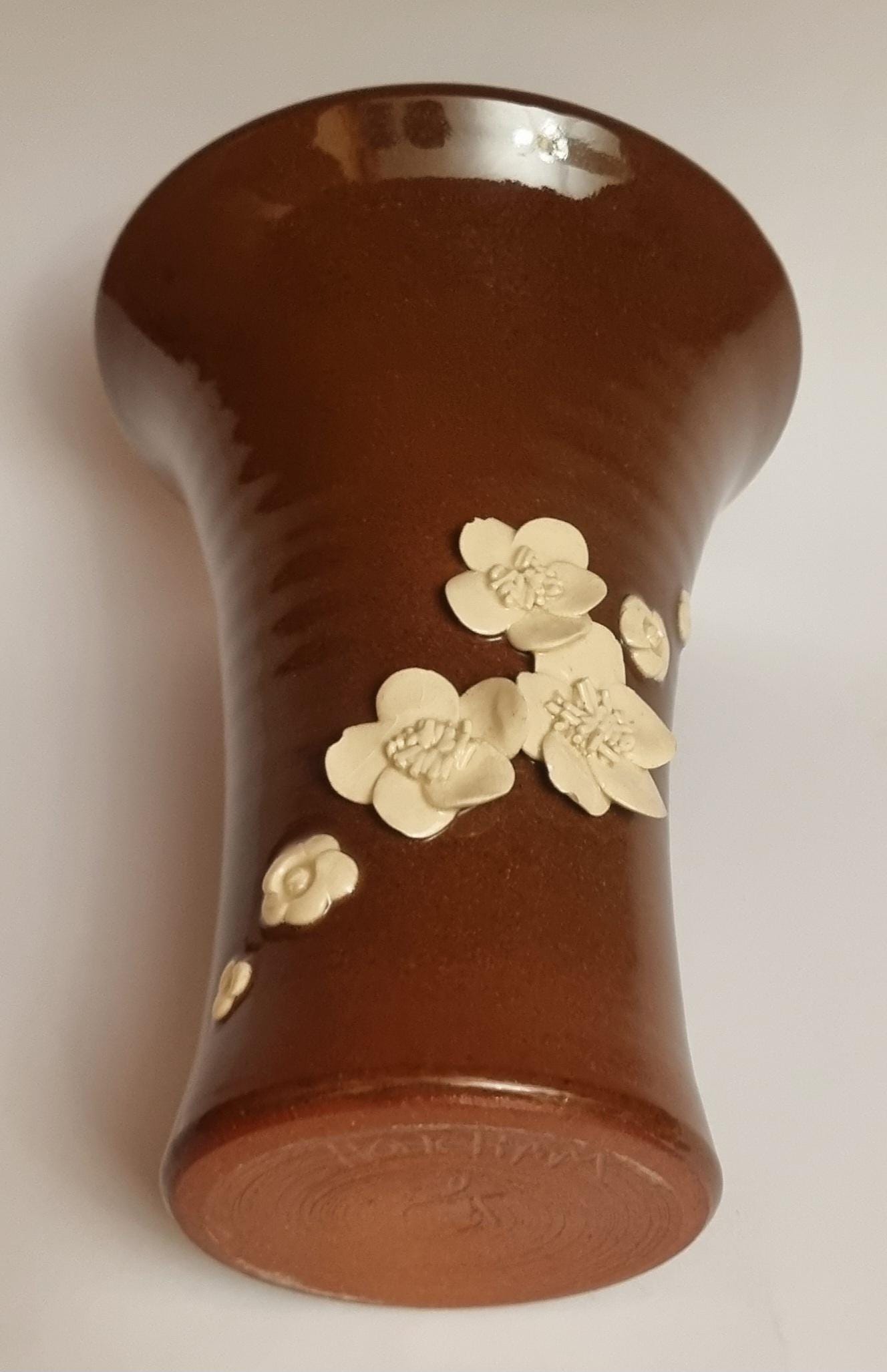 A wonderful rare vase from Holkham Pottery, Norfolk. Brown Glazed with charming cream ceramic flowers attached.