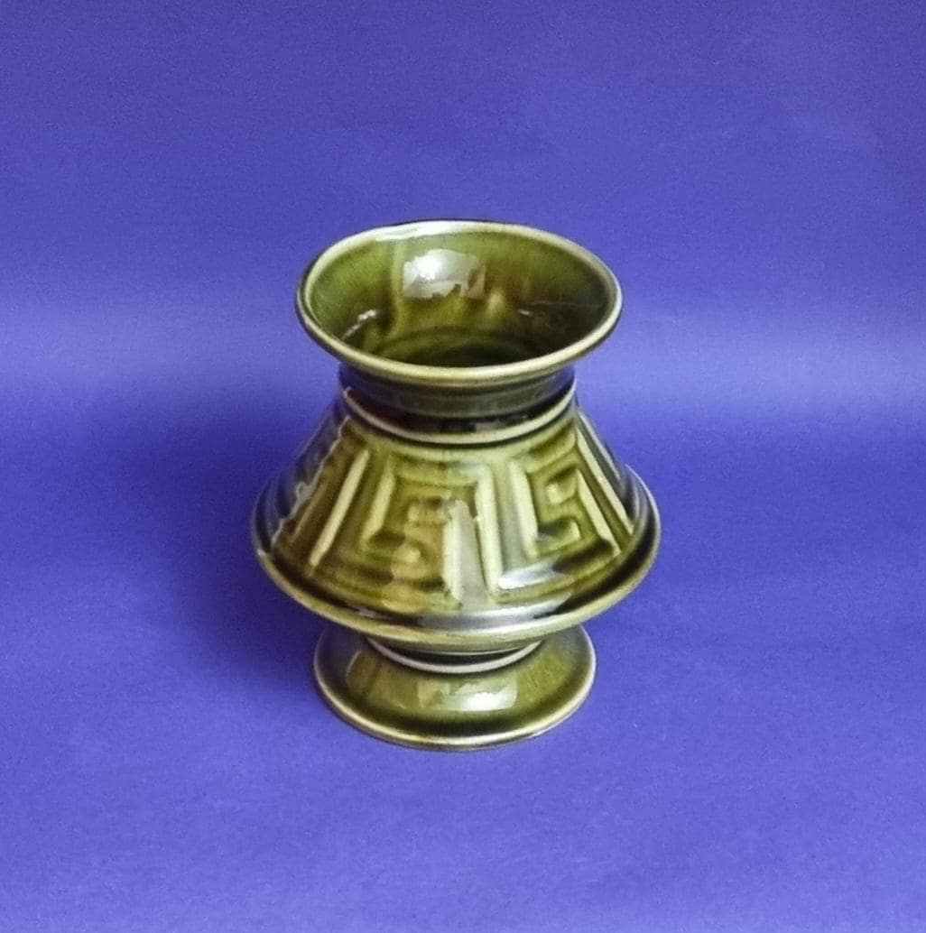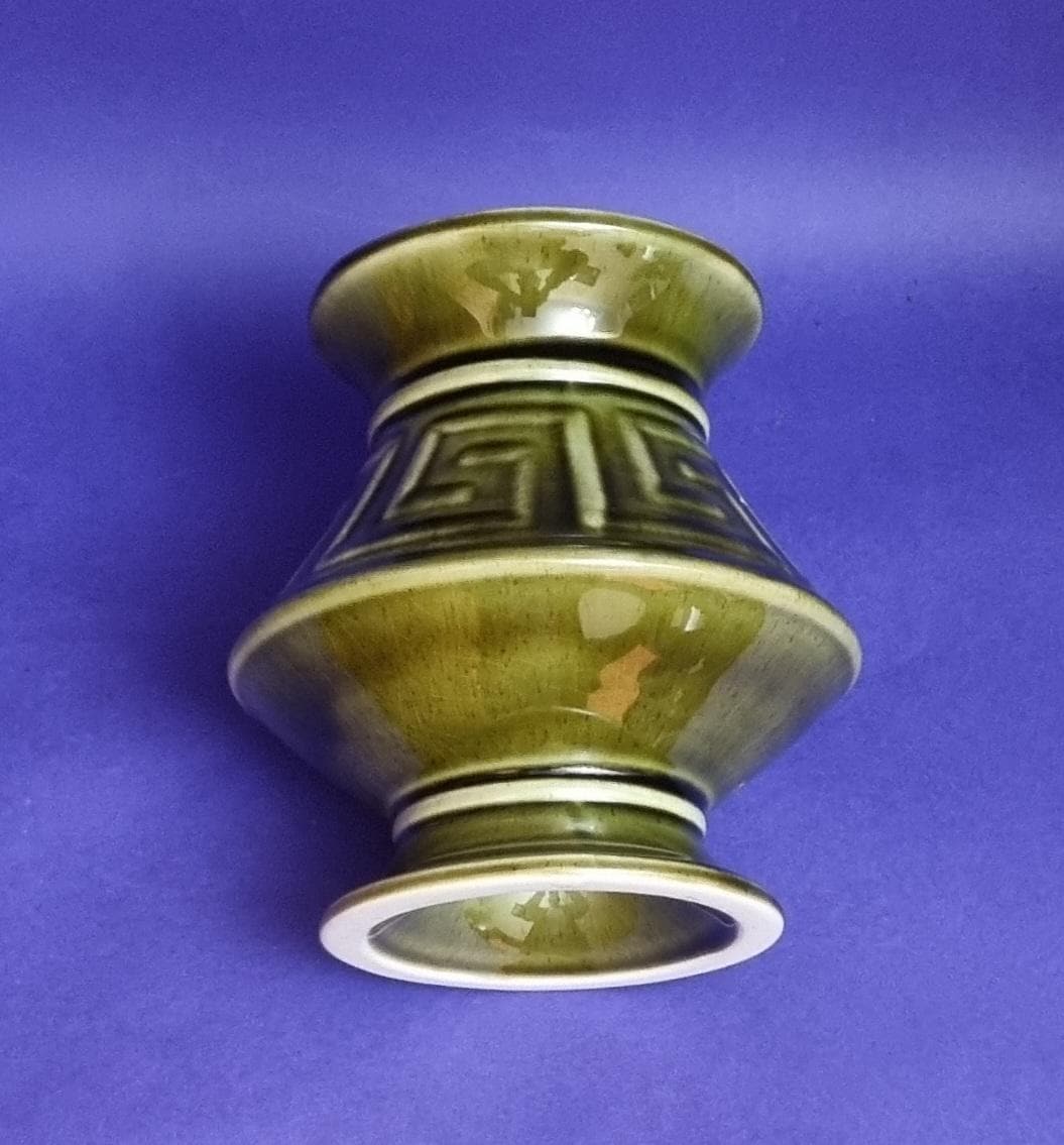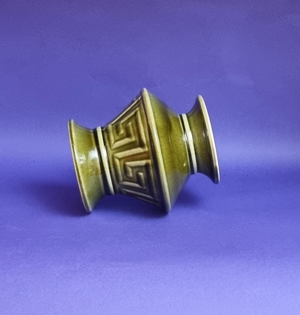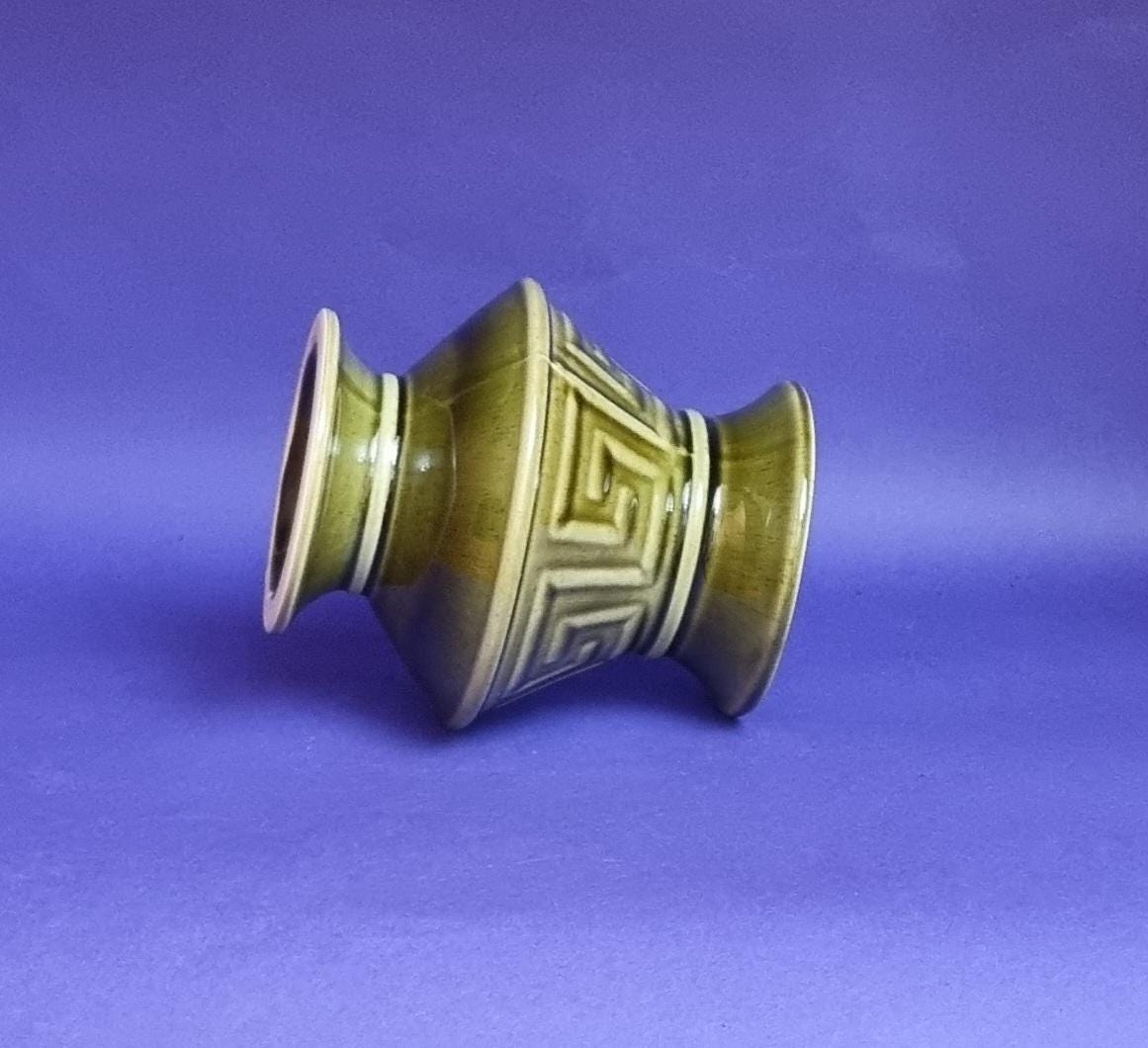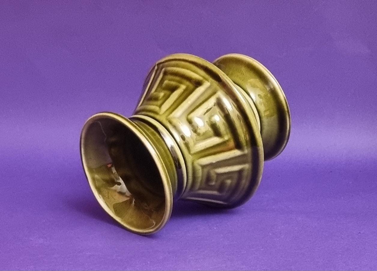 A beautiful high glossy glazed olive green vase by Holkham Pottery, Norfolk. This specific design is modelled on a traditional Greek urn, featuring a prominent geometric Greek key or meander pattern around its body.