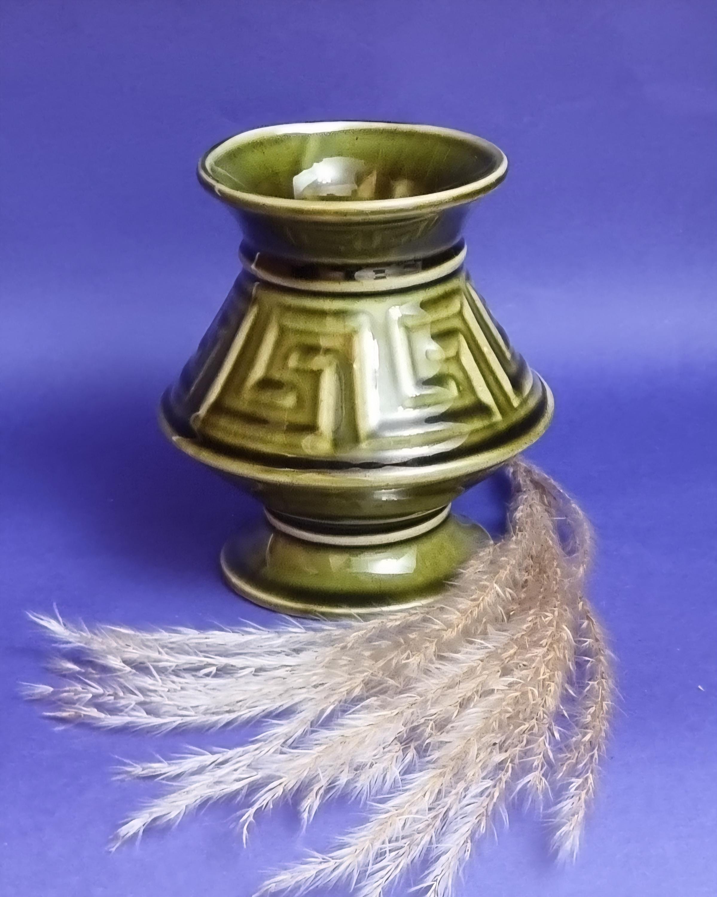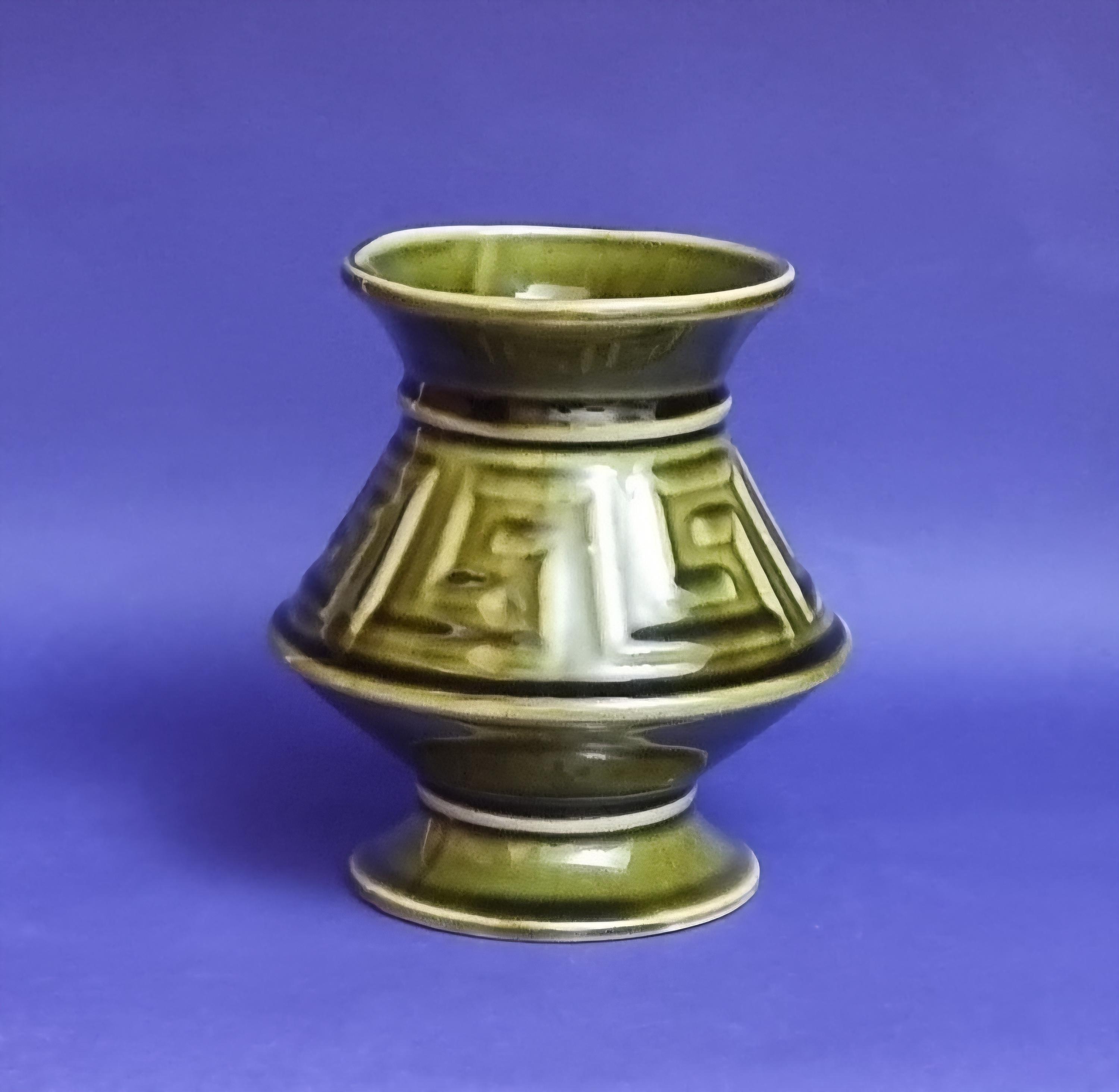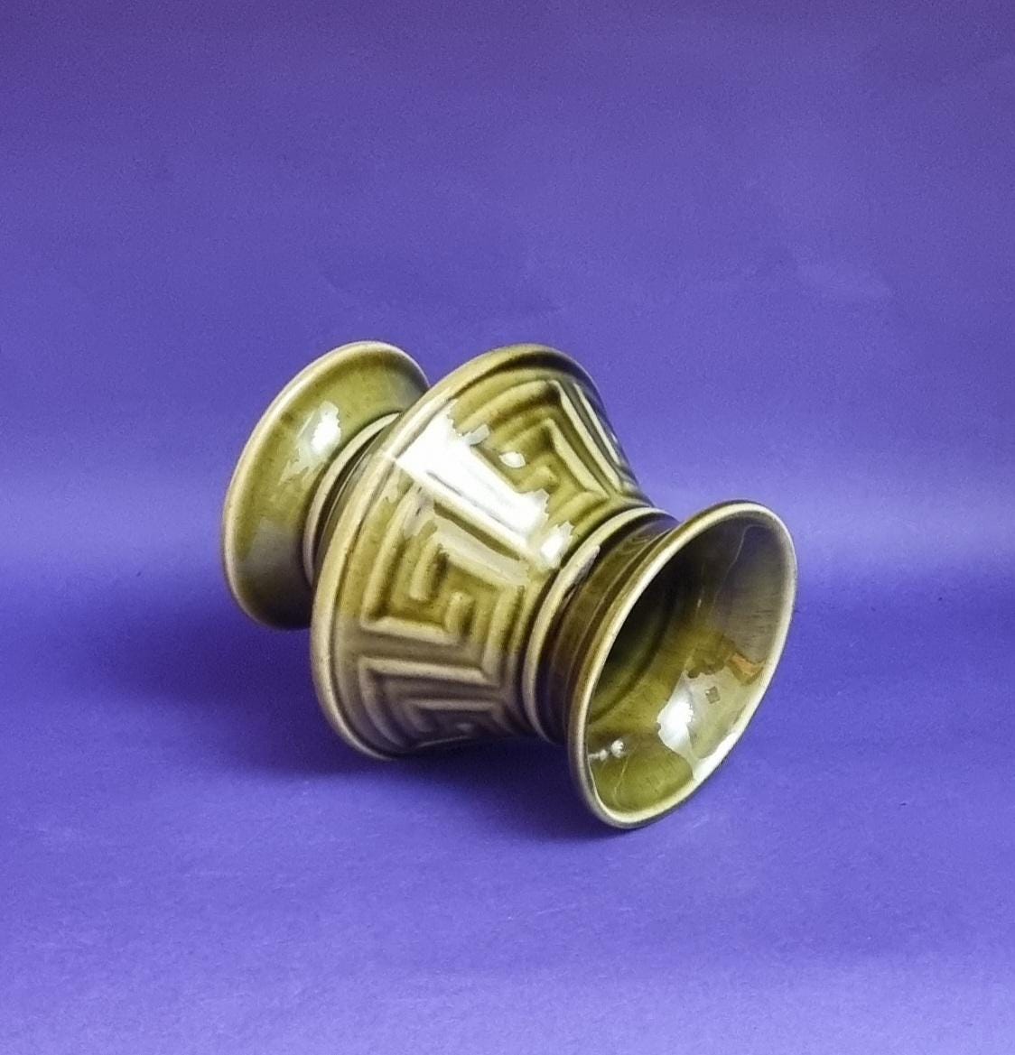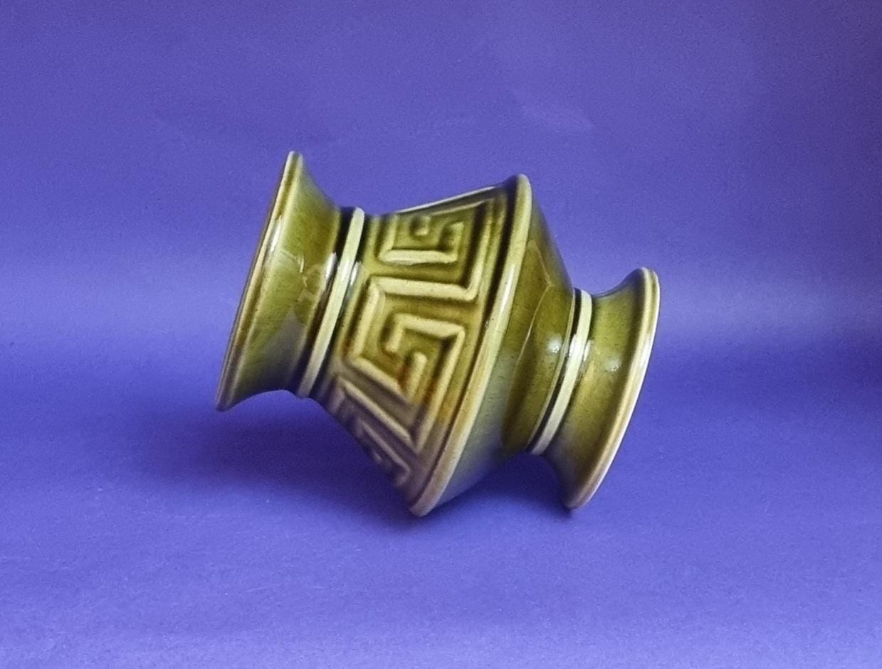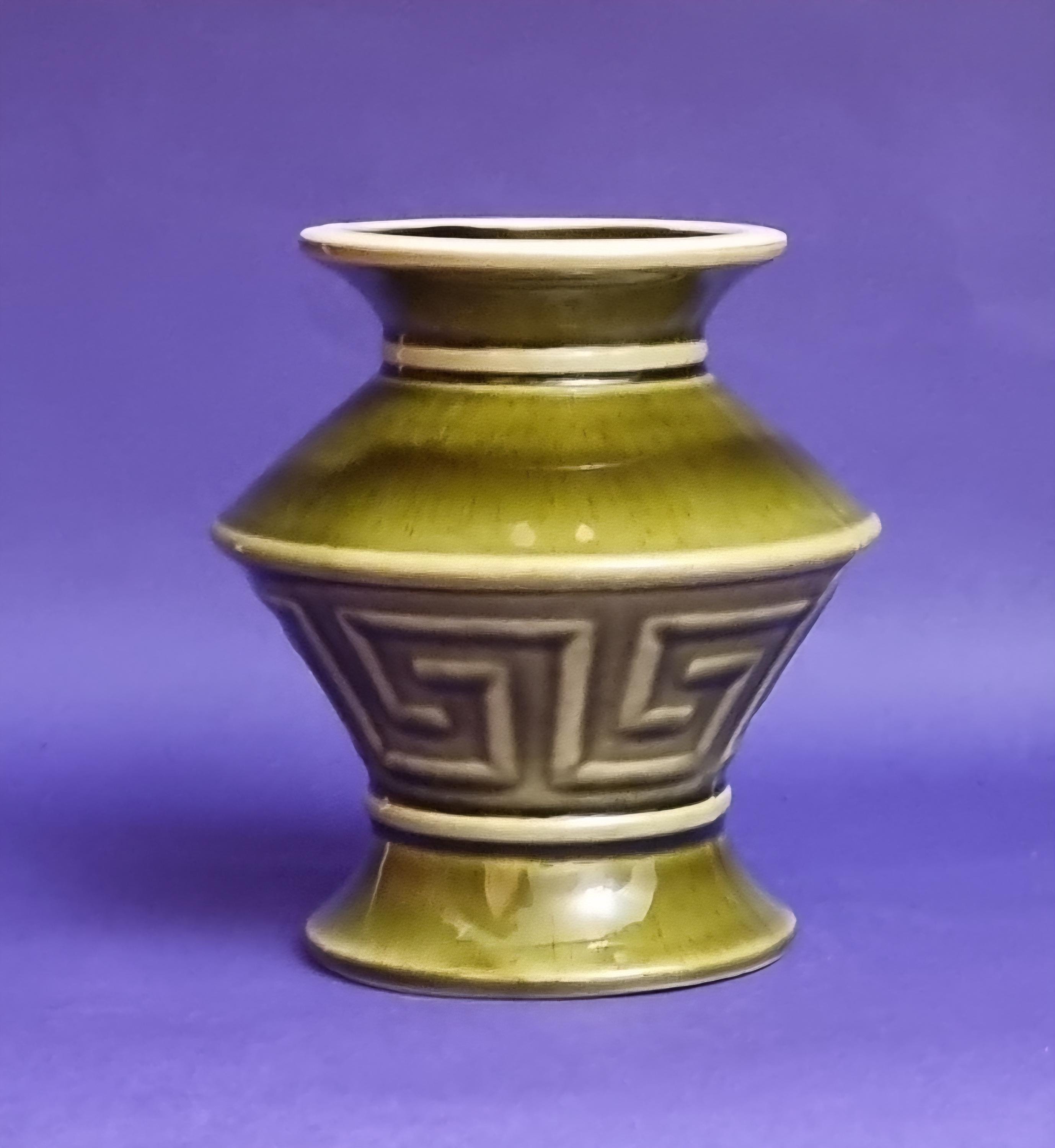 A beautiful high glossy glazed olive green vase by Holkham Pottery, Norfolk. This specific design is modelled on a traditional Greek urn, featuring a prominent geometric Greek key or meander pattern around its body.