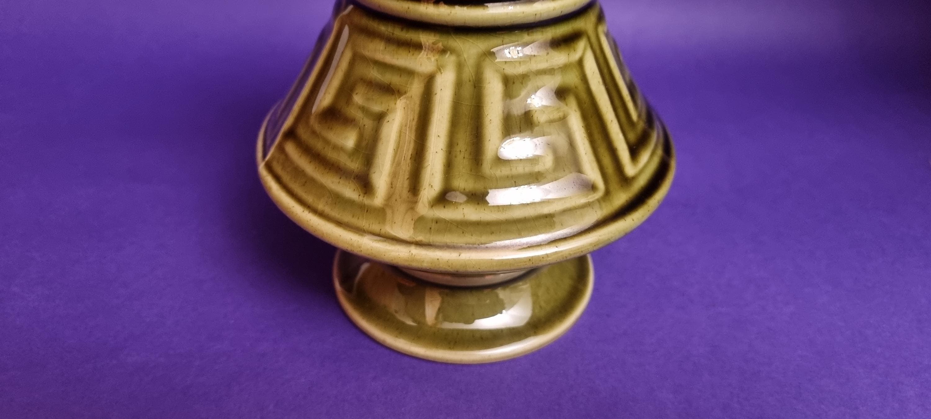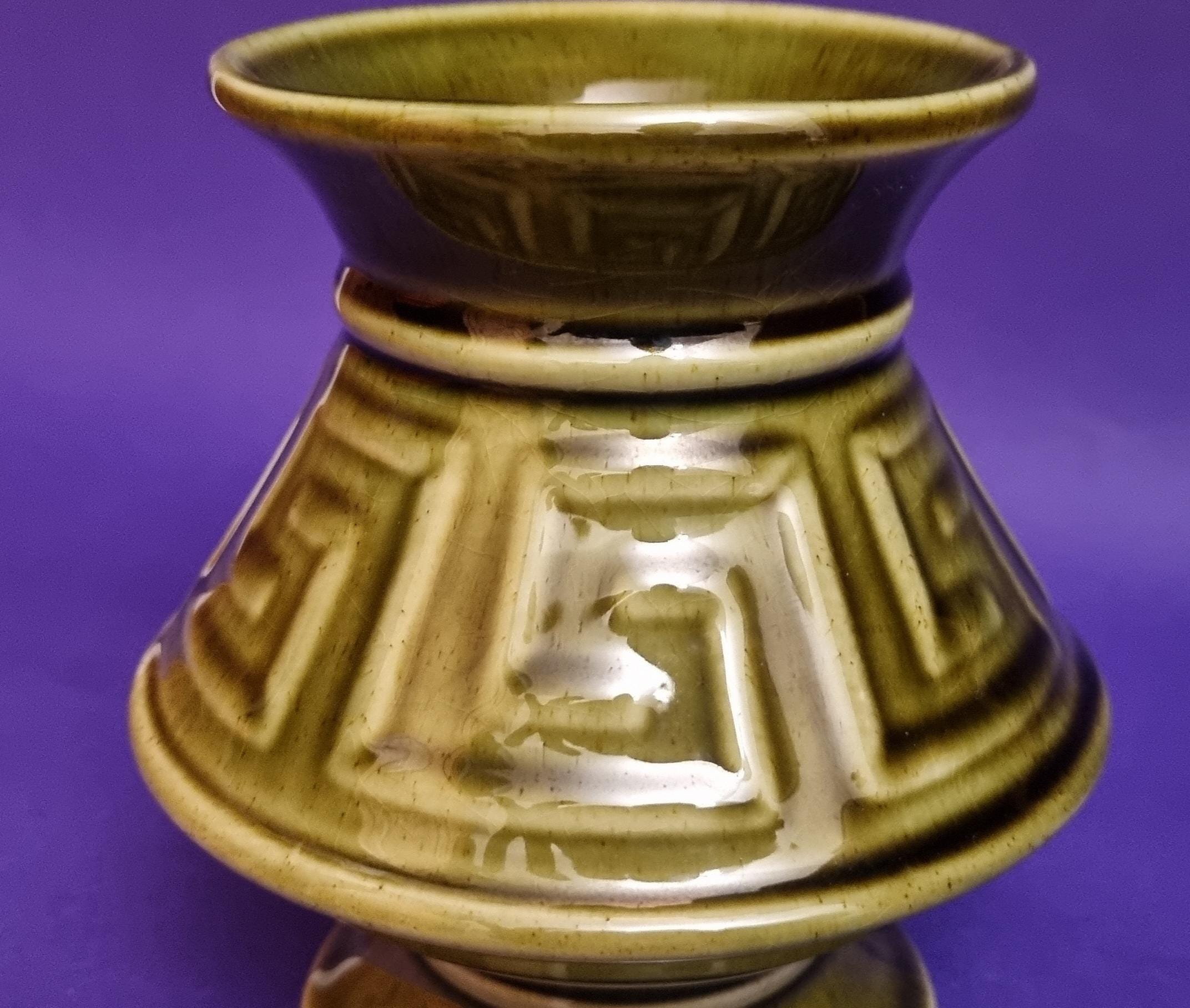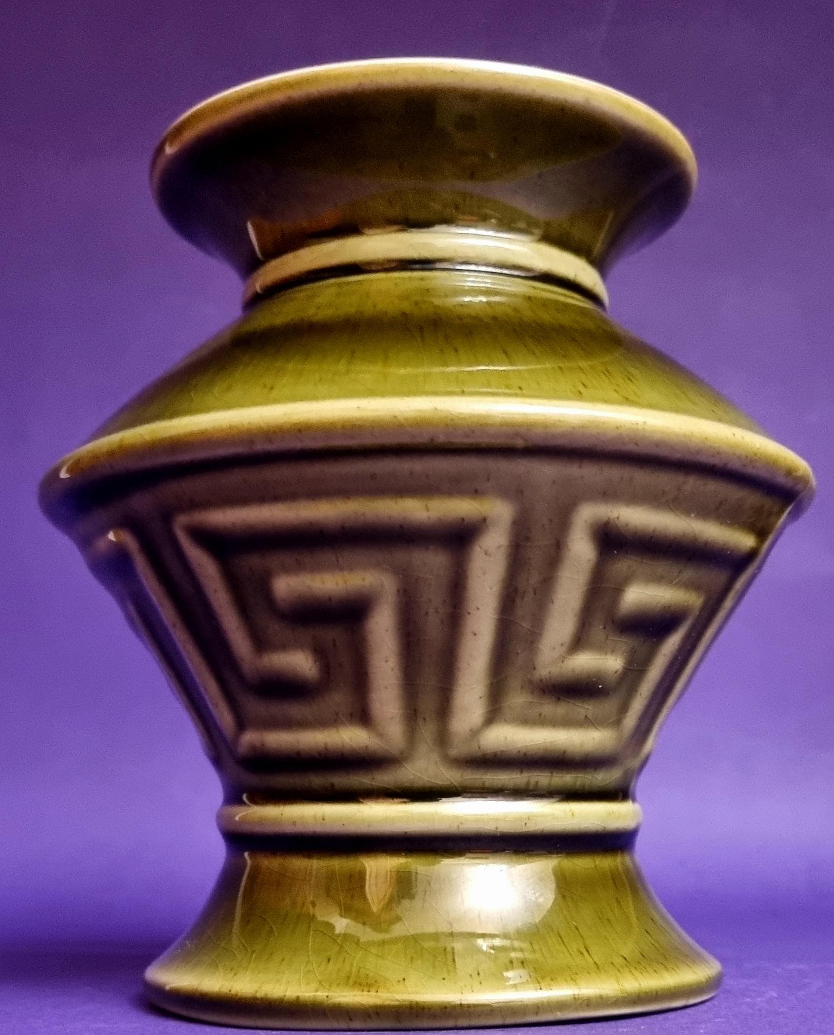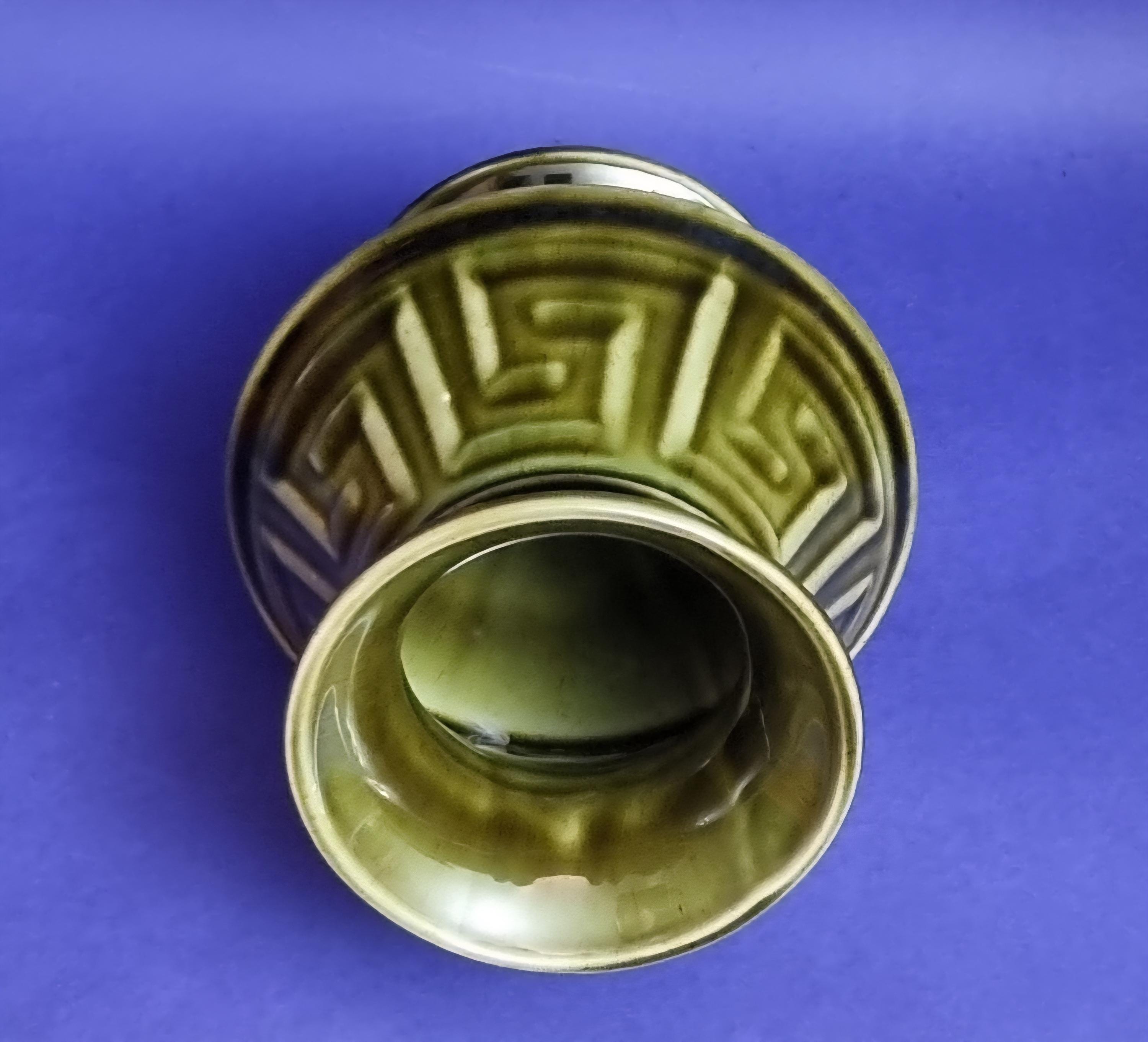 A beautiful high glossy glazed olive green vase by Holkham Pottery, Norfolk. This specific design is modelled on a traditional Greek urn, featuring a prominent geometric Greek key or meander pattern around its body.