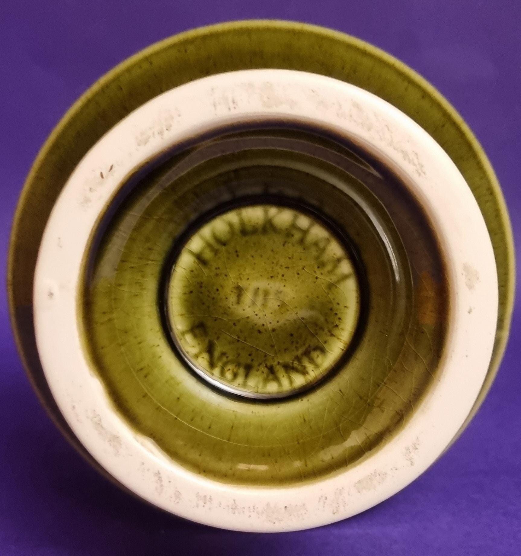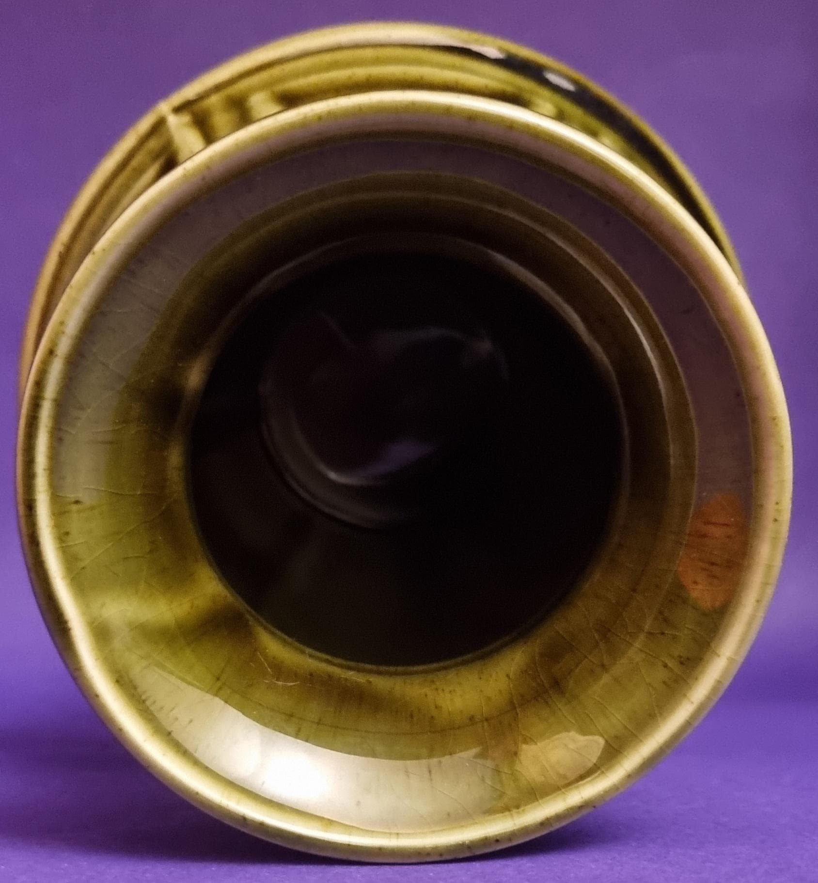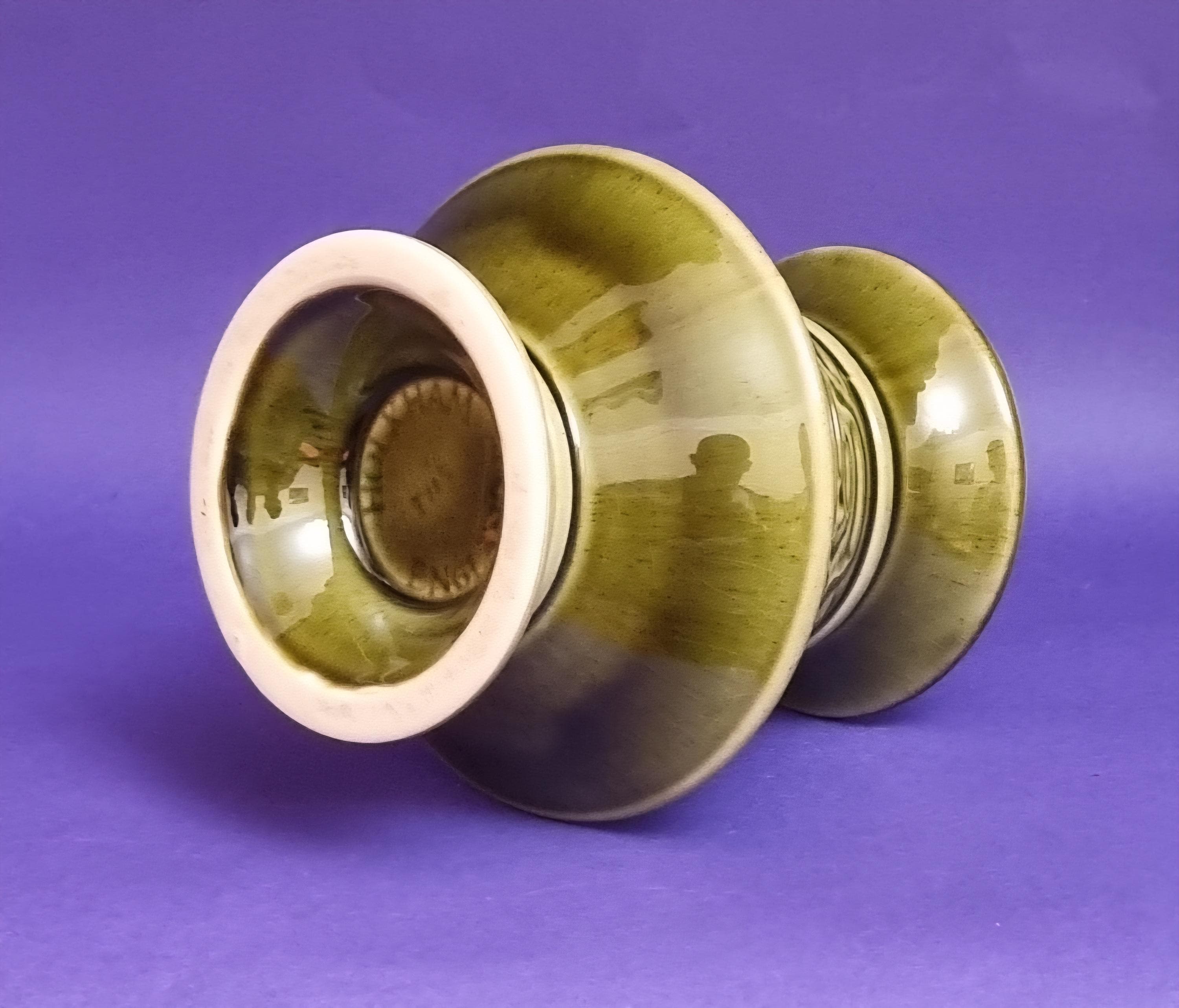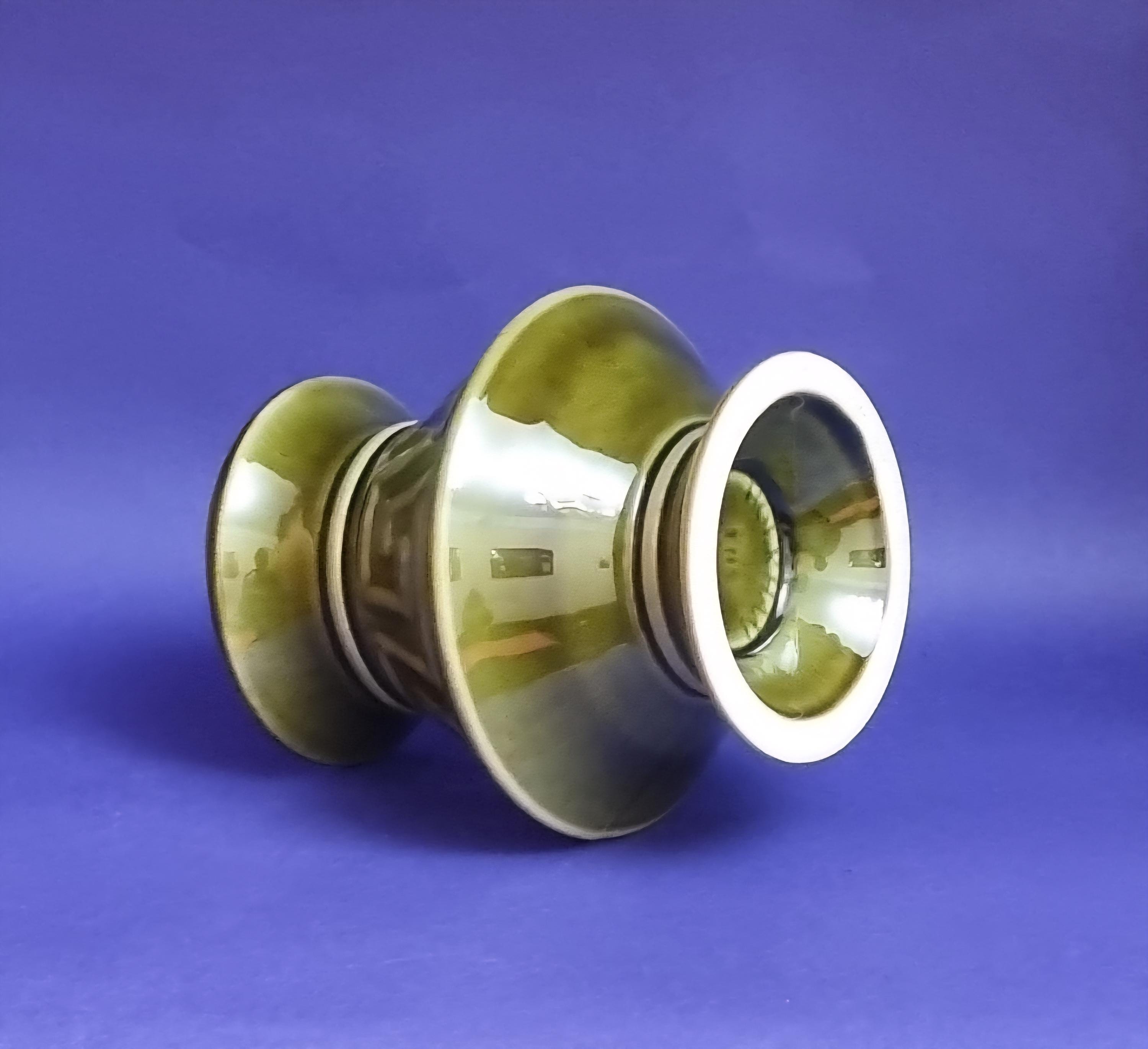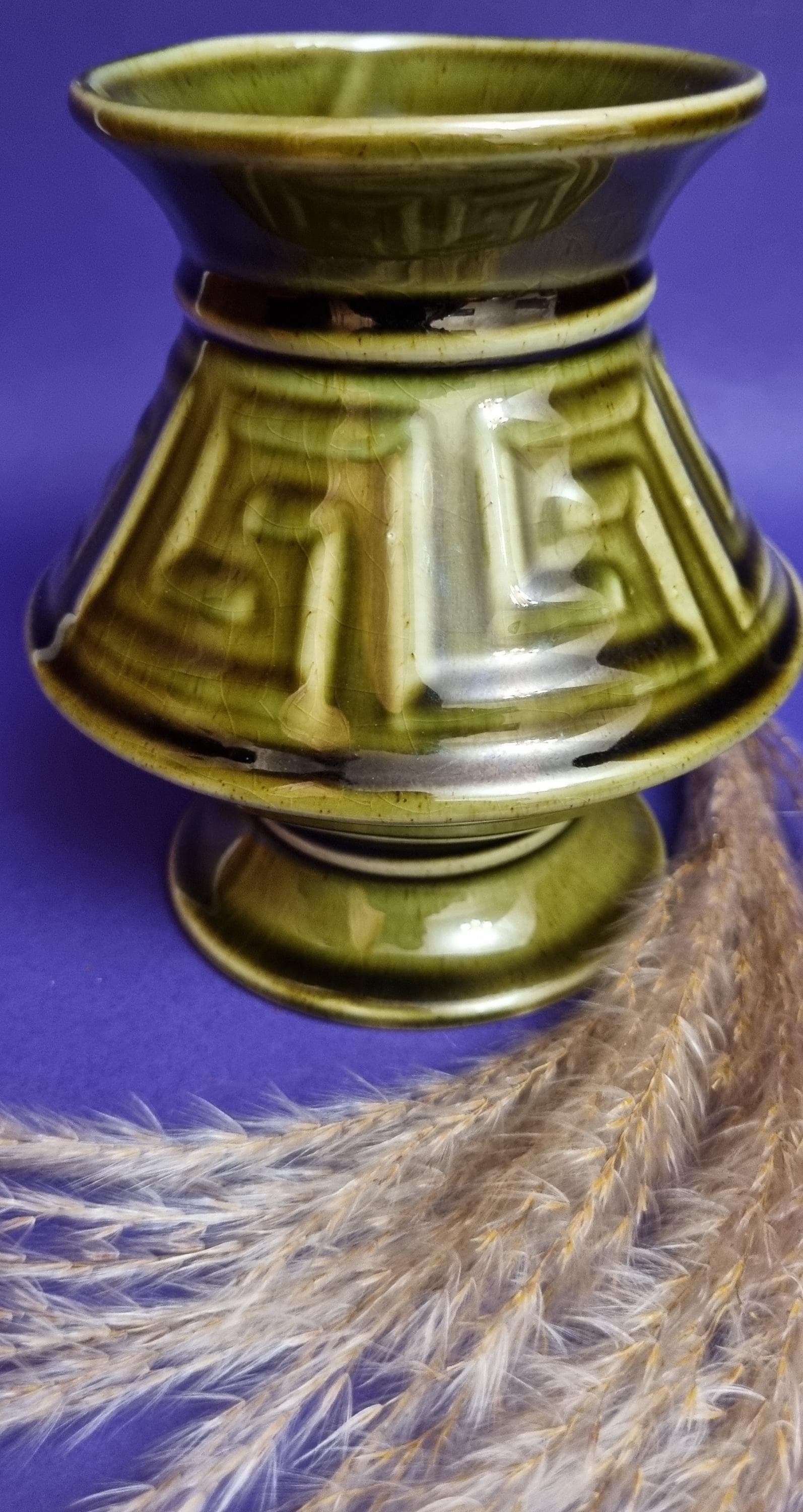 A beautiful high glossy glazed olive green vase by Holkham Pottery, Norfolk. This specific design is modelled on a traditional Greek urn, featuring a prominent geometric Greek key or meander pattern around its body.