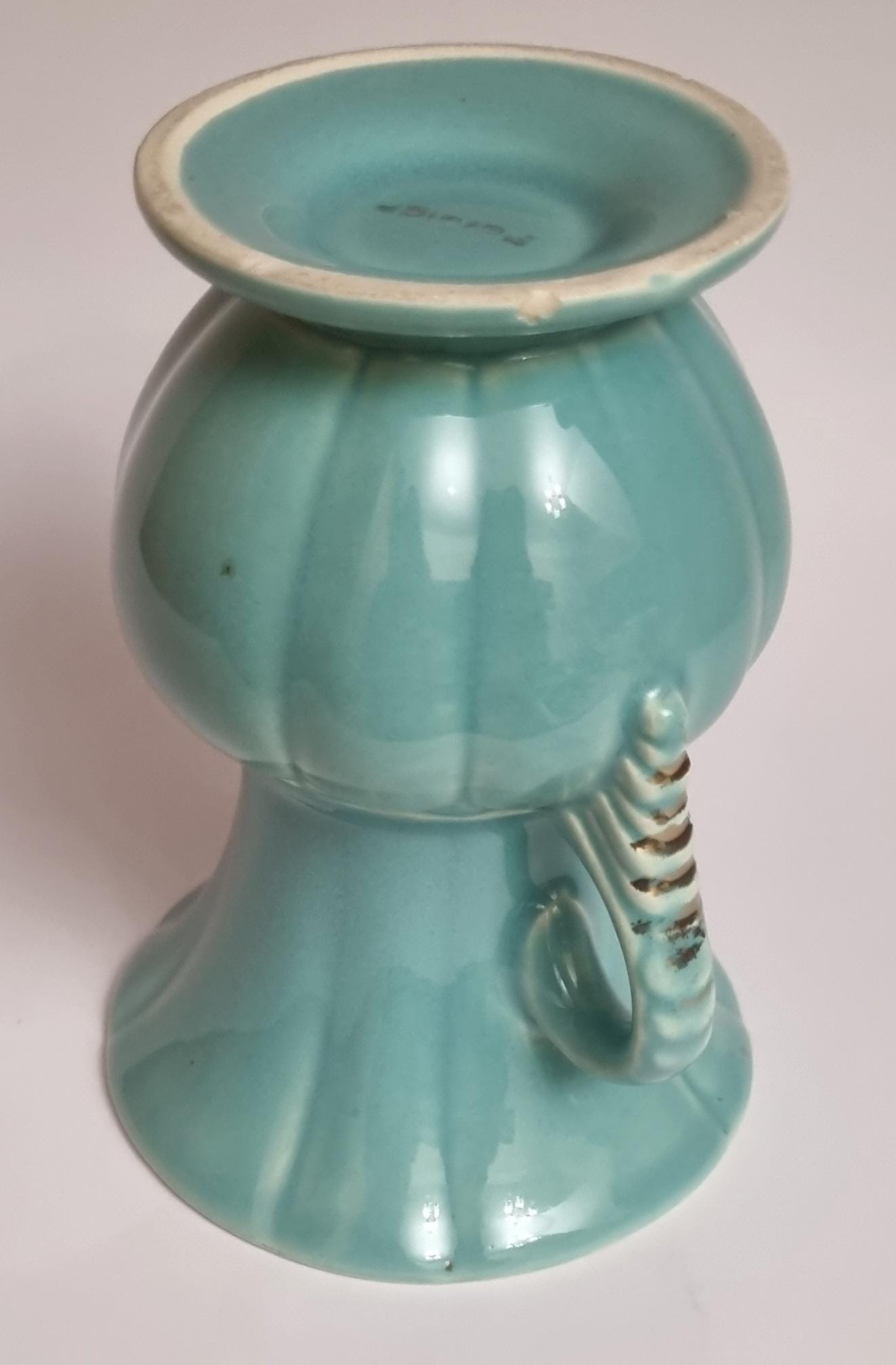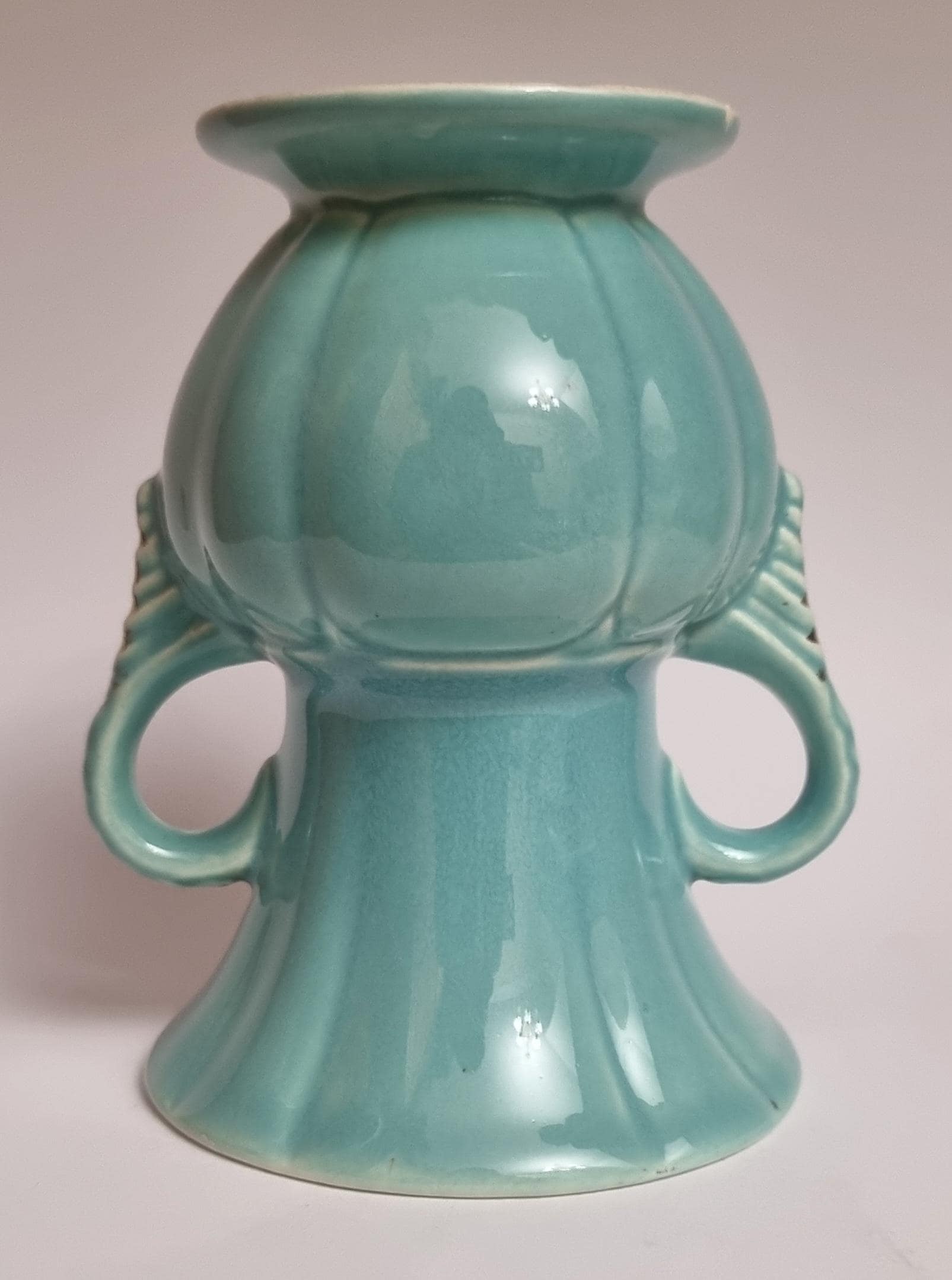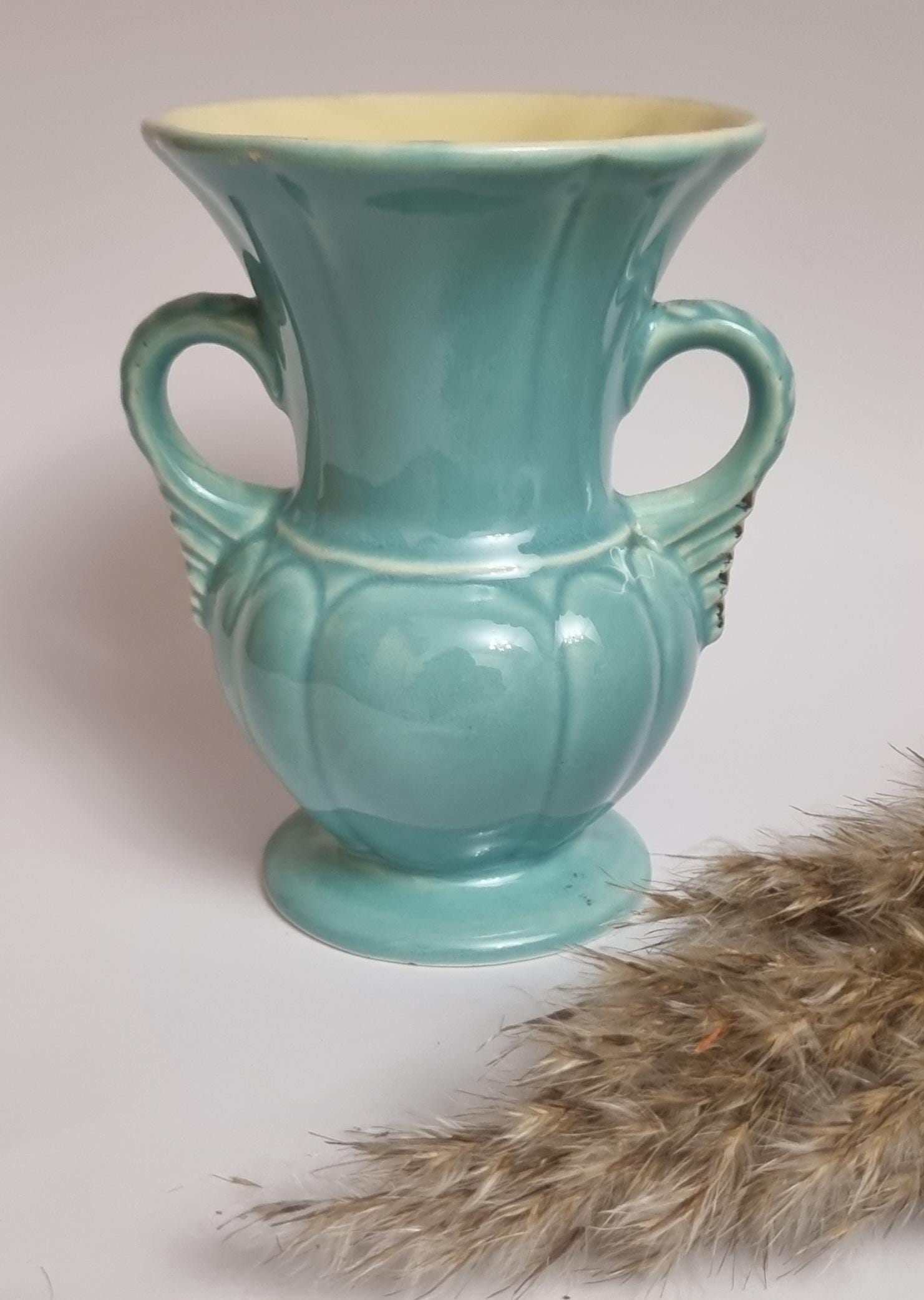 A lovely little 2 handled turquoise and gold gilt vase. In the style of McCoy vases, but Foreign made & stamped on the bottom.