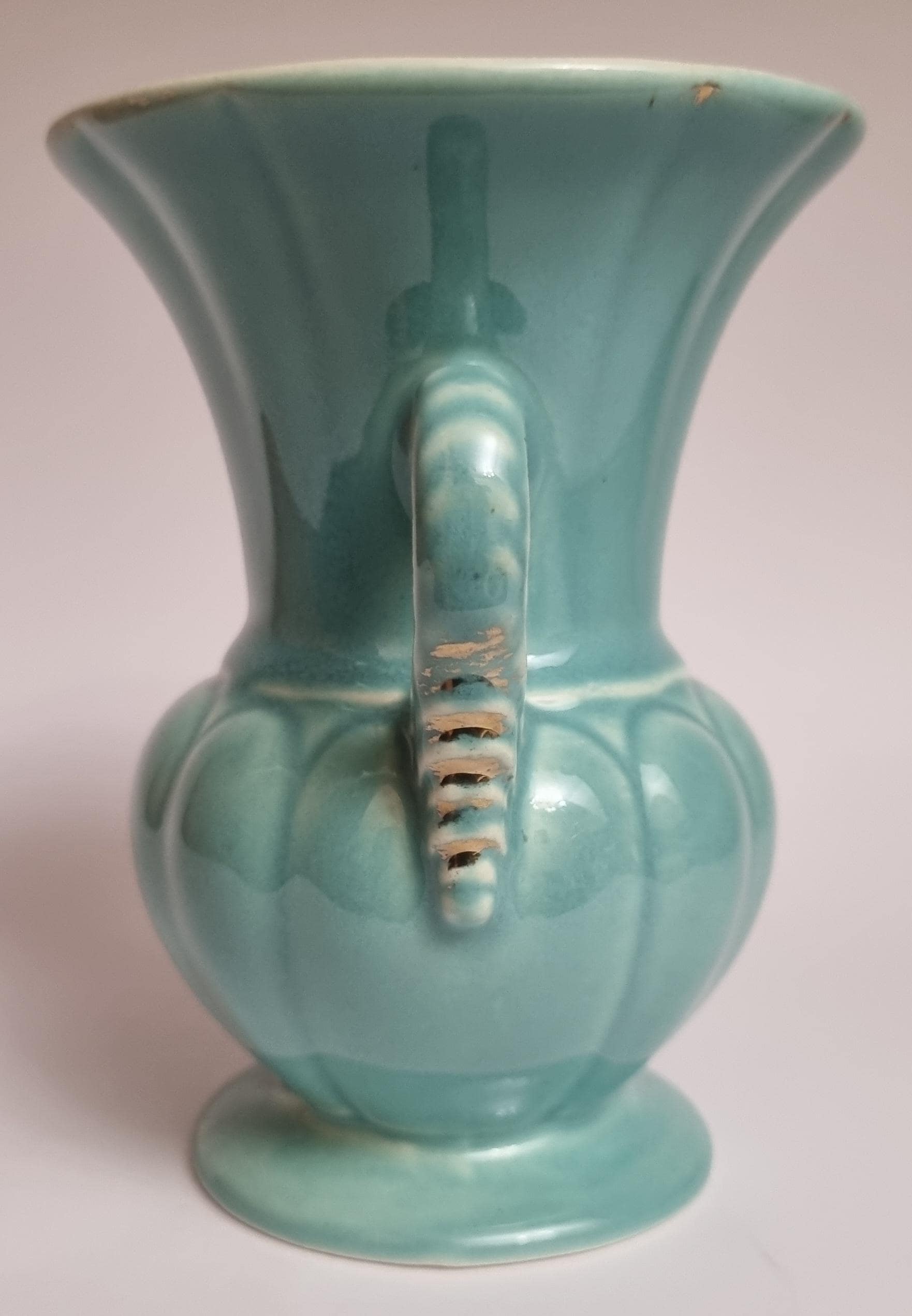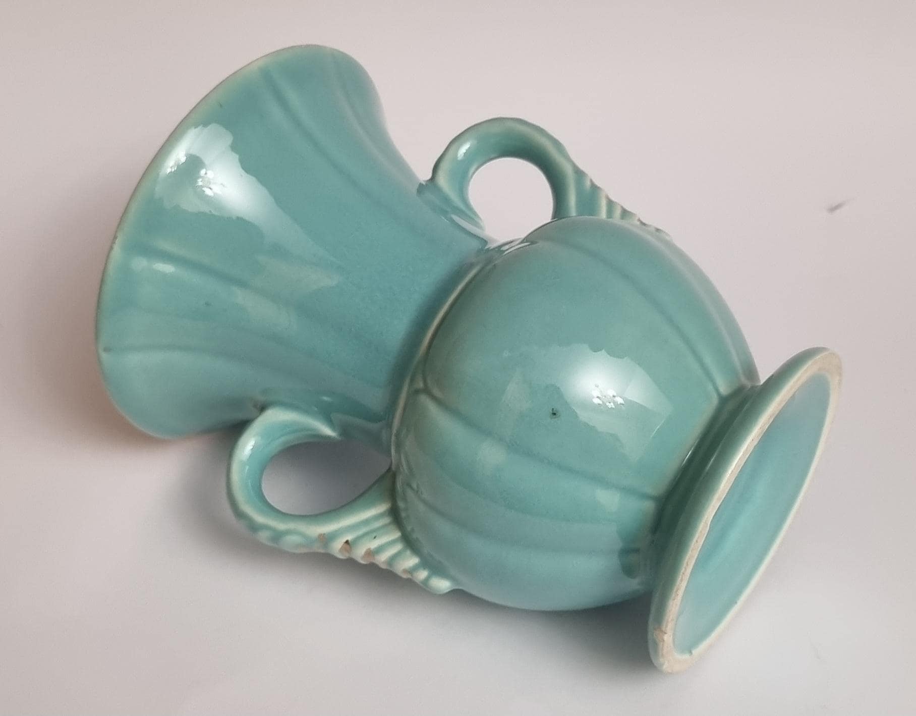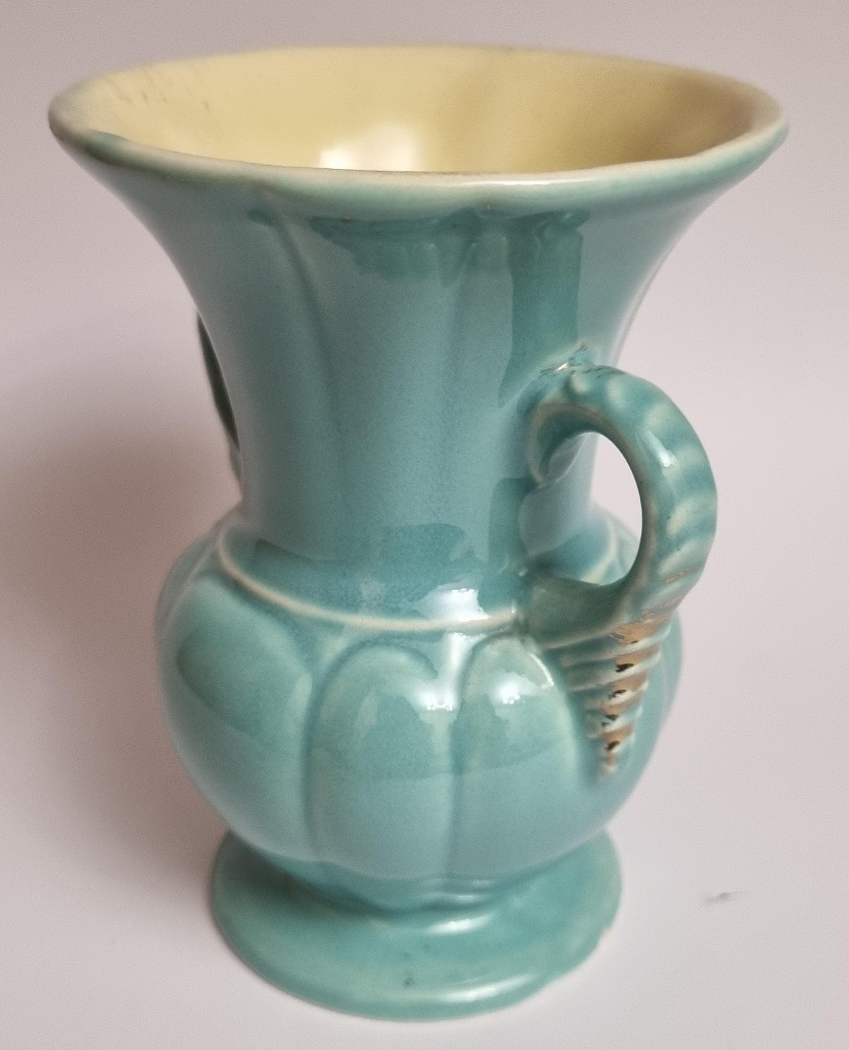 A lovely little 2 handled turquoise and gold gilt vase. In the style of McCoy vases, but Foreign made & stamped on the bottom.