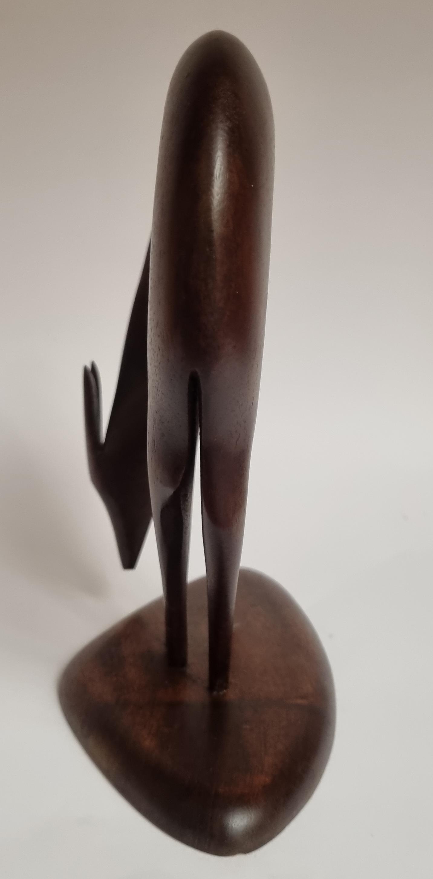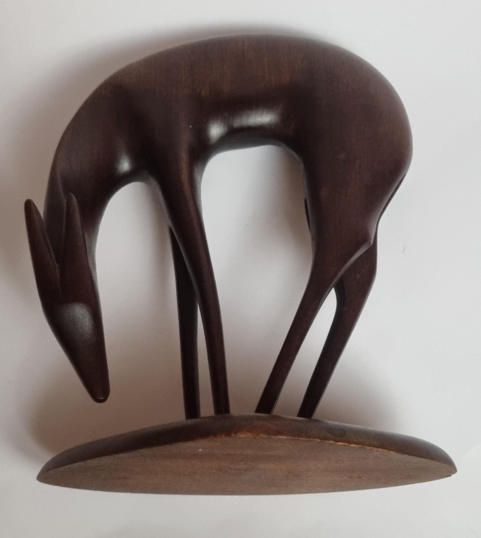 A Norwegian carved figurine of a doe or a young deer with small antlers, depicted in a grazing or bowing pose. The minimalist, abstract design is characteristic of mid-century modern Scandinavian art, with a focus on simple forms and the natural beauty of the material. Smooth and curved lines.