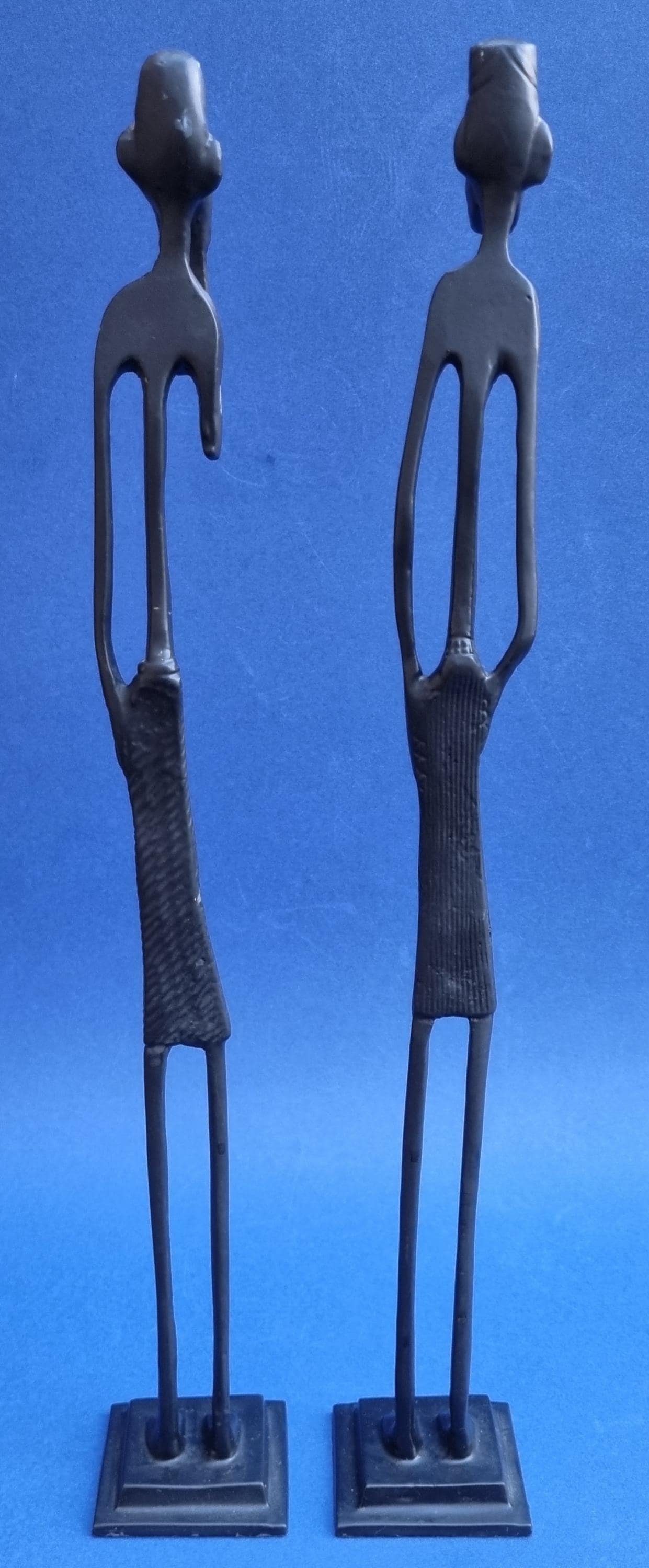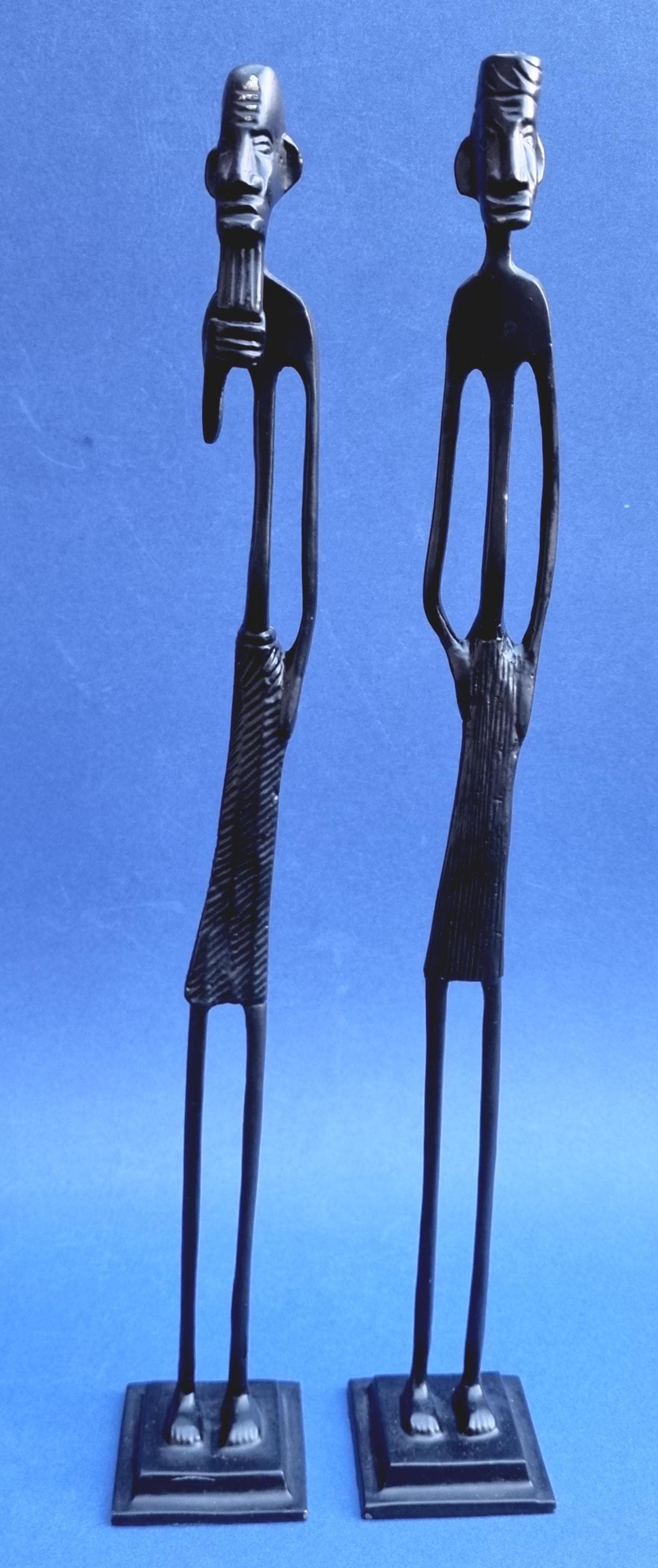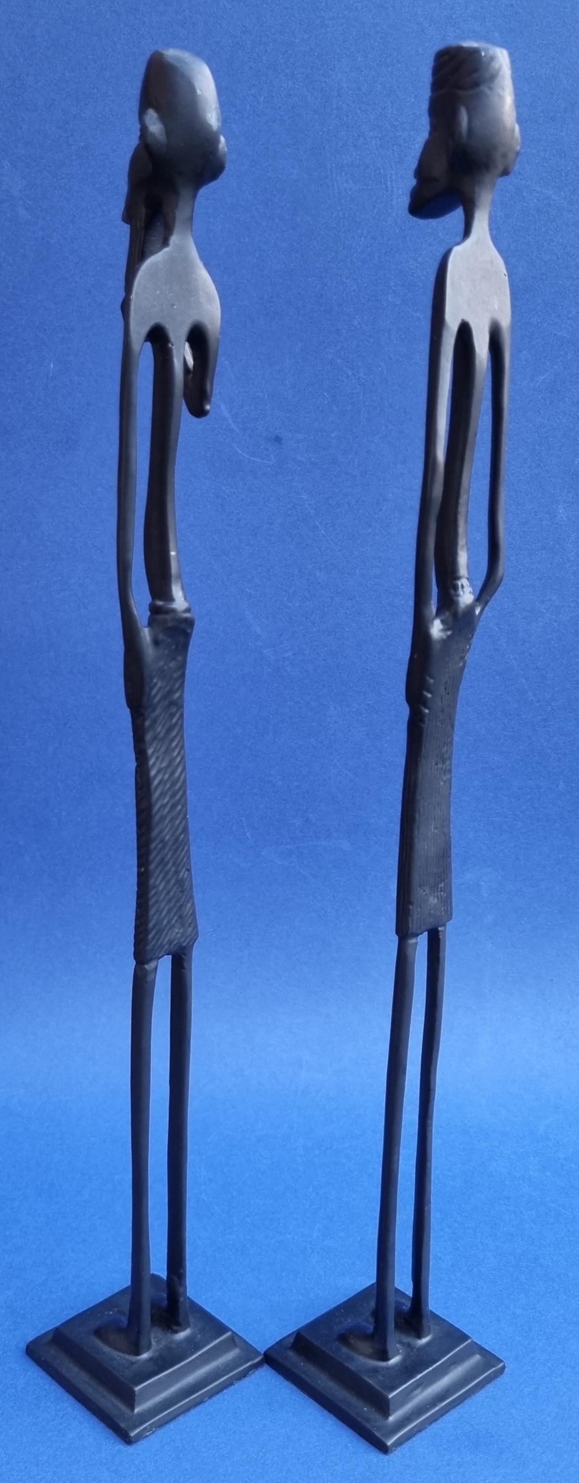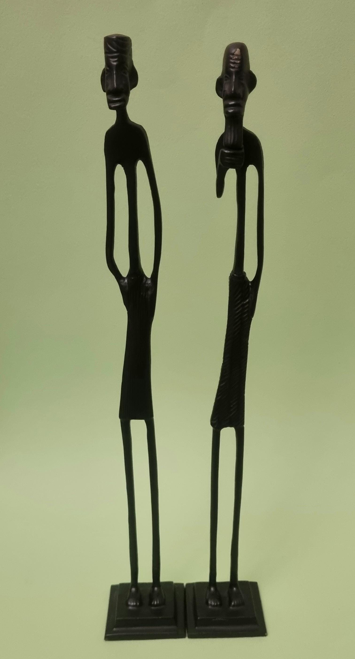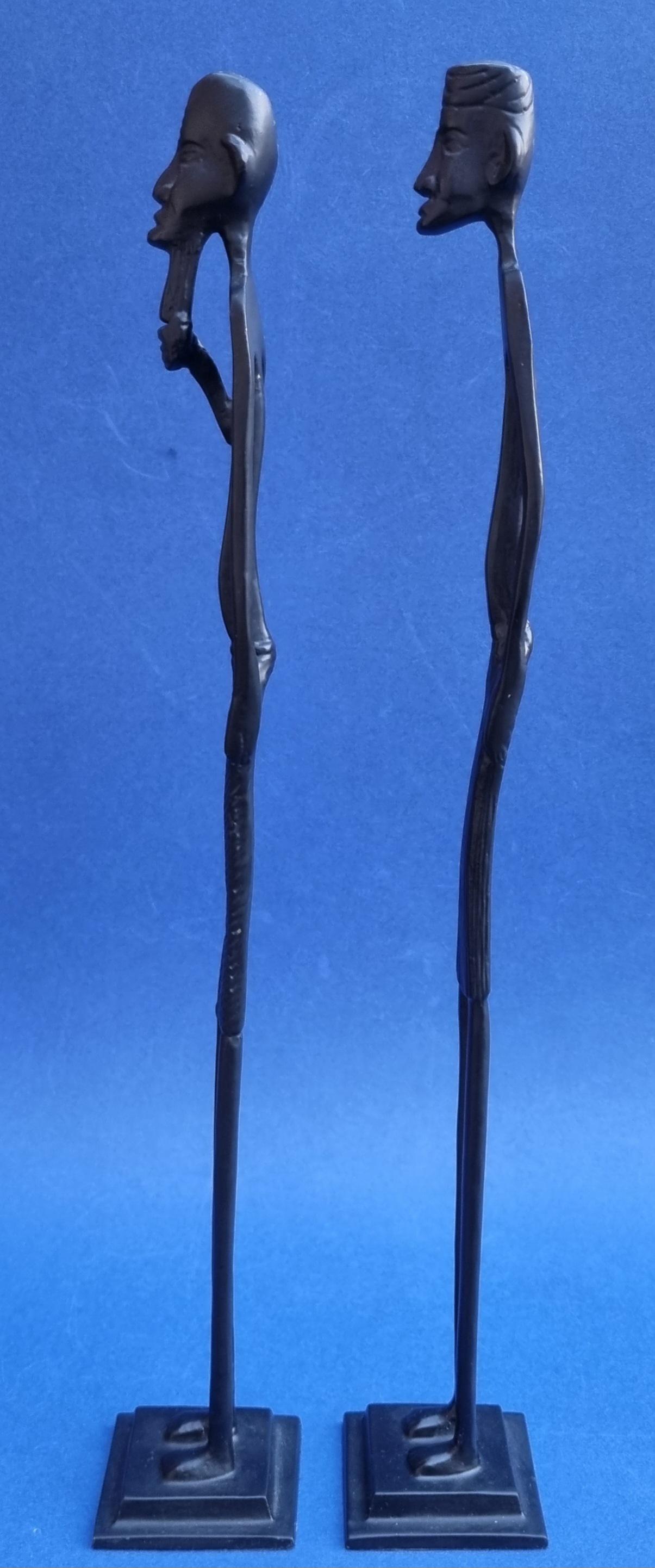 The figurines feature an elongated, minimalist design with abstract features and are mounted on pedestals for stability.