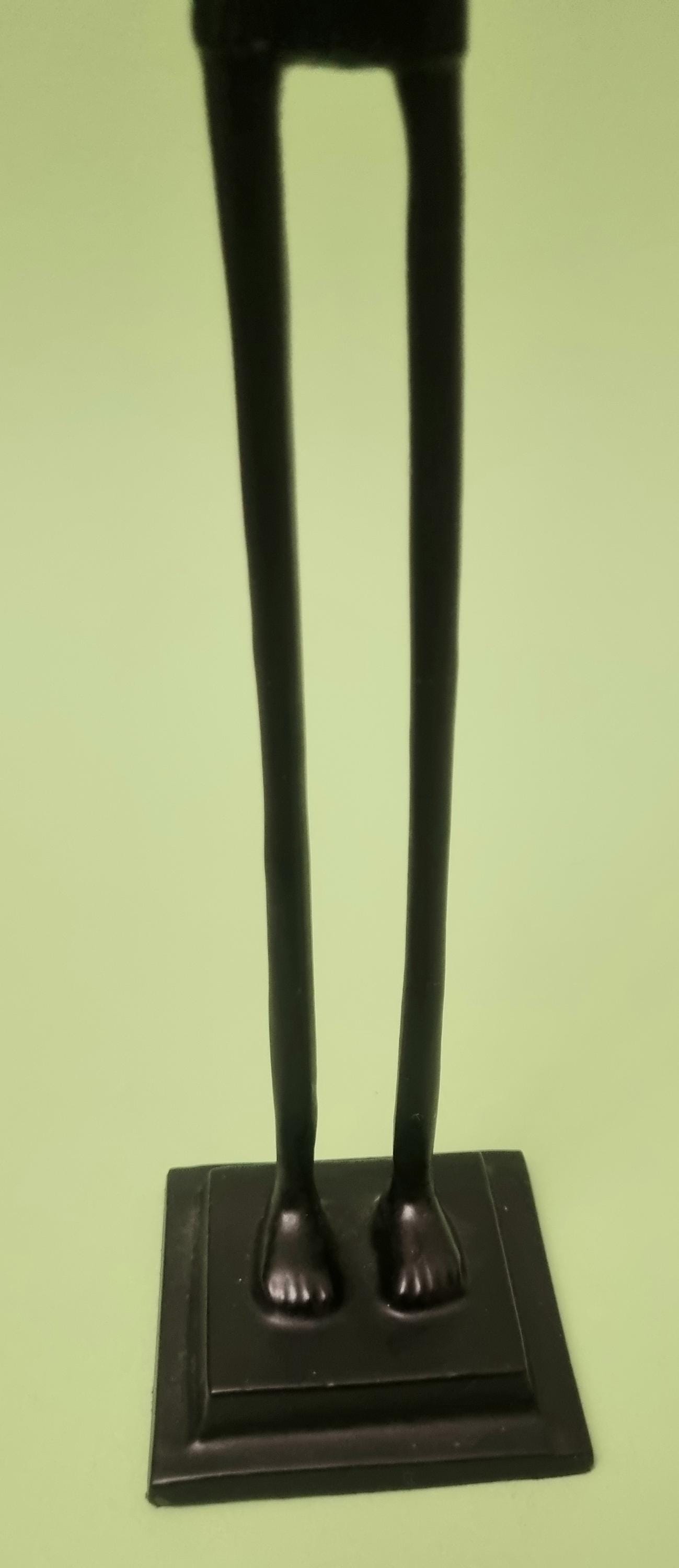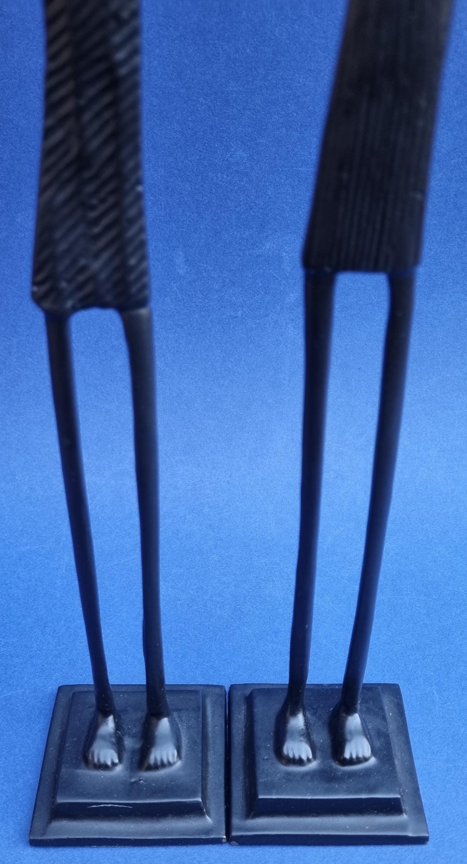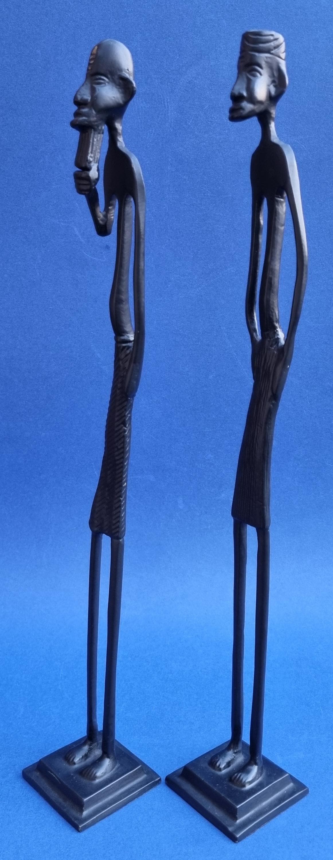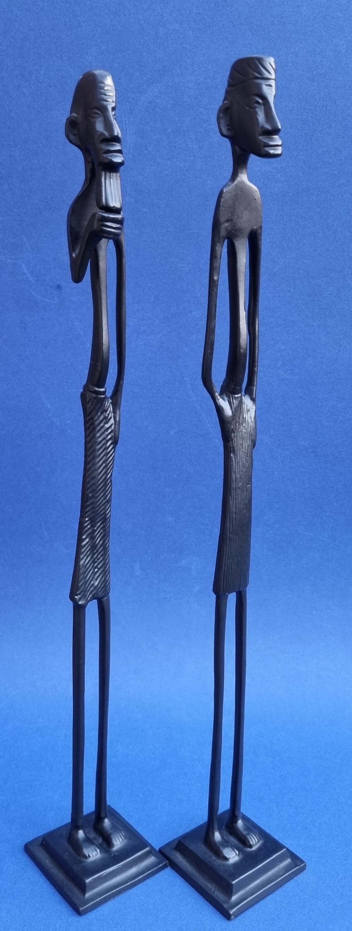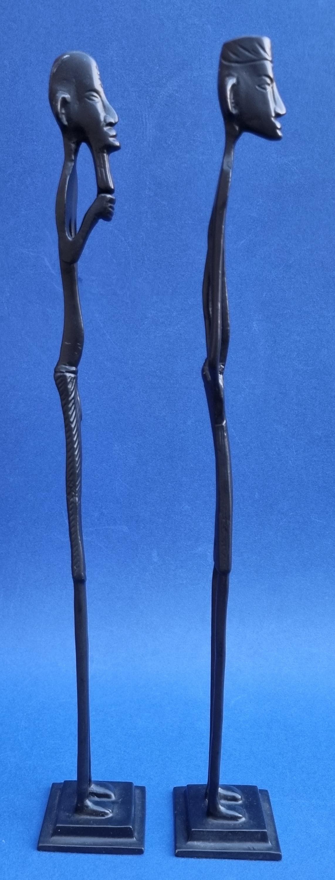 The figurines feature an elongated, minimalist design with abstract features and are mounted on pedestals for stability.