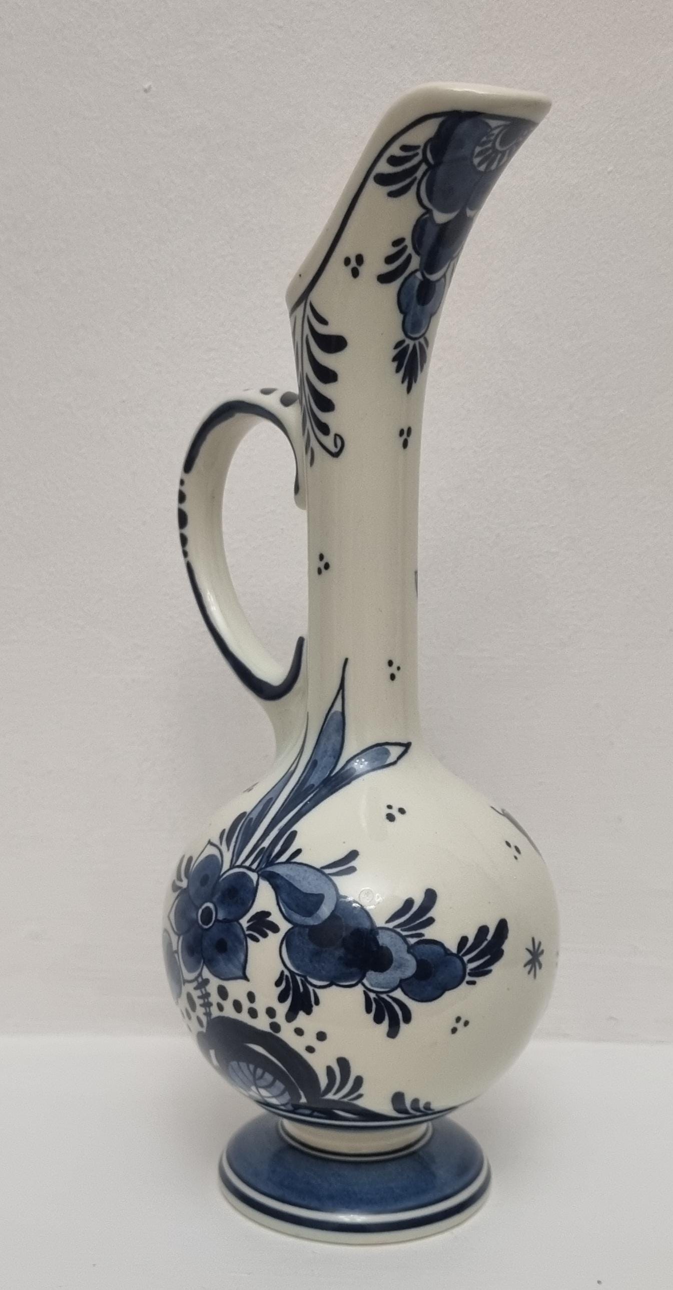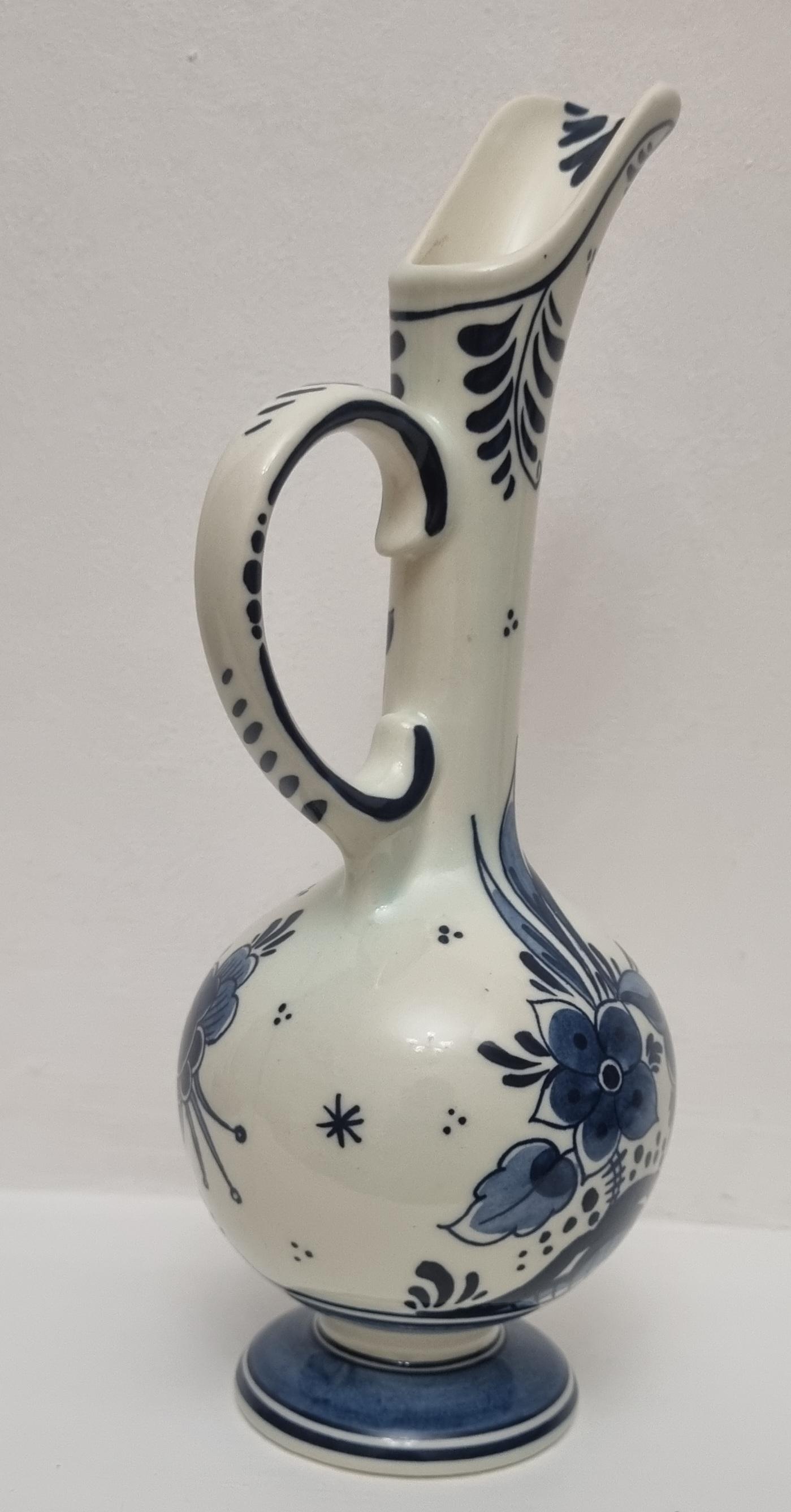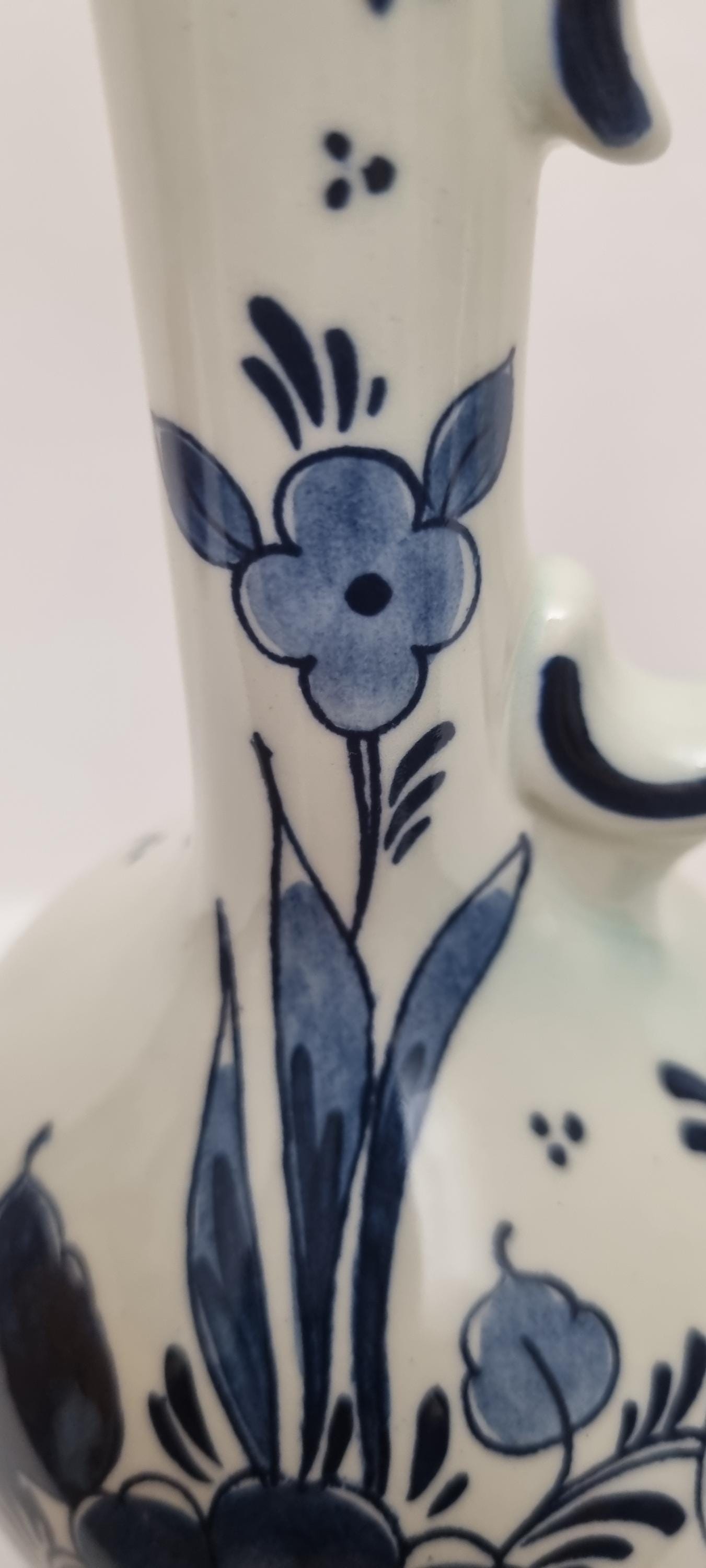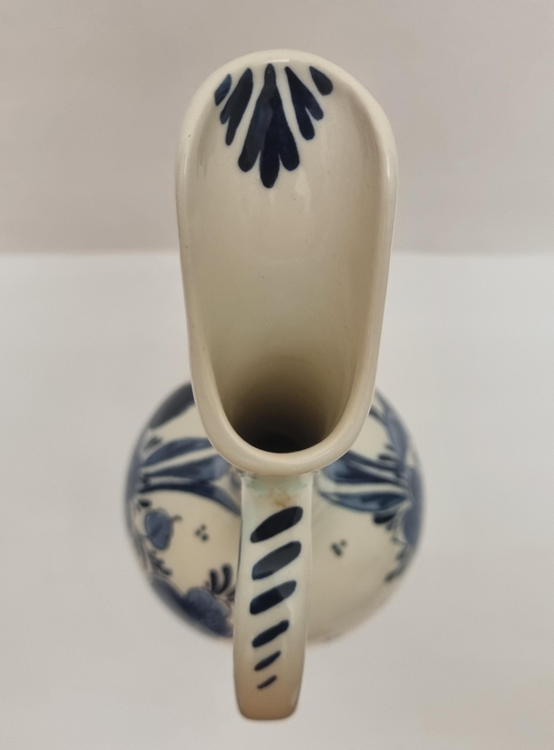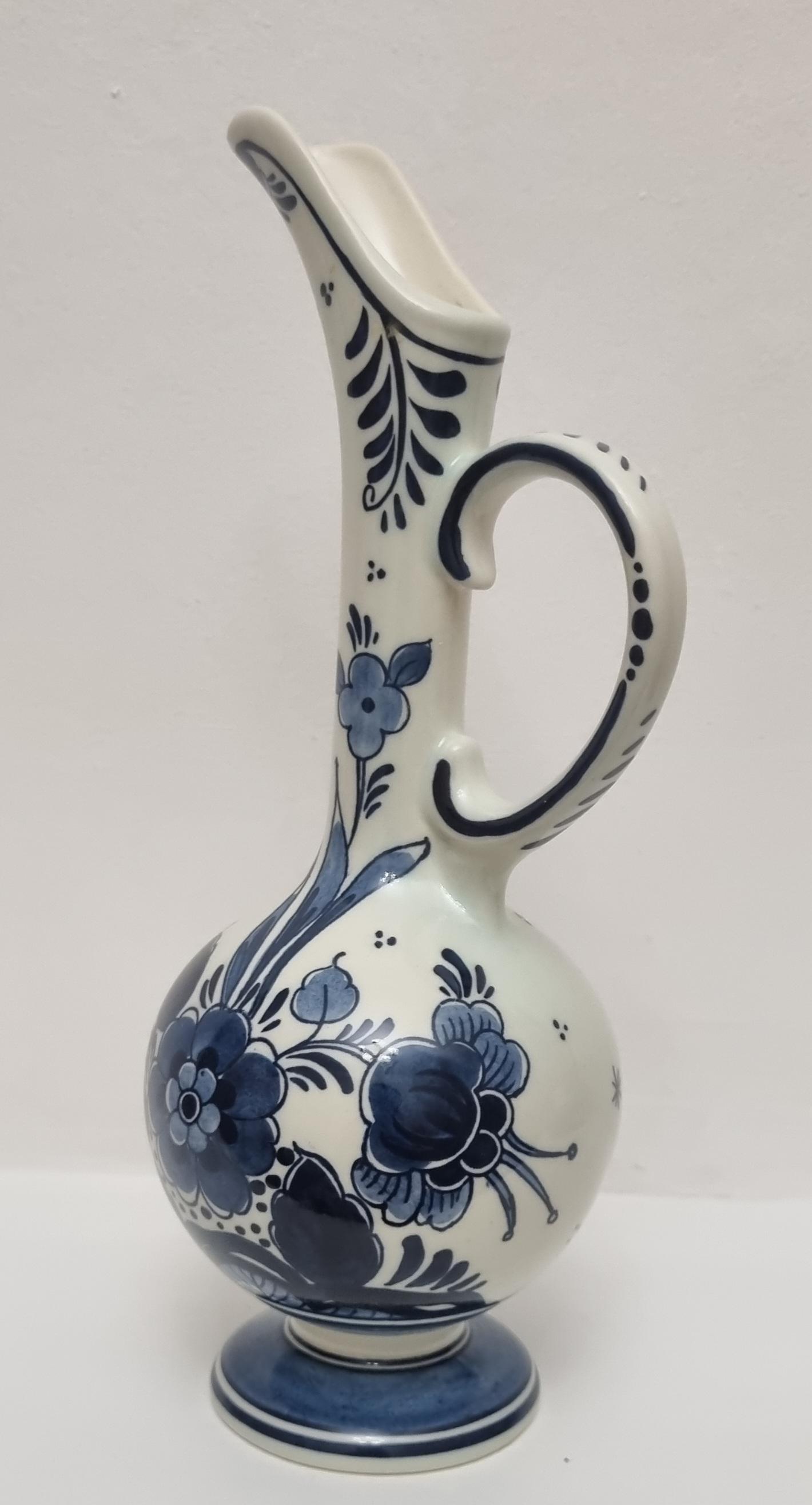 Vintage Royal Goedewaagen Delftware jug or pitcher, hand-painted with traditional rich blue and white floral motifs. It is made of earthenware ceramic and has an asymmetrical shape with a handle and spout. Decorative.