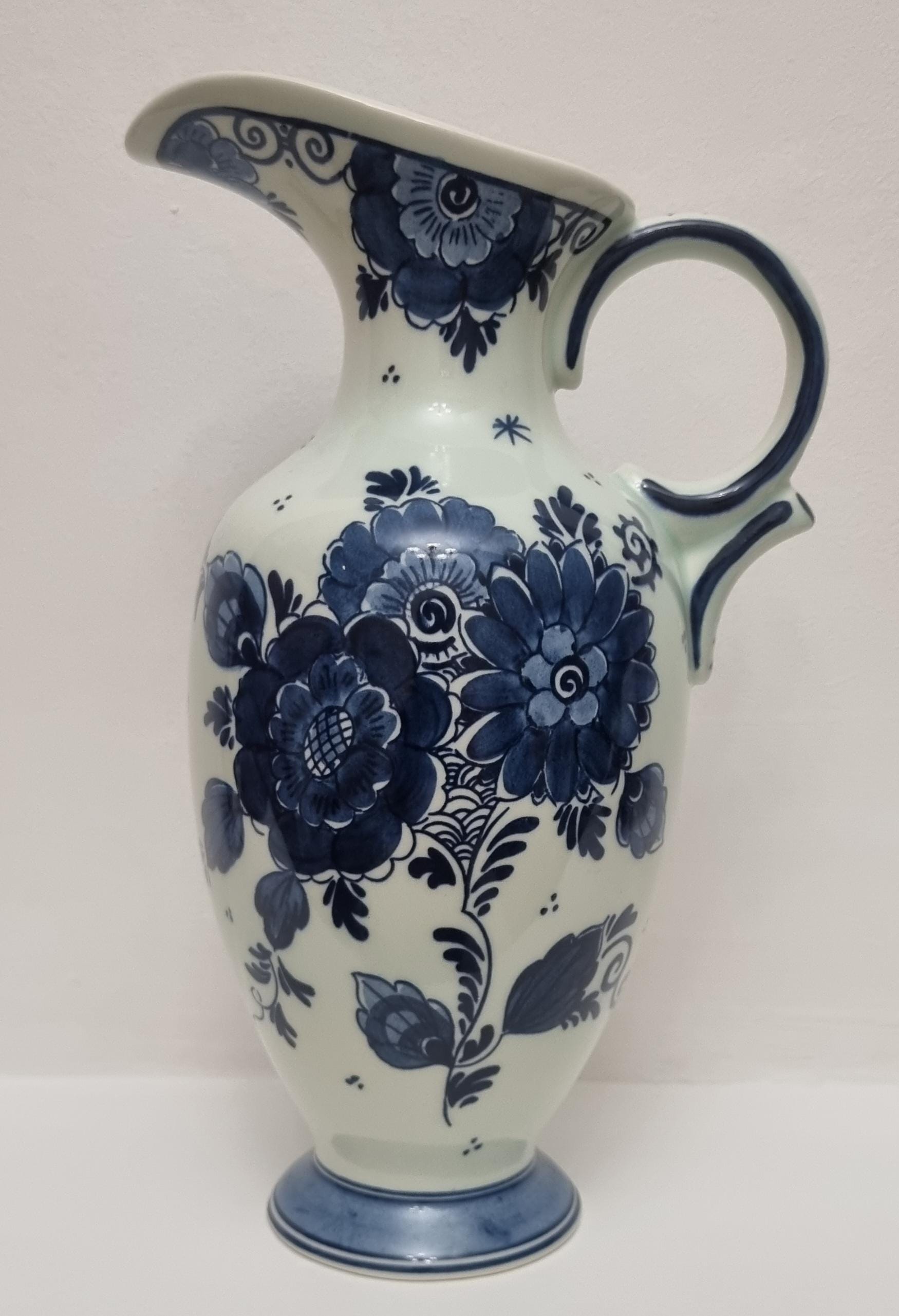 Vintage Royal Goedewaagen Delftware/Delft Blue jug or pitcher, hand-painted with traditional rich blue and white floral motifs on thin shiny glaze. It is made of earthenware ceramic. The style is inspired by Chinese porcelain and is characteristic of Dutch ceramic art.