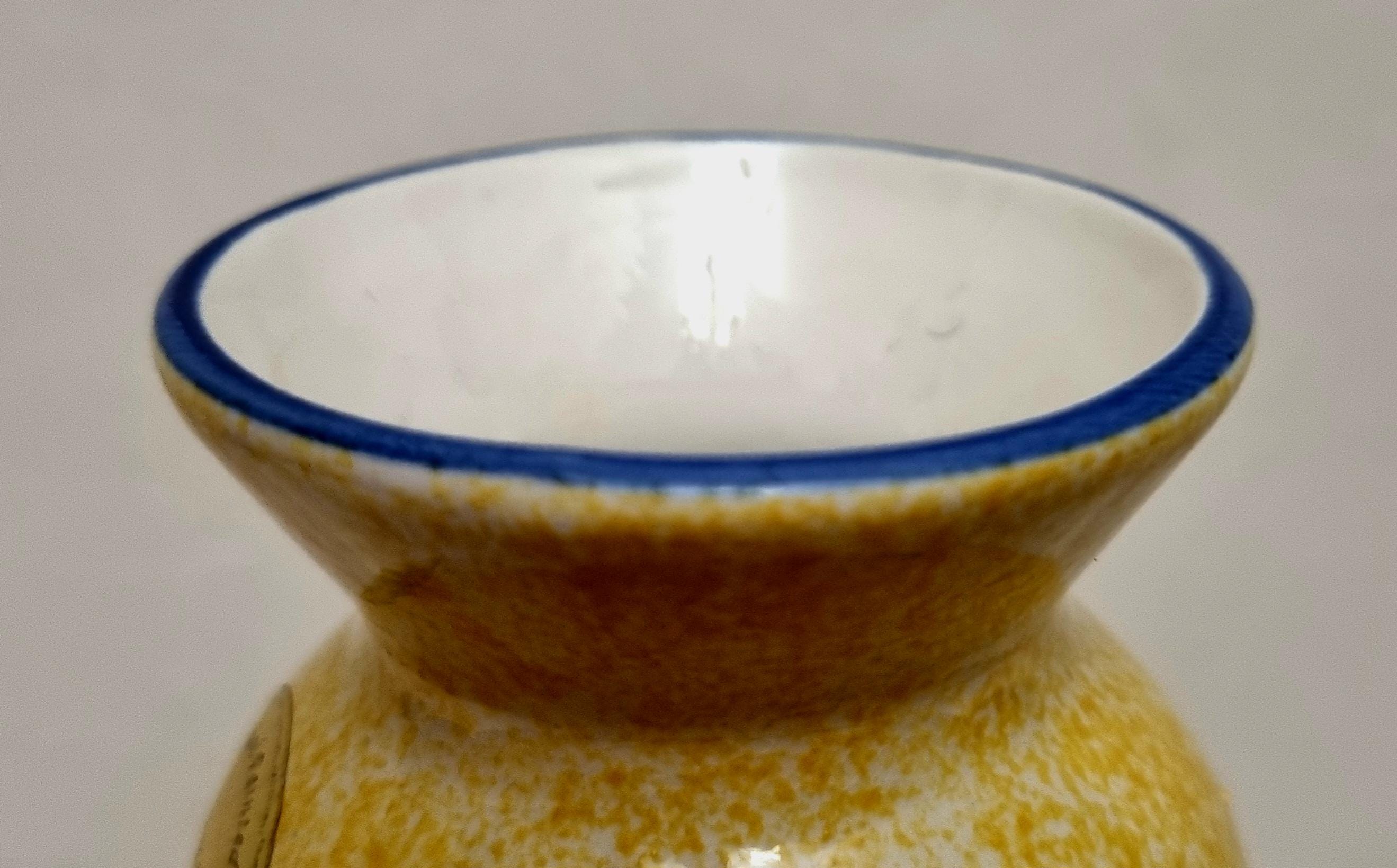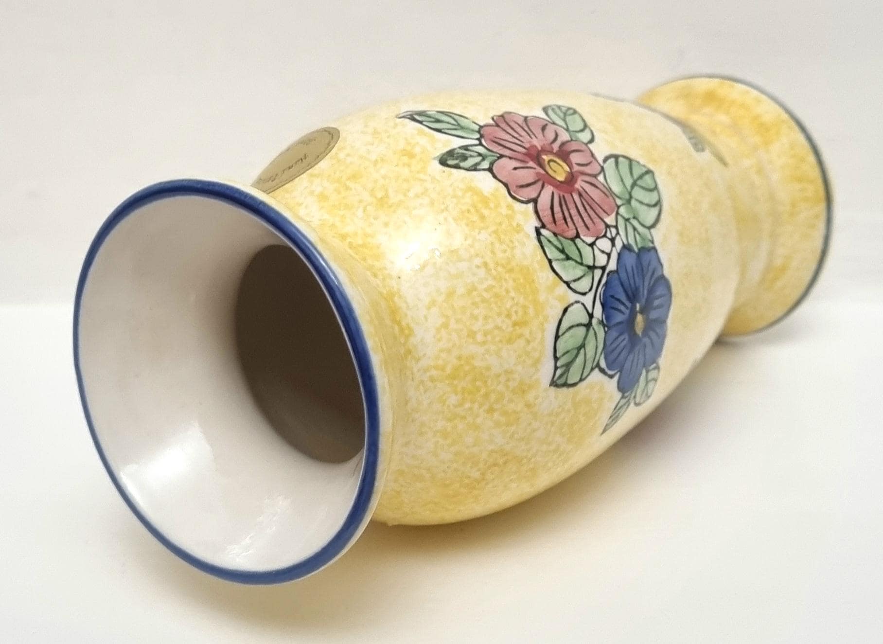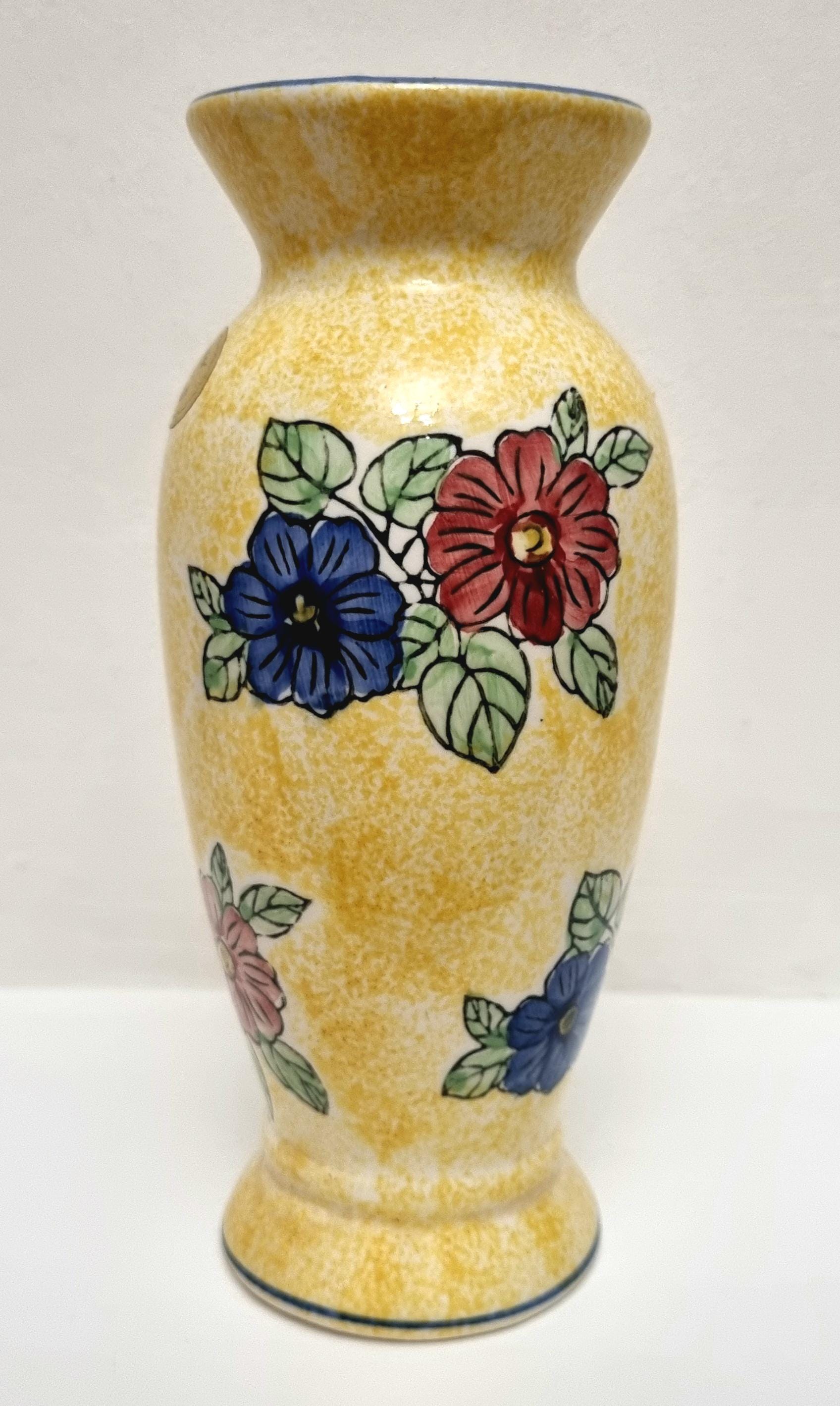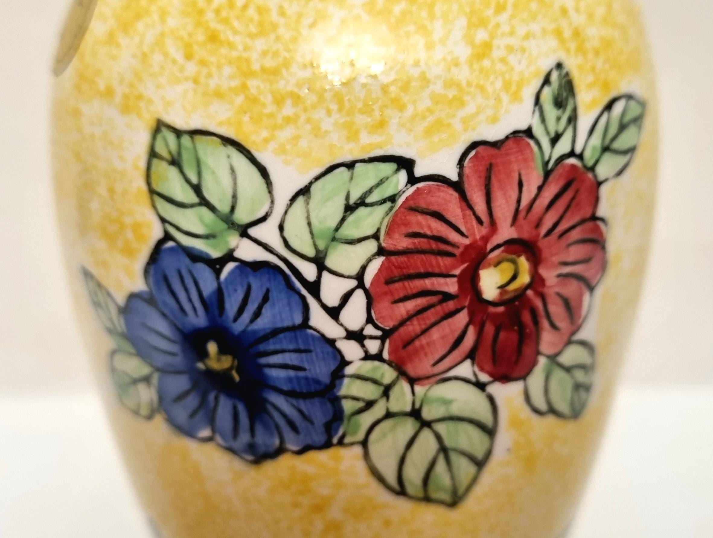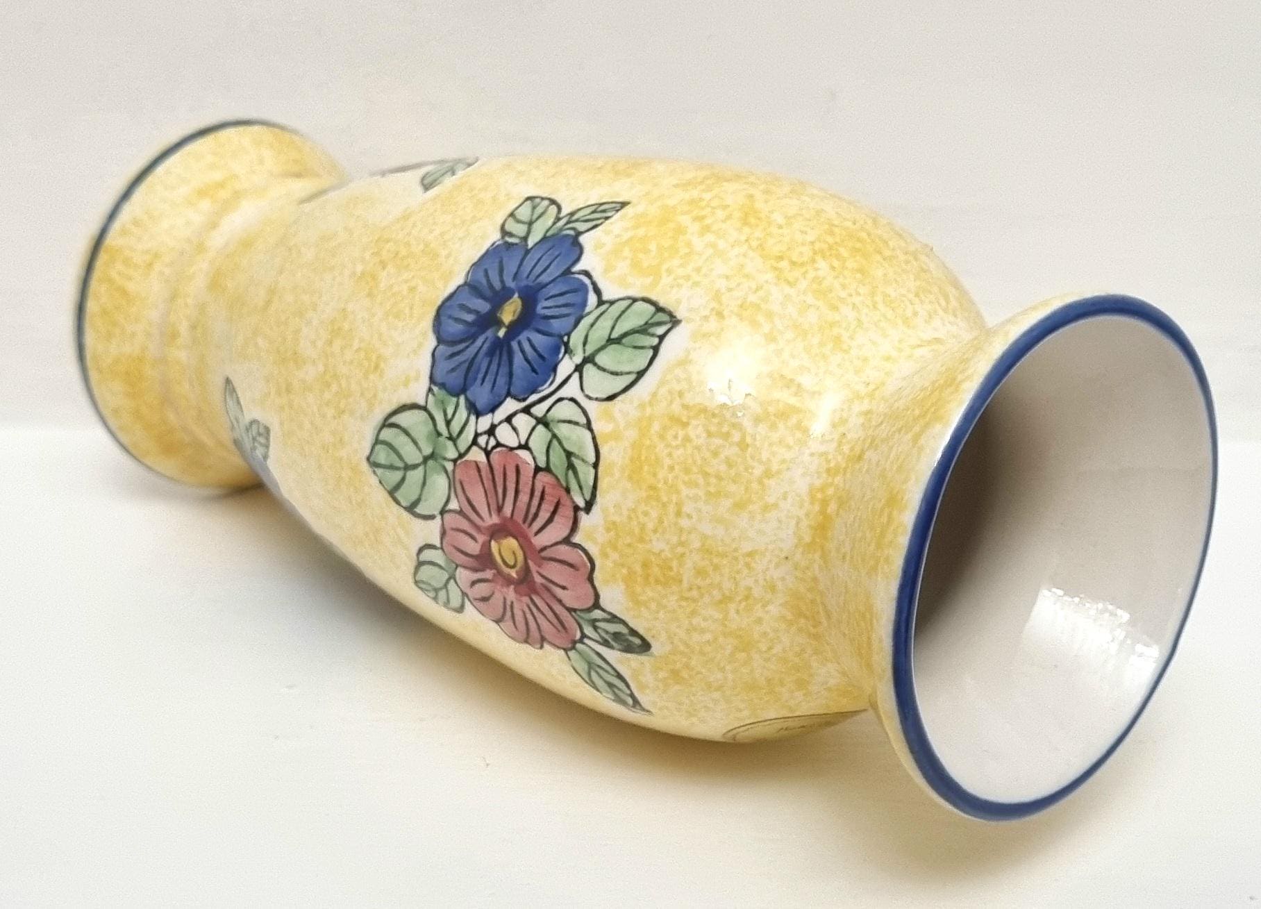 A lovely yellow ceramic vase with a speckled glaze effect, hand-painted with blue and pink flowers and green leaves.