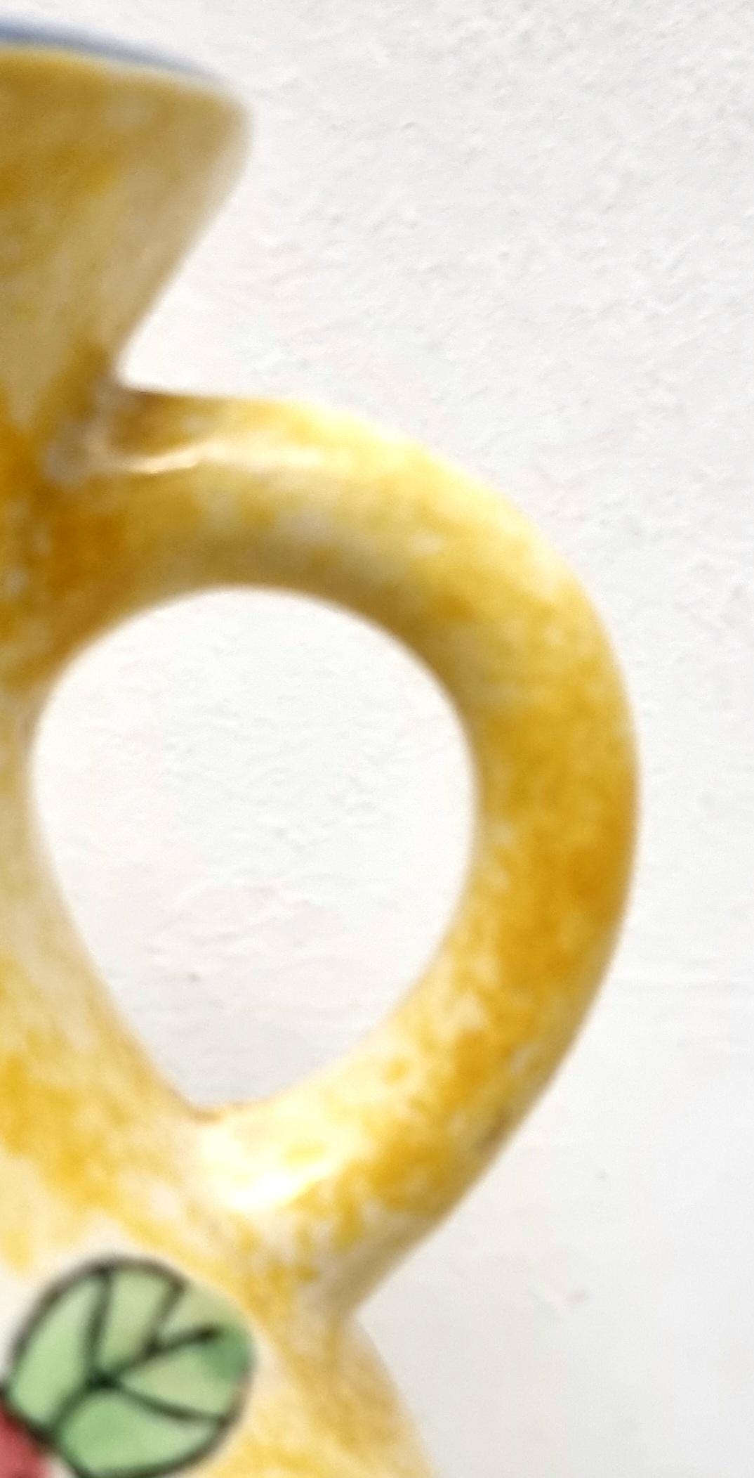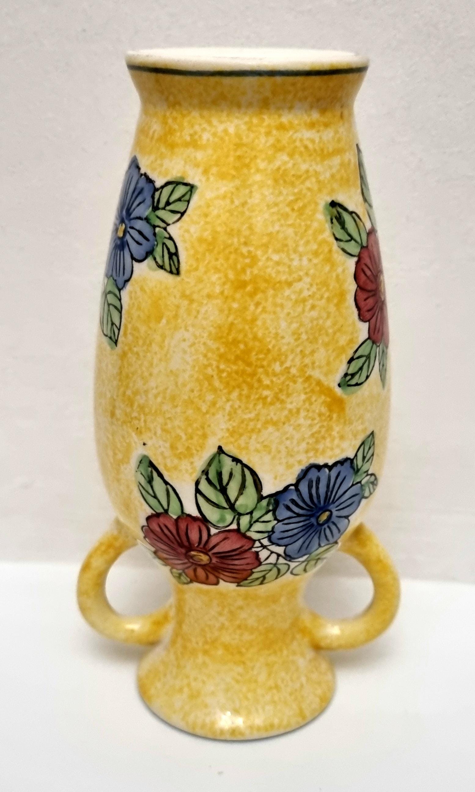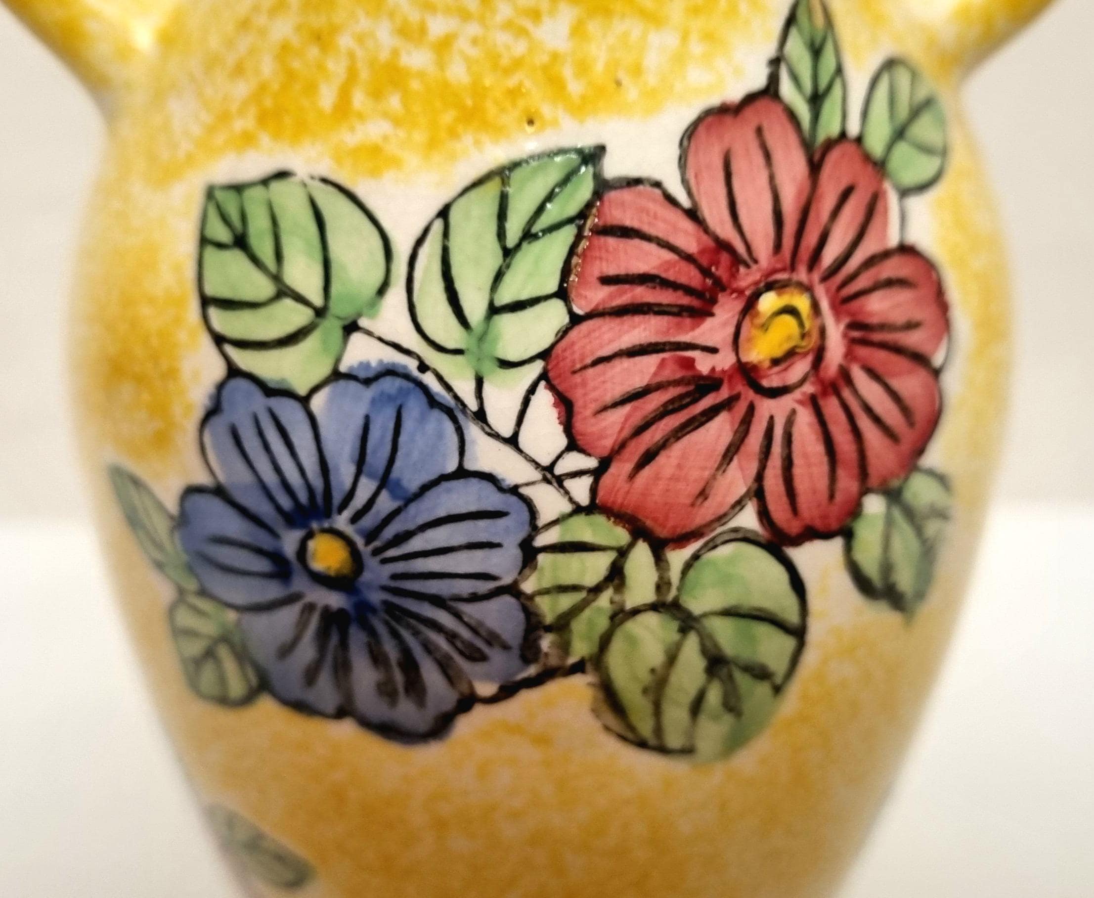 A lovely yellow 2 handled ceramic vase with a speckled glaze effect, hand-painted with blue and pink flowers and green leaves.