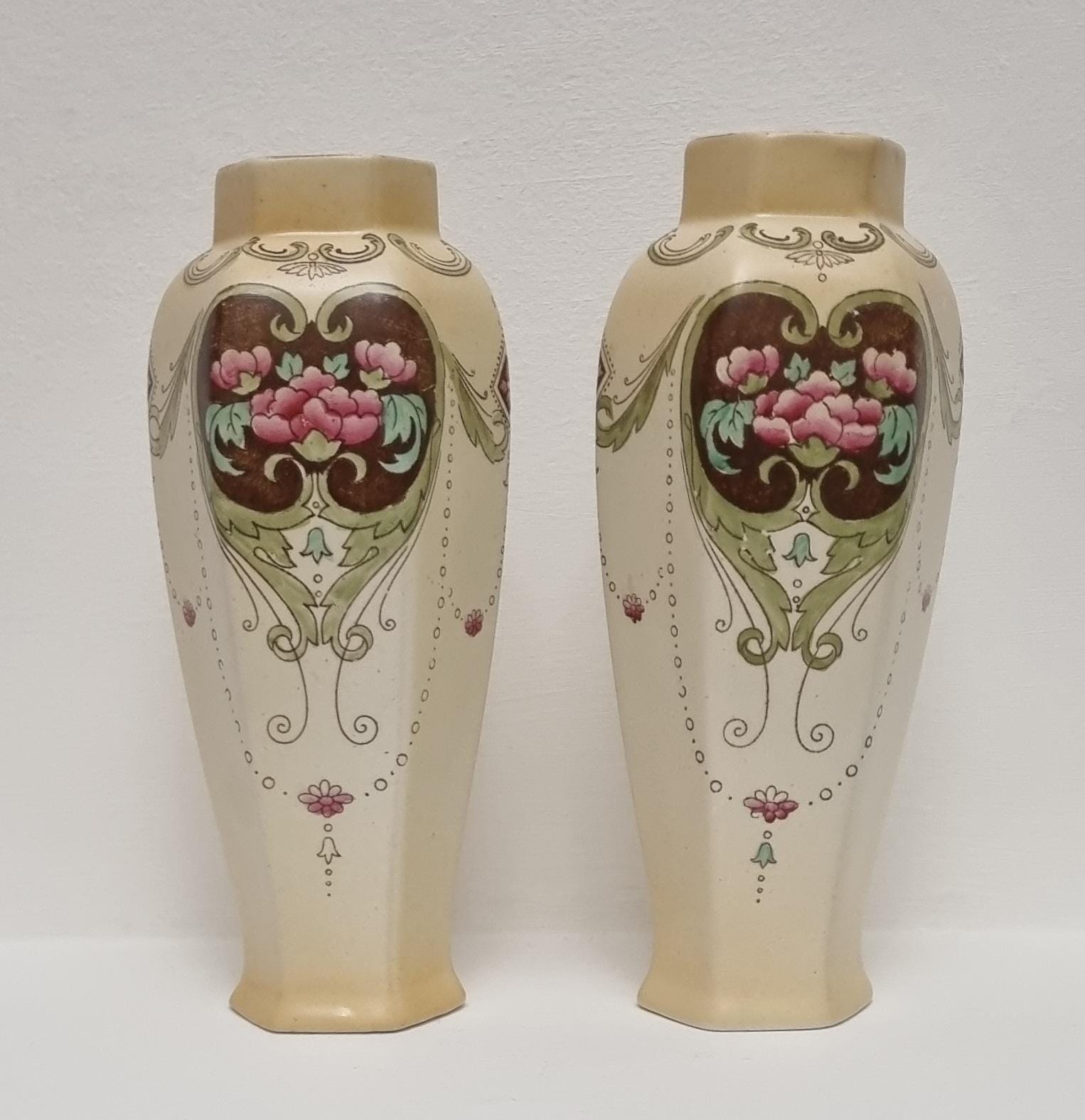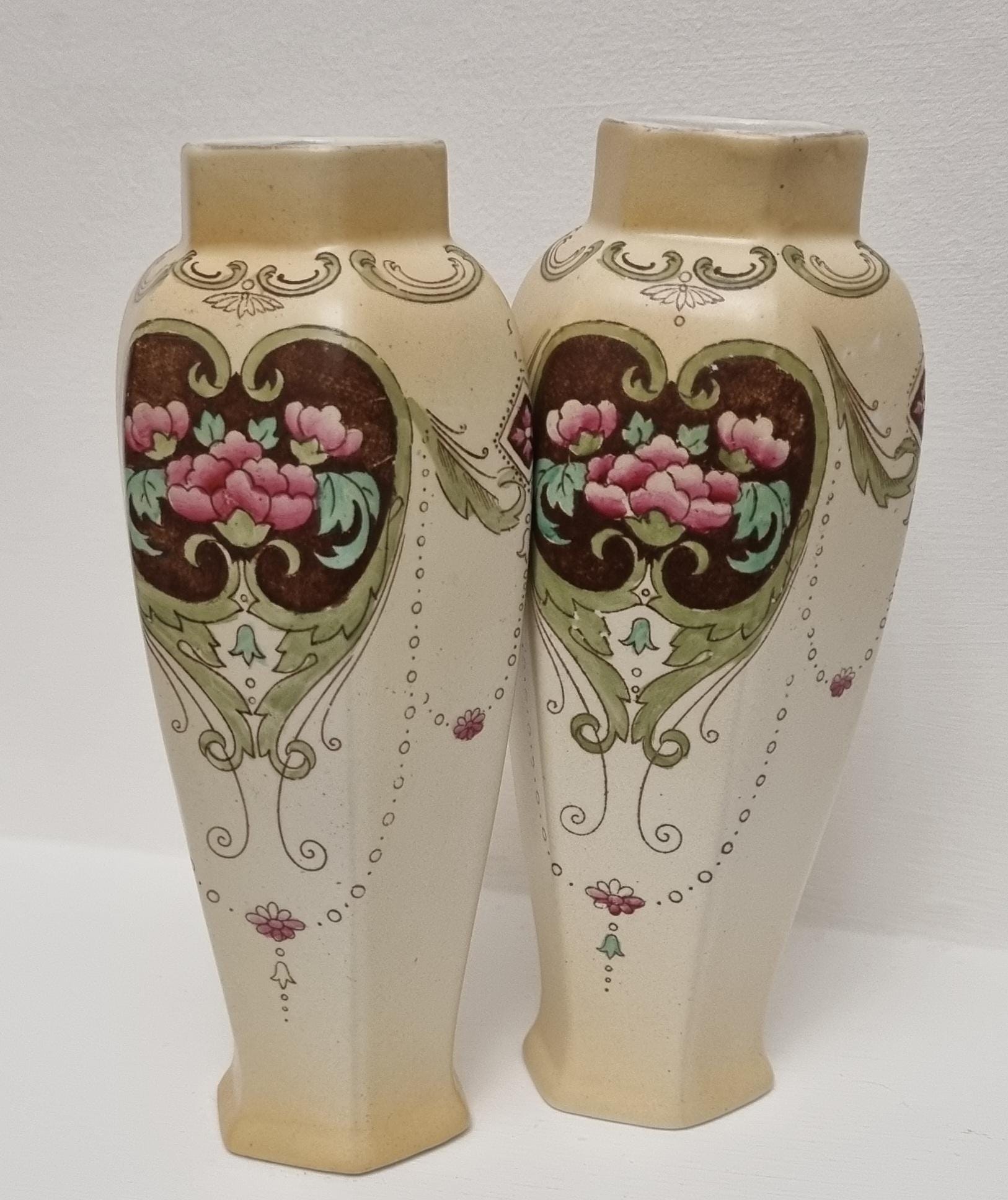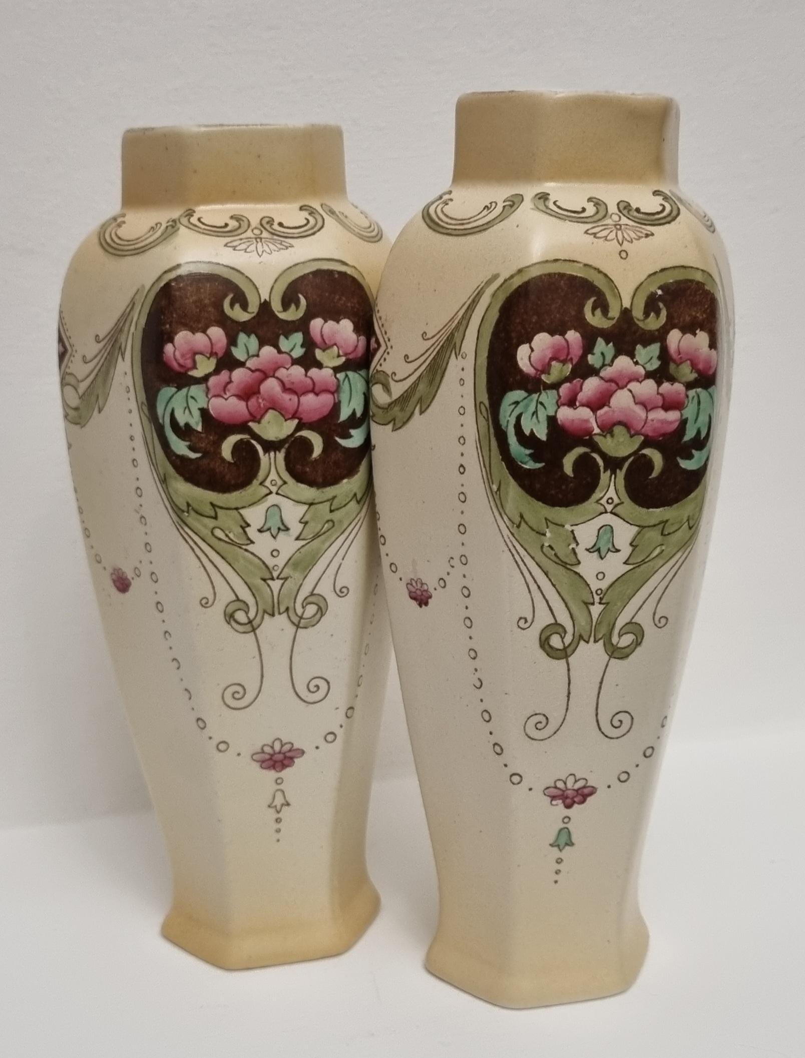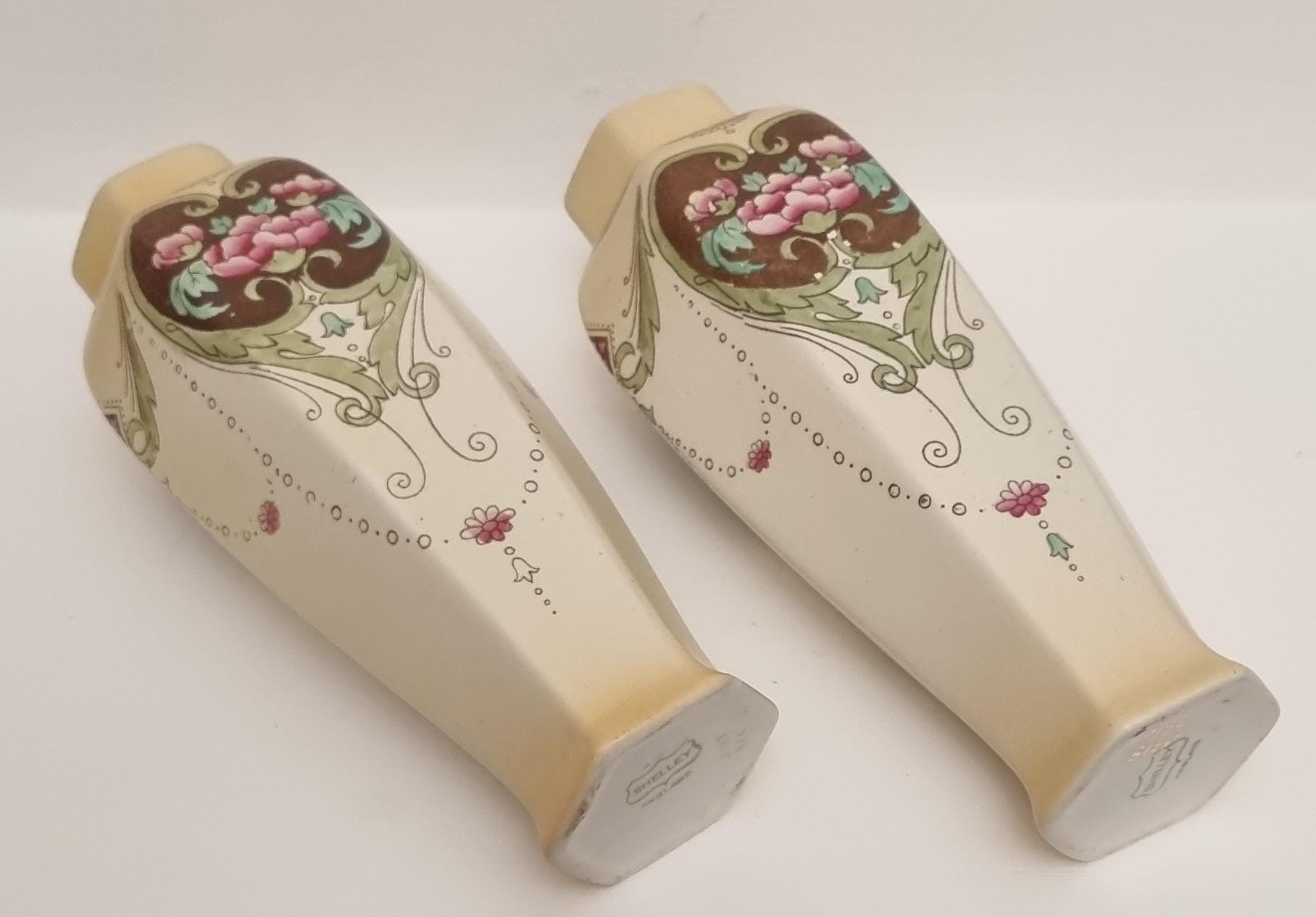 A wonderful rare pair of Shelley Art Nouveau vases (circa 1920), known for its flowing organic lines and natural motifs. These Shelley vases, pattern 774/8125, features prominent pink flowers within a dark brown, heart-shaped or shield-like motif, with green leaves and flowing scrollwork against a pale, creamy background and gold gilt on the rim.