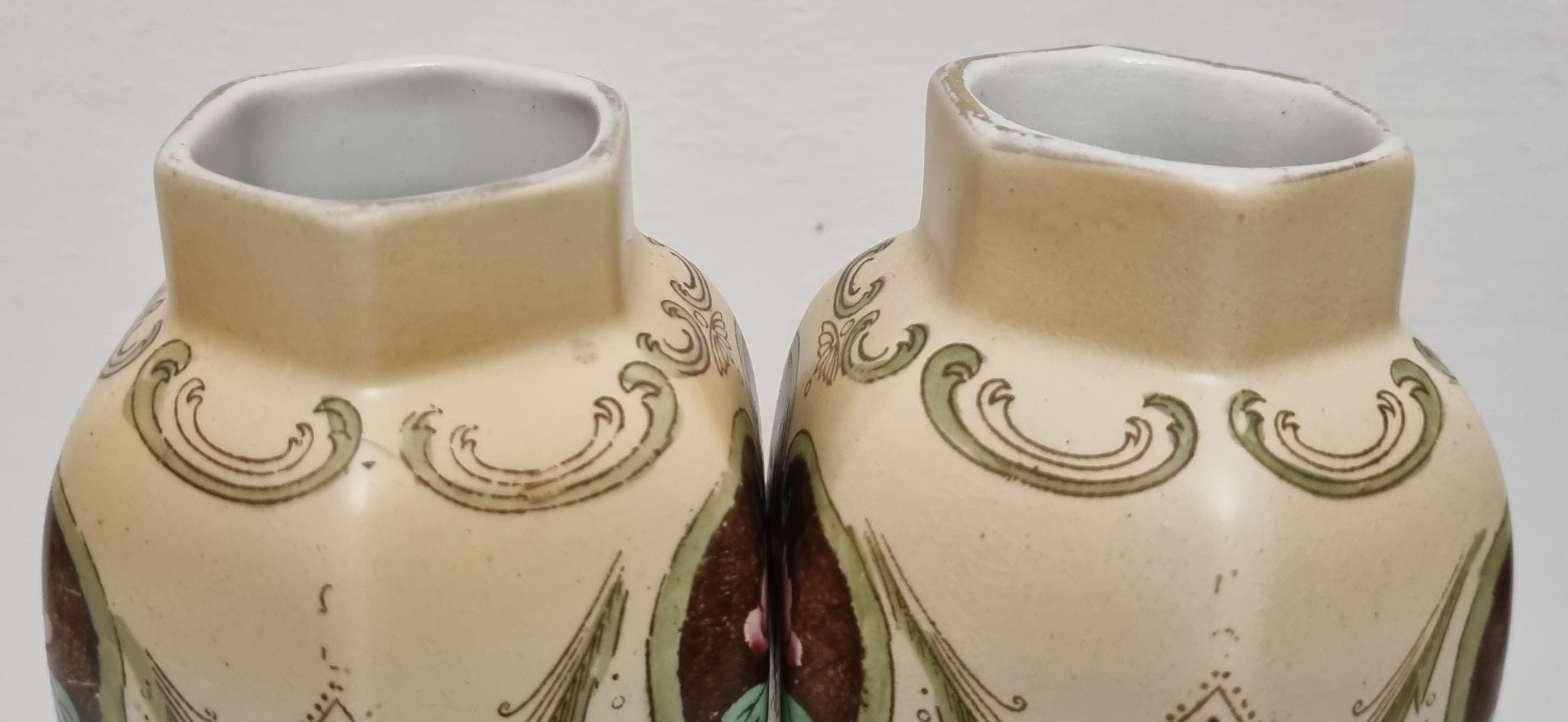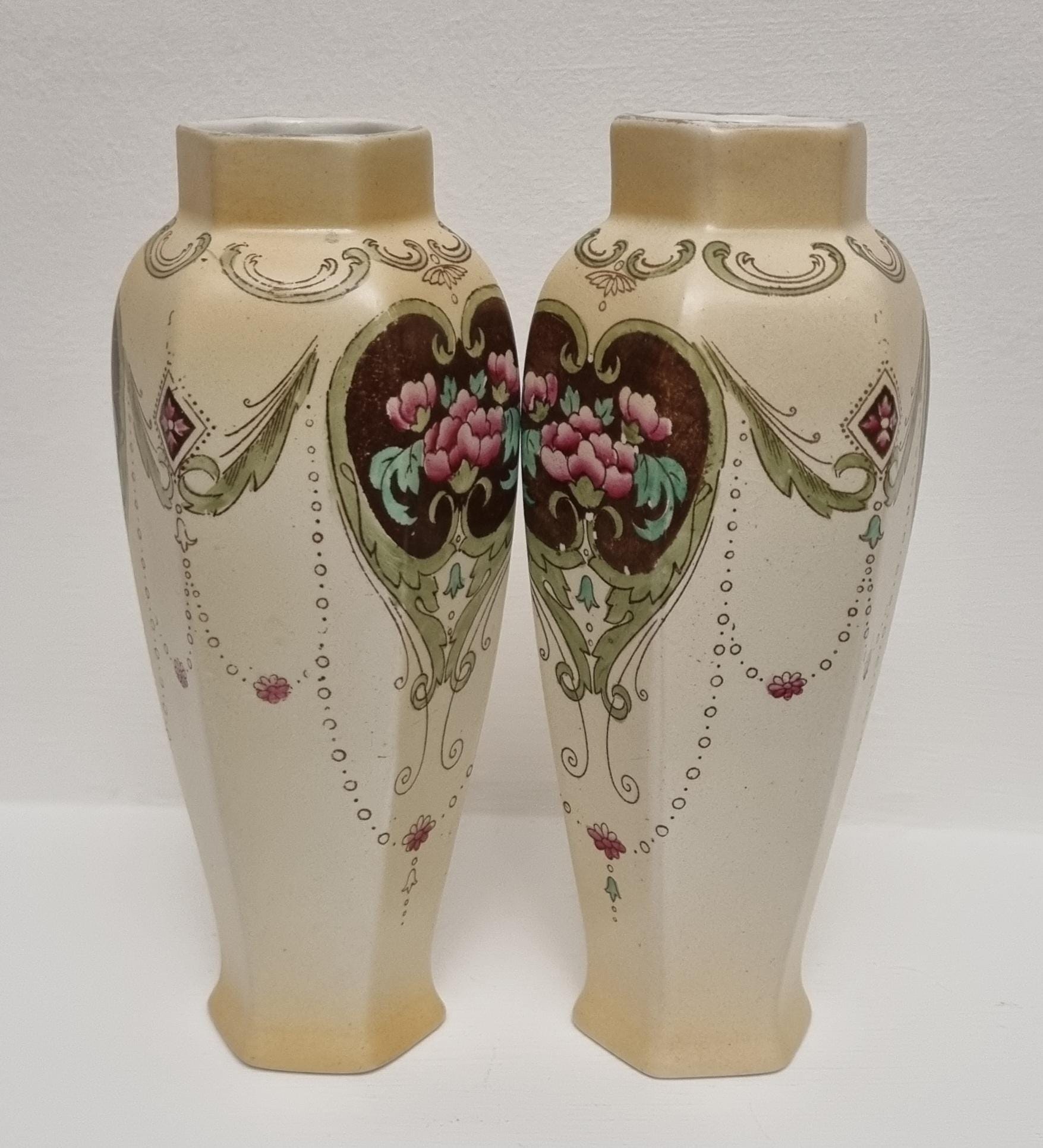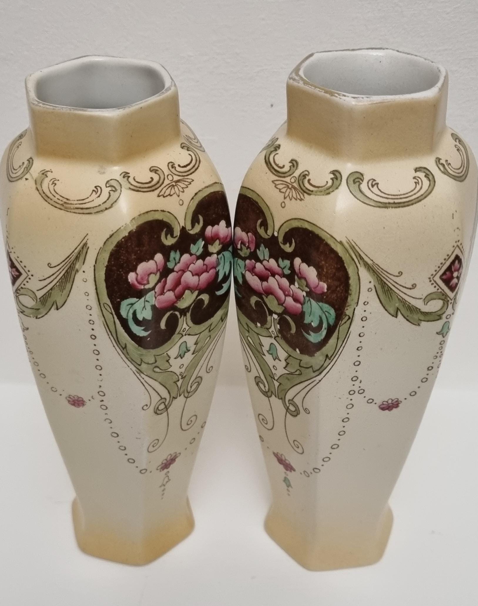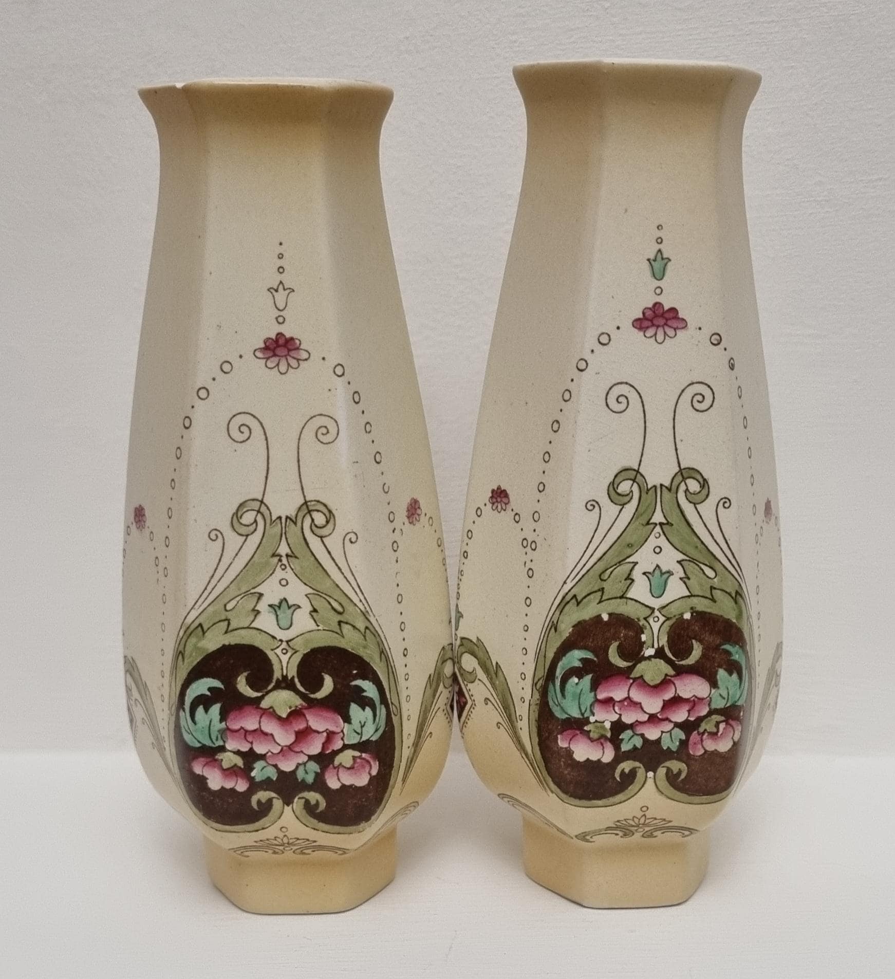 A wonderful rare pair of Shelley Art Nouveau vases (circa 1920), known for its flowing organic lines and natural motifs. These Shelley vases, pattern 774/8125, features prominent pink flowers within a dark brown, heart-shaped or shield-like motif, with green leaves and flowing scrollwork against a pale, creamy background and gold gilt on the rim.