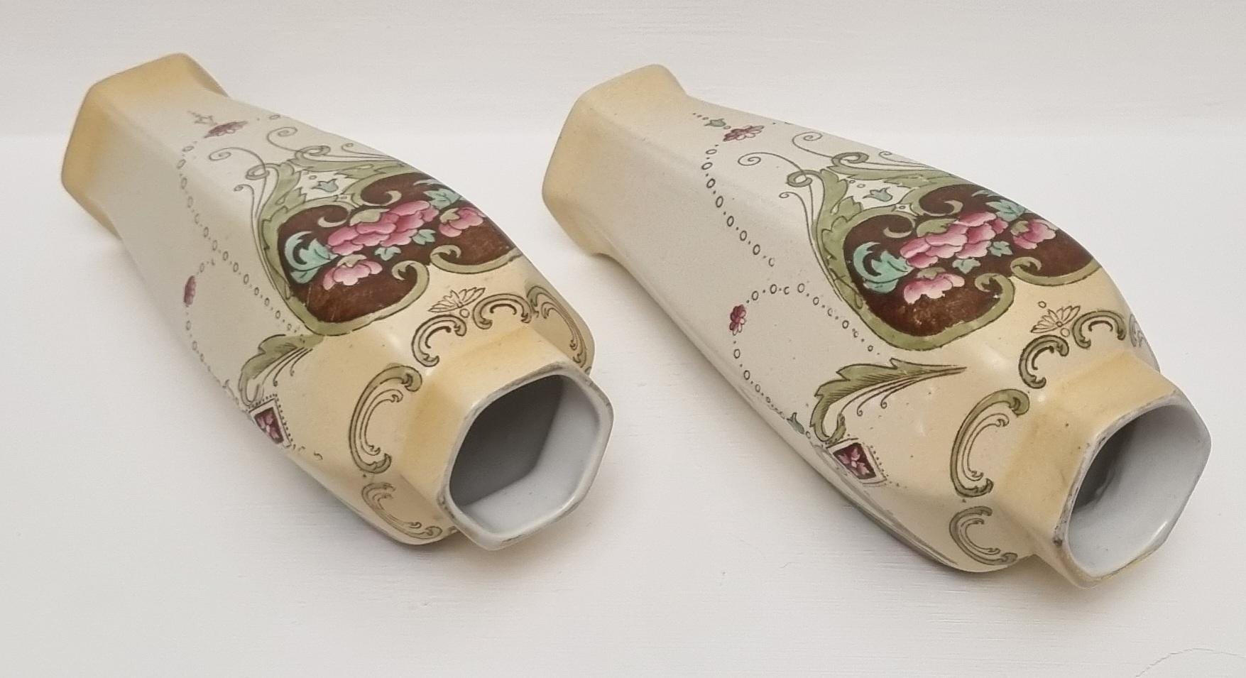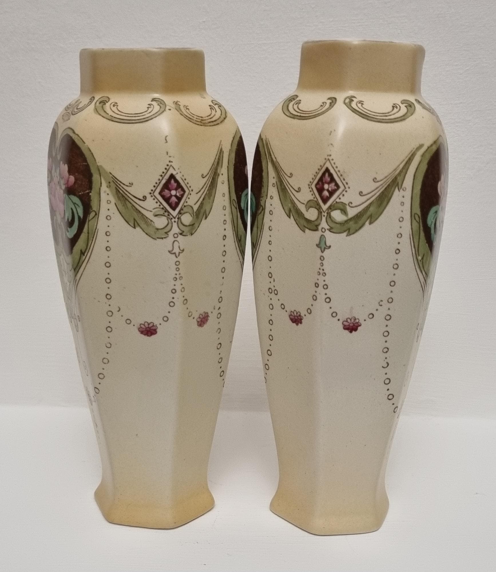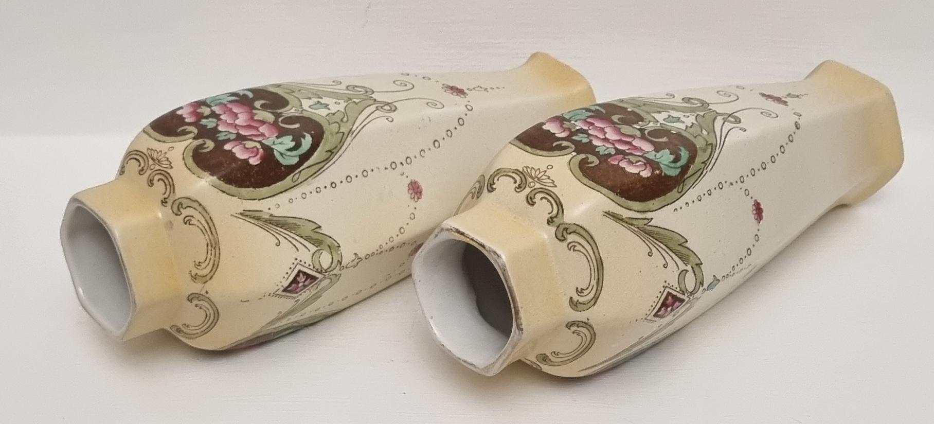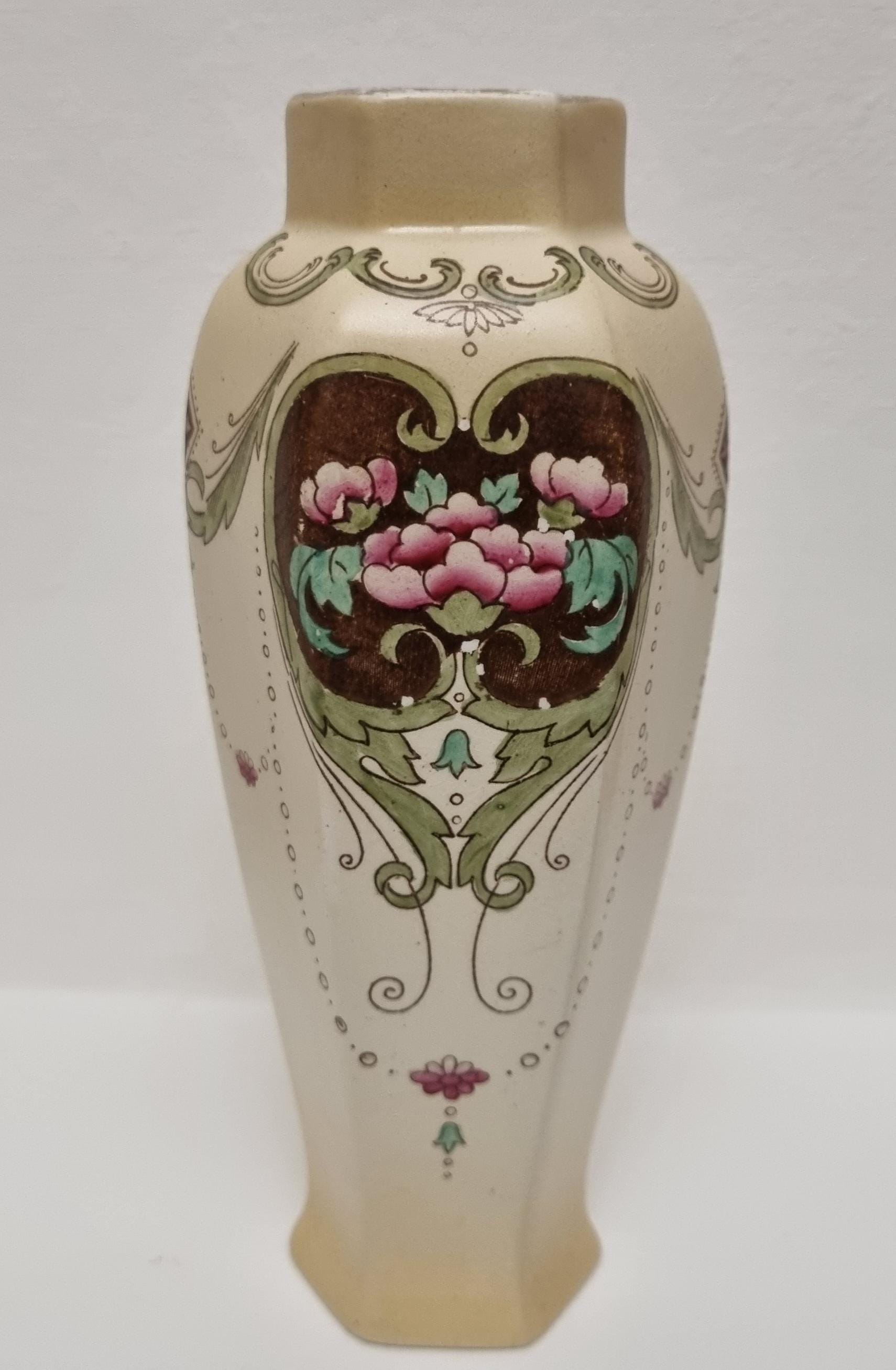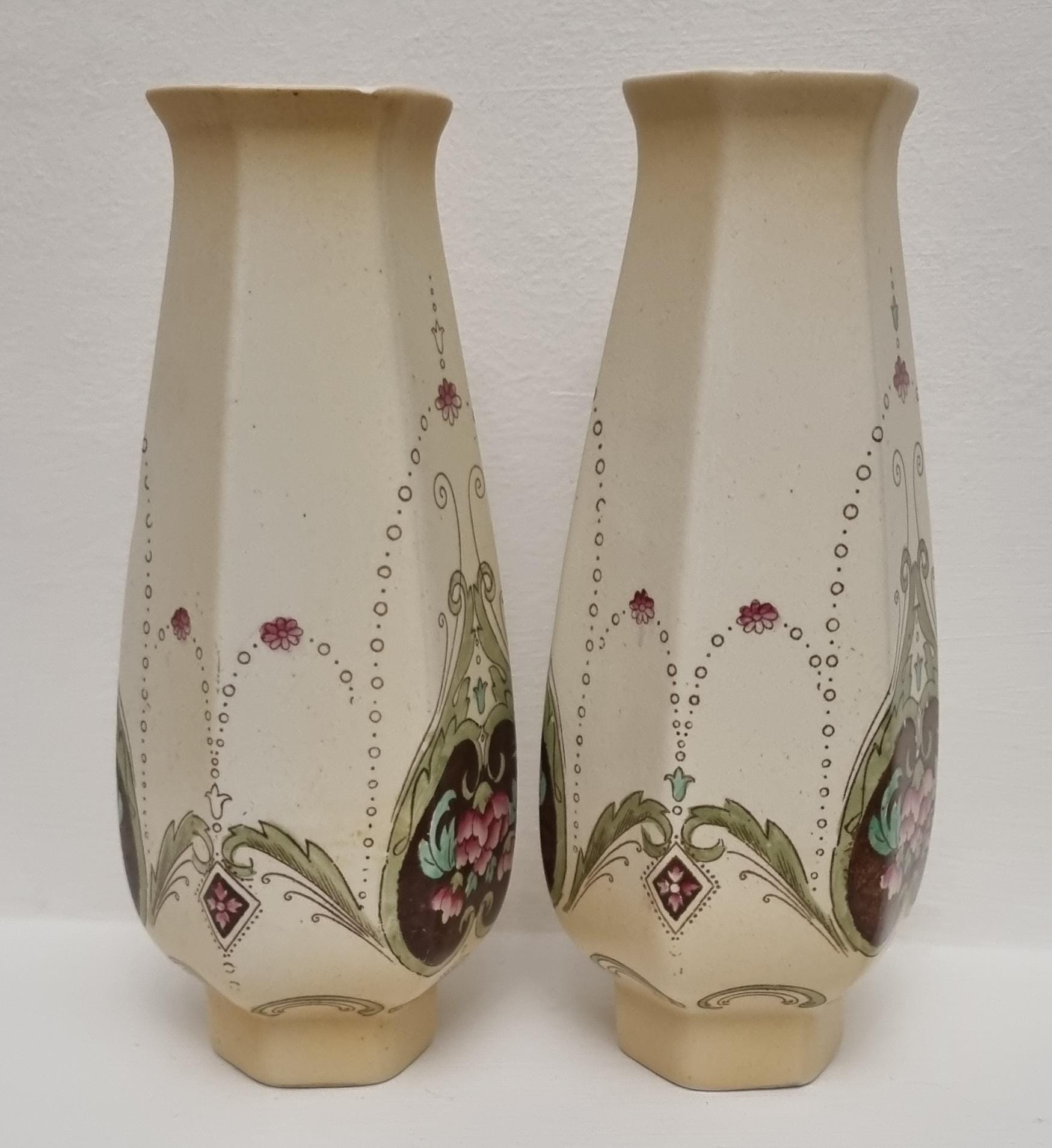 A wonderful rare pair of Shelley Art Nouveau vases (circa 1920), known for its flowing organic lines and natural motifs. These Shelley vases, pattern 774/8125, features prominent pink flowers within a dark brown, heart-shaped or shield-like motif, with green leaves and flowing scrollwork against a pale, creamy background and gold gilt on the rim.