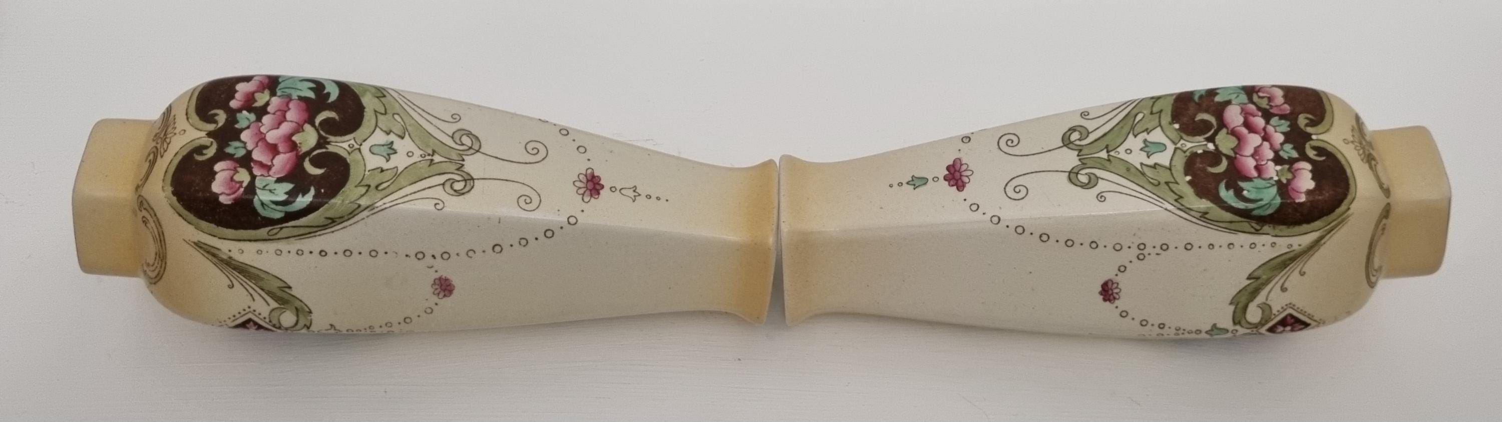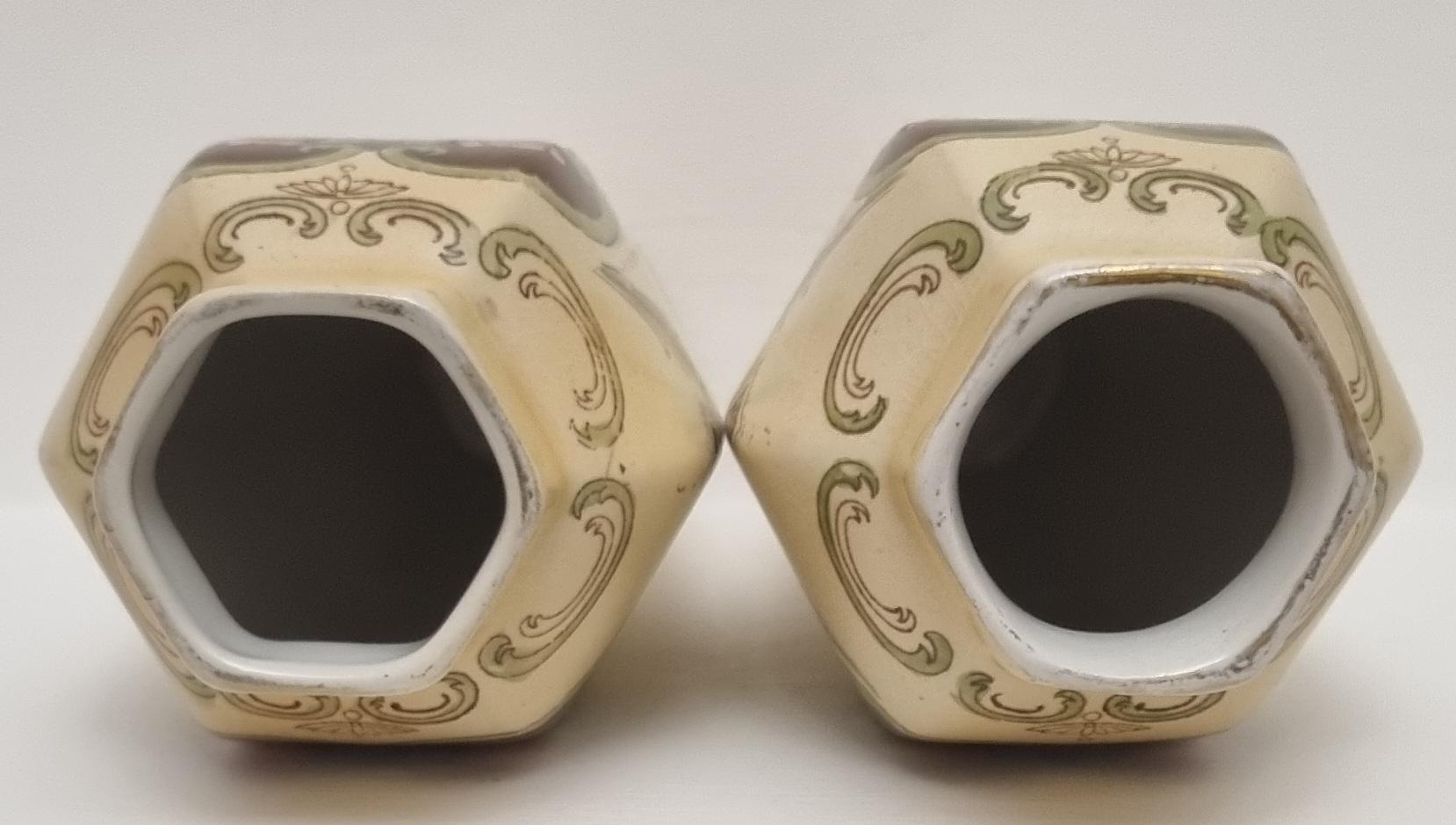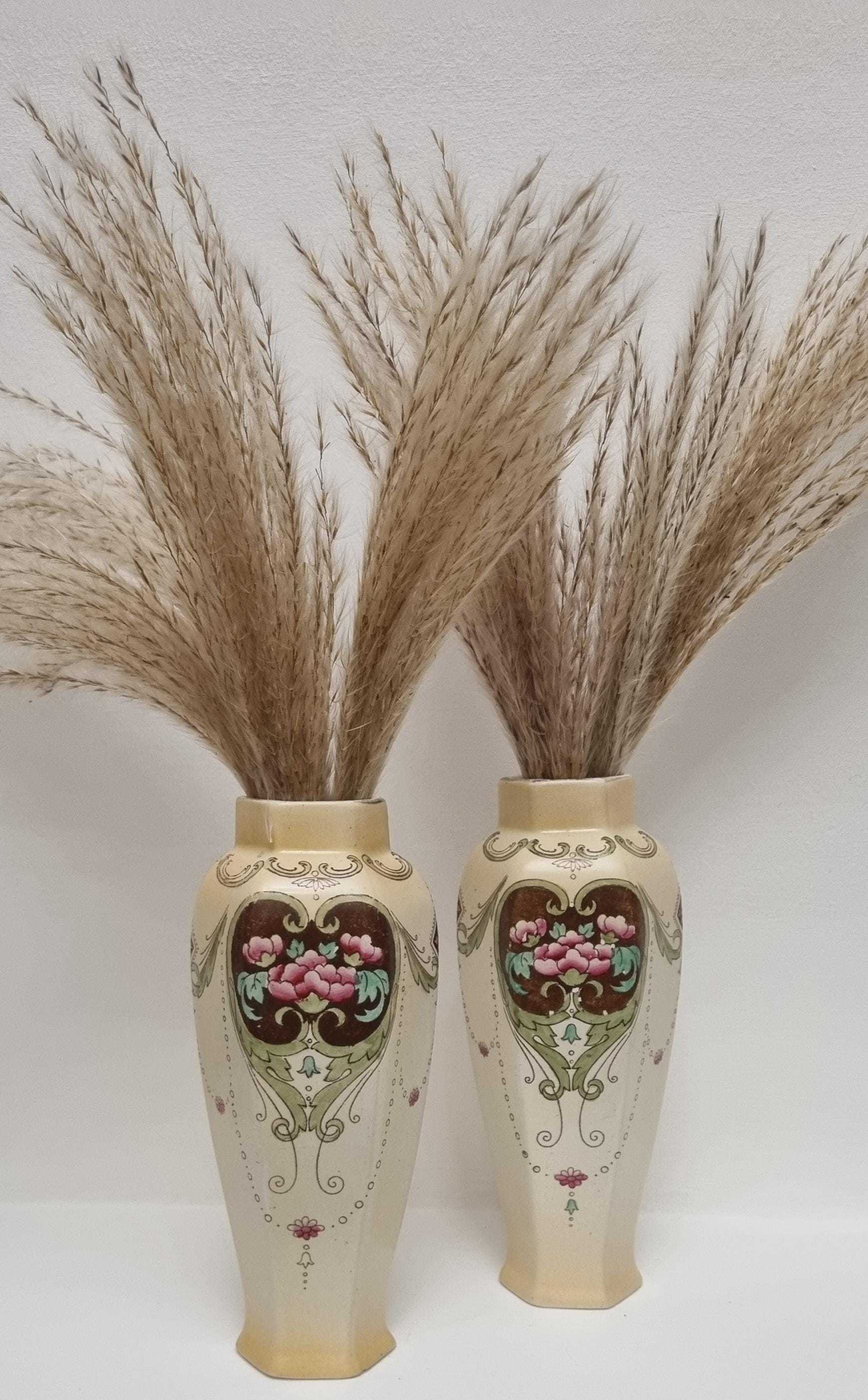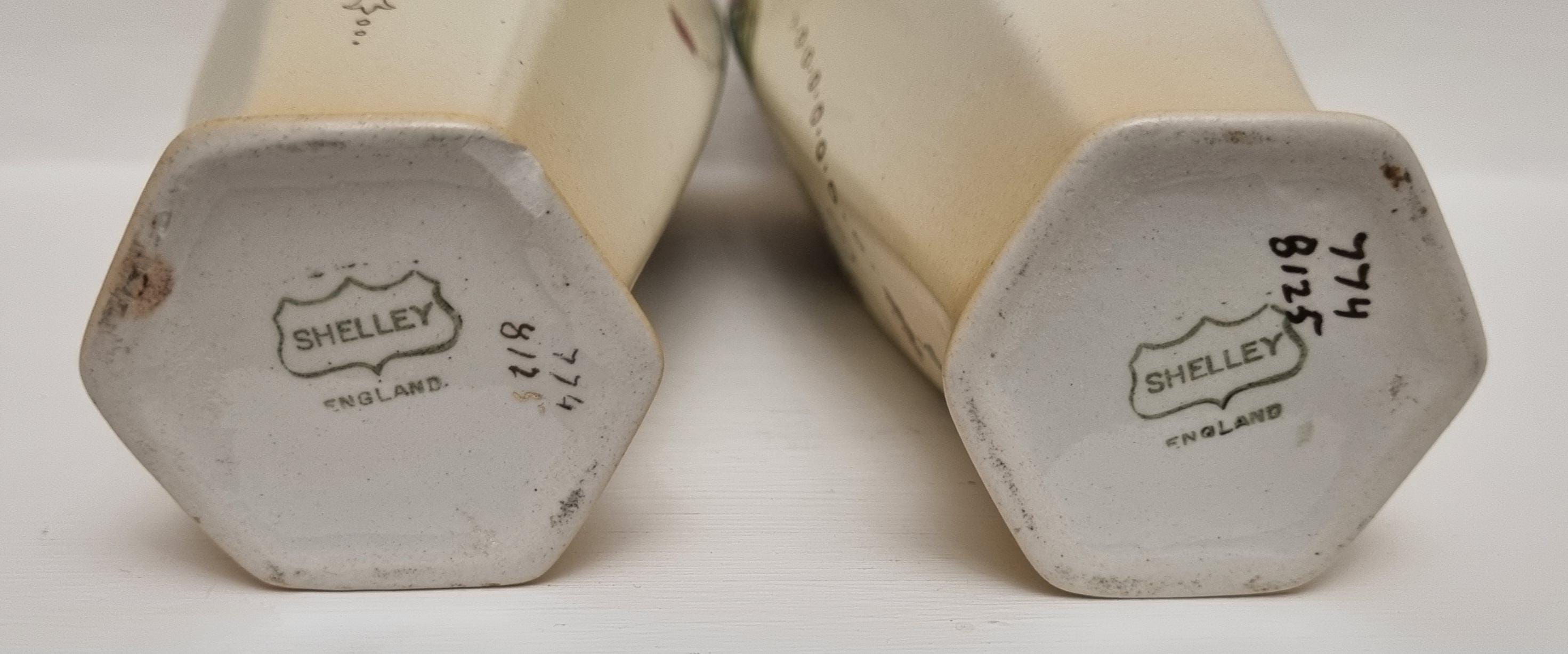 A wonderful rare pair of Shelley Art Nouveau vases (circa 1920), known for its flowing organic lines and natural motifs. These Shelley vases, pattern 774/8125, features prominent pink flowers within a dark brown, heart-shaped or shield-like motif, with green leaves and flowing scrollwork against a pale, creamy background and gold gilt on the rim.